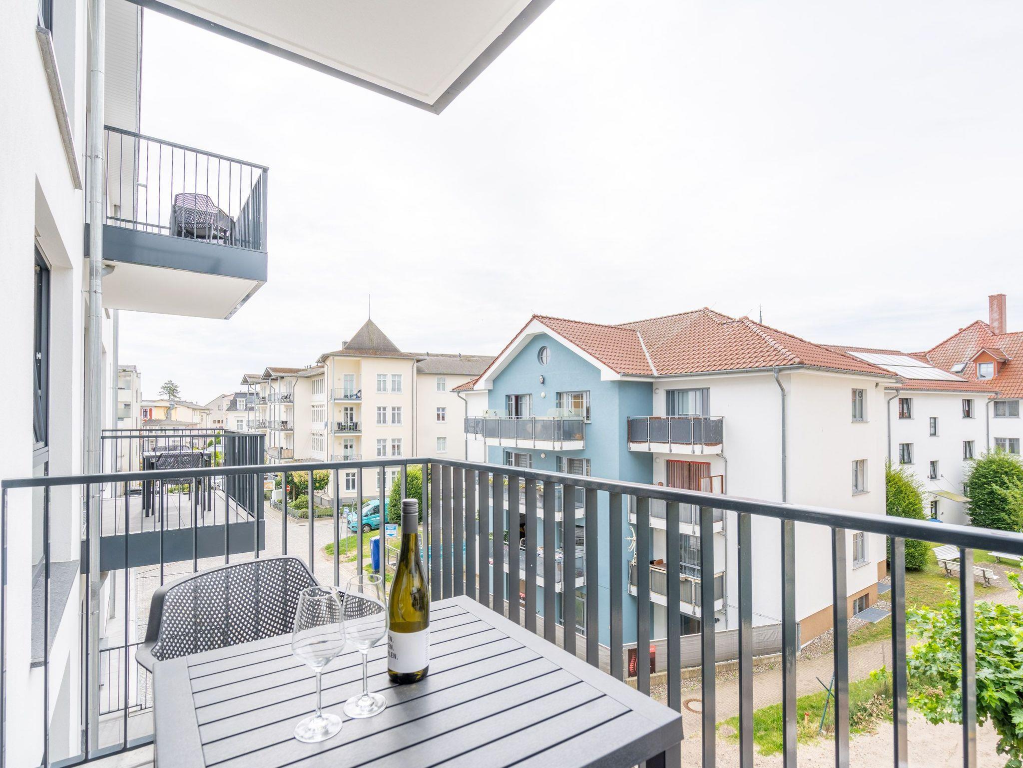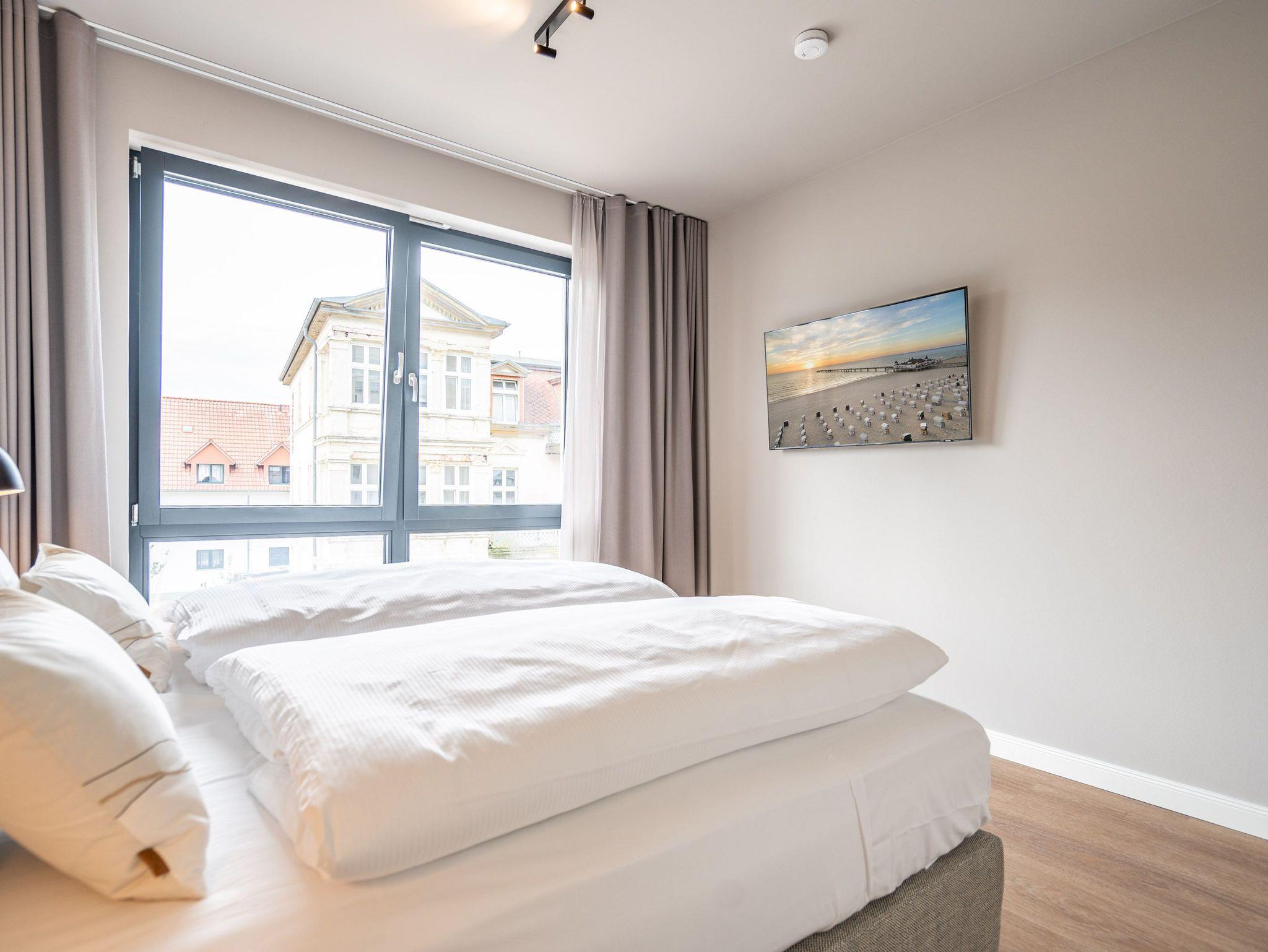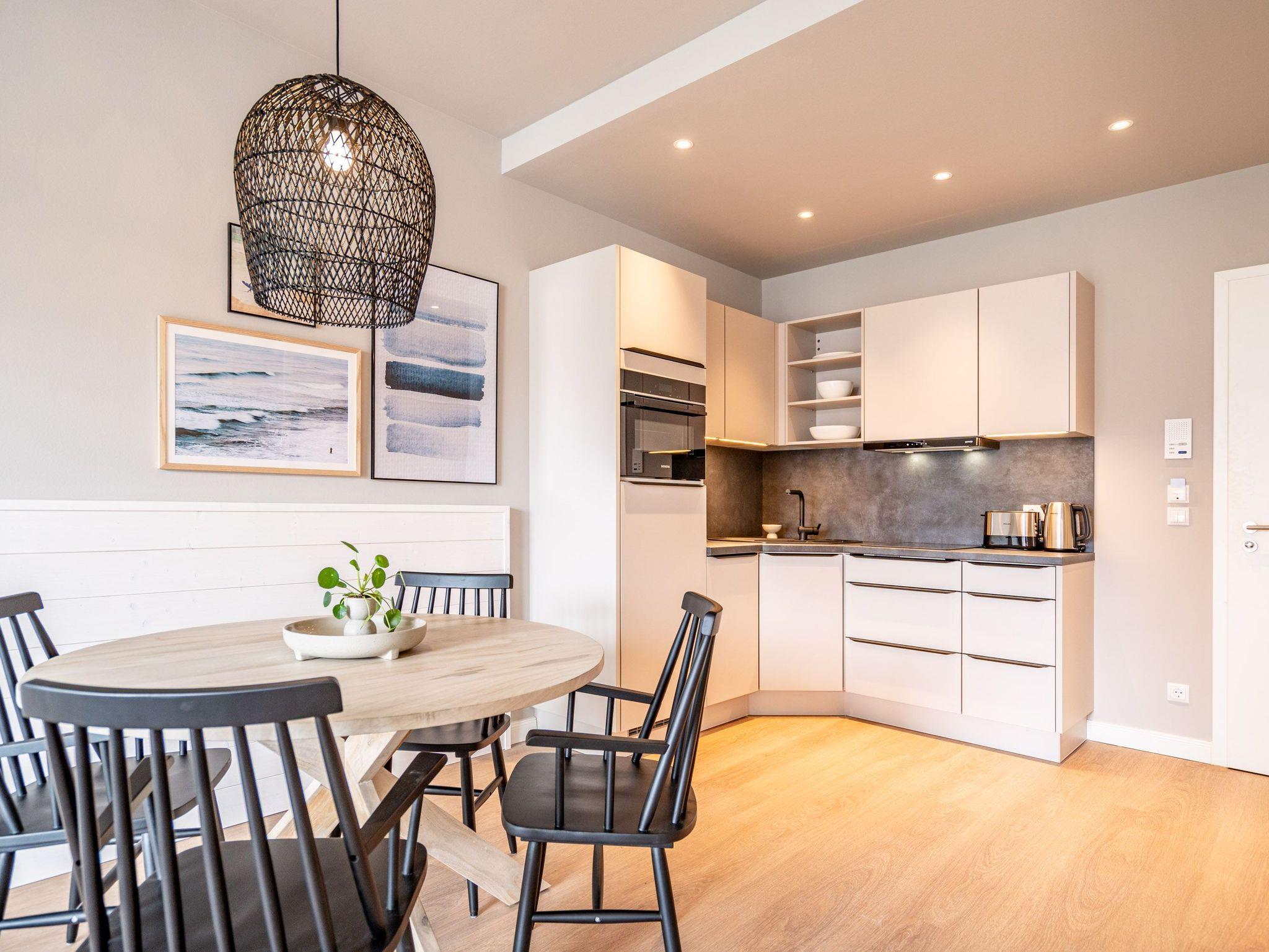 Willkommen im 2-Raum-Appartement B 2.6 (Haus B) in der Strandterrasse. Mittendrin, statt nur dabei können Sie bei diesem wunderschönen und gemütlichen Auszeitdomizil zu Recht sagen. Denn es befindet sich nur 80 Meter von der Ahlbecker Promenade und vom Strand entfernt. Die 53 Quadratmeter sind ein kuscheliges Auszeitzuhause für zwei Personen. Eine luftig leichte Atmosphäre empfängt Sie. Denn durch die großen Fenster fällt viel Licht in die Räume. Die Einrichtung ist in nordischem Design gehalten und birgt das Potential für viel Entspannung und Ruhe. Machen Sie es sich auf dem stylischen Sofa gemütlich. Genießen Sie den Blick auf den Elektrokamin (ohne Wärmeabgabe). Ein großer Flat-TV (50 Zoll) sorgt für echtes Heimkinofeeling. Vom Wohnzimmer aus haben Sie Zugang zum Süd-West-Balkon mit einem Tisch und zwei Stühlen. Auf ihm können Sie sich an der Sonnenseite der Insel erfreuen. Ob Frühstück oder Abendessen ? wenn das Wetter mitspielt, schmeckt es unter freiem Himmel doch gleich nochmal so gut. Zubereiten können Sie die Mahlzeiten in der zum Wohnzimmer hin offenen Küche. Sie ist mit hochwertigen Elektrogeräten und allem zum Kochen Nötigen voll ausgestattet. Ein schöner Esstisch lädt zu gemeinsamen Genuss-und Mußestunden ein. Doch zum Wichtigsten im Urlaub zählt bekanntlich ein erholsamer Schlaf. Das komfortable Boxspringdoppelbett (1,80m x 2,00m) im geräumigen Schlafzimmer bringt sie perfekt in süße Träume. Das Zimmer ist zudem mit einem Kleiderschrank und ebenfalls mit einem Flat-TV (50 Zoll) eingerichtet. Ein modernes Duschbad mit Waschtisch, Infrarotsaunakabine und WC komplettiert das Angebot. Zur Wohnung gehört ein PKW-Stellplatz in der Tiefgarage. Sie müssen also nur noch ankommen. Das Wohlfühlen setzt dann automatisch ein, wenn Sie die stilvolle Ferienwohnung betreten.