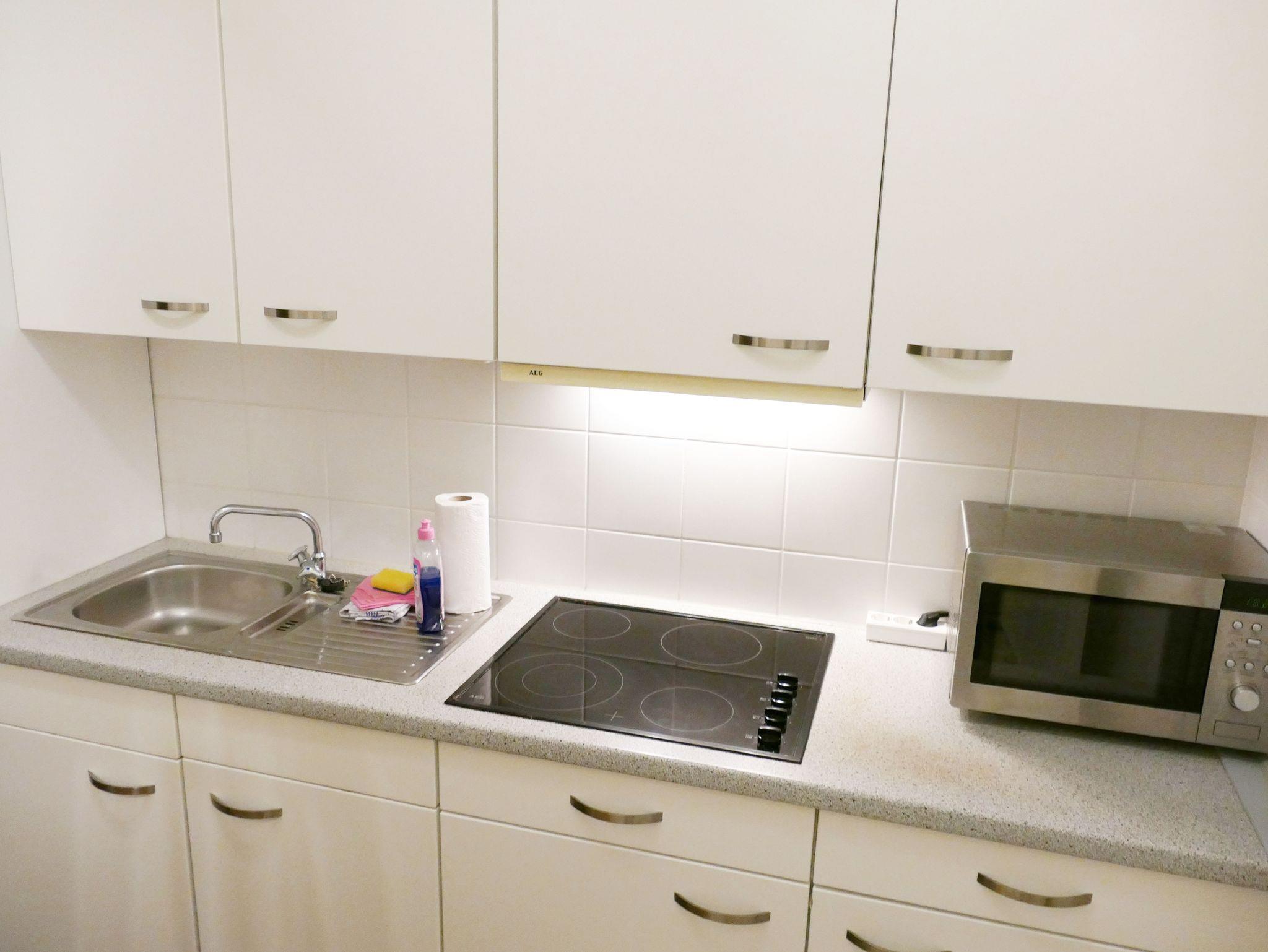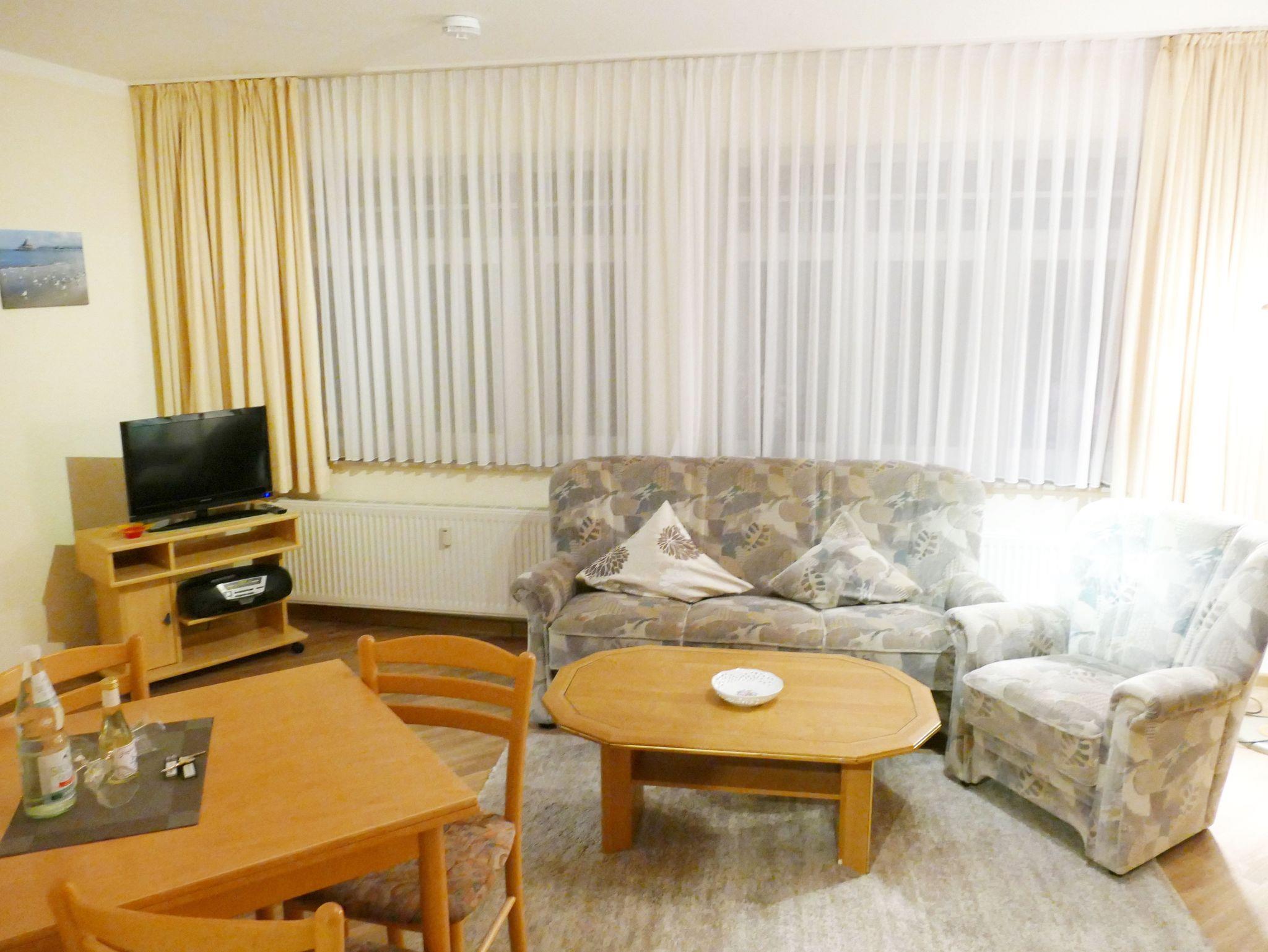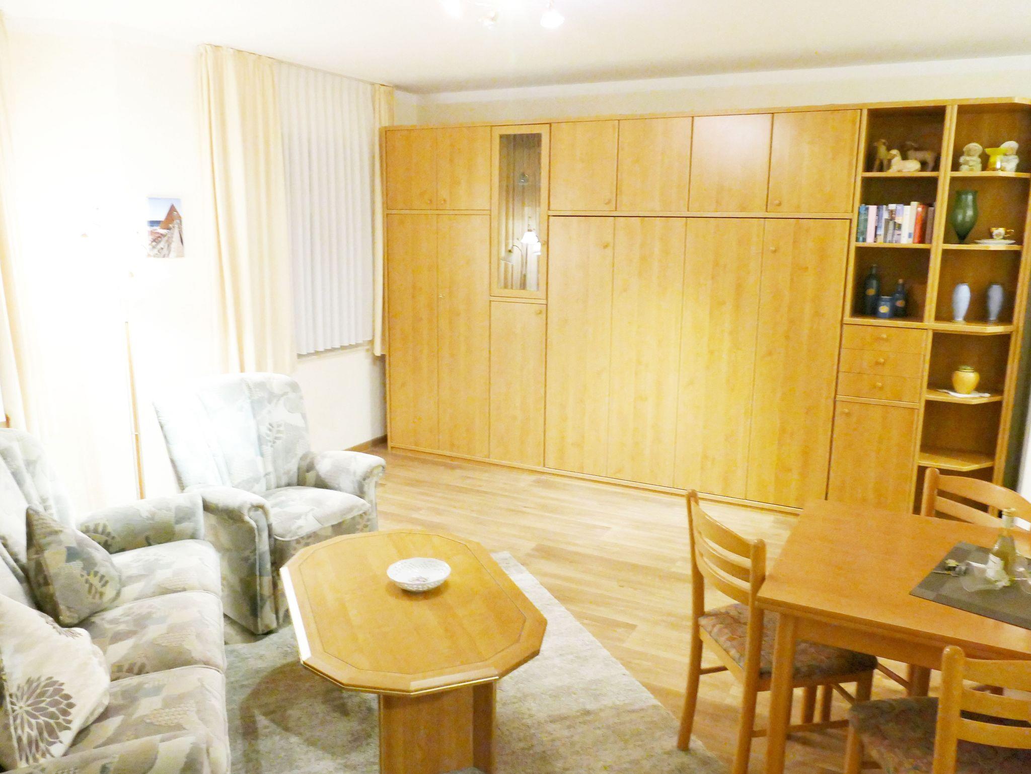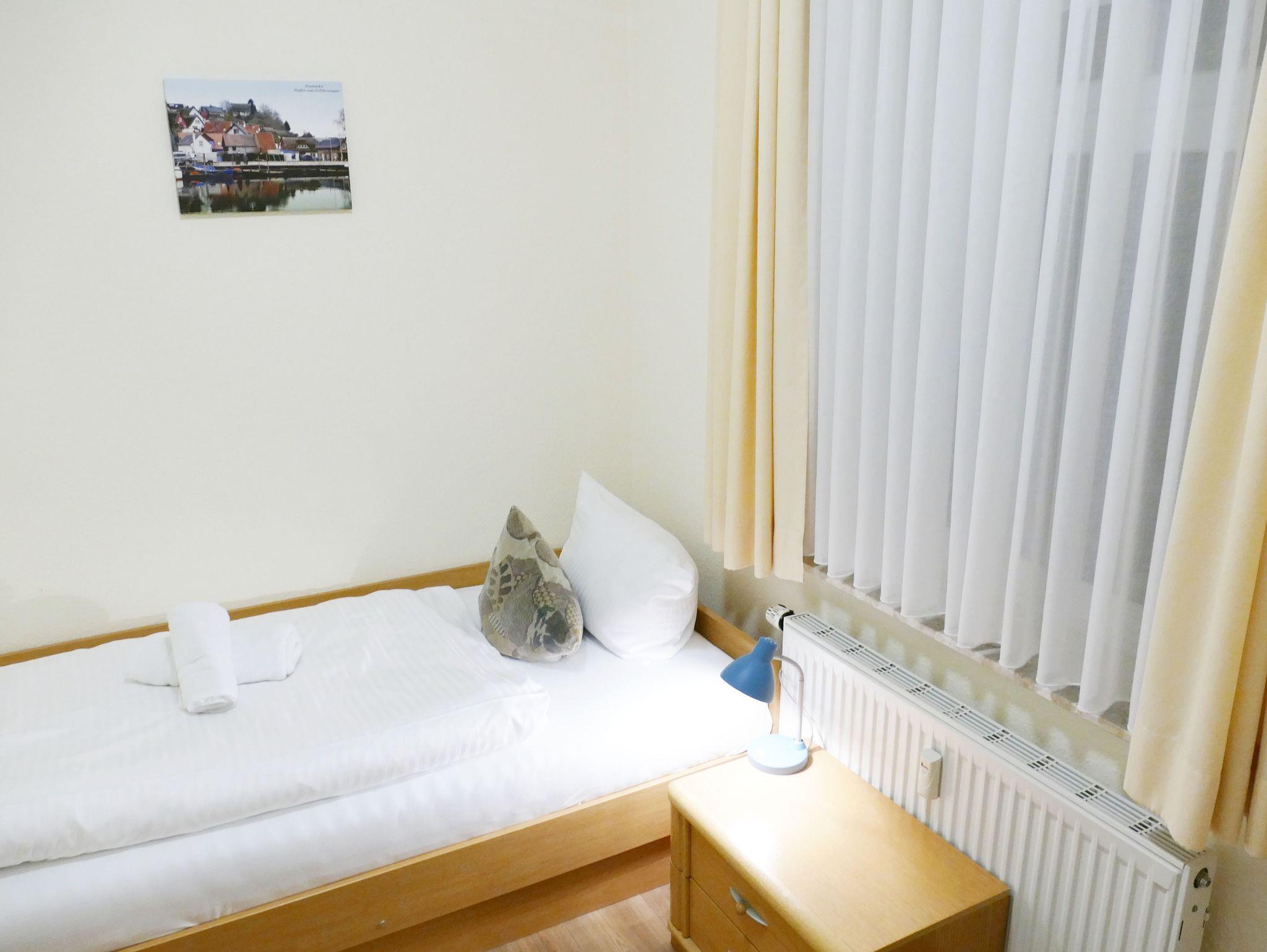 Die 35 qm große Wohnung befindet sich im Erdgeschoss und ist für bis zu drei Personen ausgestattet. Die Wohnung verfügt über ein separates Schlafzimmer mit Einzelbett, ein Wohnzimmer mit Schrankbett (Doppelbett) , Couch-Ecke und einen Essplatz. Die Küchenzeile ist mit Kühlschrank, Herd, Mikrowelle u.v.m. ausgestattet. Bad mit Dusche und WC.