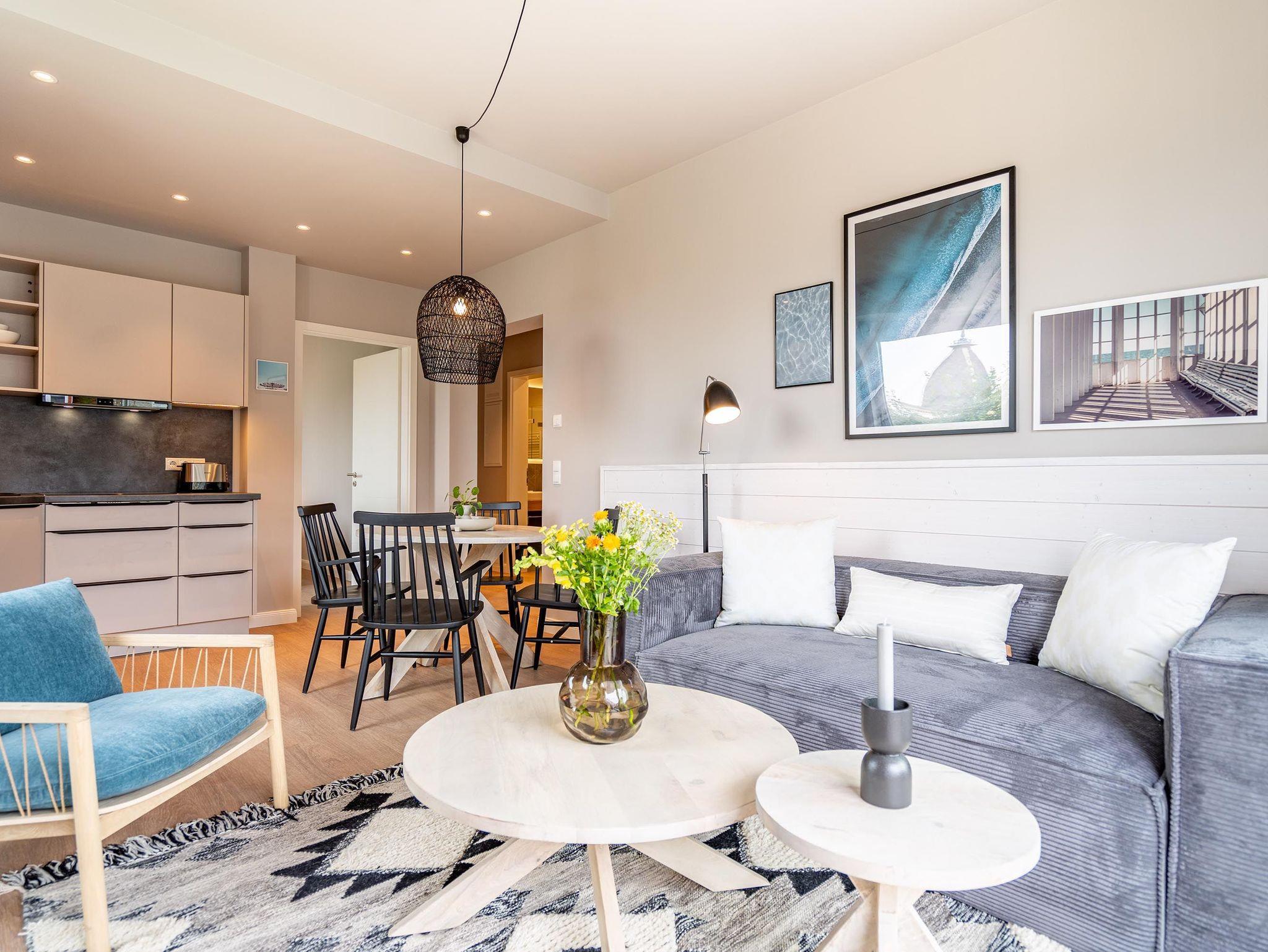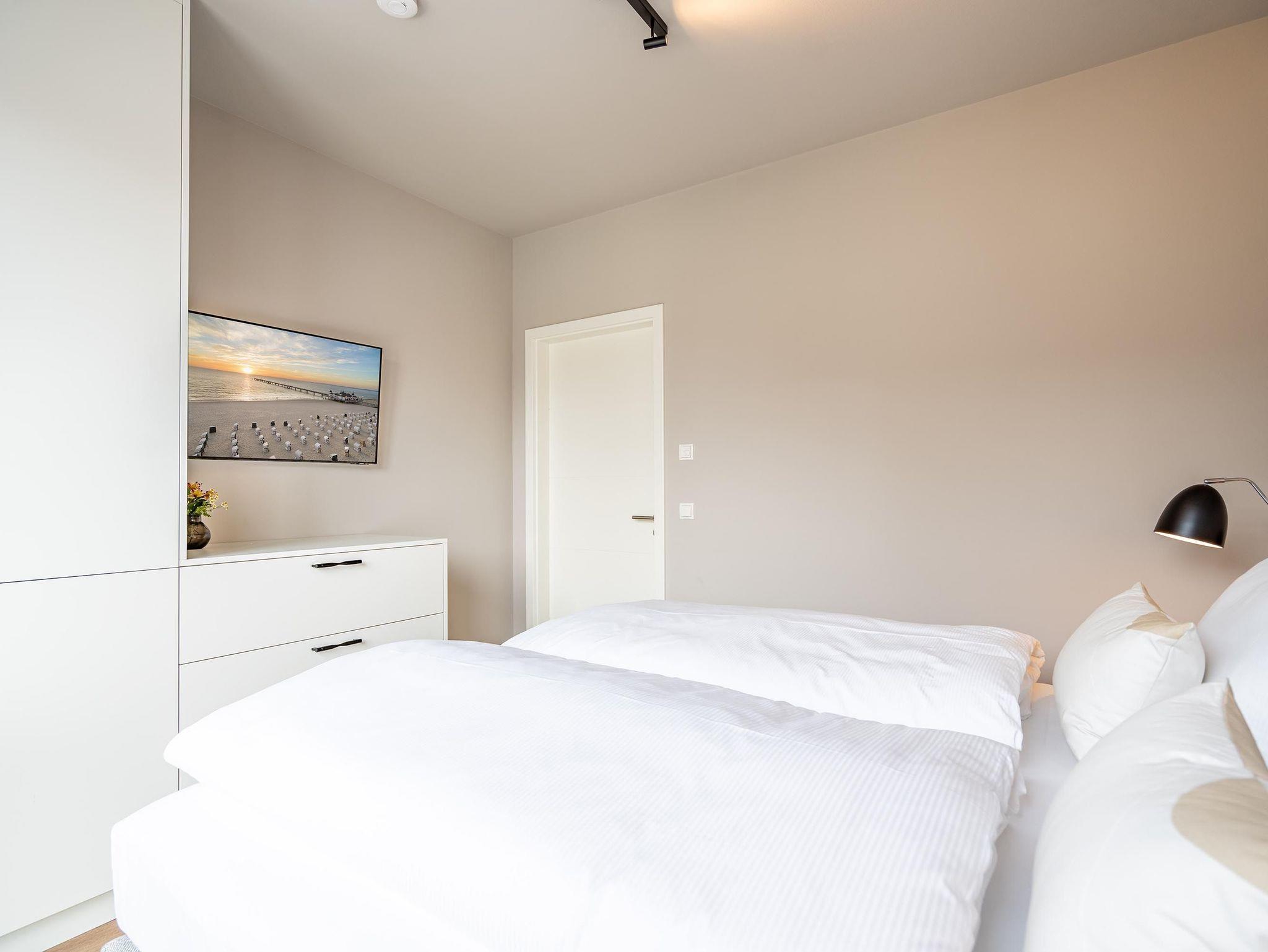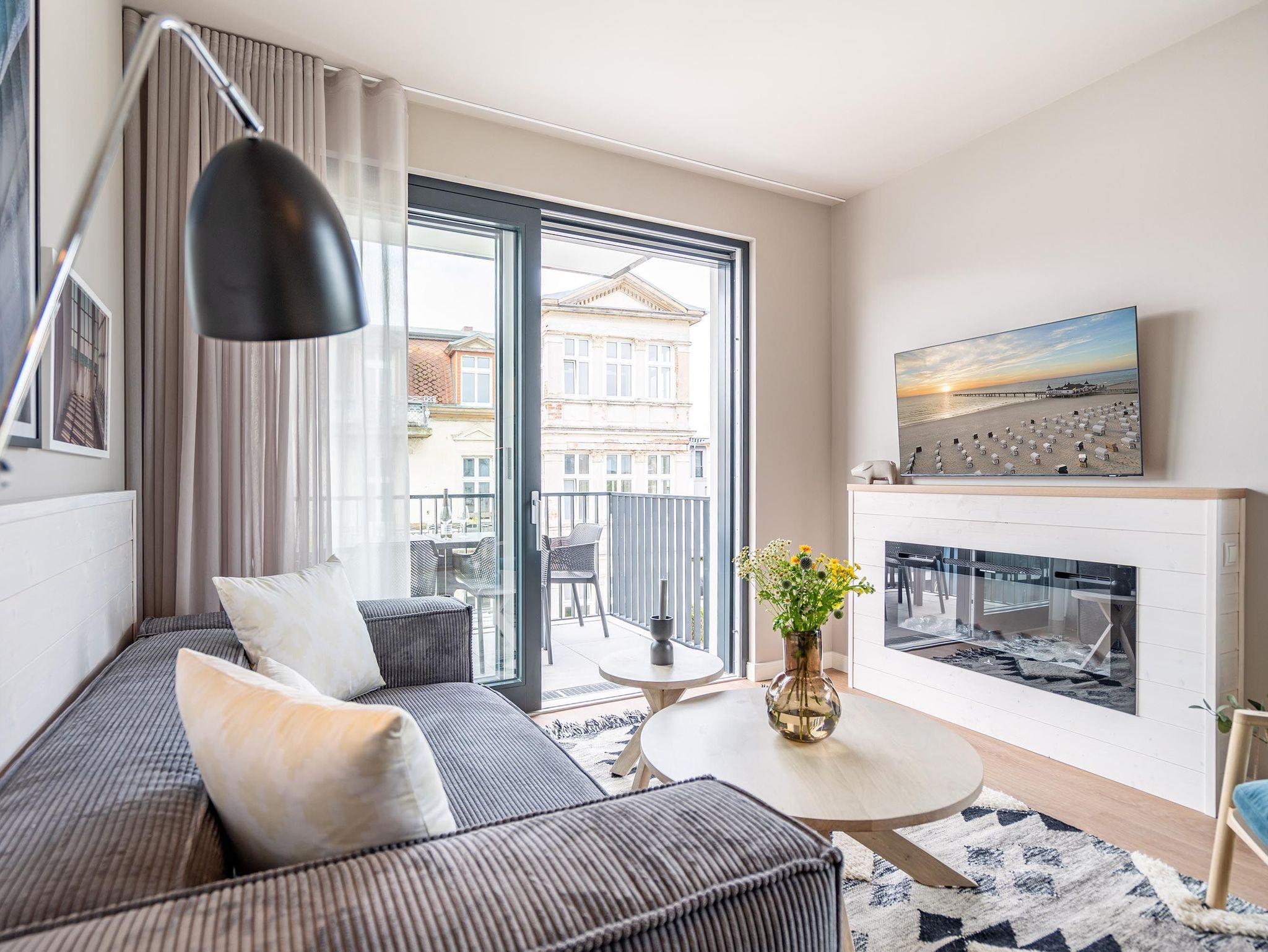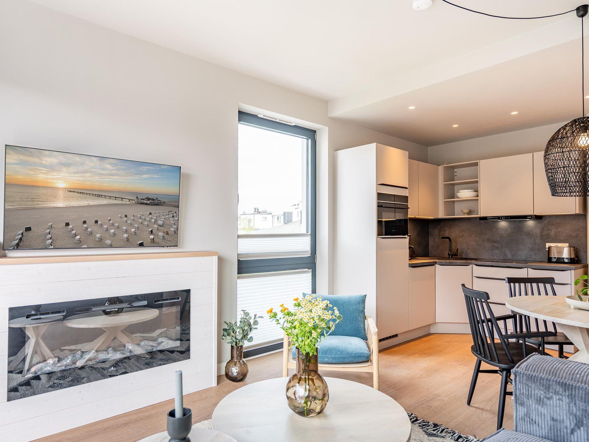 Für alle Ostseesehnsüchtigen wird das 3-Raum-Appartement B 2.7 (Haus B) in der 2. Etage der Strandterrasse das absolute Traumauszeitdomizil sein. Ein wunderschönes und kuscheliges Designkonzept, eine moderne und hochwertige Ausstattung und die Nähe zur Ostsee sprechen für sich. Die 58 Quadratmeter bieten Platz für bis zu 4 Personen. Doch finden Sie hier nicht nur einen Platz zum Schlafen, sondern einen Ort zum Wohlfühlen und Runterkommen. Das Sofa und der Sessel sind eine wunderbare Kuschelzone zum Filme schauen auf dem großen Flat-TV (50 Zoll) oder zum Träumen vor dem Elektrokamin (ohne Wärmeabgabe). Die offene Küche ist mit hochwertigen Elektrogeräten wie einem Backofen, einem 4-Platten-Induktionsherd, Toaster, Kaffeemaschine und sogar einer Nespresso-Kapselmaschine ausgestattet. Einem gemeinsamen Kochvergnügen steht also nichts im Weg. Die Mahlzeiten verköstigen, können Sie am schönen, großen Esstisch. Sie wollen sich schon am Morgen die Ostseebrise um die Nase wehen lassen? Der Balkon mit Süd-West-Ausrichtung bietet einen herrlichen Blick auf die wunderschönen Villen des alten Seebades. Genießen Sie auf ihm die romantischen Sonnenuntergänge am Tisch mit 4 Stühlen. Die Wohnung verfügt über zwei Schlafzimmer, jedes mit einem komfortablen Boxspringdoppelbett (1,80m x 2,00m), einem Kleiderschrank und einer Kommode ausgestattet sowie einem Flat-TV (43 Zoll). Zwei moderne Badezimmer mit Natursteinverkleidung verfügen jeweils über einen Waschtisch, Dusche und WC. Ein PKW-Stellplatz in der Tiefgarage sorgt für bequemes Parken. Kommen Sie gut an in Ihrer Auszeit am Meer.