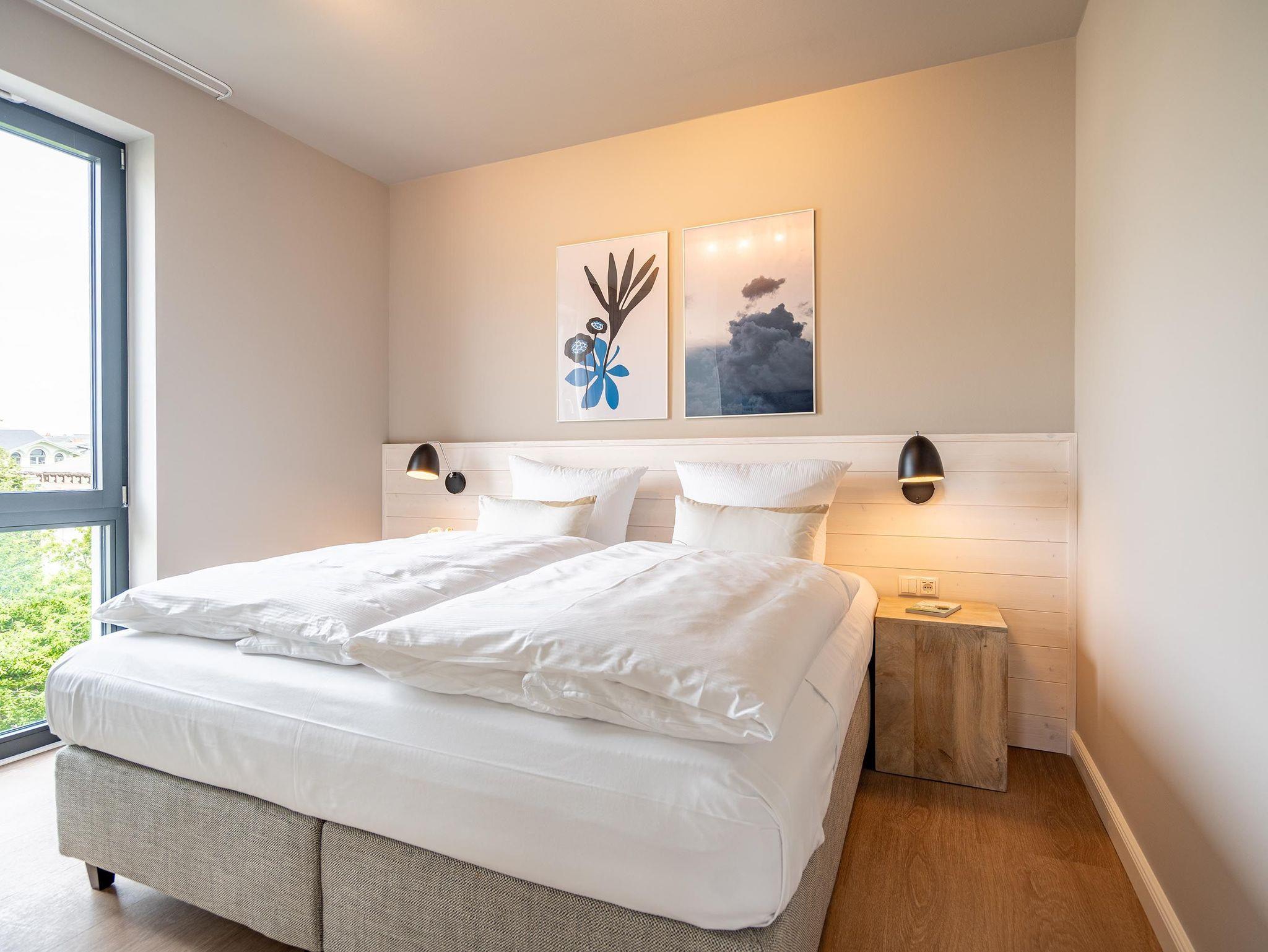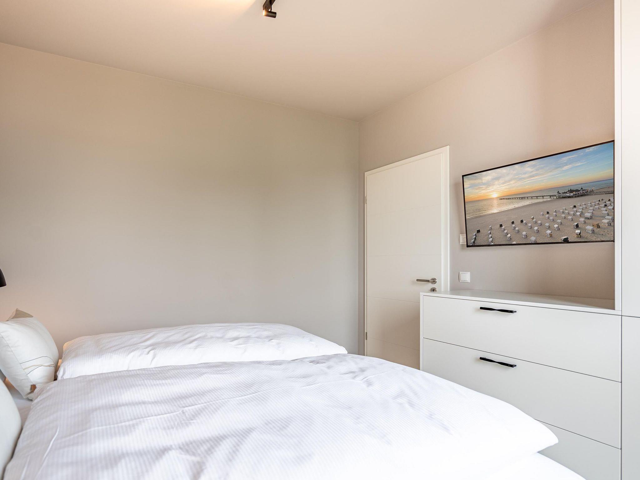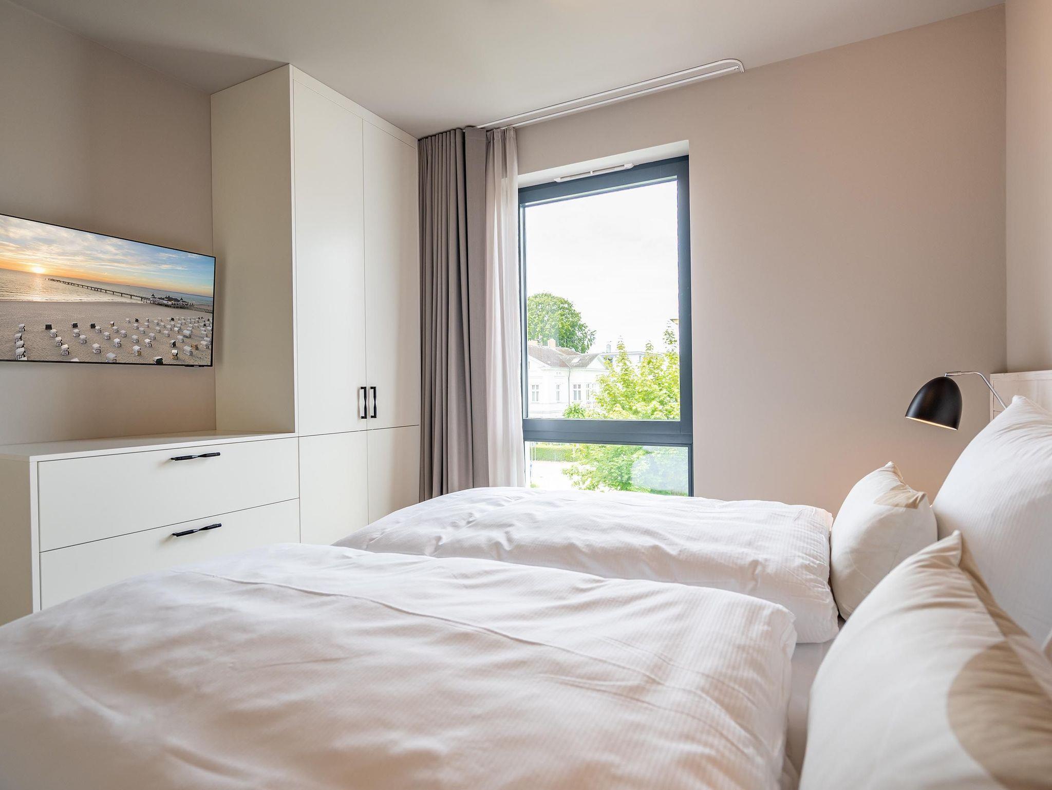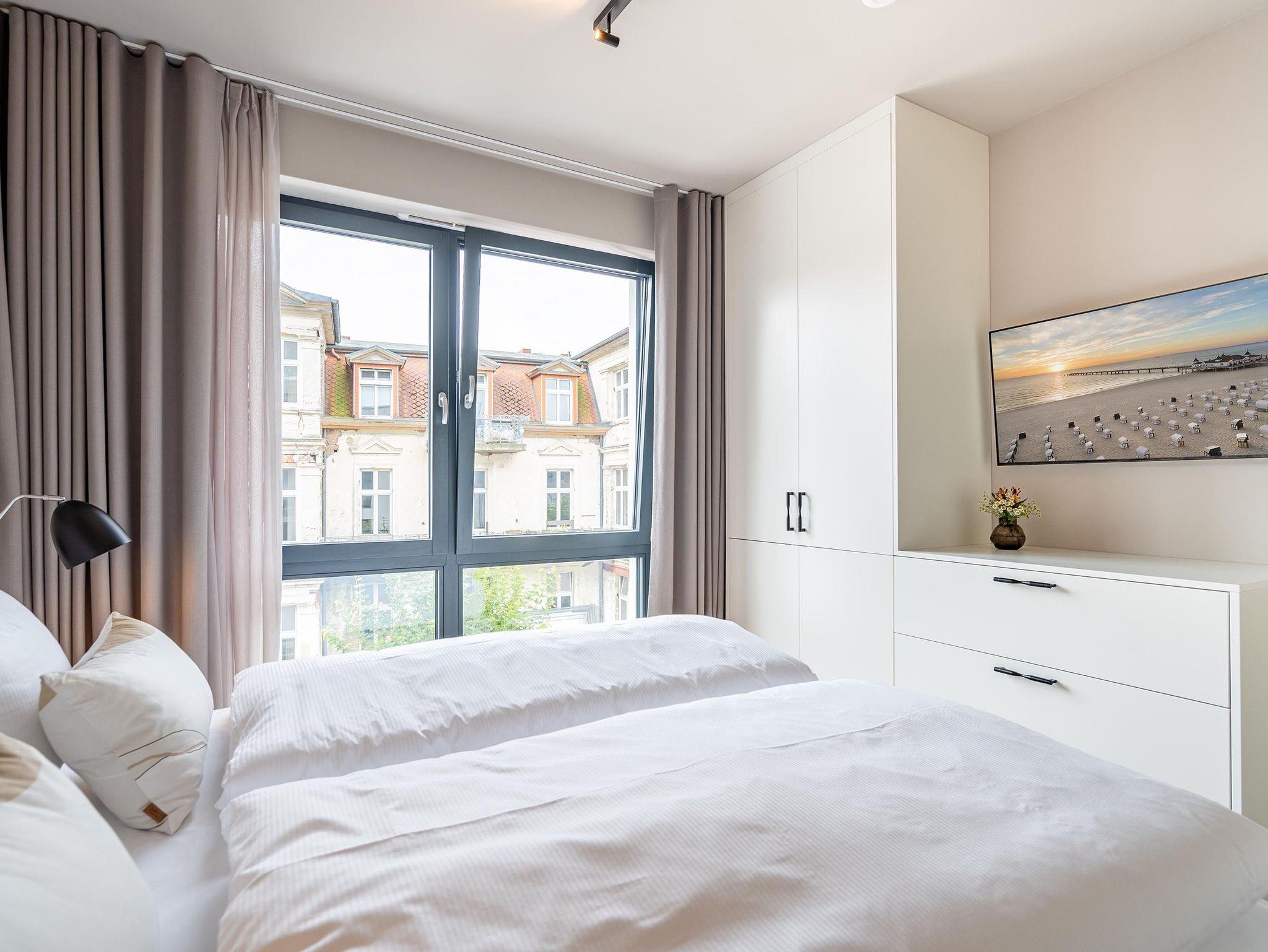 Für alle Ostseesehnsüchtigen wird das 3-Raum-Appartement B 2.7 (Haus B) in der 2. Etage der Strandterrasse das absolute Traumauszeitdomizil sein. Ein wunderschönes und kuscheliges Designkonzept, eine moderne und hochwertige Ausstattung und die Nähe zur Ostsee sprechen für sich. Die 58 Quadratmeter bieten Platz für bis zu 4 Personen. Doch finden Sie hier nicht nur einen Platz zum Schlafen, sondern einen Ort zum Wohlfühlen und Runterkommen. Das Sofa und der Sessel sind eine wunderbare Kuschelzone zum Filme schauen auf dem großen Flat-TV (50 Zoll) oder zum Träumen vor dem Elektrokamin (ohne Wärmeabgabe). Die offene Küche ist mit hochwertigen Elektrogeräten wie einem Backofen, einem 4-Platten-Induktionsherd, Toaster, Kaffeemaschine und sogar einer Nespresso-Kapselmaschine ausgestattet. Einem gemeinsamen Kochvergnügen steht also nichts im Weg. Die Mahlzeiten verköstigen, können Sie am schönen, großen Esstisch. Sie wollen sich schon am Morgen die Ostseebrise um die Nase wehen lassen? Der Balkon mit Süd-West-Ausrichtung bietet einen herrlichen Blick auf die wunderschönen Villen des alten Seebades. Genießen Sie auf ihm die romantischen Sonnenuntergänge am Tisch mit 4 Stühlen. Die Wohnung verfügt über zwei Schlafzimmer, jedes mit einem komfortablen Boxspringdoppelbett (1,80m x 2,00m), einem Kleiderschrank und einer Kommode ausgestattet sowie einem Flat-TV (43 Zoll). Zwei moderne Badezimmer mit Natursteinverkleidung verfügen jeweils über einen Waschtisch, Dusche und WC. Ein PKW-Stellplatz in der Tiefgarage sorgt für bequemes Parken. Kommen Sie gut an in Ihrer Auszeit am Meer.