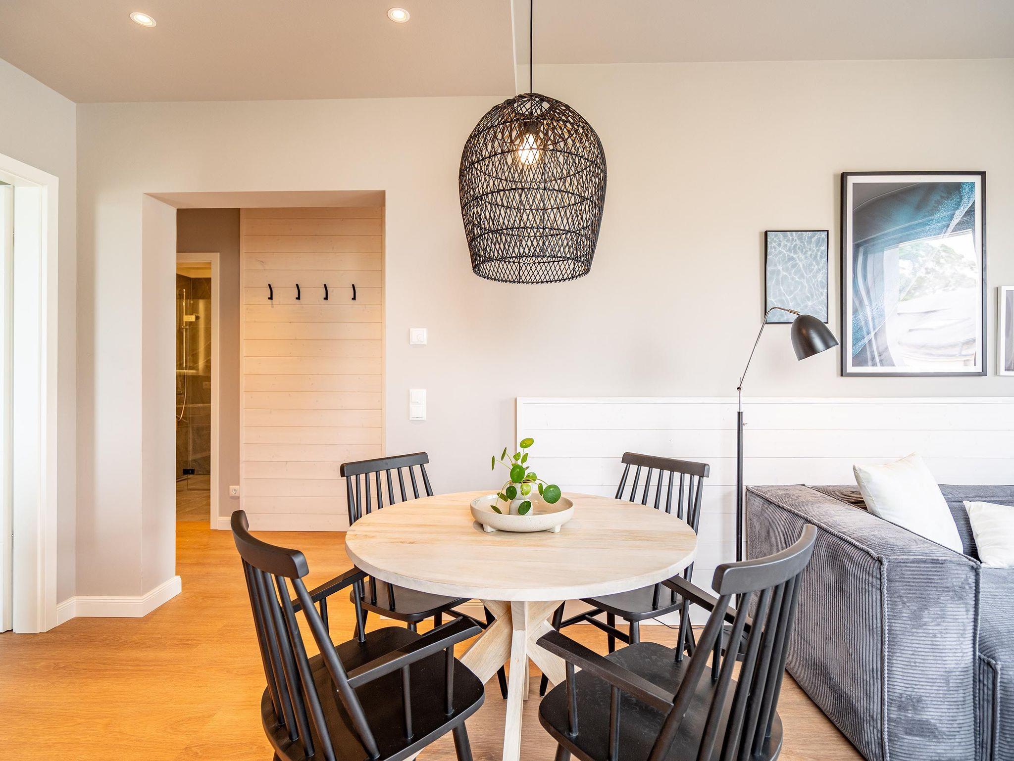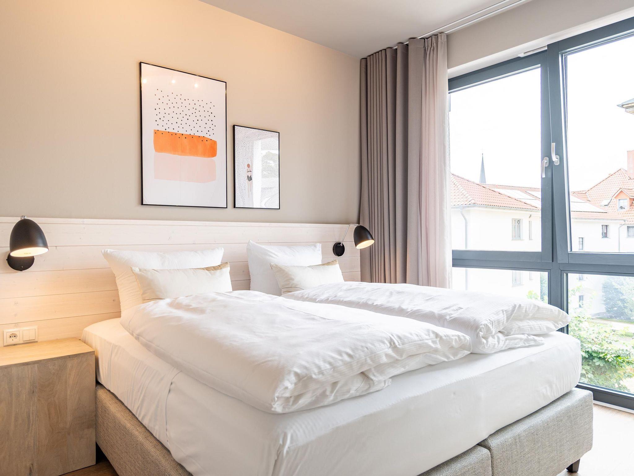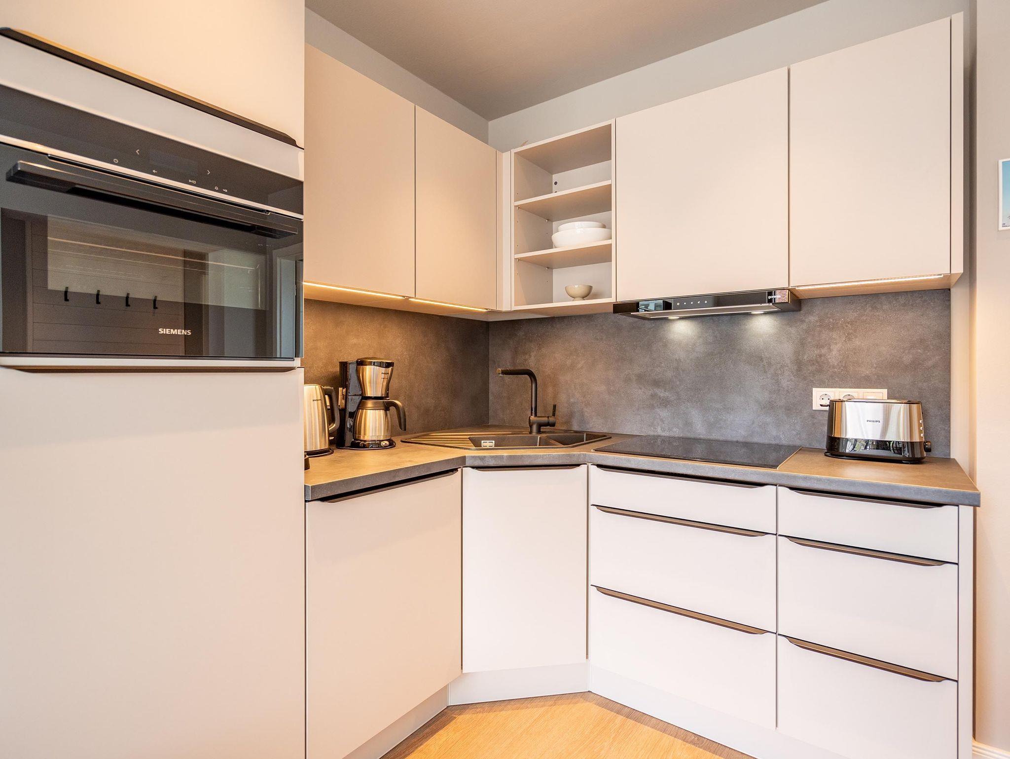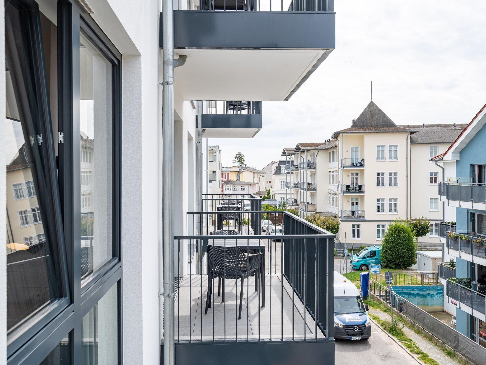 Für alle Ostseesehnsüchtigen wird das 3-Raum-Appartement B 2.7 (Haus B) in der 2. Etage der Strandterrasse das absolute Traumauszeitdomizil sein. Ein wunderschönes und kuscheliges Designkonzept, eine moderne und hochwertige Ausstattung und die Nähe zur Ostsee sprechen für sich. Die 58 Quadratmeter bieten Platz für bis zu 4 Personen. Doch finden Sie hier nicht nur einen Platz zum Schlafen, sondern einen Ort zum Wohlfühlen und Runterkommen. Das Sofa und der Sessel sind eine wunderbare Kuschelzone zum Filme schauen auf dem großen Flat-TV (50 Zoll) oder zum Träumen vor dem Elektrokamin (ohne Wärmeabgabe). Die offene Küche ist mit hochwertigen Elektrogeräten wie einem Backofen, einem 4-Platten-Induktionsherd, Toaster, Kaffeemaschine und sogar einer Nespresso-Kapselmaschine ausgestattet. Einem gemeinsamen Kochvergnügen steht also nichts im Weg. Die Mahlzeiten verköstigen, können Sie am schönen, großen Esstisch. Sie wollen sich schon am Morgen die Ostseebrise um die Nase wehen lassen? Der Balkon mit Süd-West-Ausrichtung bietet einen herrlichen Blick auf die wunderschönen Villen des alten Seebades. Genießen Sie auf ihm die romantischen Sonnenuntergänge am Tisch mit 4 Stühlen. Die Wohnung verfügt über zwei Schlafzimmer, jedes mit einem komfortablen Boxspringdoppelbett (1,80m x 2,00m), einem Kleiderschrank und einer Kommode ausgestattet sowie einem Flat-TV (43 Zoll). Zwei moderne Badezimmer mit Natursteinverkleidung verfügen jeweils über einen Waschtisch, Dusche und WC. Ein PKW-Stellplatz in der Tiefgarage sorgt für bequemes Parken. Kommen Sie gut an in Ihrer Auszeit am Meer.