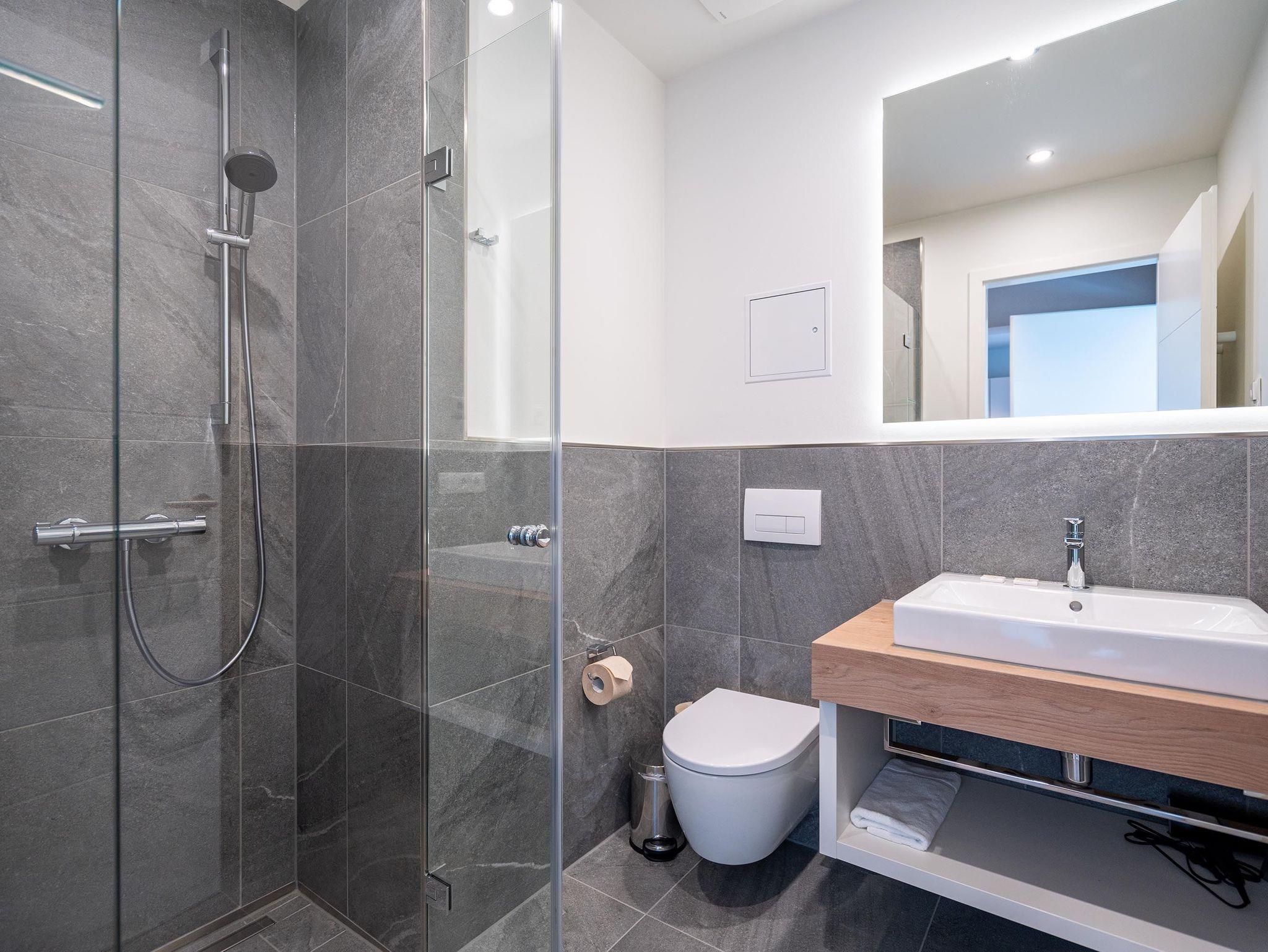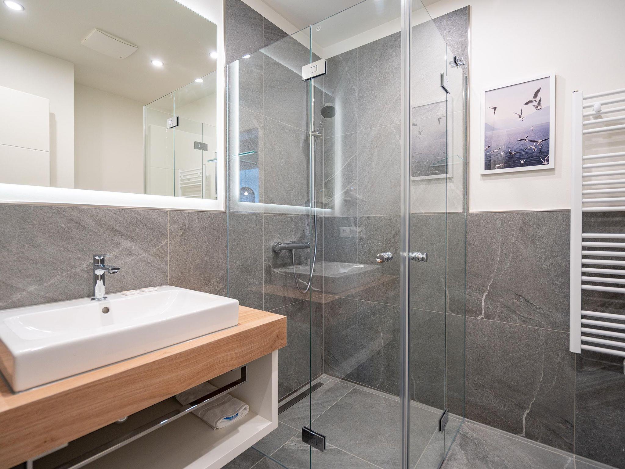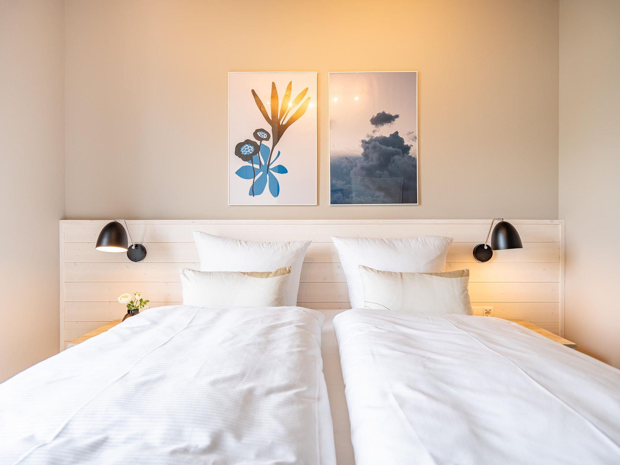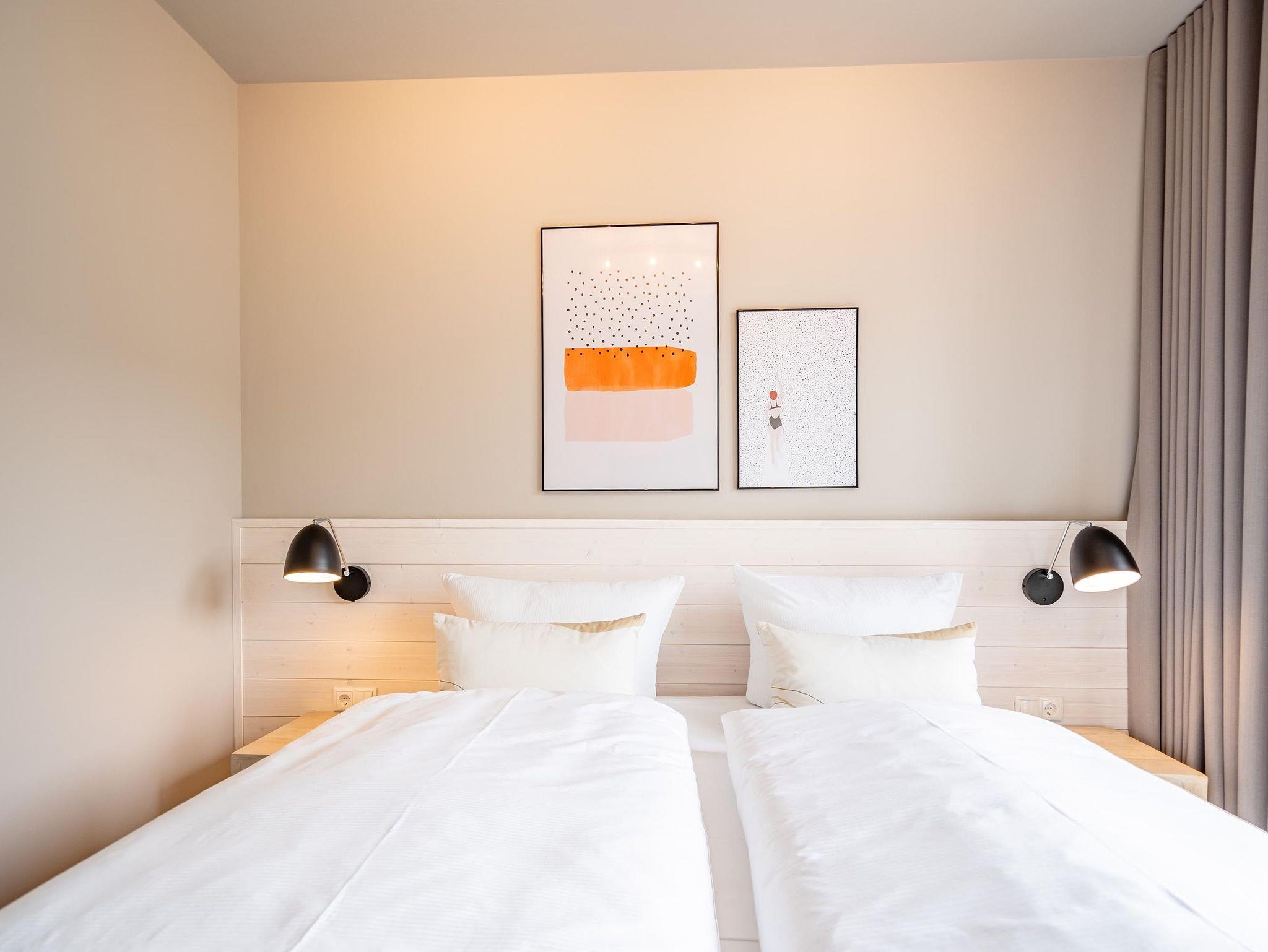 Für alle Ostseesehnsüchtigen wird das 3-Raum-Appartement B 2.7 (Haus B) in der 2. Etage der Strandterrasse das absolute Traumauszeitdomizil sein. Ein wunderschönes und kuscheliges Designkonzept, eine moderne und hochwertige Ausstattung und die Nähe zur Ostsee sprechen für sich. Die 58 Quadratmeter bieten Platz für bis zu 4 Personen. Doch finden Sie hier nicht nur einen Platz zum Schlafen, sondern einen Ort zum Wohlfühlen und Runterkommen. Das Sofa und der Sessel sind eine wunderbare Kuschelzone zum Filme schauen auf dem großen Flat-TV (50 Zoll) oder zum Träumen vor dem Elektrokamin (ohne Wärmeabgabe). Die offene Küche ist mit hochwertigen Elektrogeräten wie einem Backofen, einem 4-Platten-Induktionsherd, Toaster, Kaffeemaschine und sogar einer Nespresso-Kapselmaschine ausgestattet. Einem gemeinsamen Kochvergnügen steht also nichts im Weg. Die Mahlzeiten verköstigen, können Sie am schönen, großen Esstisch. Sie wollen sich schon am Morgen die Ostseebrise um die Nase wehen lassen? Der Balkon mit Süd-West-Ausrichtung bietet einen herrlichen Blick auf die wunderschönen Villen des alten Seebades. Genießen Sie auf ihm die romantischen Sonnenuntergänge am Tisch mit 4 Stühlen. Die Wohnung verfügt über zwei Schlafzimmer, jedes mit einem komfortablen Boxspringdoppelbett (1,80m x 2,00m), einem Kleiderschrank und einer Kommode ausgestattet sowie einem Flat-TV (43 Zoll). Zwei moderne Badezimmer mit Natursteinverkleidung verfügen jeweils über einen Waschtisch, Dusche und WC. Ein PKW-Stellplatz in der Tiefgarage sorgt für bequemes Parken. Kommen Sie gut an in Ihrer Auszeit am Meer.