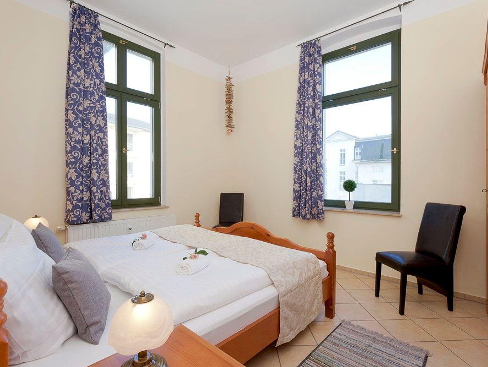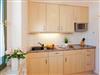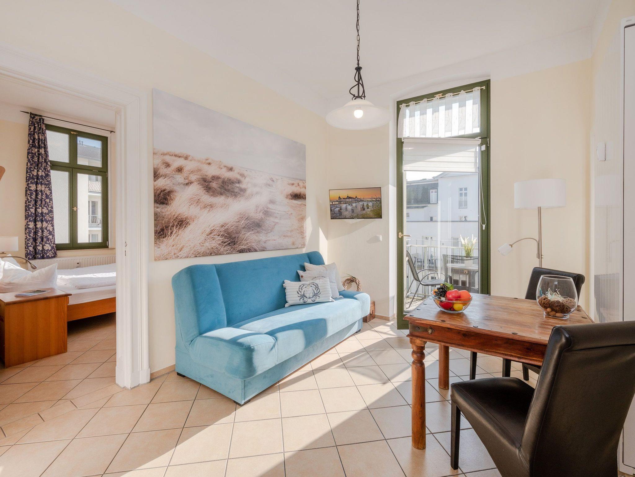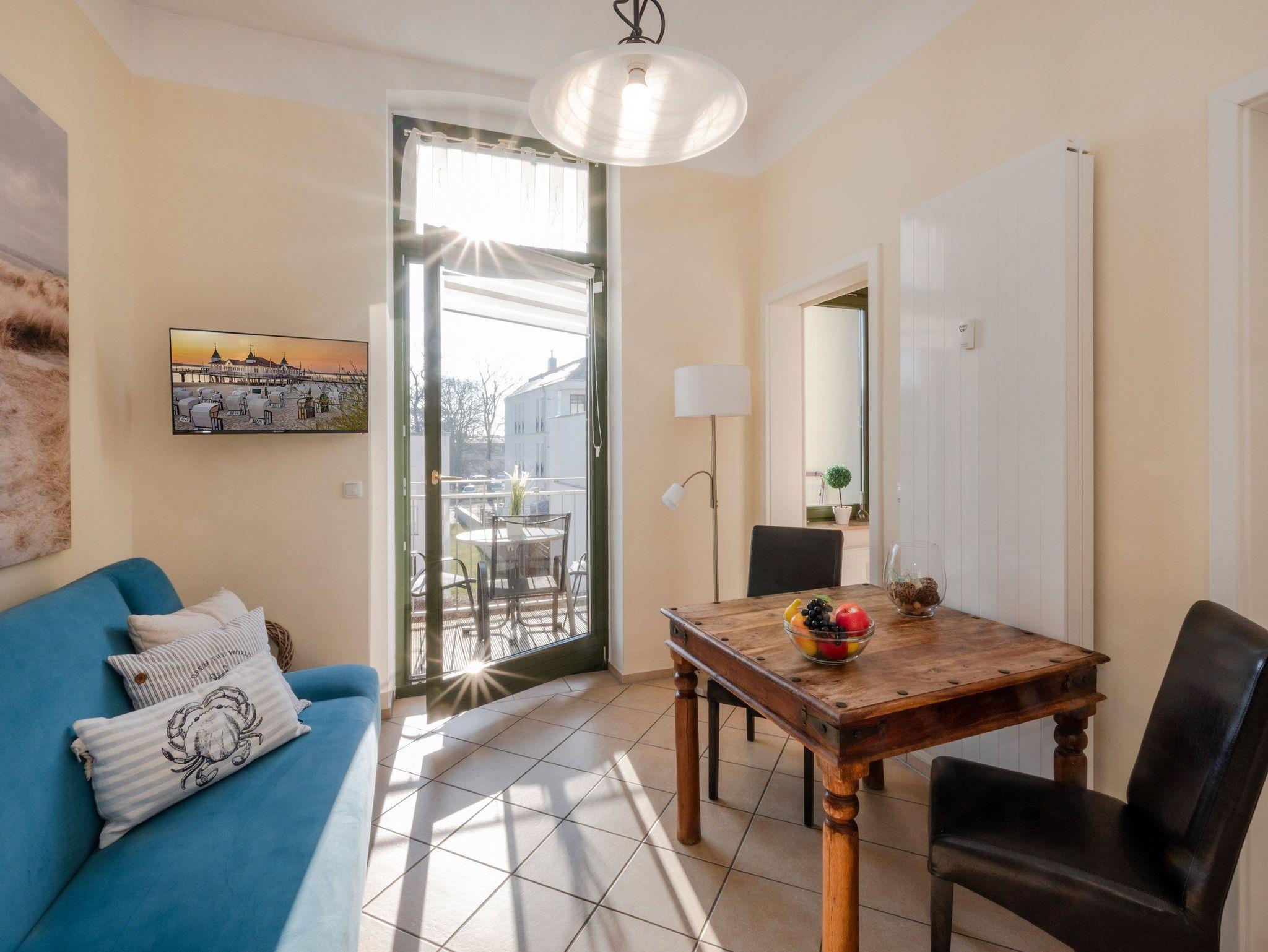 Das helle Zwei-Zimmer-Appartement liegt im 1. Obergeschoss der Villa Goodewind und hat eine Größe von 40 Quadratmetern. Der Wohnraum ist in mediterranen Farben gehalten. Sofa und ein Flat TV sowie ein Esstisch für 2 Personen laden zum Erholen, Ausspannen und Schlemmen ein. Die separate Küche ist mit allem ausgestattet ist, was Sie für die Zubereitung Ihrer Lieblingsspeisen benötigen. Neben zwei Cerankochfeldern und einem Kühlschrank mit Gefrierfach finden sich Geschirrspüler, Mikrowelle, Wasserkocher, Toaster und eine Kaffeemaschine. Das freundliche Schlafzimmer lockt für die Nachtruhe, aber auch für ein Schlummerstündchen am Nachmittag mit einem bequemen Doppelbett (200 x 200cm / zwei getrennte Matratzen).