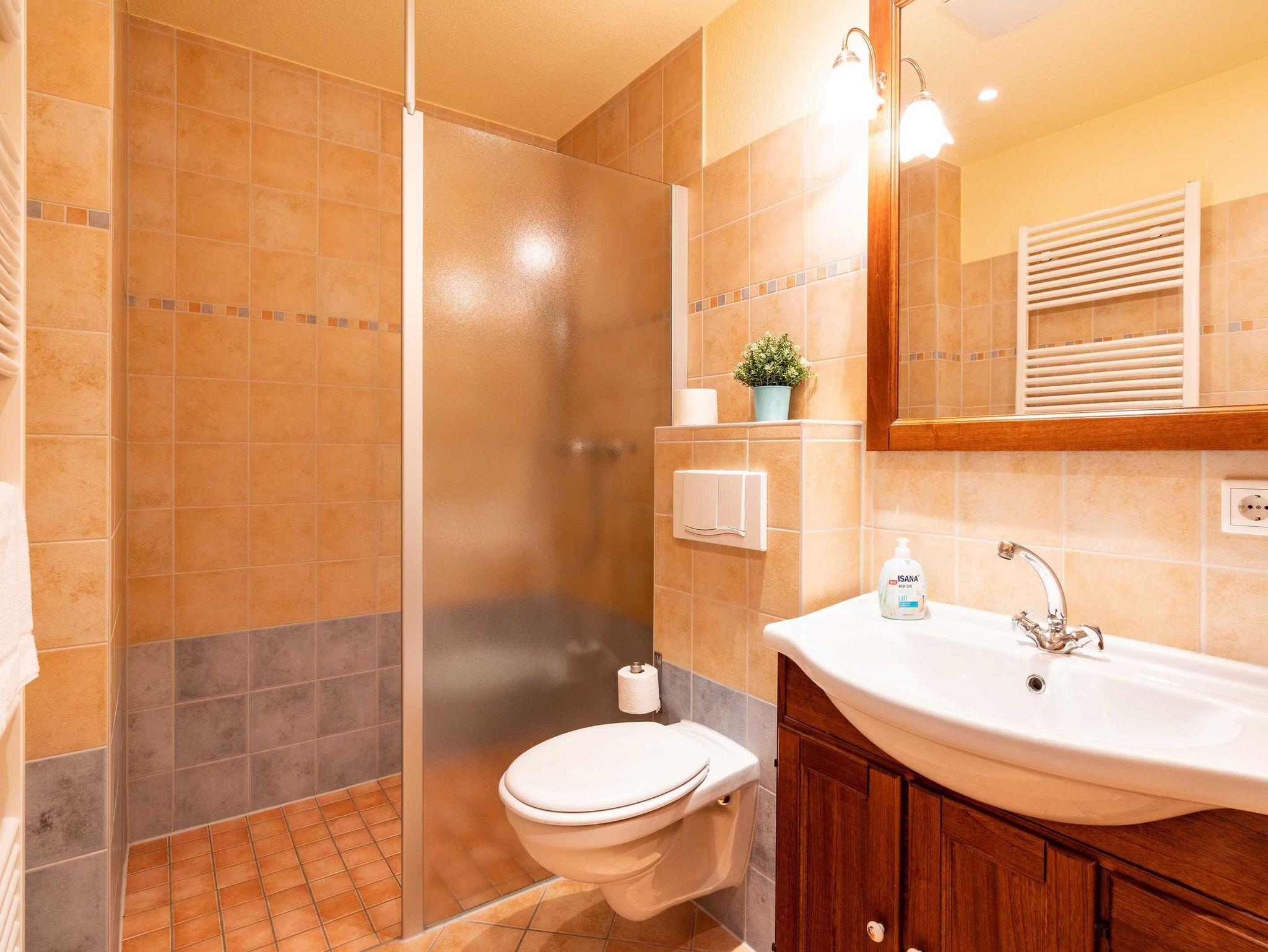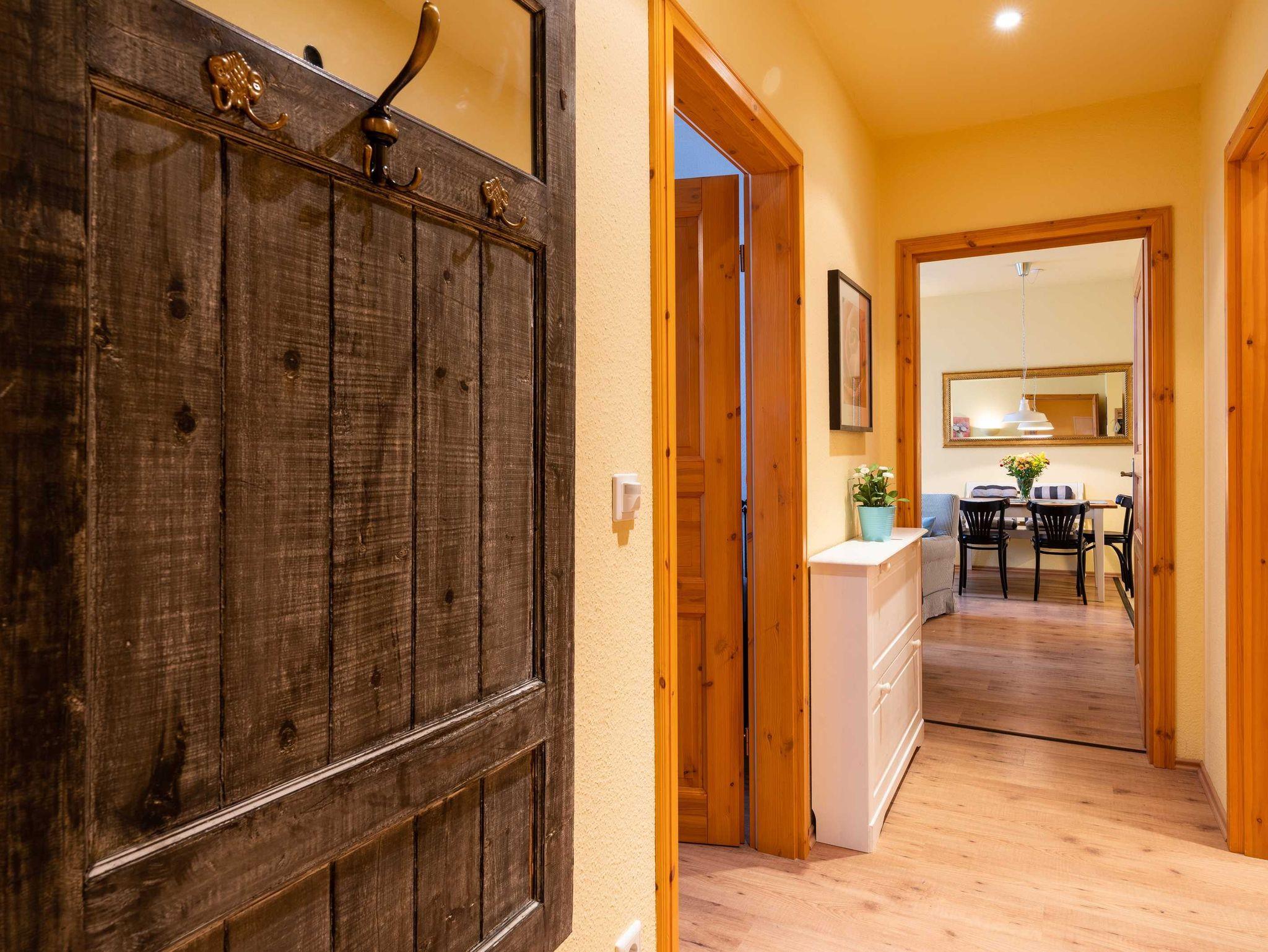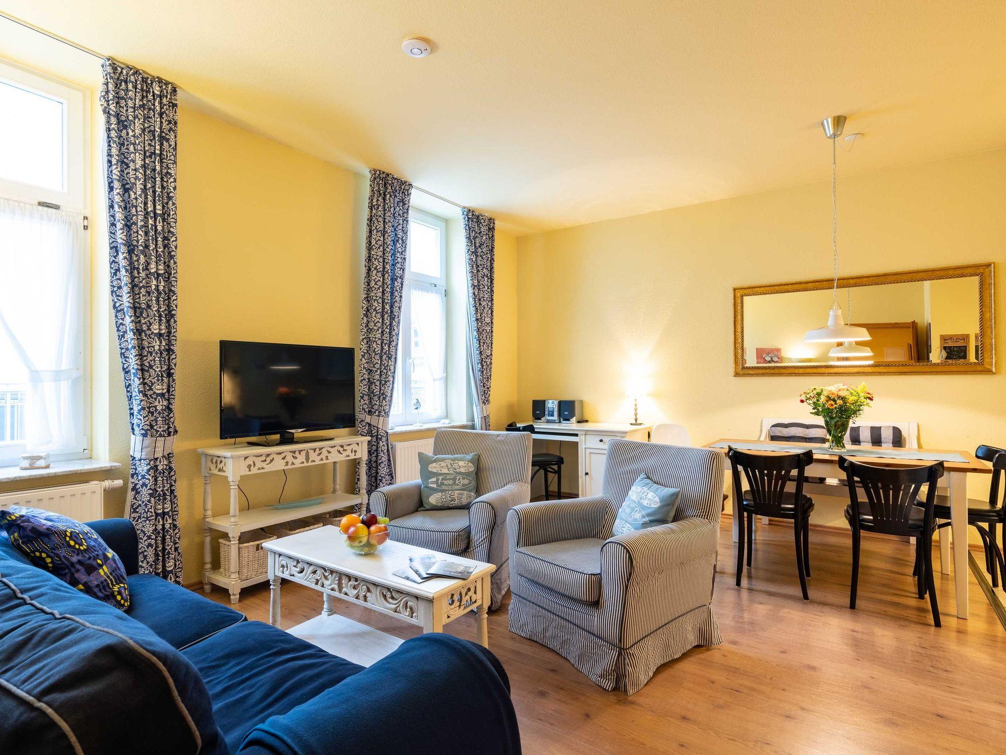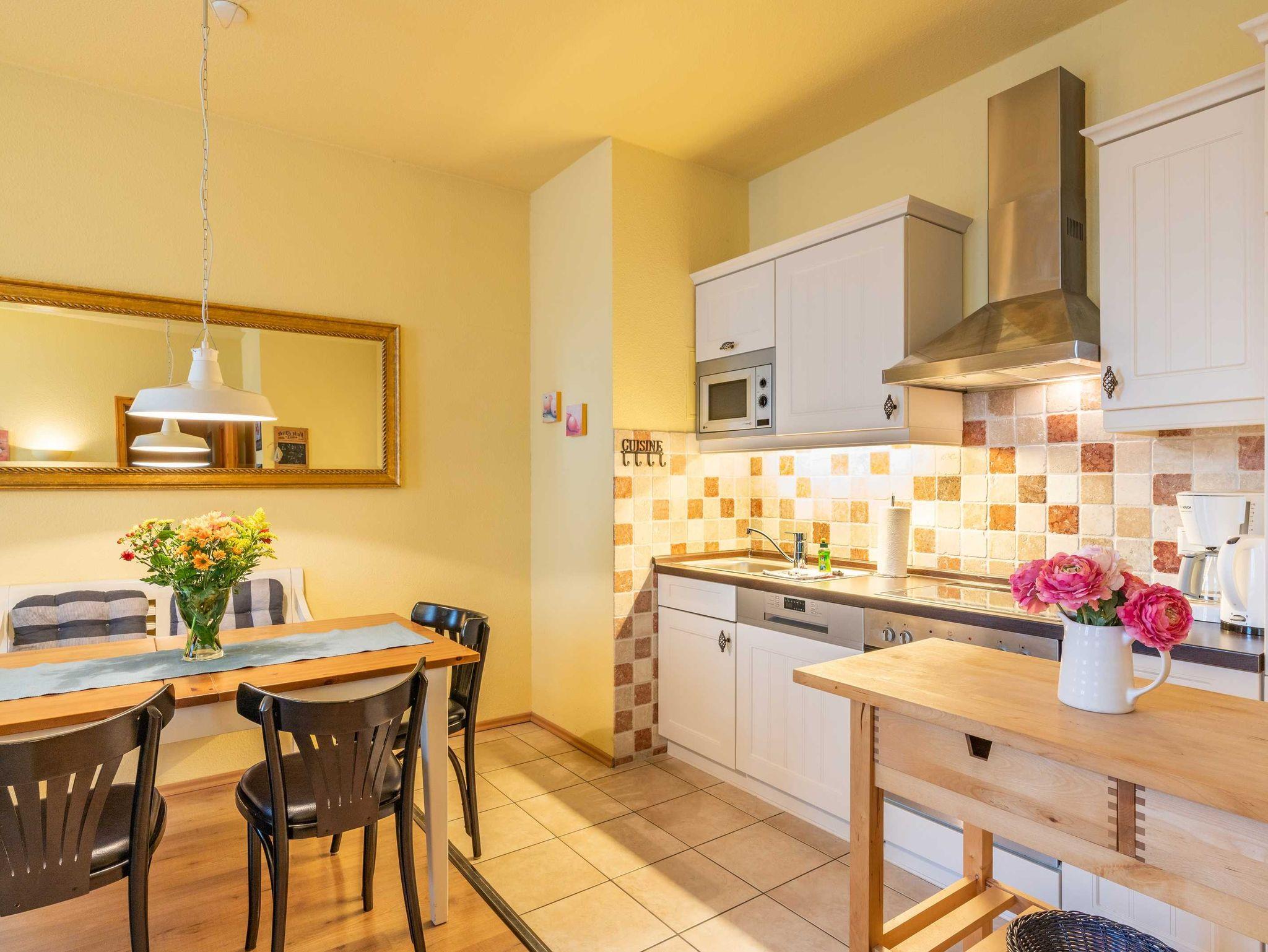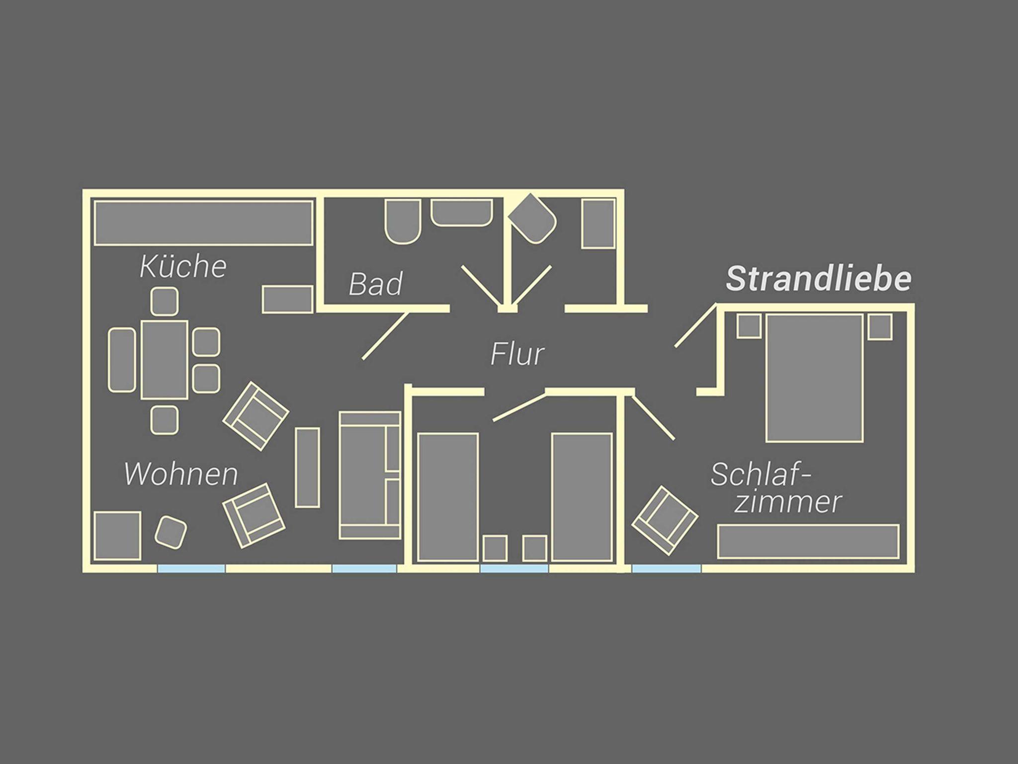Das 60 qm große Appartement Strandliebe im Erdgeschoss verfügt über zwei Schlafzimmer (ein Doppelbett und zwei Einzelbetten) und ein schön eigerichtetes Wohnzimmer. Die offene Küche ist mit allem, was Sie für den täglichen Bedarf benötigen, ausgestattet. Die Wohnung verfügt über ein separates WC und ein Badezimmer mit Dusche.