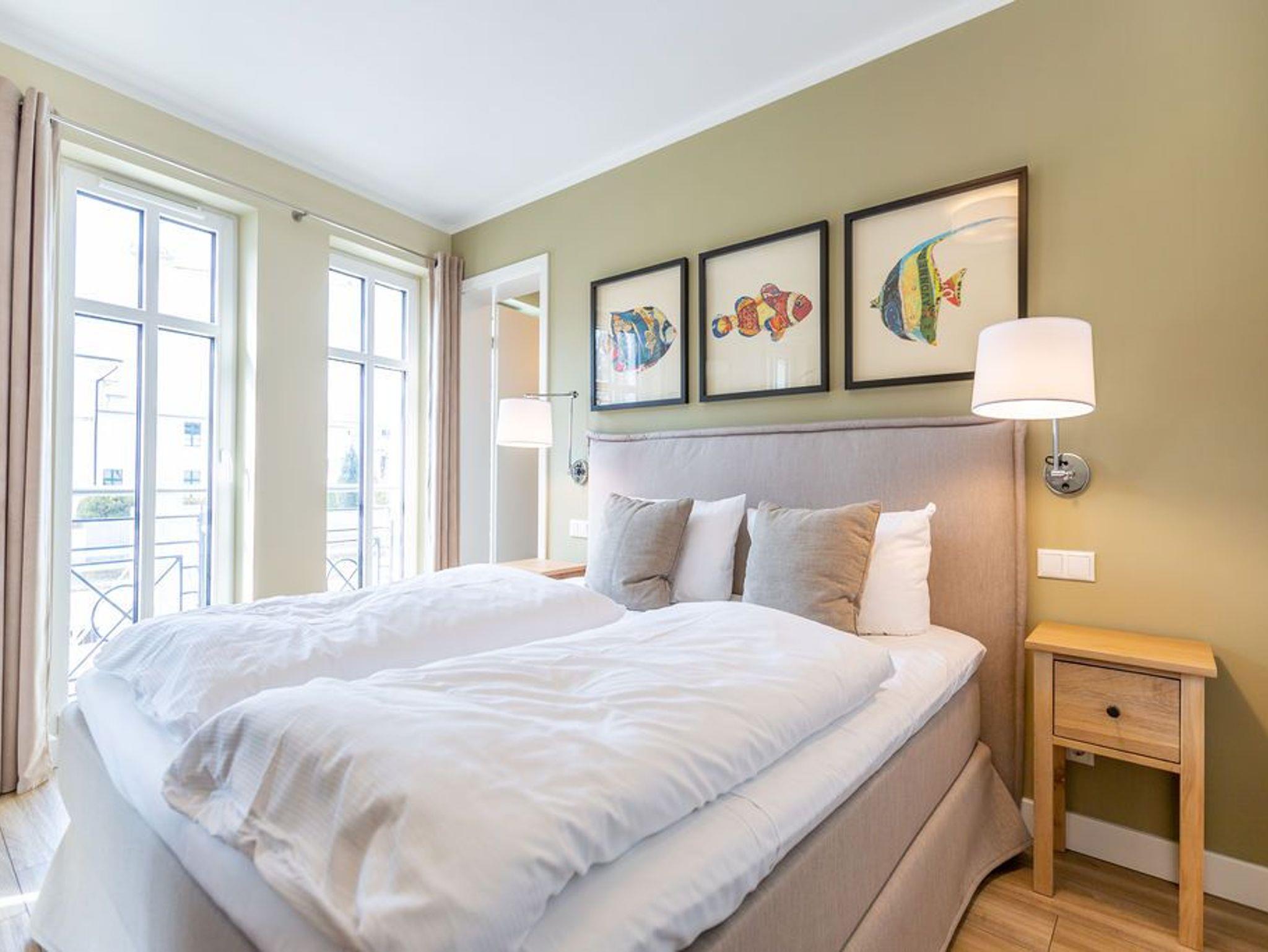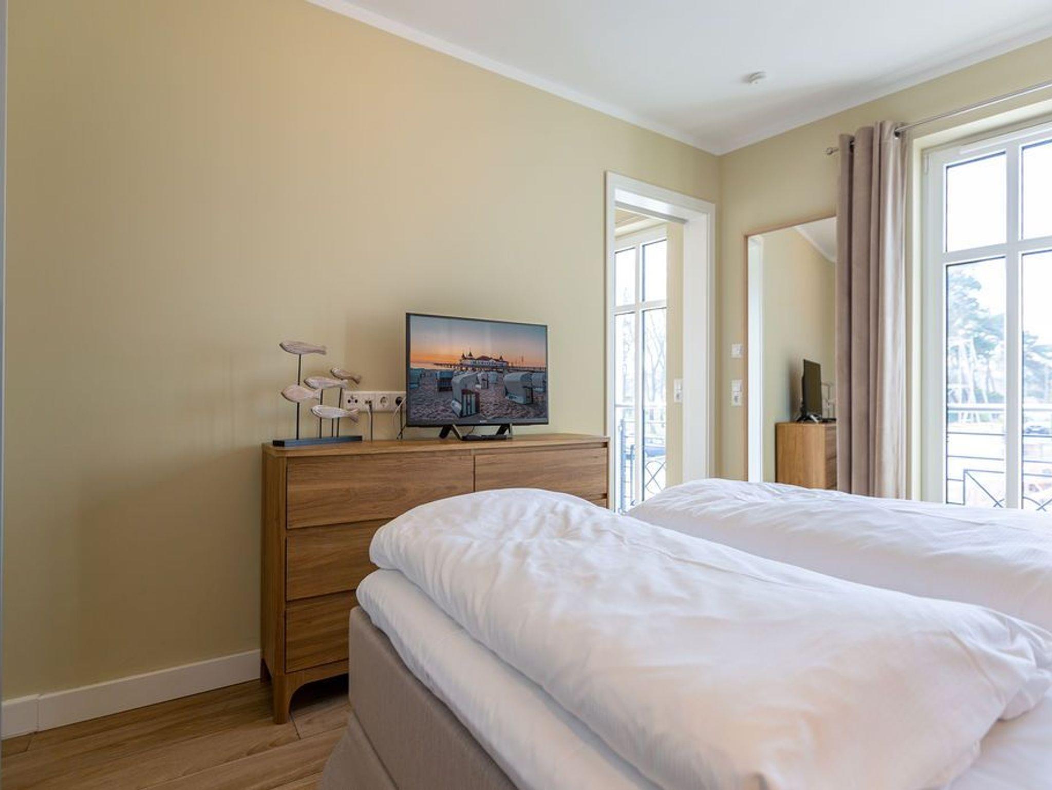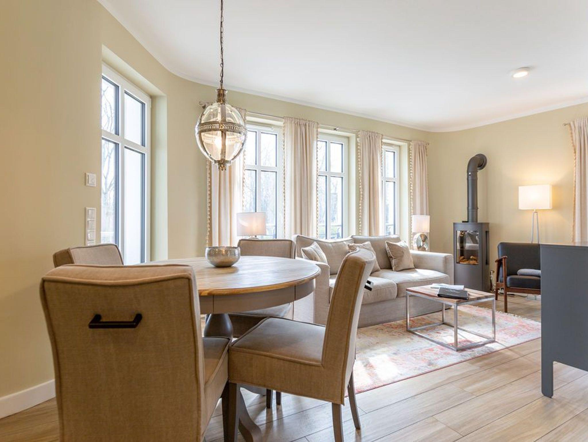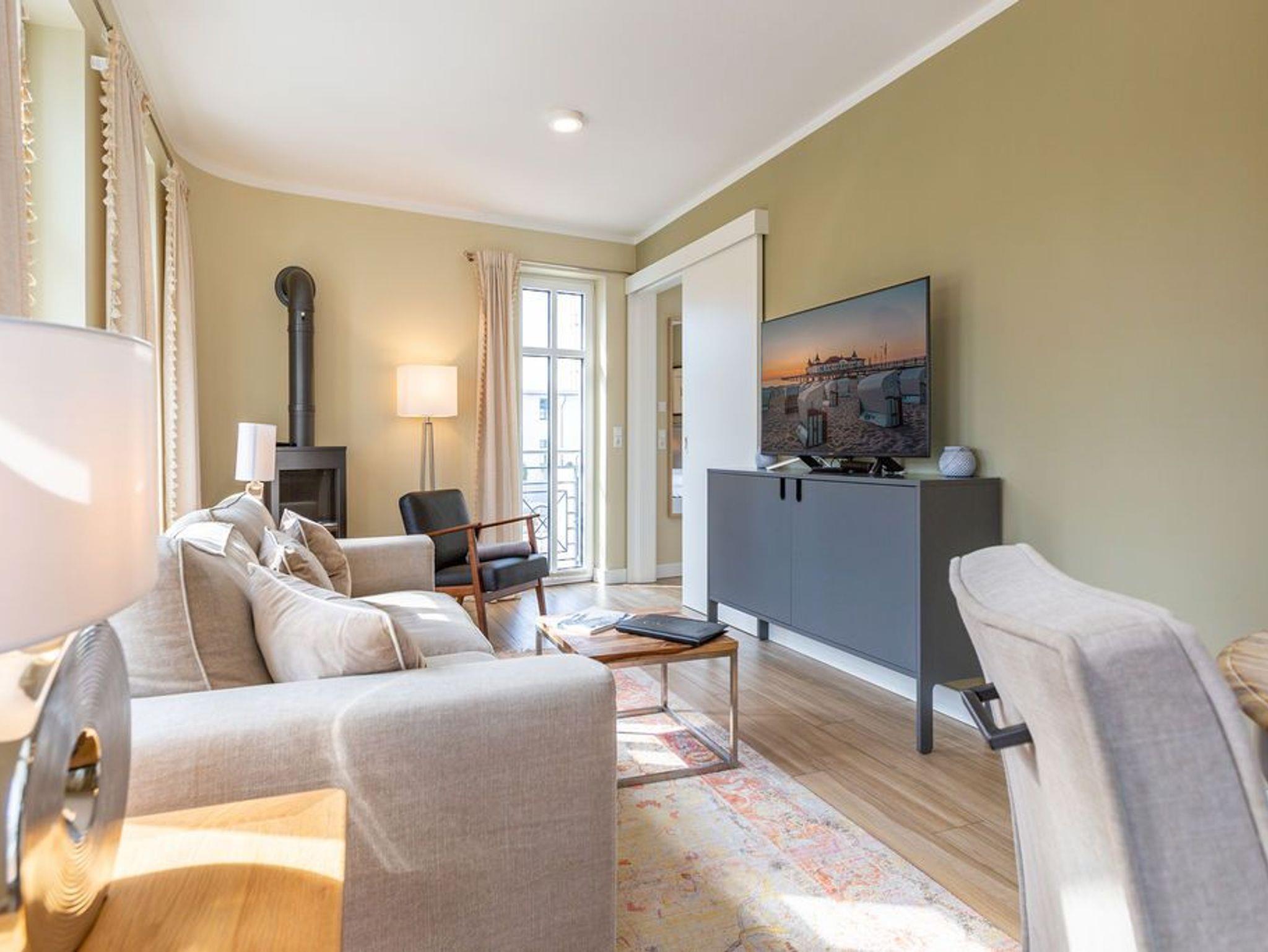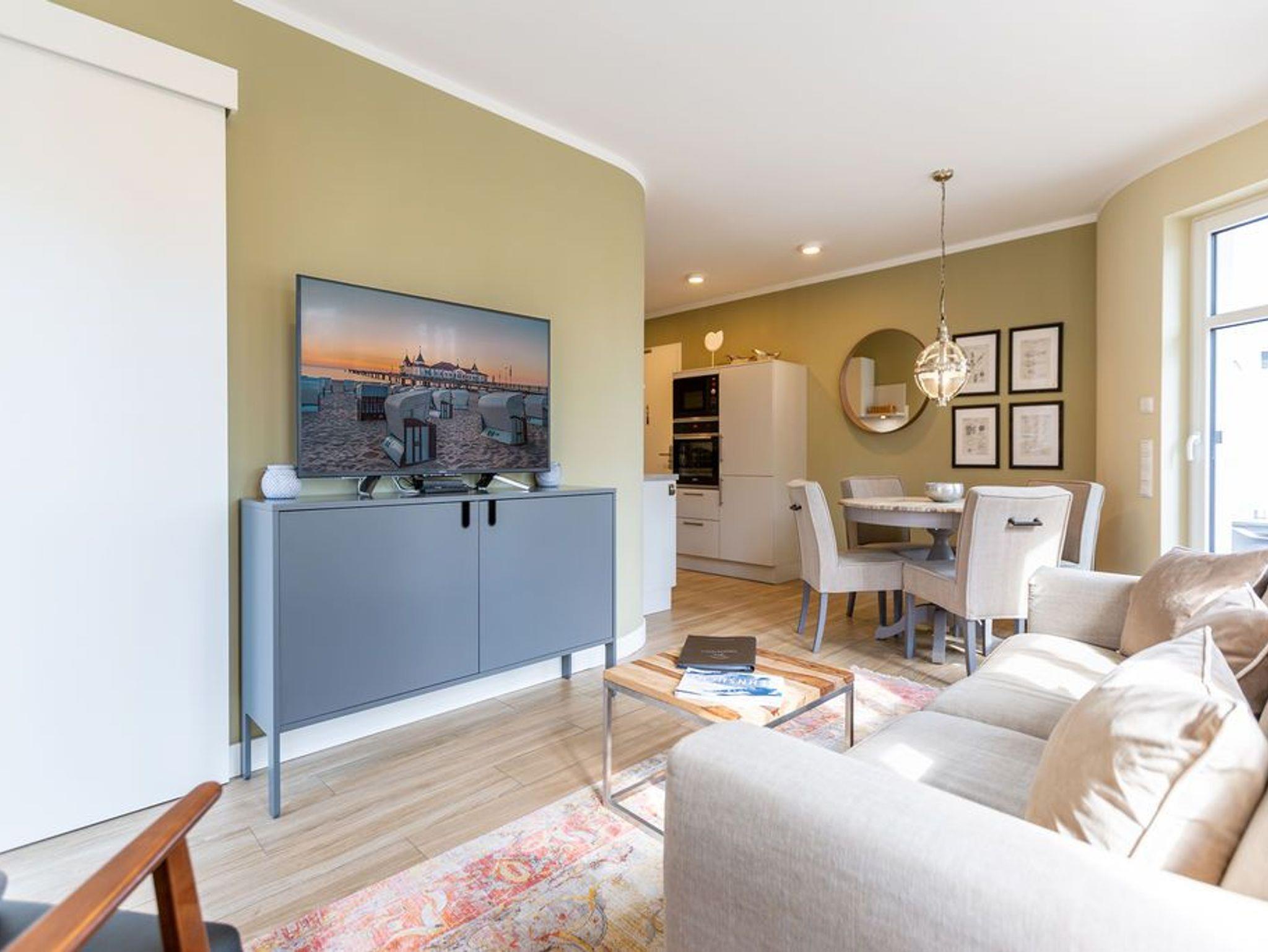 Ein außergewöhnliches, kleines Urlaubsreich erwartet Sie in den 57 Quadratmetern dieser Ferienwohnung im ersten Obergeschoss. Ein Wohlfühlreich für zwei Personen der Extraklasse. Ein Kleinkind bis zwei Jahre kann im Kinderreisebett ebenfalls hier untergebracht werden. Die zwei Zimmer des Appartements sind stilvoll und modern eingerichtet. Hier passt vom Raumkonzept bis zum Accessoires alles harmonisch zusammen. Kommen Sie an und lassen Sie die Sorgen des Alltags einfach hinter sich. Ein schönes und großzügiges Wohn-Esszimmer empfängt Sie mit viel Charme und Flair. Gemütlich können Sie es sich auf den nordischen Design-Klassikern wie dem Sofa oder dem Sessel machen. Von hier aus haben Sie den großen Flat-TV und den Gas-Kamin gut im Blick. Der Urlaubsentspannung steht also nichts mehr im Weg. Ein schöner, runder Esstisch lädt zum Essen ein. Zubereiten können Sie die aufgetischten Köstlichkeiten direkt in der offenen Küche. Sie ist mit allen nötigen Geräten und mit edlem Geschirr voll ausgestattet. Sie finden dort unter anderem eine Mikrowelle, eine Spülmaschine, Backofen und Herd sowie einen Kühlschrank mit Gefrierfach. Vom Wohnzimmer aus können Sie auf den kleinen Balkon hinaustreten. Sonnenüberflutet bietet er mit Blick auf das Grün des Kurparks und den Kirchturm der Ahlbecker Kirche ein schönes Plätzchen zum Verweilen. Ein breites und vor allem bequemes Boxspringdoppelbett (1,80 m x 2,00 m) schenkt Ihnen im Schlafzimmer Schlafvergnügen und erholsame Träume. Kuscheln ist hier ausdrücklich erlaubt. Ablageflächen finden Sie im Kleiderschrank und im Board unter dem Flat-TV. Das Badezimmer ist mit einer ebenerdigen Dusche, Doppel-Waschtisch und WC ausgestattet. Außerdem können Sie sich an kühlen Tagen in der Finnischen Sauna so richtig durchwärmen. Handtücher liegen für Sie bereit. Und auch die Betten sind bei Ihrer Anreise bezogen. In der Tiefgarage ist für Ihr Auto ein Stellplatz vorgesehen.
