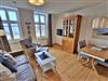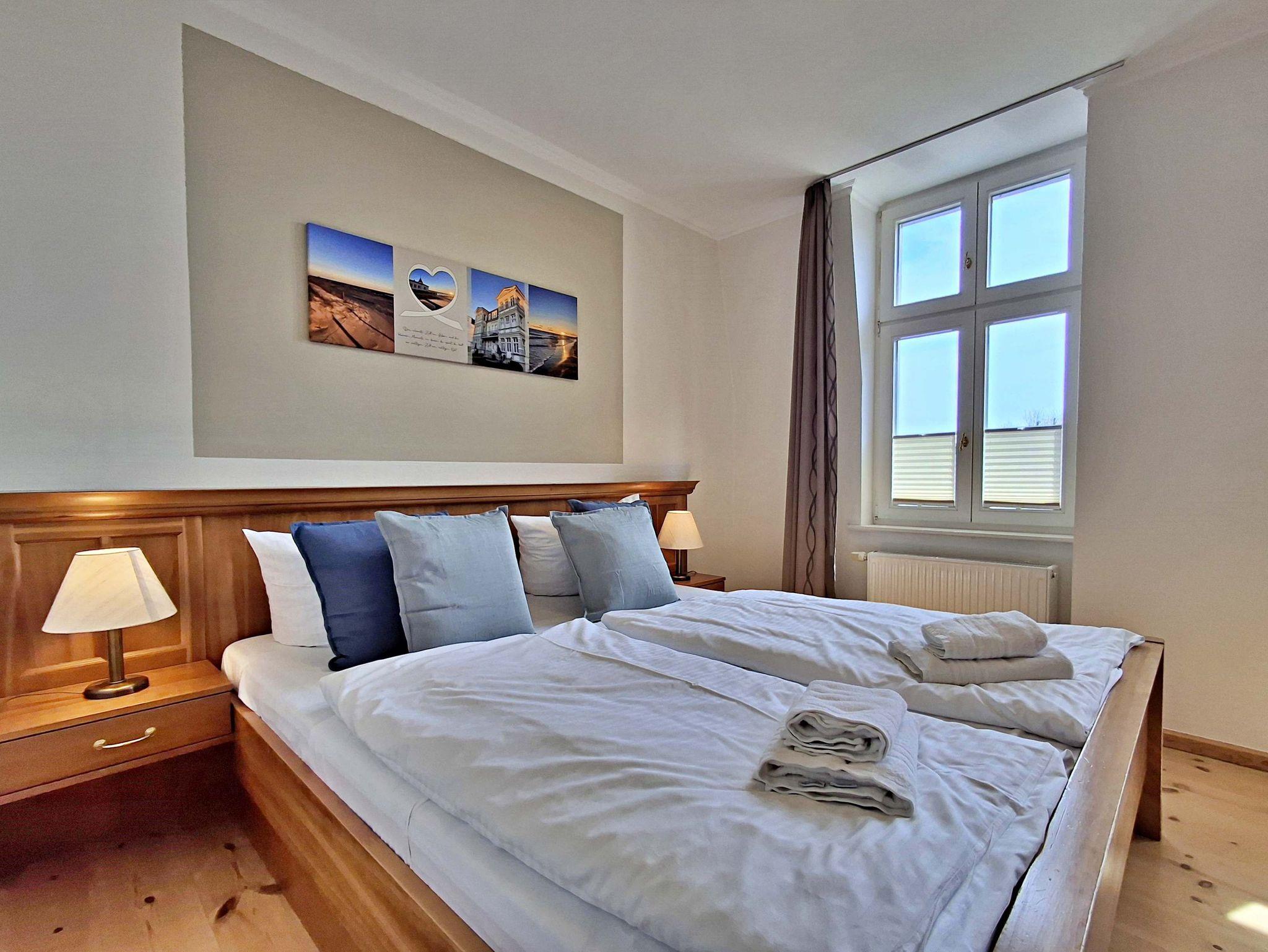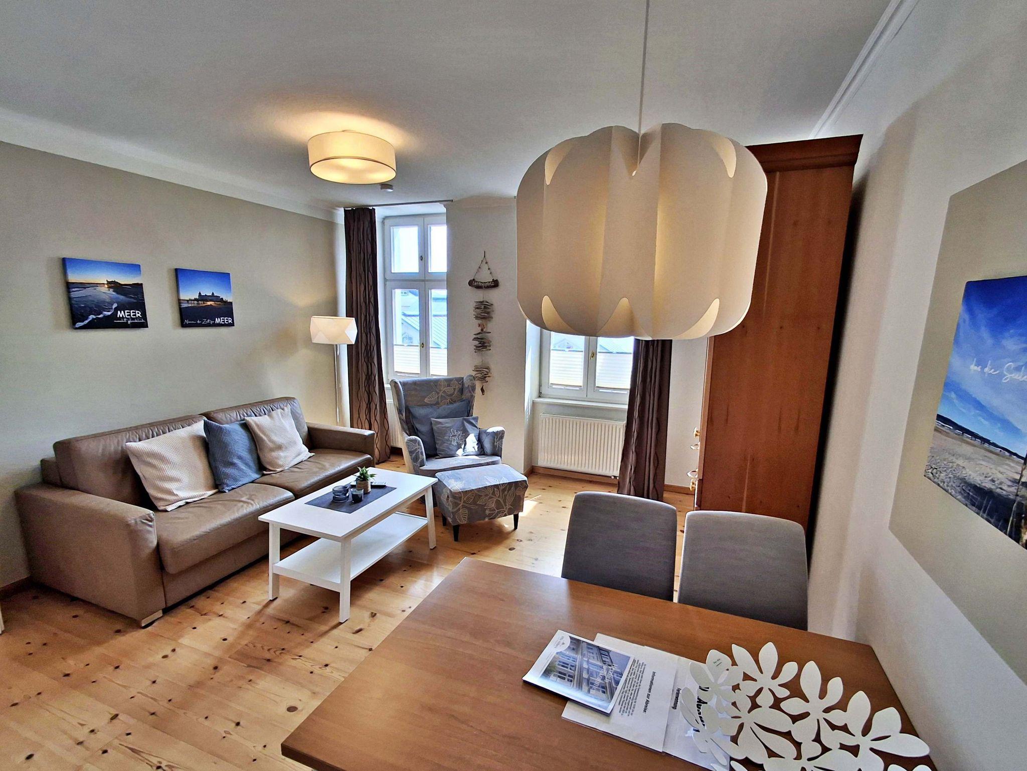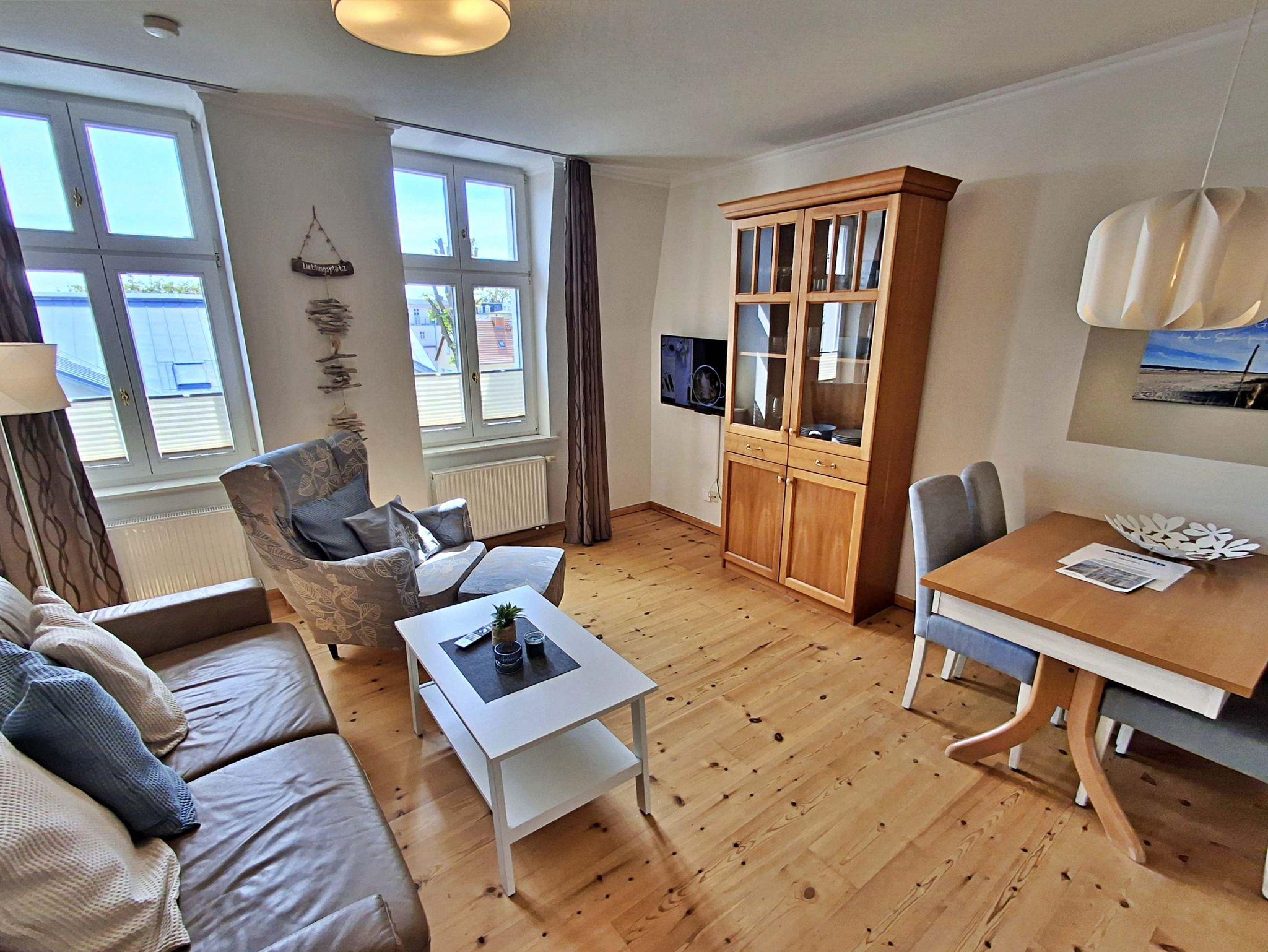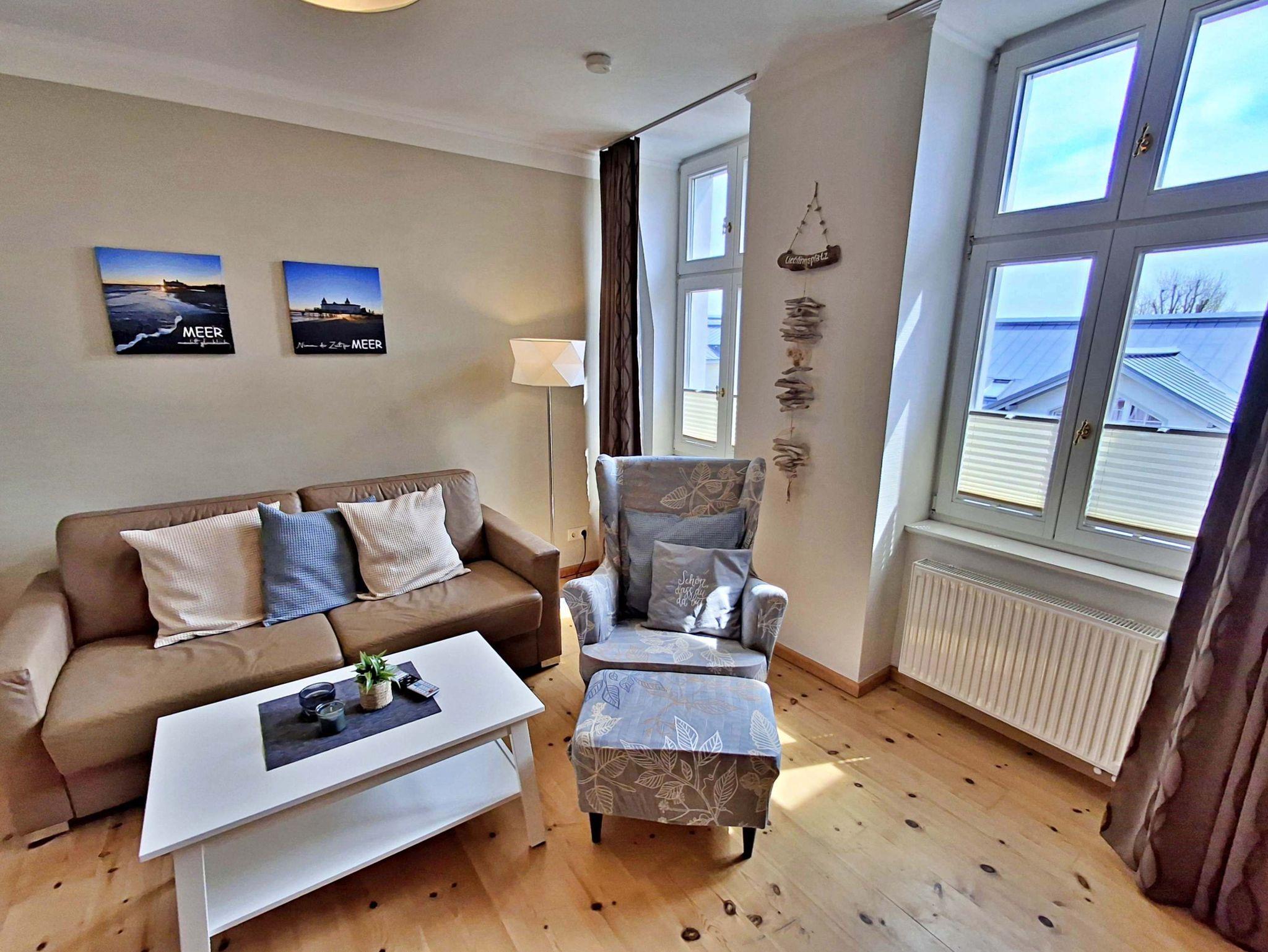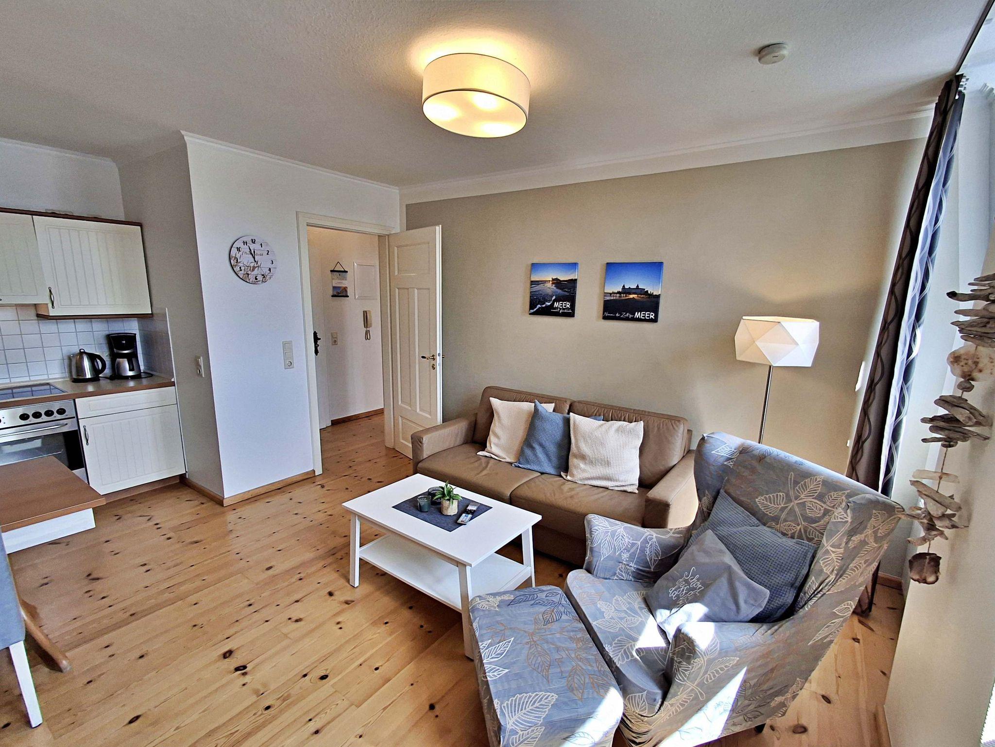 Die charmante 2-Zimmer-Wohnung Ahrenshoop im 2. Obergeschoss für max. 3 Erwachsene und 1 Kleinkind bis 3 Jahre befindet sich in der stilvoll restaurierten Villa Ahlbeck - nur wenige Schritte von der Promenade und dem Strand entfernt. Im hellen Wohnbereich befinden sich neben einer gemütlichen Couch (Aufbettungsmöglichkeit für 2 Personen) auch ein Esstisch mit 4 Stühlen, der genügend Platz für 4 Personen bietet sowie ein Sessel mit passendem Fußhocker. Die moderne Küchenzeile mit Ceranherd, Backofen, Geschirrspüler, Mikrowelle, Kaffeemaschine, Wasserkocher und Toaster lässt keine Wünsche offen. Für die Unterhaltung sorgen ein Smart-TV und kostenfreies W-LAN. Das Schlafzimmer verfügt über ein Doppelbett und das Badezimmer hat DU/WC.
