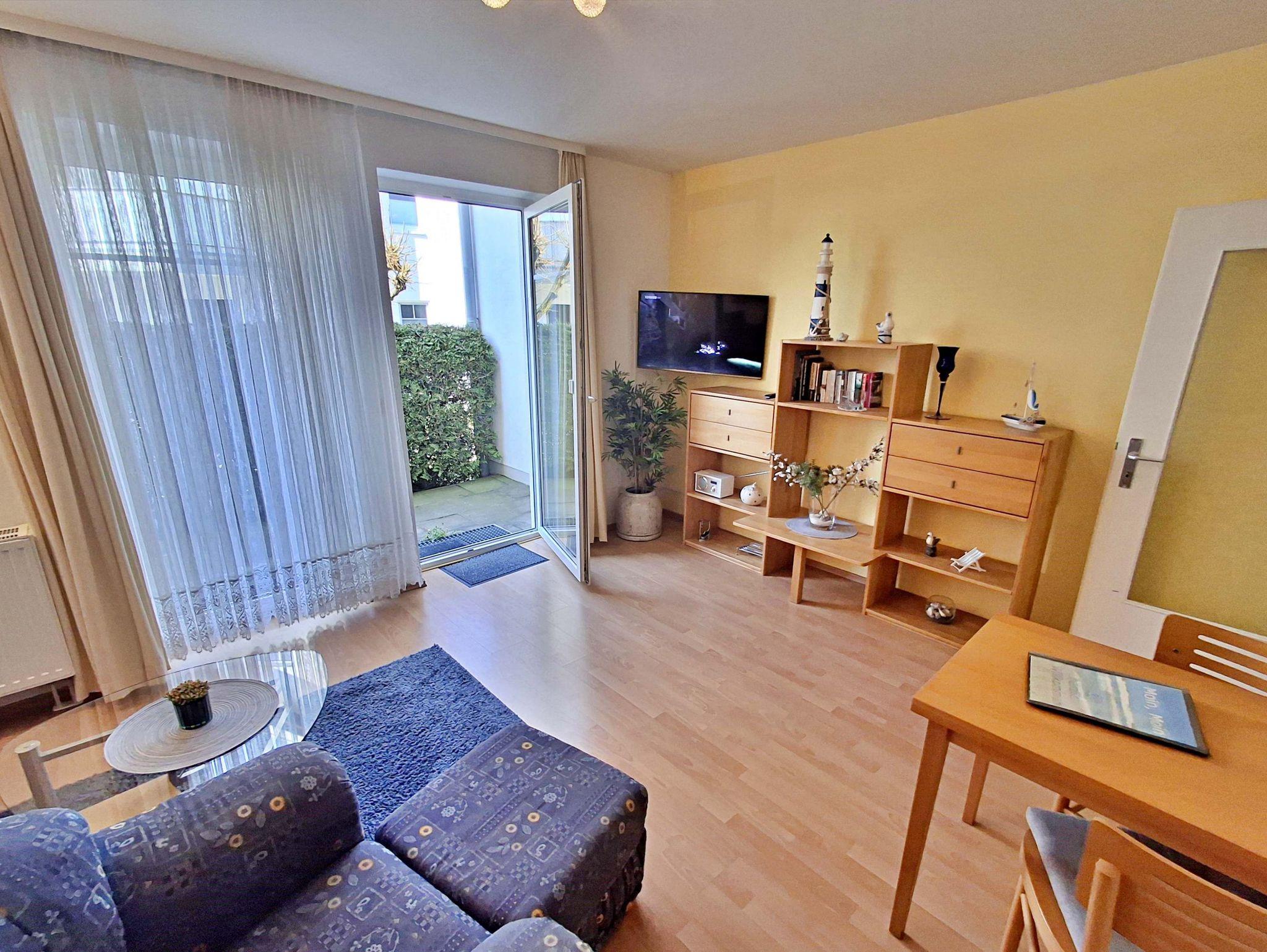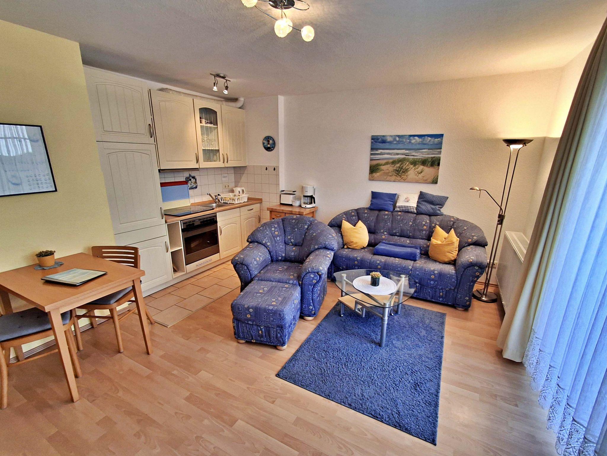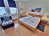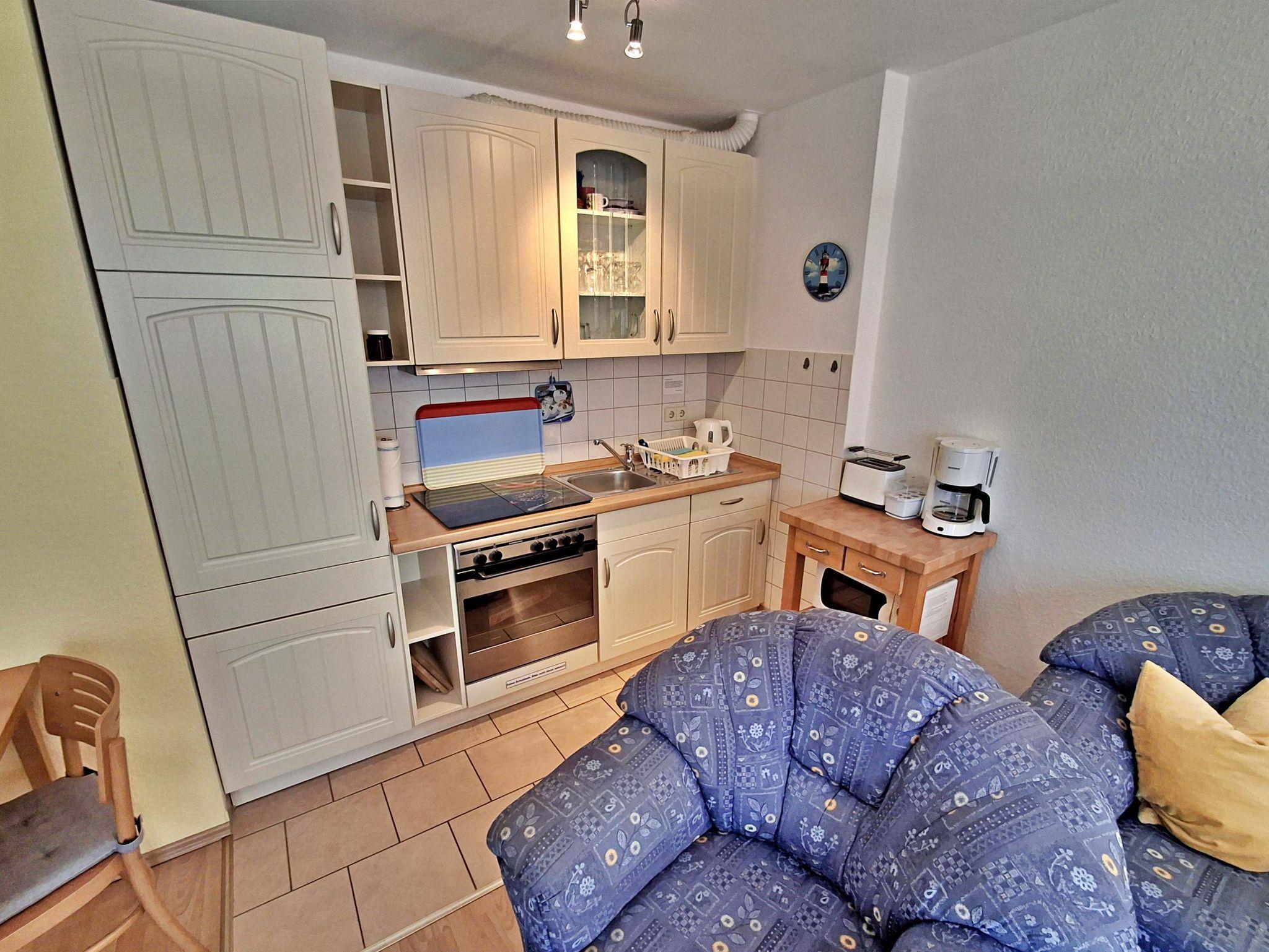 Diese 49 m² große komfortable und geschmackvoll eingerichtete Nichtraucher-2-Raum-Ferienwohnung befindet sich im Erdgeschoss und verfügt über einen kombinierten Wohn-und Küchenbereich mit bequemer Couch, Sessel mit Hocker, Esstisch mit Stühlen, HiFi-Anlage sowie Flachbild-TV mit DVD-Player. Die Küchenzeile ist mit Ceranherd, Backofen, Kühl-/Gefrierkombination, Kaffee- und Padmaschine, Toaster, Wasser- und Eierkocher und den wichtigsten Küchenutensilien ausgestattet. Das separate Schlafzimmer hat ein Doppelbett, 1 Einzelklappbett für max. 1 Aufbettung, Kleiderschrank und Flachbild-TV. Das Badezimmer verfügt über Dusche/WC. Komplettiert wird die Ausstattung der Ferienwohnung durch eine kleine uneinsehbare in den Sommermonaten möblierte Sonnenterrasse. Hier können Sie bei schönem Wetter Ihr Frühstück genießen oder den Tag bei einem Glas Wein ausklingen lassen. Für die kleinsten Gäste steht Ihnen kostenfrei ein Babybett und Kinderstuhl zur Verfügung. Ihr eigener Pkw kann gern direkt am Haus geparkt werden. Das W-LAN Netz können Sie gratis nutzen.