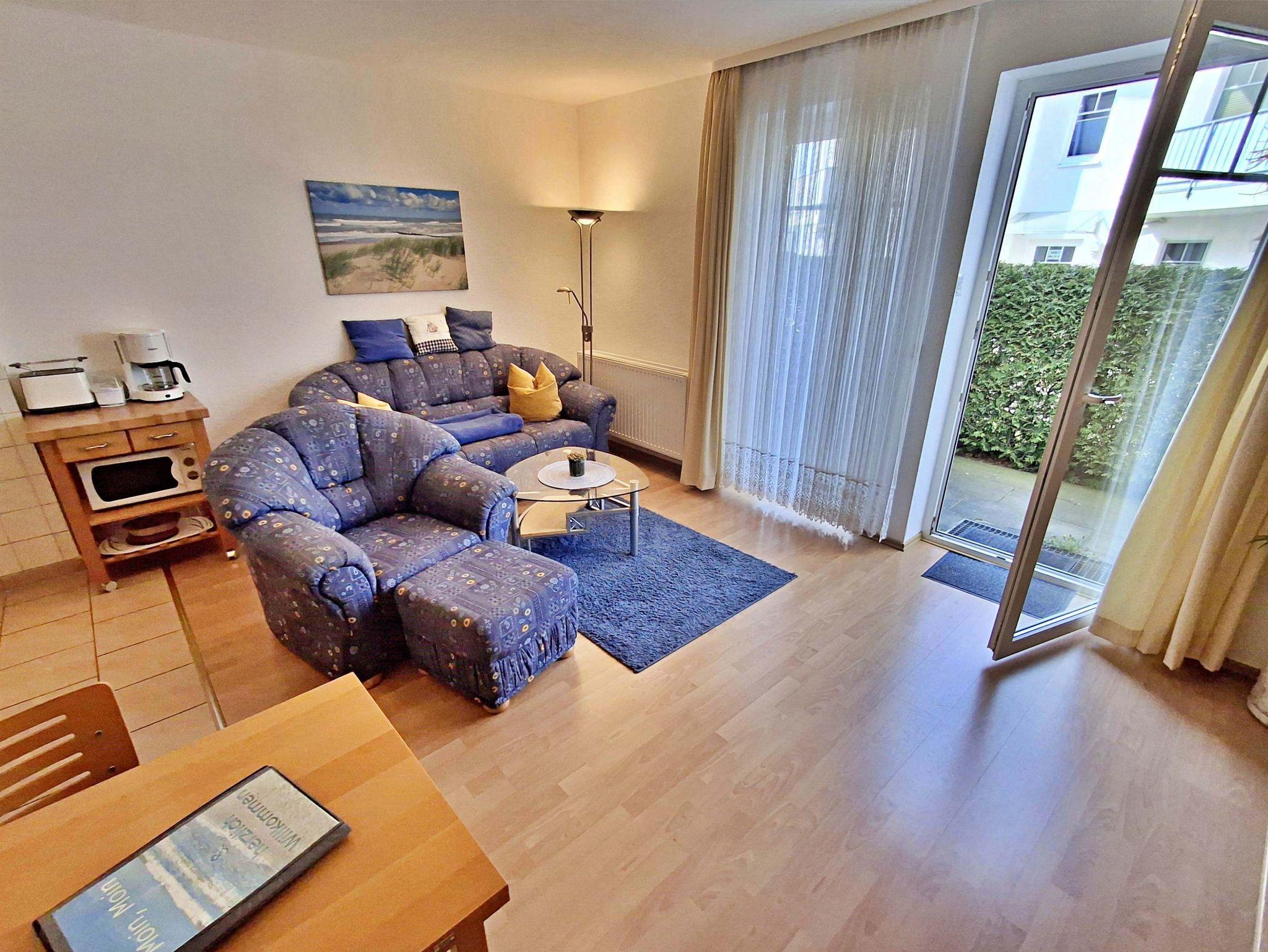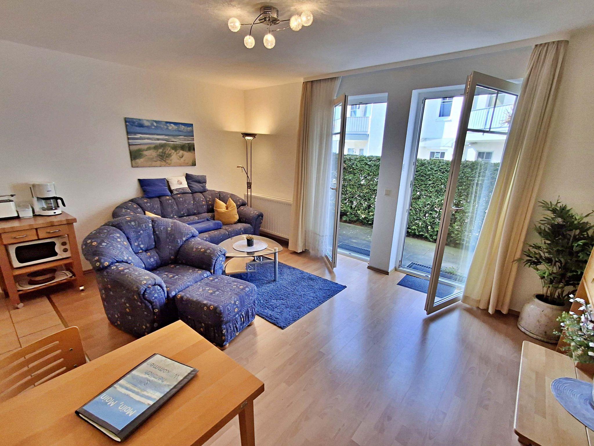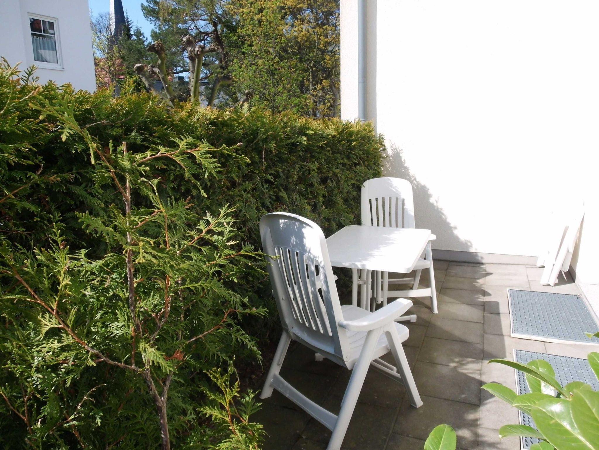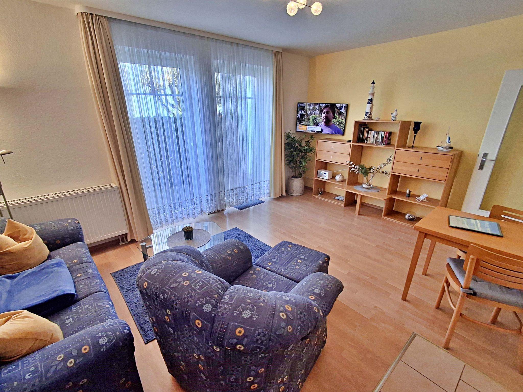 Diese 49 m² große komfortable und geschmackvoll eingerichtete Nichtraucher-2-Raum-Ferienwohnung befindet sich im Erdgeschoss und verfügt über einen kombinierten Wohn-und Küchenbereich mit bequemer Couch, Sessel mit Hocker, Esstisch mit Stühlen, HiFi-Anlage sowie Flachbild-TV mit DVD-Player. Die Küchenzeile ist mit Ceranherd, Backofen, Kühl-/Gefrierkombination, Kaffee- und Padmaschine, Toaster, Wasser- und Eierkocher und den wichtigsten Küchenutensilien ausgestattet. Das separate Schlafzimmer hat ein Doppelbett, 1 Einzelklappbett für max. 1 Aufbettung, Kleiderschrank und Flachbild-TV. Das Badezimmer verfügt über Dusche/WC. Komplettiert wird die Ausstattung der Ferienwohnung durch eine kleine uneinsehbare in den Sommermonaten möblierte Sonnenterrasse. Hier können Sie bei schönem Wetter Ihr Frühstück genießen oder den Tag bei einem Glas Wein ausklingen lassen. Für die kleinsten Gäste steht Ihnen kostenfrei ein Babybett und Kinderstuhl zur Verfügung. Ihr eigener Pkw kann gern direkt am Haus geparkt werden. Das W-LAN Netz können Sie gratis nutzen.