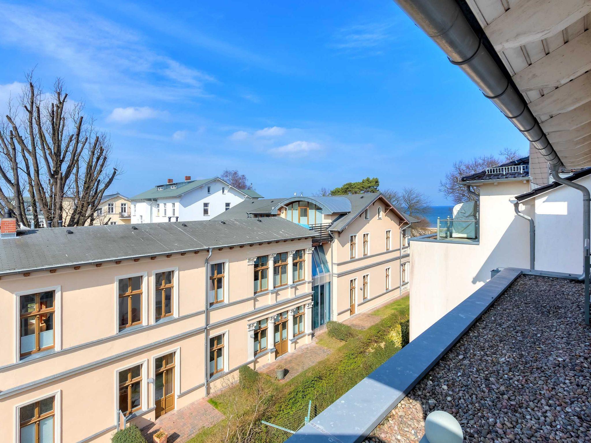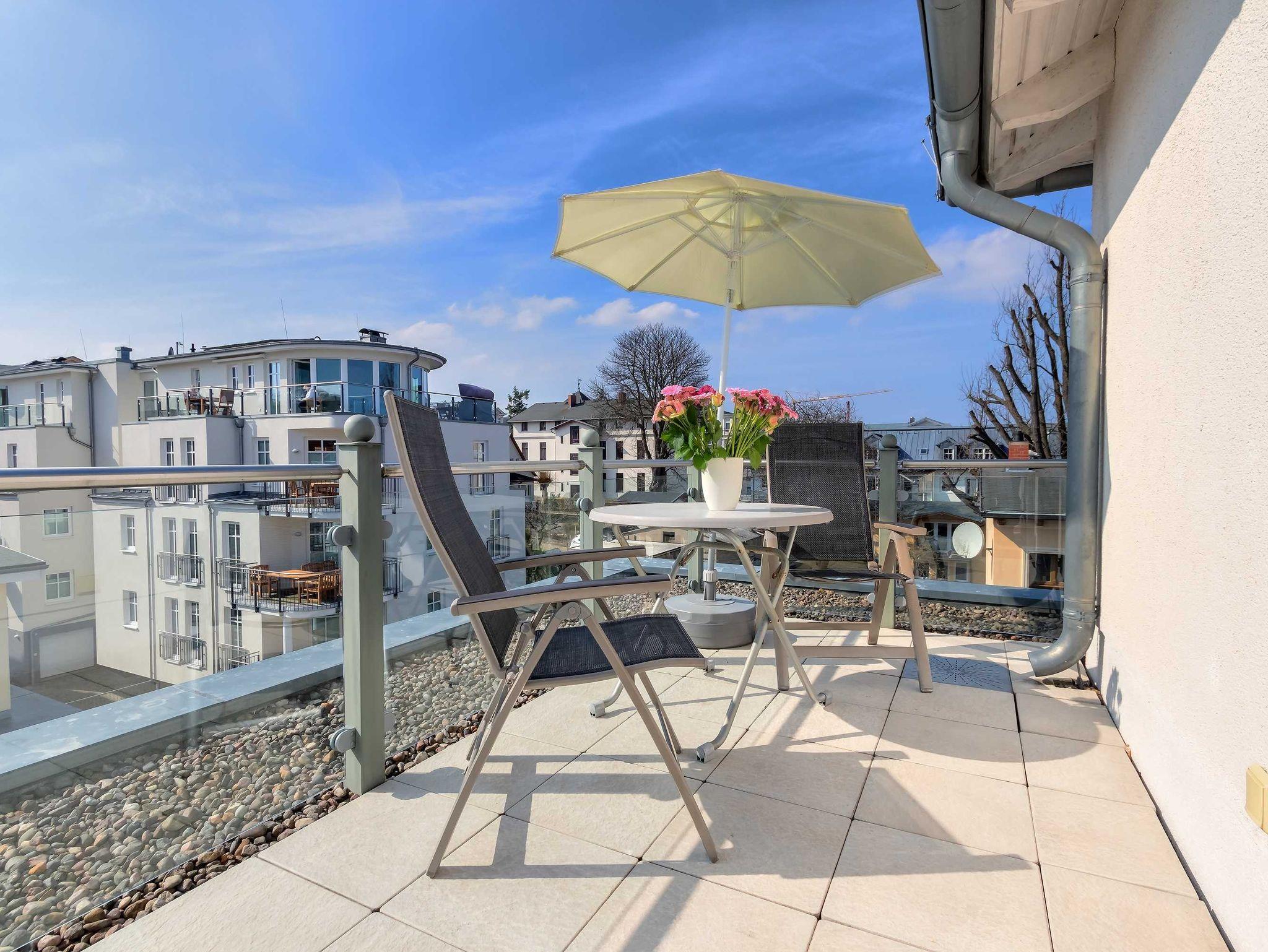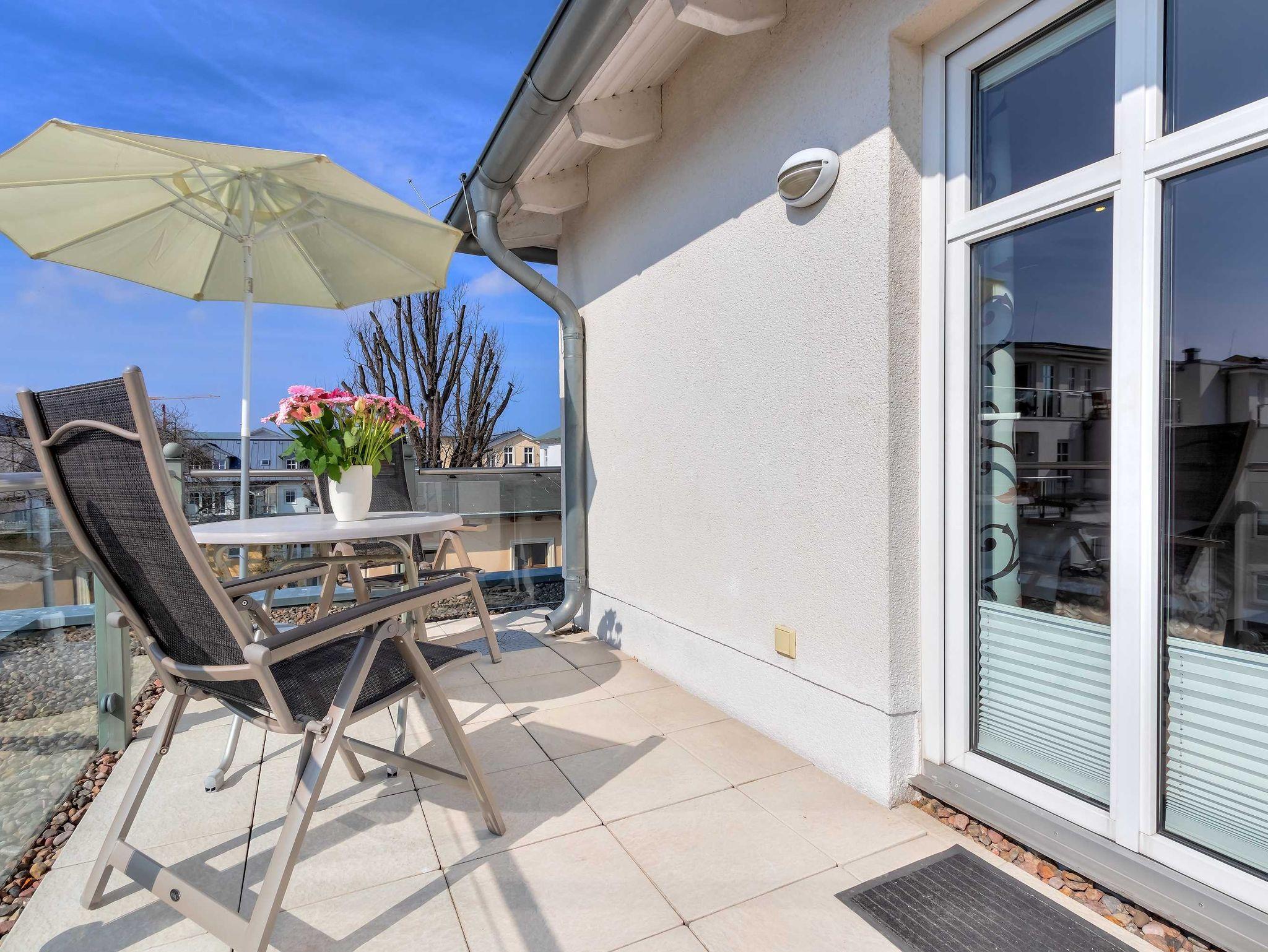 1. Reihe an der Strandpromenade mit DACHTERRASSE und FAHRSTUHL im Haus! Chices 1-Zimmer-Apartment mit moderner guter Ausstattung. Kombinierter Wohn-/Schlafraum, separate Küche mit Essplatz, Duschbad, Dachterrasse nach Süden mit Sonne bis abends. Die Wohnung verfügt über einen Pkw-Stellplatz. In der Garage können auch Fahrräder und ähnliches untergestellt werden. In unserer Villa Germania nebenan gibt es eine Sauna. Von der Villa Aquamarina sind es zum Ortszentrum und der Seebrücke ca. 3 Minuten zu Fuß. Zum Strand sind es 50 m.