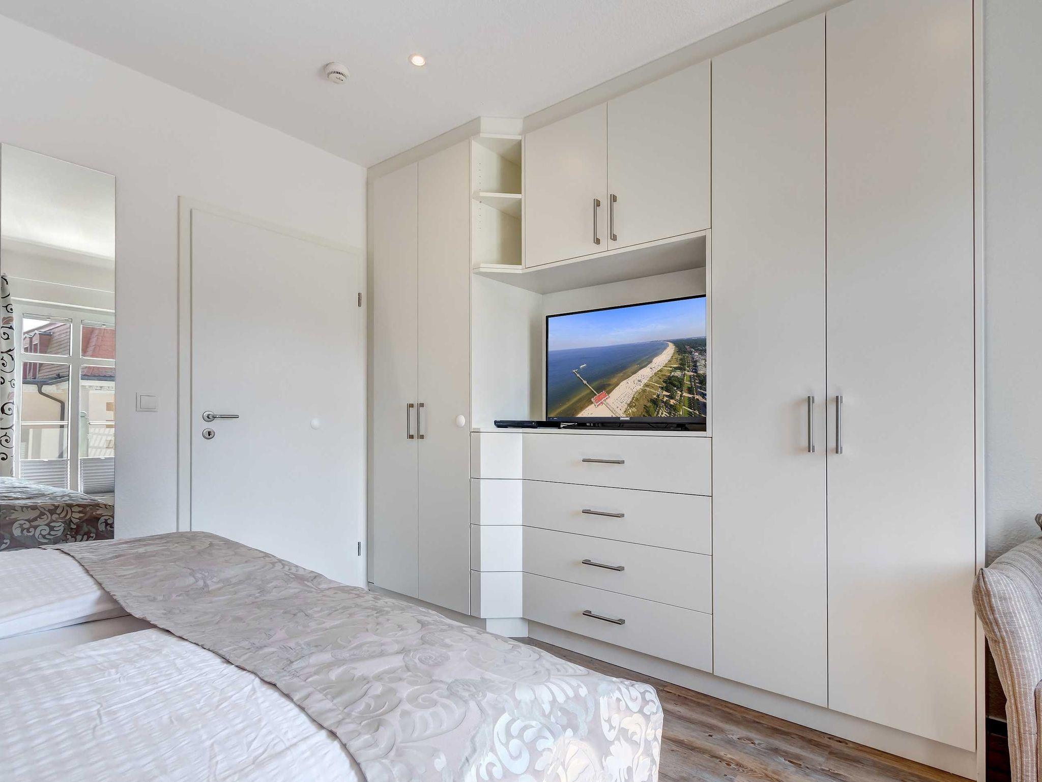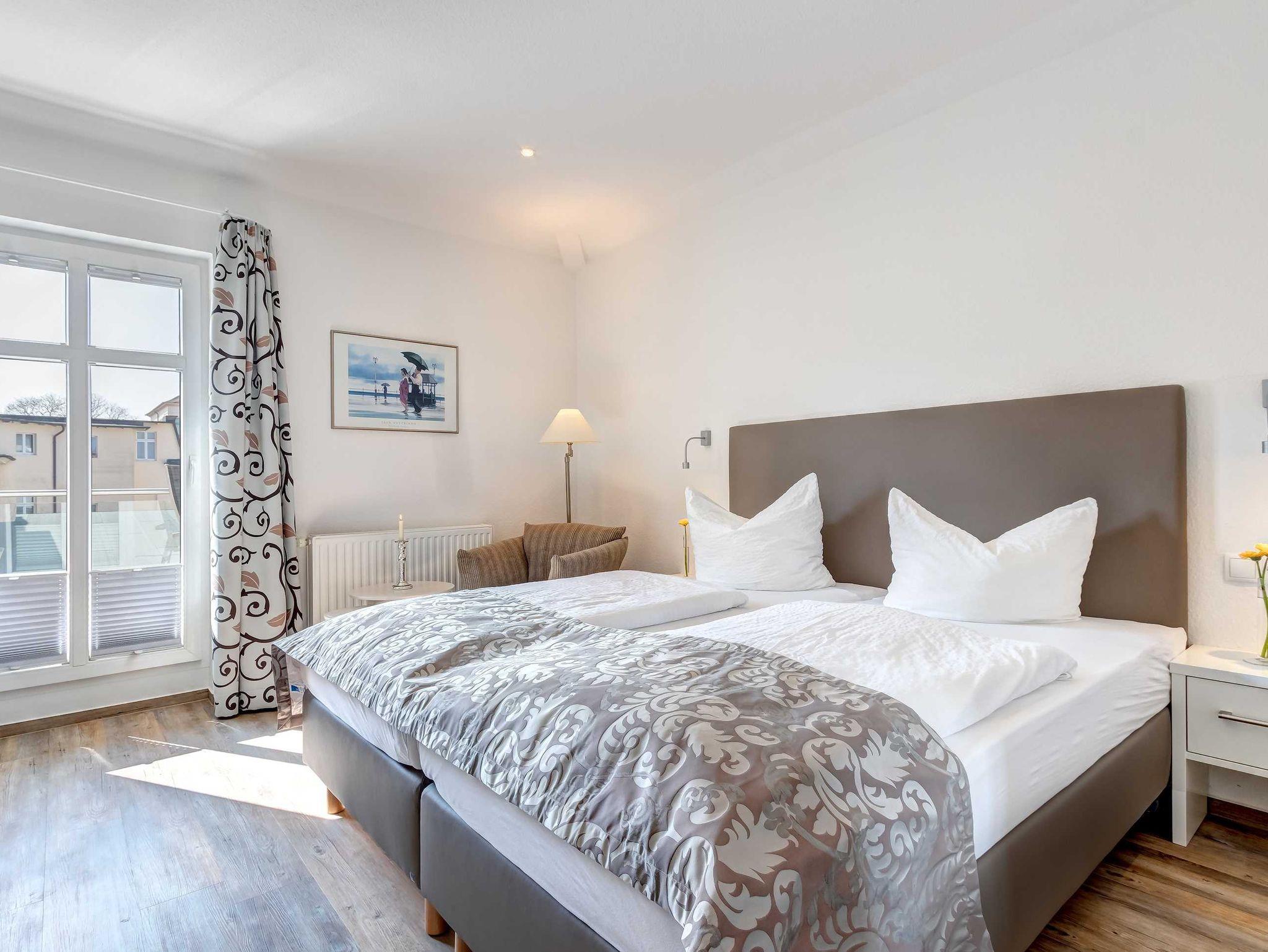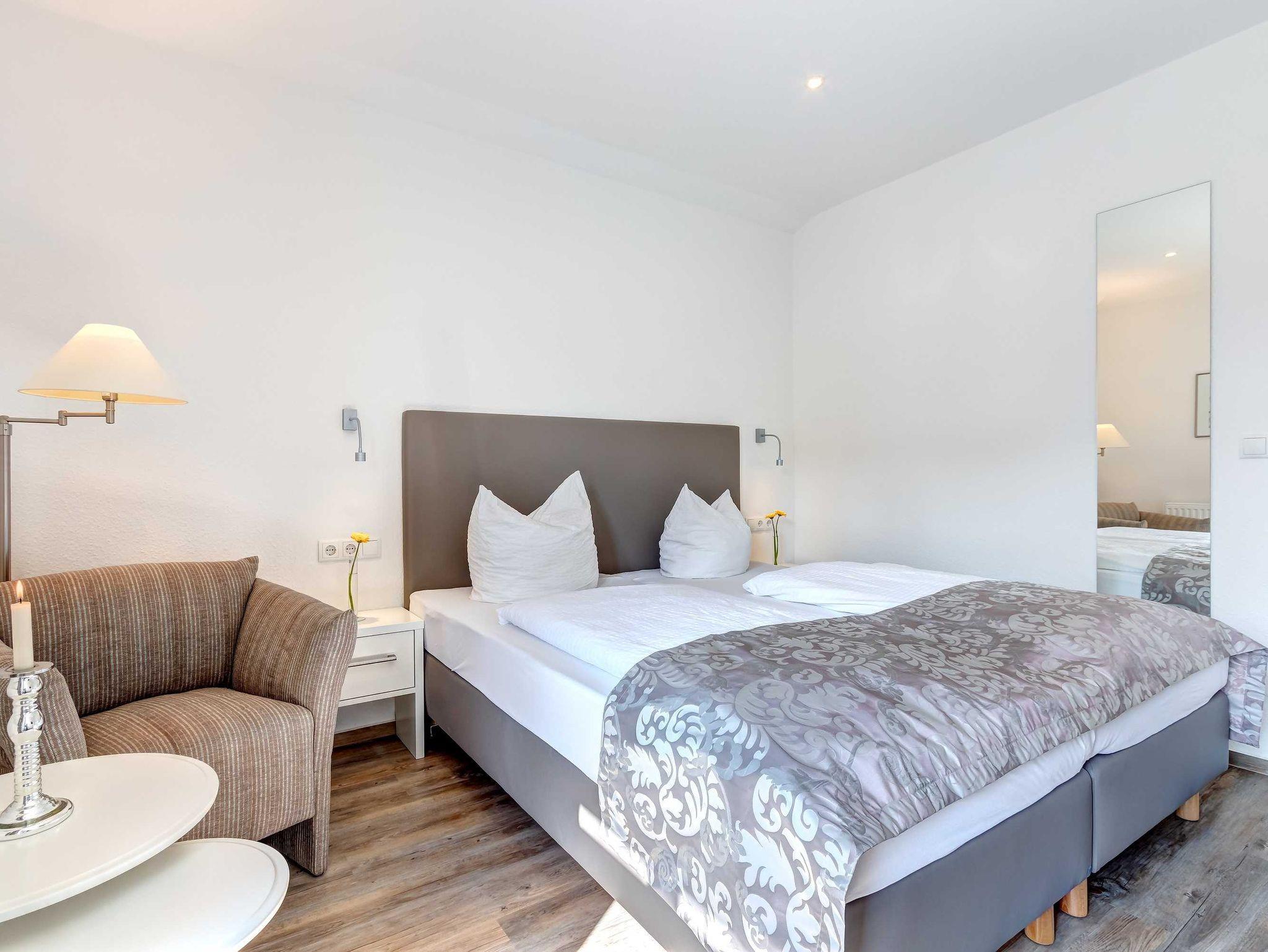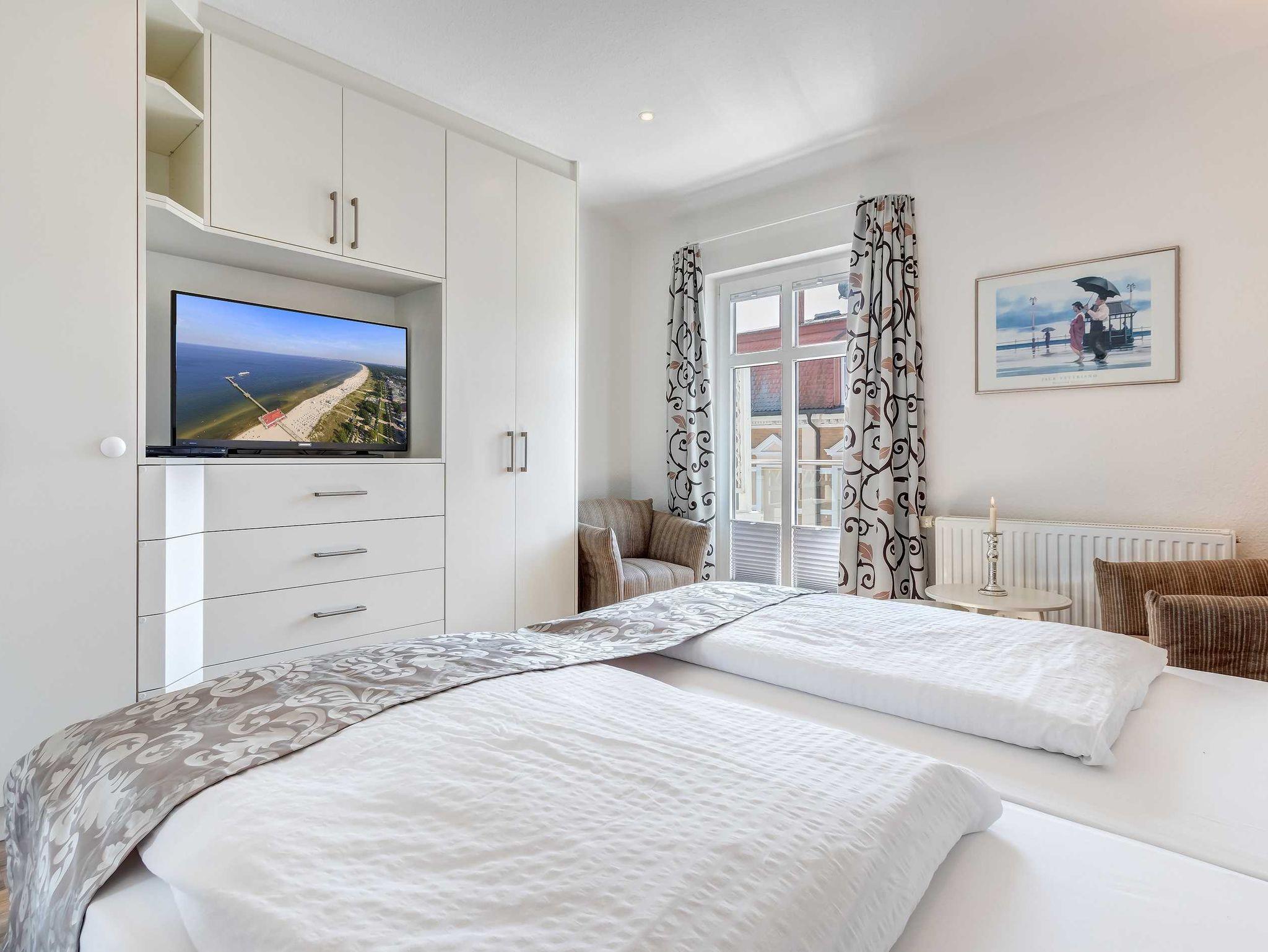 1. Reihe an der Strandpromenade mit DACHTERRASSE und FAHRSTUHL im Haus! Chices 1-Zimmer-Apartment mit moderner guter Ausstattung. Kombinierter Wohn-/Schlafraum, separate Küche mit Essplatz, Duschbad, Dachterrasse nach Süden mit Sonne bis abends. Die Wohnung verfügt über einen Pkw-Stellplatz. In der Garage können auch Fahrräder und ähnliches untergestellt werden. In unserer Villa Germania nebenan gibt es eine Sauna. Von der Villa Aquamarina sind es zum Ortszentrum und der Seebrücke ca. 3 Minuten zu Fuß. Zum Strand sind es 50 m.