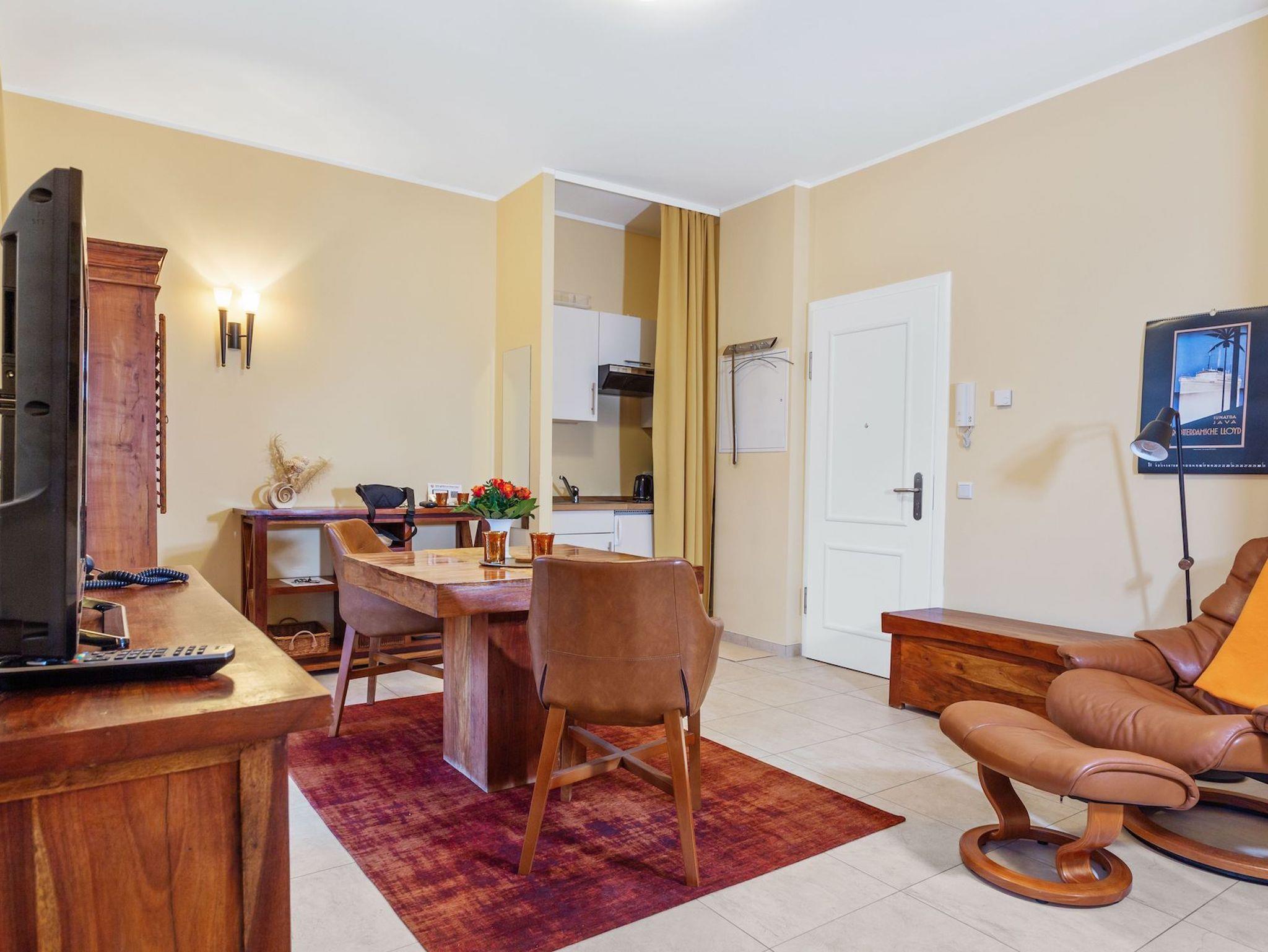 Das 31 m² große 1-Raum-Appartement „Wiek“ liegt im gemütlichen Hochparterre und ist ideal für 2 Personen. Highlight ist der großzügige Südbalkon, der sich über die gesamte Breite des Apartments erstreckt ? perfekt für sonnige Stunden und den Blick ins Grüne. Im bequemen Stressless-Sessel mit Hocker können Sie entspannt lesen, fernsehen oder einfach den Vögeln im Garten zusehen. Die Einrichtung in warmen goldbraunen Tönen mit Echtholzmöbeln, UHD-LED-TV, einem Esstisch mit komfortablen Stuhlsesseln sowie einer 1,20 m breiten Küchenzeile schafft eine behagliche Atmosphäre. Das 1,60 m breite Boxspringbett sorgt für erholsamen Schlaf. Ergänzt wird es durch Kommoden, ein Regal und einen Kleiderschrank mit integriertem Safe. Geschirr für zwei Personen ist selbstverständlich vorhanden. Die beiden Balkontüren sind mit außenliegenden, wärmereflektierenden Sonnenschutzrollos ausgestattet. Das moderne Bad verfügt über eine Dusche, beheizbaren Handtuchtrockner und ? wie das gesamte Appartement ? über eine angenehme Fußbodenheizung. Da sich unter dem Appartement der Wellnessbereich des Hauses befindet, wohnen Sie angenehm erhöht wie im ersten Stock. Direkt neben Ihrer Wohnungstür steht Ihnen eine kleine Abstellkammer für leere Gepäckstücke zur Verfügung. Ein PKW-Stellplatz auf dem Hof ist im Preis inbegriffen.