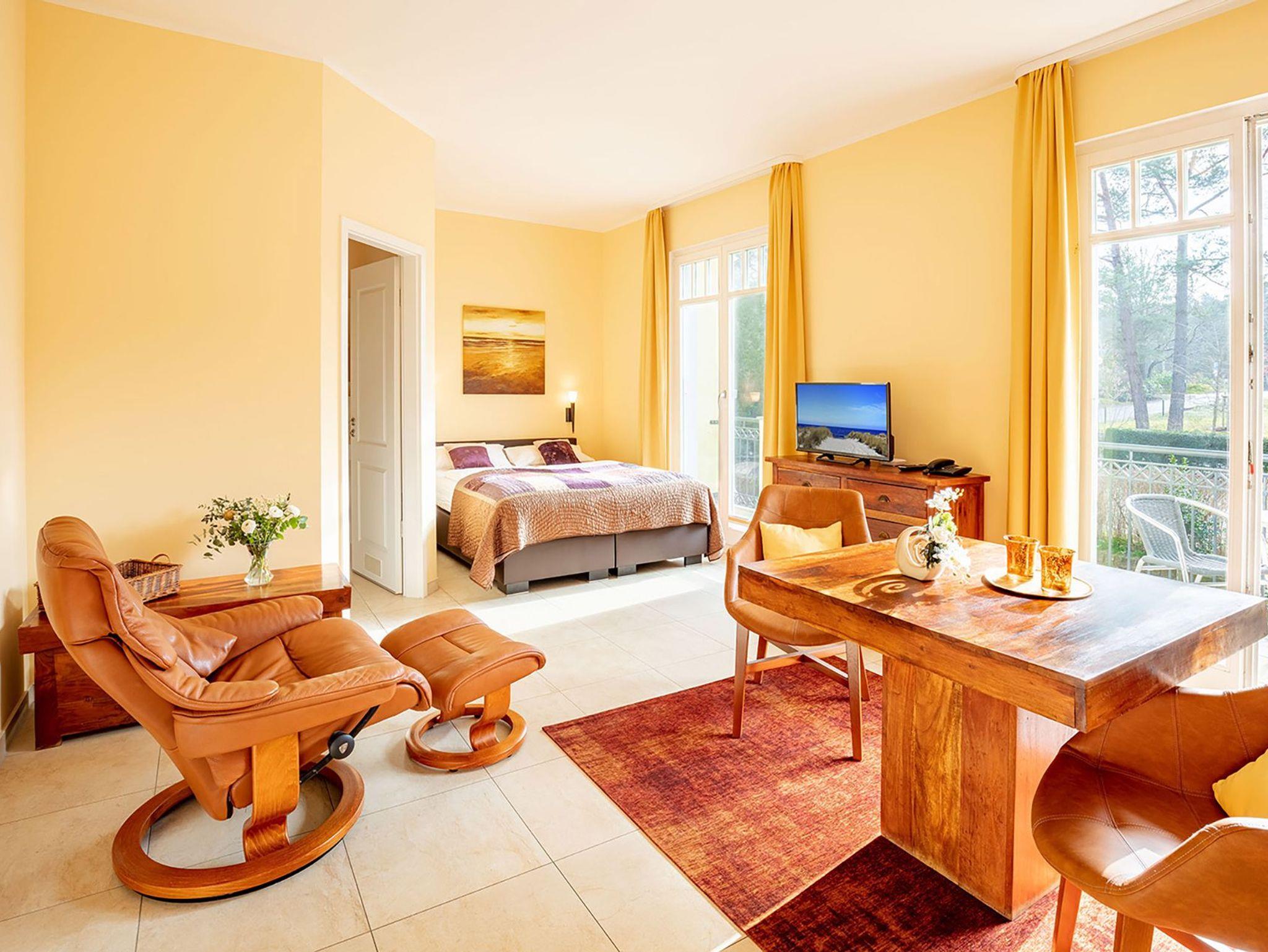 Das 31 m² große 1-Raum-Appartement ?Wiek? liegt im gemütlichen Hochparterre und ist ideal für 2 Personen. Highlight ist der großzügige Südbalkon, der sich über die gesamte Breite des Apartments erstreckt ? perfekt für sonnige Stunden und den Blick ins Grüne. Im bequemen Stressless-Sessel mit Hocker können Sie entspannt lesen, fernsehen oder einfach den Vögeln im Garten zusehen. Die Einrichtung in warmen goldbraunen Tönen mit Echtholzmöbeln, UHD-LED-TV, einem Esstisch mit komfortablen Stuhlsesseln sowie einer 1,20 m breiten Küchenzeile schafft eine behagliche Atmosphäre. Das 1,60 m breite Boxspringbett sorgt für erholsamen Schlaf. Ergänzt wird es durch Kommoden, ein Regal und einen Kleiderschrank mit integriertem Safe. Geschirr für zwei Personen ist selbstverständlich vorhanden. Die beiden Balkontüren sind mit außenliegenden, wärmereflektierenden Sonnenschutzrollos ausgestattet. Das moderne Bad verfügt über eine Dusche, beheizbaren Handtuchtrockner und ? wie das gesamte Appartement ? über eine angenehme Fußbodenheizung. Da sich unter dem Appartement der Wellnessbereich des Hauses befindet, wohnen Sie angenehm erhöht wie im ersten Stock. Direkt neben Ihrer Wohnungstür steht Ihnen eine kleine Abstellkammer für leere Gepäckstücke zur Verfügung. Ein PKW-Stellplatz auf dem Hof ist im Preis inbegriffen.