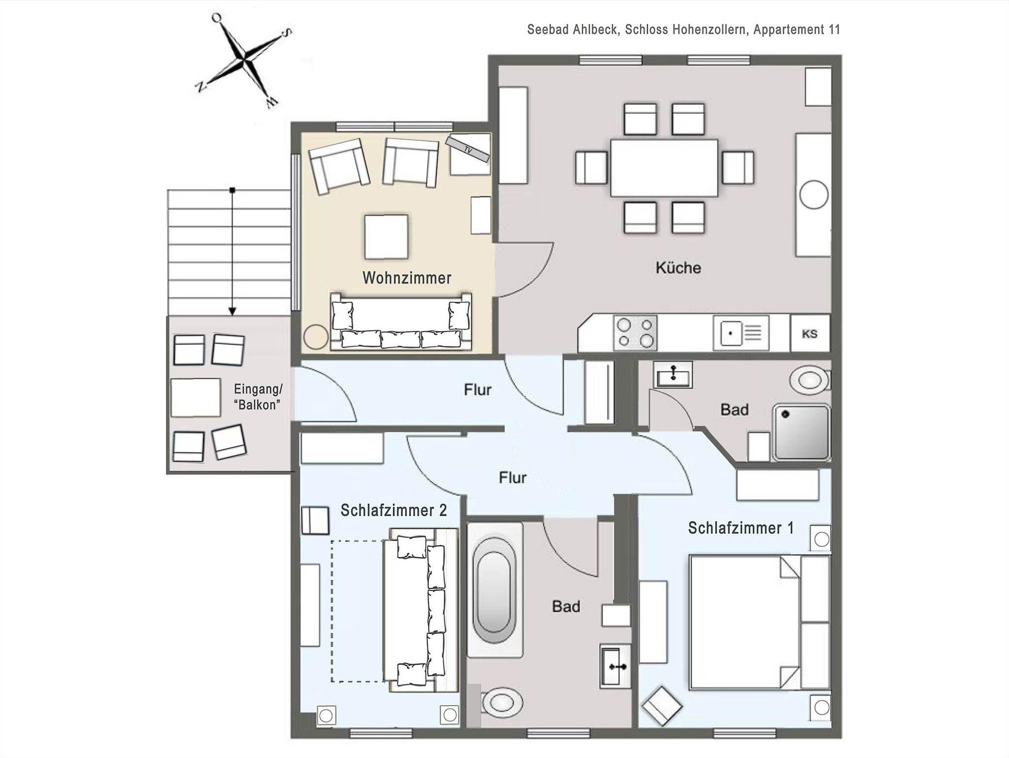 Schloss Hohenzollern, 2 Badezimmer, 2. Reihe Strand, Whg 11, Wohnung 11