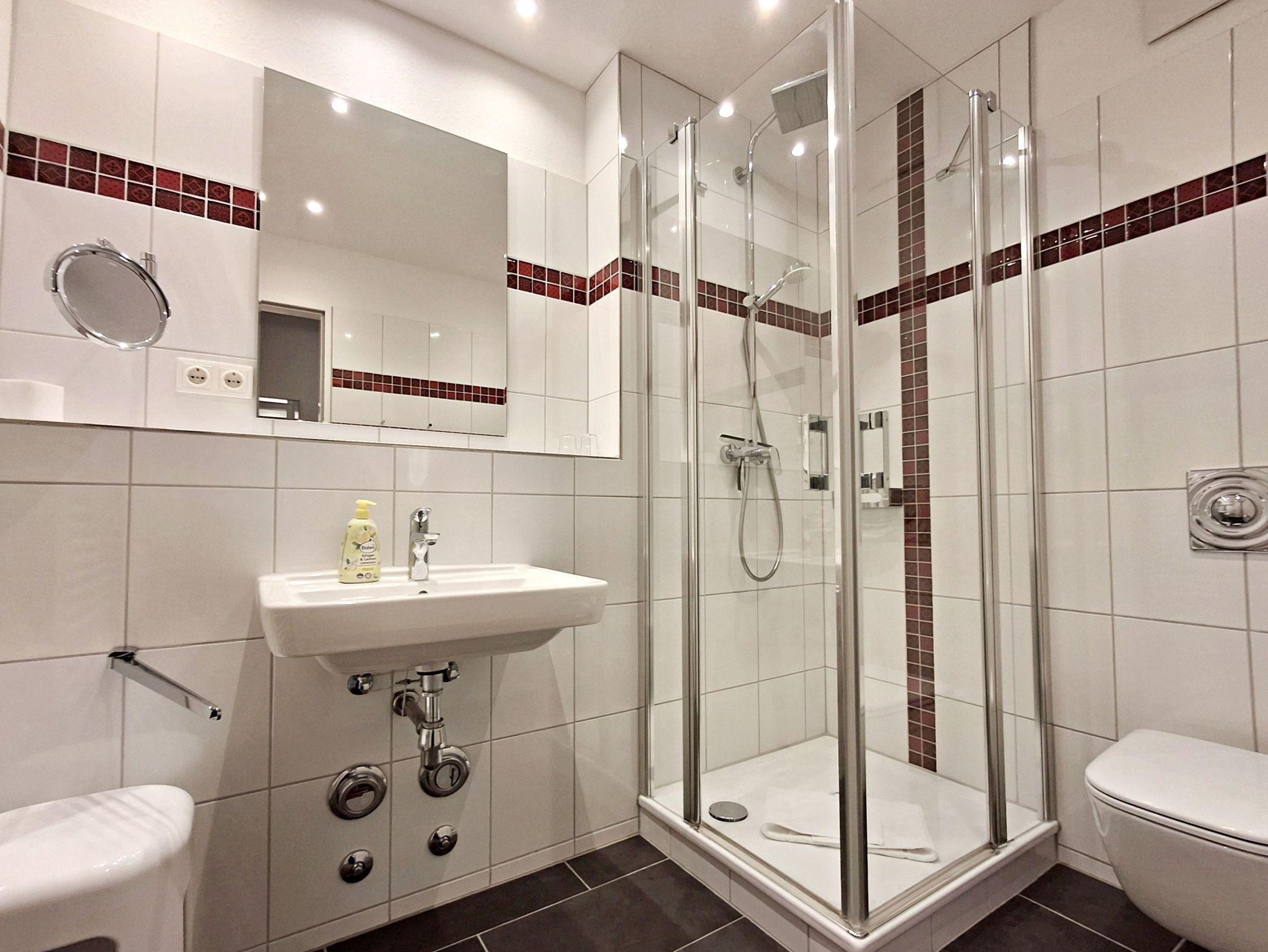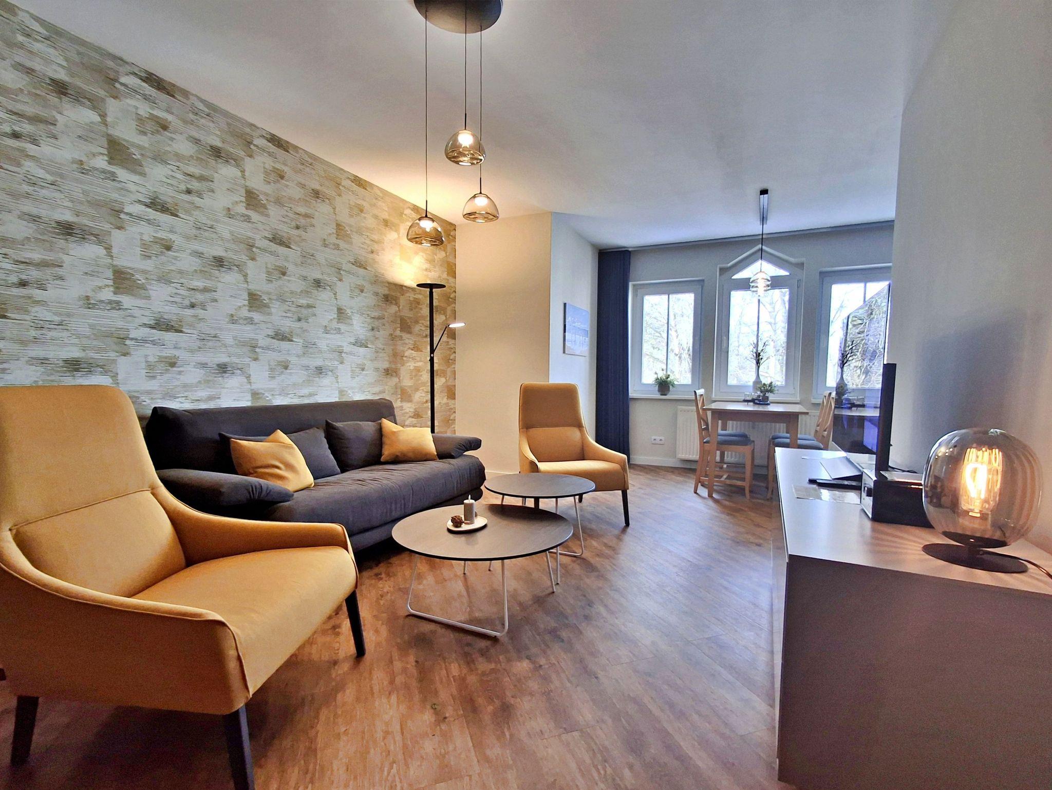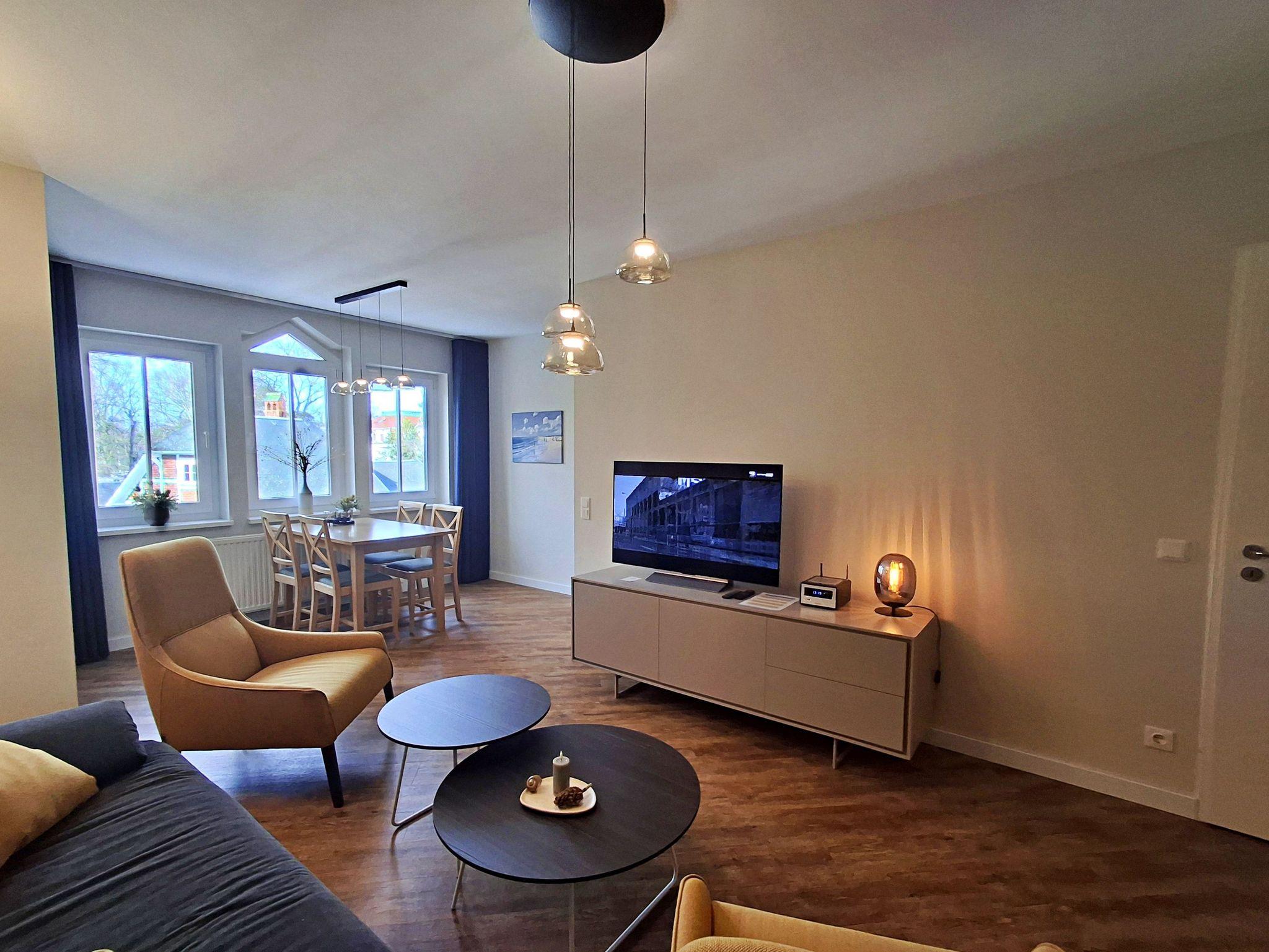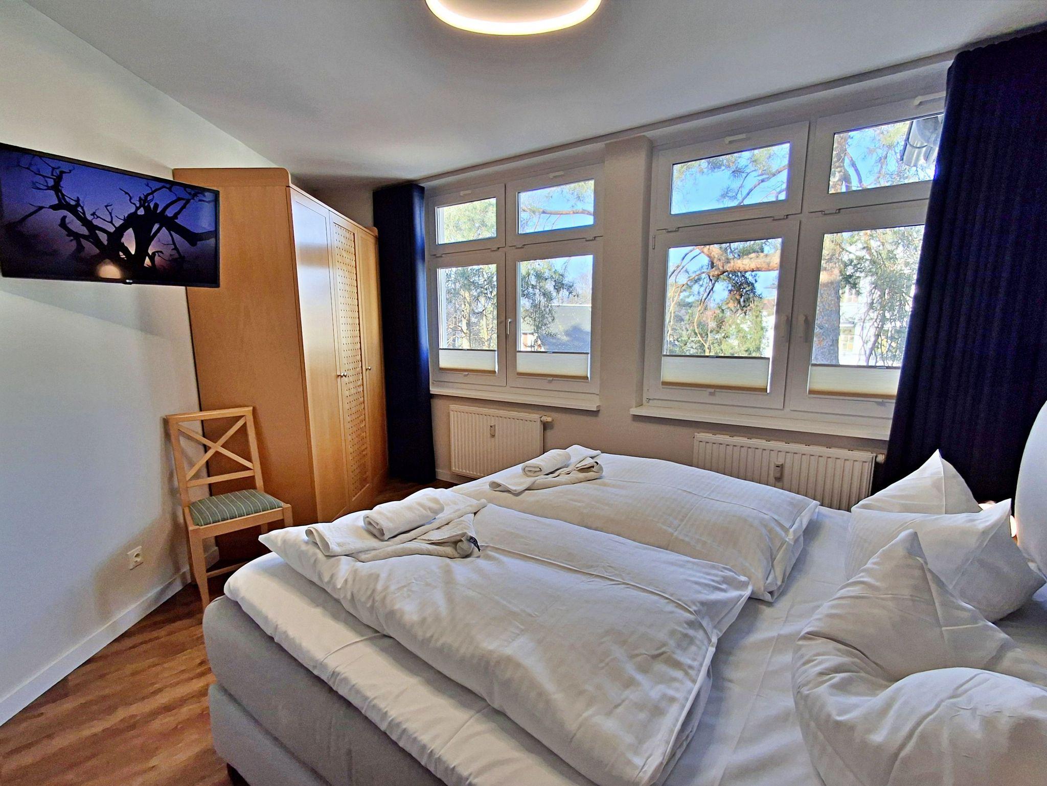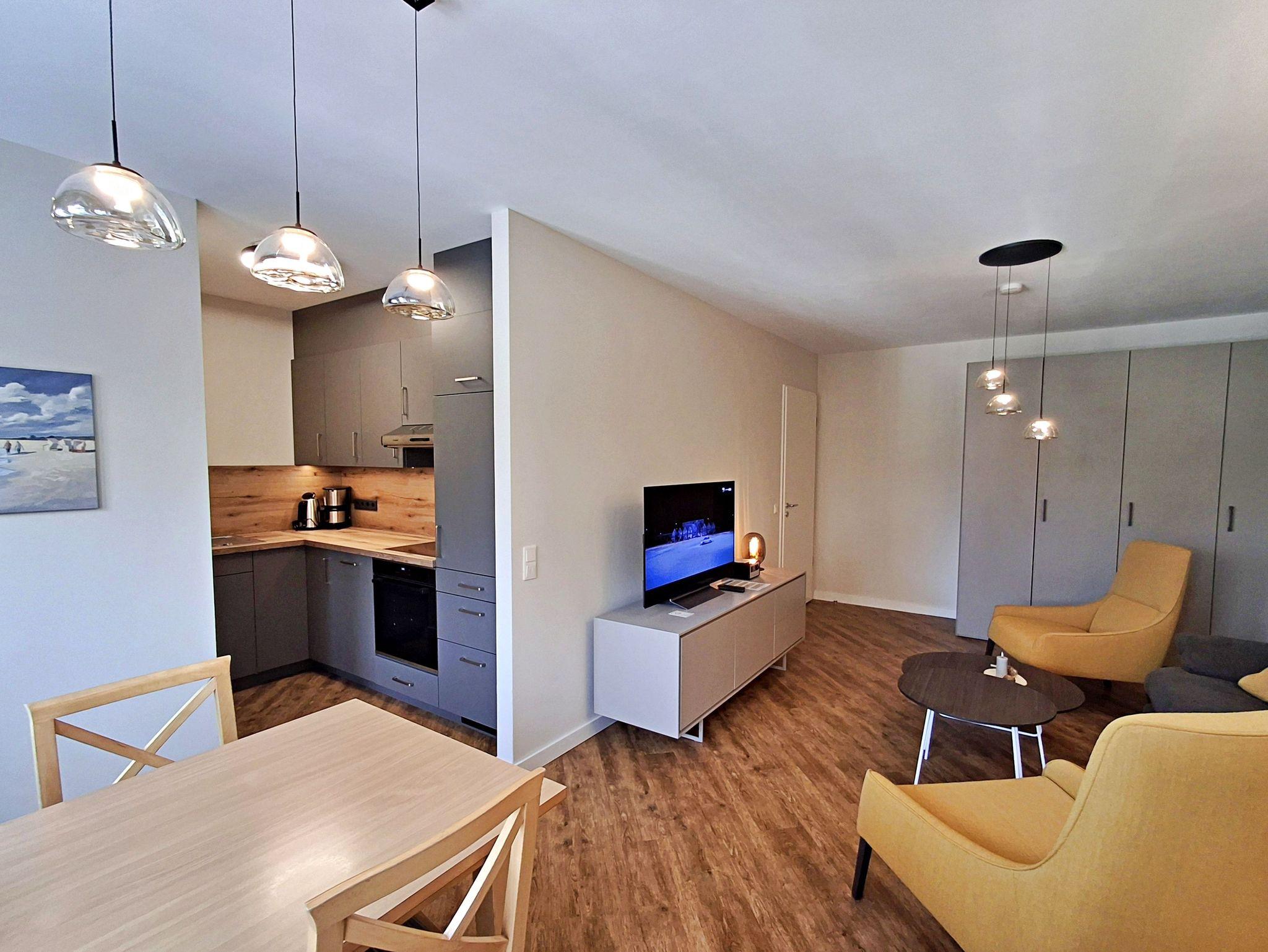 Die 48 qm große 2-Raum-Ferienwohnung befindet sich im 2. OG (West-Lage) der Appartementanlage und bis zu 4 Personen (zwei Erwachsene und zwei Kinder) können hier einen angenehmen Urlaub verbringen. Die Wohnung verfügt über ein Wohnzimmer mit Couch, welche auch zum Schlafen geeignet ist, Sessel sowie einen Essbereich mit 4 Stühlen. Für die Unterhaltung sorgt ein Flachbild-TV mit einem umfangreichen TV-Paket und vielen digitalen Sendern (auch in HD), eine Stereo-Anlage und ein DVD-Player. Die vollständig ausgestattete Küchenzeile mit Ceranherd, Backofen, Kühlschrank mit Gefriermöglichkeit, Mikrowelle und Spülmaschine lässt keine Wünsche offen. Im gemütlichen Schlafzimmer befindet sich ein Doppelbett und ein zweiter Flachbild-TV. Das Bad ist mit Dusche/WC, Haarfön und Kosmetikspiegel ausgestattet. Der Tiefgaragenstellplatz ist im Preis enthalten.