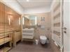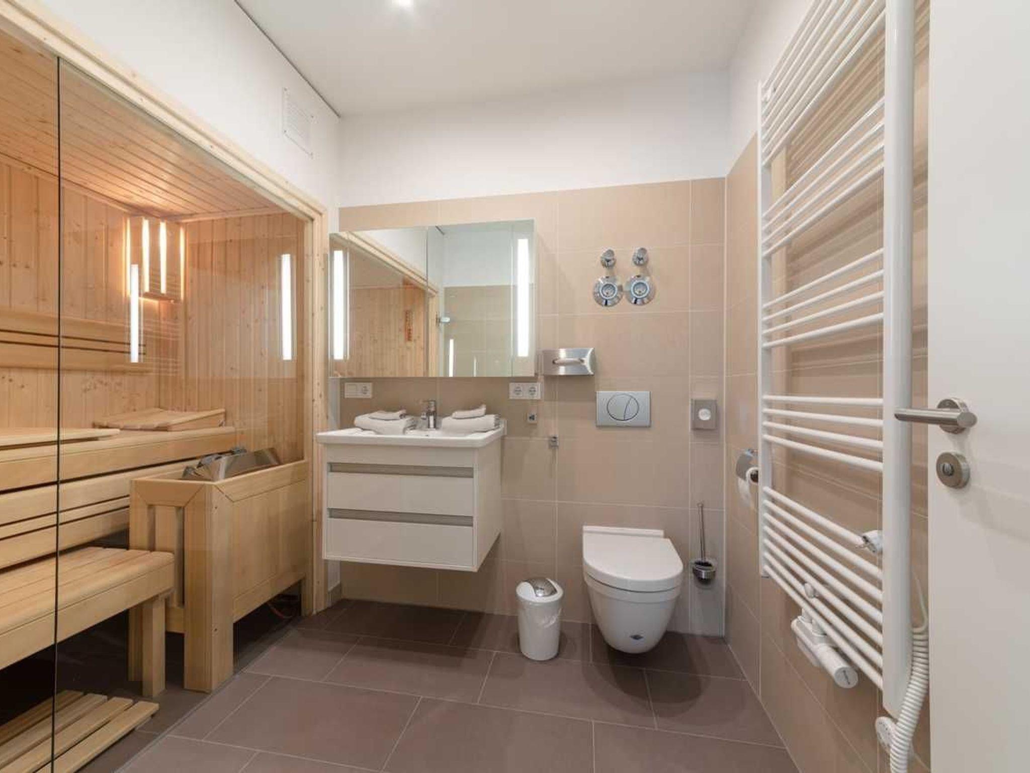 Ein Bad mit Dusche und Sauna und ein Gäste-WC.