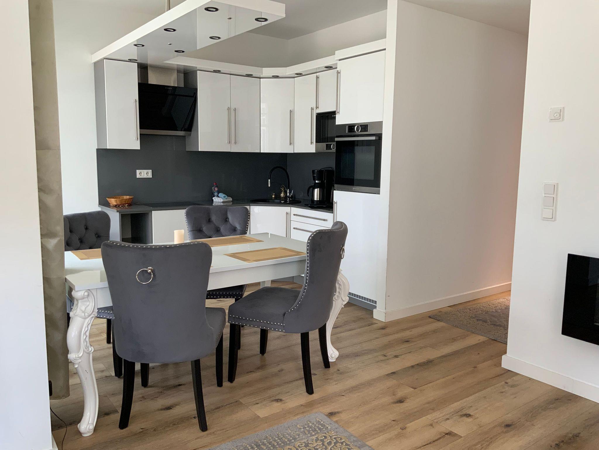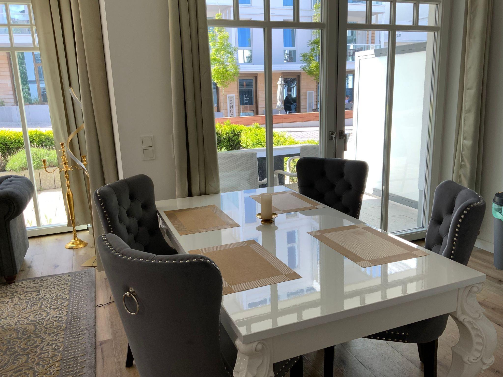 Die Wohnung liegt im Erdgeschoss mit Terasse in der Sonne einem Tisch und 4 Stühlen.