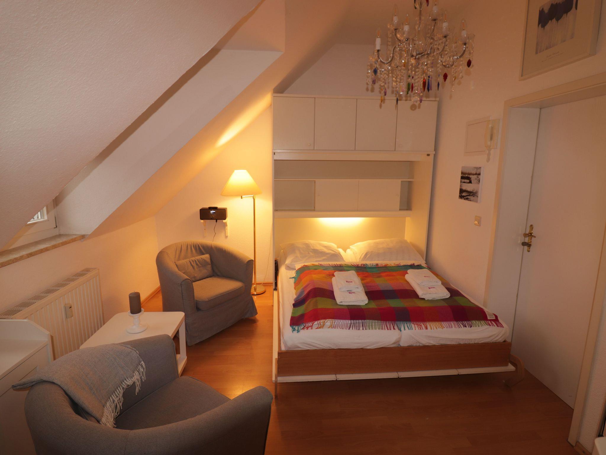 Das Wohnzimmer ist mit einem sehr komfortablen Schrankbett (160 x 200 cm, zwei Matratzen) ausgestattet, das durch einfache Handgriffe zu bedienen ist. Tagsüber kann das Bett hochgeklappt werden, wodurch das Zimmer zusätzlich an Fläche gewinnt. Der typgleiche Kleiderschrank aus weiß lackiertem Holz bietet hinreichend Staumöglichkeiten für zwei Personen. In einem ebenfalls weiß lackierten Sideboard befindet sich das Geschirr und andere Utensilien. Eine kleine Hifi-Anlage mit Internetradio und Bluetooth-Schnittstelle, sowie ein wandmontierter Smart-TV mit Kabelanschluss stehen zur Nutzung zur Verfügung. Unsere Gäste erhalten kostenlosen Zugang zu WLAN. Zwei gemütliche Polstersessel und ein dazu passender Tisch laden zum Verweilen und Entspannen ein. Der hochwertige Laminatfußboden im Wohnzimmer ist äußerst pflegeleicht und verleiht der Wohnung eine angenehme warme Note.