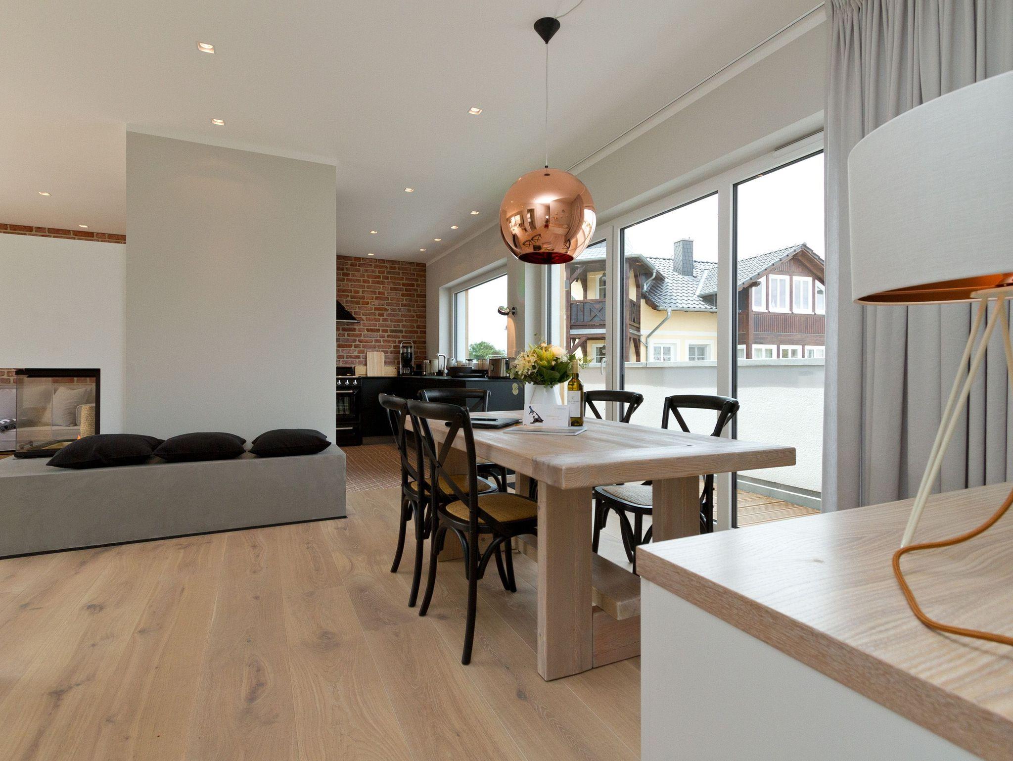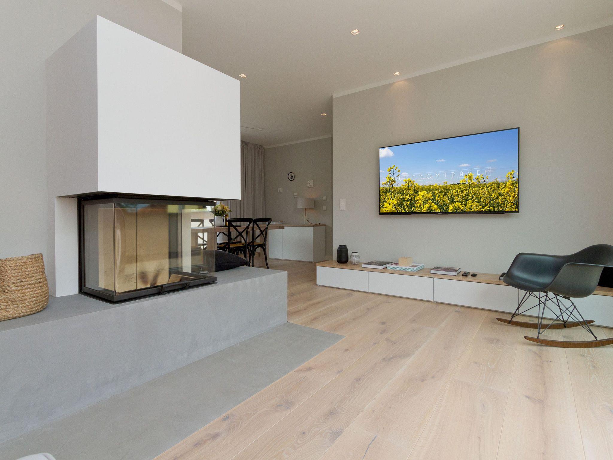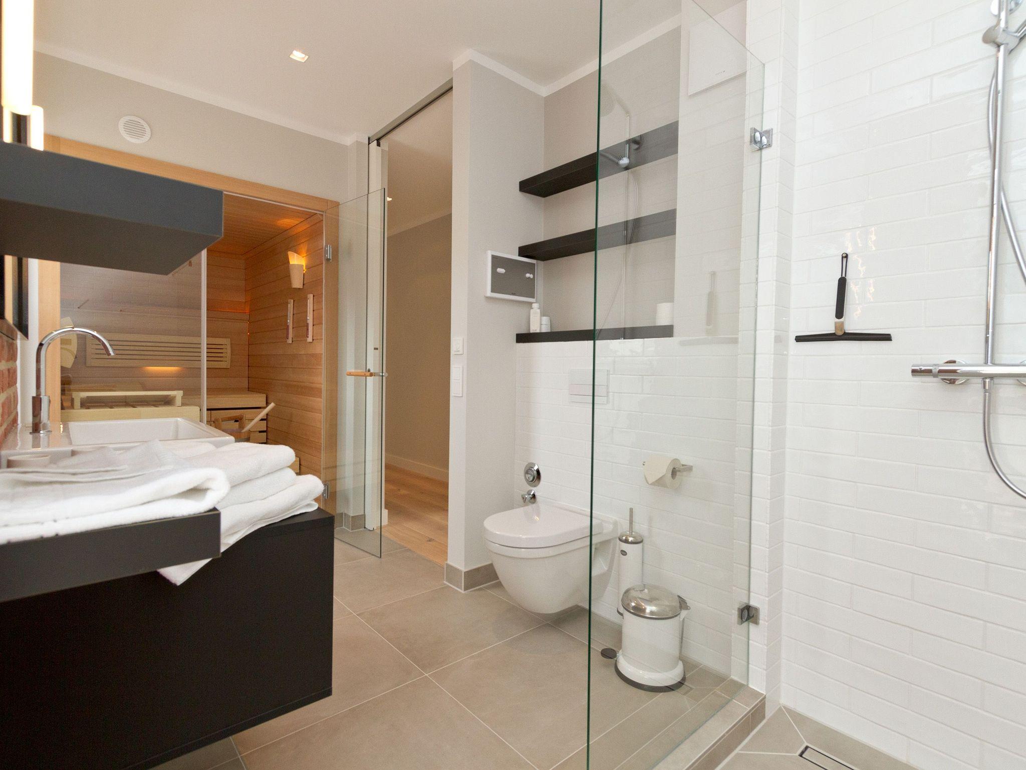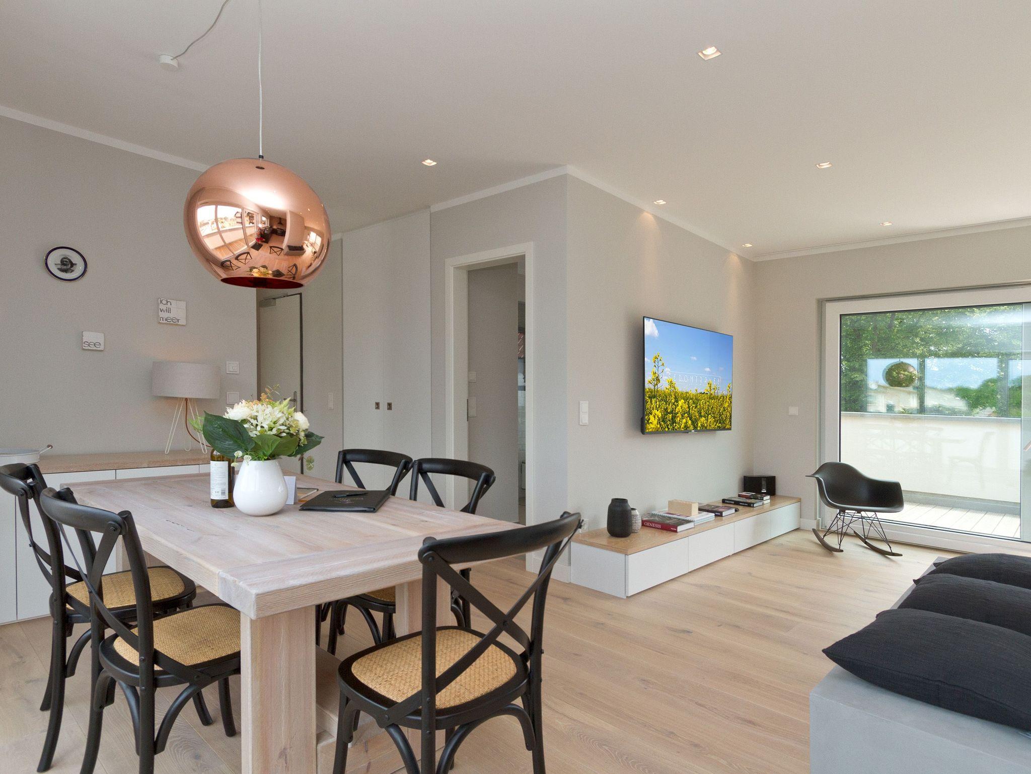 Ein Ahlbecker Quartier für Anspruchsvolle [&] Genießer! Unsere neue Penthousewohnung (3 Räume, 90 qm) wurde äußerst geschmackvoll und hochwertig von Interieur-Designern für Sie gestaltet. Die edle Farbgebung in Grautönen harmoniert perfekt mit rustikalen Steinwänden und mit der feinen Eichendielung. Die Möblierung wurde punktgenau umgesetzt: nichts ist zu viel, aber auch nichts zu wenig und wird durch zahlreiche Designerleuchten perfekt inszeniert. Mit dem Fahrstuhl gelangen Sie direkt in Ihr Domizil, in dem bis zu 4 Personen und ein Kleinkind (bis 3 Jahre im Babyreisebett) urlauben können. Ihre eindrucksvolle Luxusküche mit Geräten der Firma smeg fügt sich stimmig in den großzügigen Wohn- und Essbereich ein und viele Fenster sorgen für eine lichtdurchflutete Wohlfühlatmosphäre. Die gemütliche Sitzgruppe umrandet von Flat-TV und einem schönen Kamin und der tolle Essplatz laden zum Beisammensein ein. Beide Schlafzimmer sind mit modernen Boxspringdoppelbetten (1,80x2,00m), komfortablen Einbauten und einem Flat TV ausgestattet. Ergänzt wird das Appartement von zwei stylischen Bädern, eins mit einer Sauna, die nicht nur in der kalten Jahreszeit ein besonderes Highlight ist. Auch draußen ist es schön, denn zwei sonnige Dachterrassen (vom Wohnbereich / Morgensonne bzw. von den 2 Schlafzimmern / Abendsonne) mit Sitzgruppe und Loungemöbel und zwei kleine Balkone (von der Küche und vom Bad aus) sorgen für Abwechslung. Von hier aus hat man einen wunderschönen Blick auf das Seebad und über die Dächer hinweg seitlichen Meerblick. Für Ihren Komfort sind die Betten bei der Anreise bezogen und Handtücher liegen bereit. Auf Wunsch stellen wir für unsere kleinen Gäste ein Kinderreisebett und einen Kinderhochstuhl zur Verfügung. Der Pkw-Stellplatz (Nr. 5) befindet sich auf dem Grundstück. Das Wlan kann kostenfrei genutzt werden.