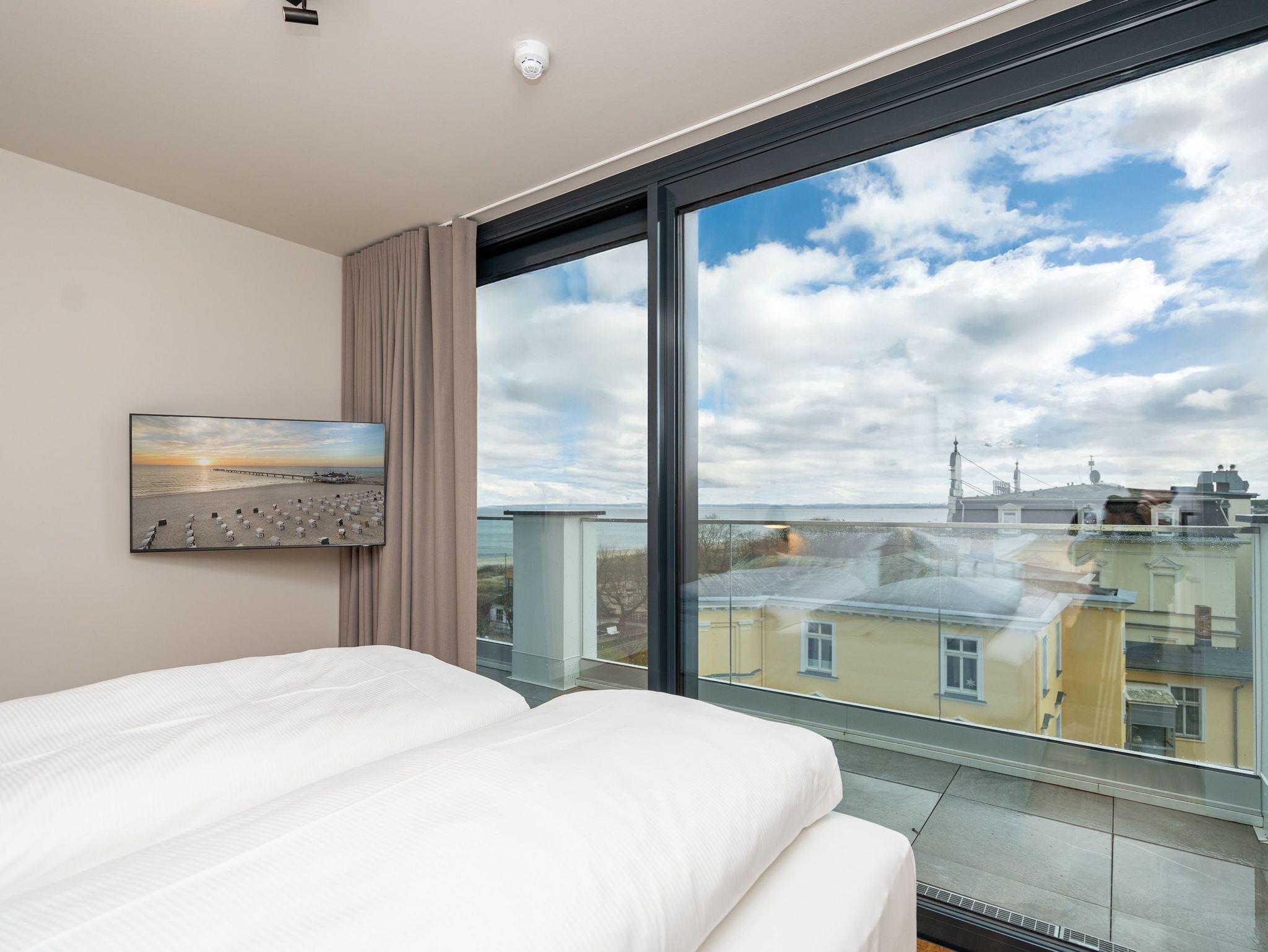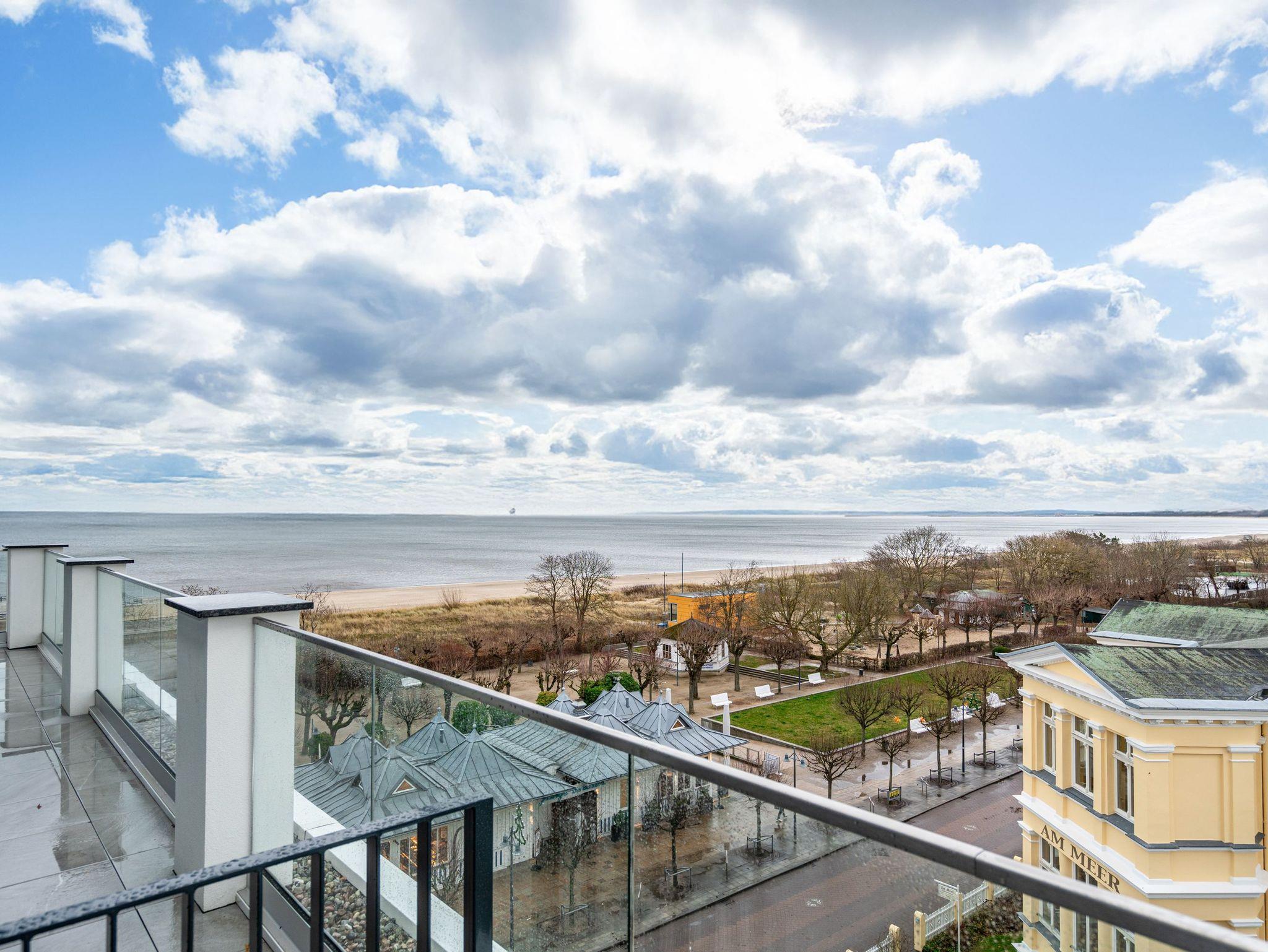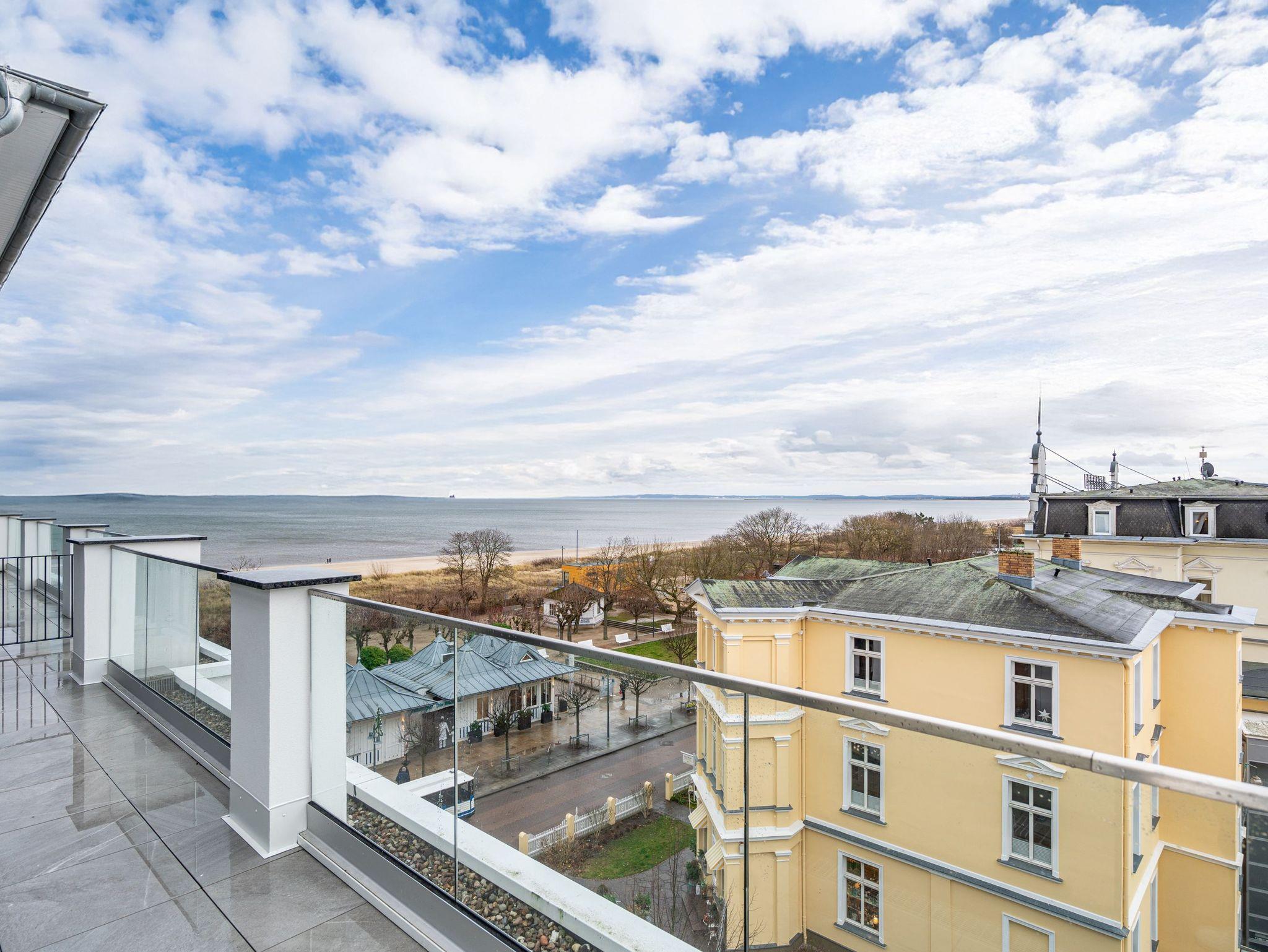 Herzlich willkommen im exklusiven Penthouse-Appartement 4.3 ? Ihrem stilvollen Rückzugsort im Penthouse von Haus A in der 4. Etage mit unvergleichlichem Meerblick. Auf großzügigen 61 m² erwartet zwei Personen ein harmonischer Mix aus modernem Komfort, eleganter Ausstattung und maritimer Wohlfühlatmosphäre. Der lichtdurchflutete Wohnbereich begeistert mit edlem Echtholzparkett, einer gemütlichen Couch, einem stimmungsvollen Elektrokamin und einem beeindruckenden 55-Zoll-Flat-TV. Direkt daneben lädt der Essplatz für zwei Personen dazu ein, köstliche Mahlzeiten in entspannter Atmosphäre zu genießen ? ob beim romantischen Abendessen oder beim gemütlichen Frühstück. Die angrenzende, voll ausgestattete Küchenzeile erfüllt mit einem Kombibackofen mit Mikrowellenfunktion, einem 3-Platten-Induktionskochfeld, einer Spülmaschine und einem Kühlschrank mit Gefrierfach höchste Ansprüche. Das separate Schlafzimmer lässt mit einem komfortablen Boxspringbett (1,80 m x 2,00 m), einem geräumigen Kleiderschrank und einem 43-Zoll-Flat-TV keine Wünsche offen. Ein besonderes Highlight ist die großzügige Dachterrasse, die Sie sowohl vom Wohn- als auch vom Schlafbereich betreten können ? perfekt für entspannte Stunden an der frischen Luft. Das Badezimmer ist Ihre ganz persönliche Wellnessoase: eine großzügige Dusche und eine finnische Sauna mit atemberaubendem Meerblick laden zum Entspannen ein. Ein eleganter Waschtisch, eine Toilette sowie ein separates Gäste-WC ergänzen das moderne Raumangebot. Für zusätzlichen Komfort stehen Ihnen kostenfreies WLAN und ein eigener PKW-Stellplatz in der Tiefgarage zur Verfügung. Freuen Sie sich auf unvergessliche Urlaubstage in der Strandterrasse App. 4.3 ? der perfekte Ort, um die Seele baumeln zu lassen und das Beste aus Ihrem Aufenthalt zu machen. Wir heißen Sie herzlich willkommen!