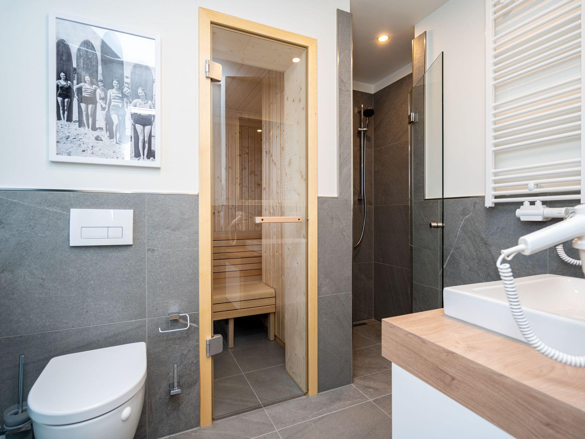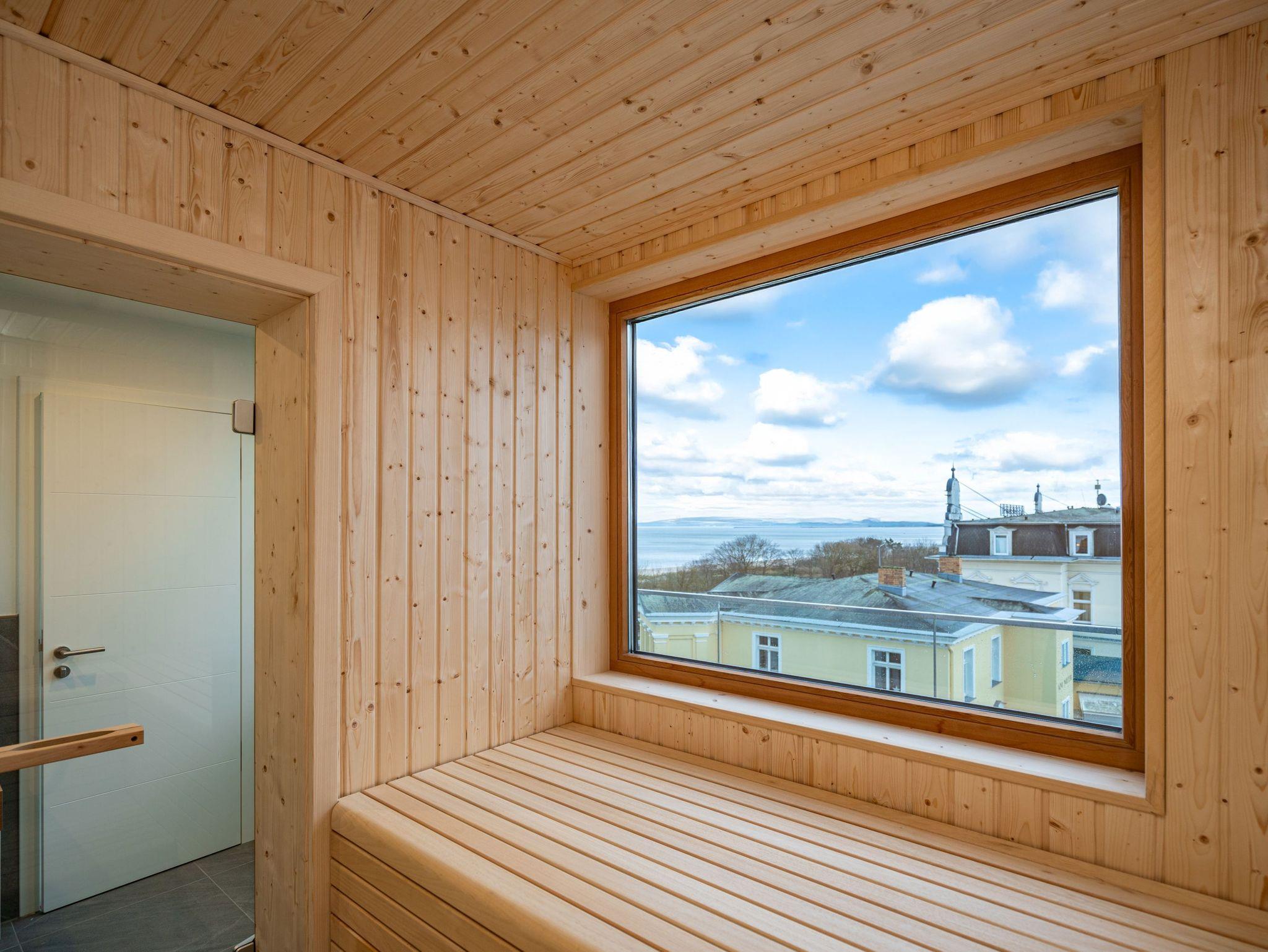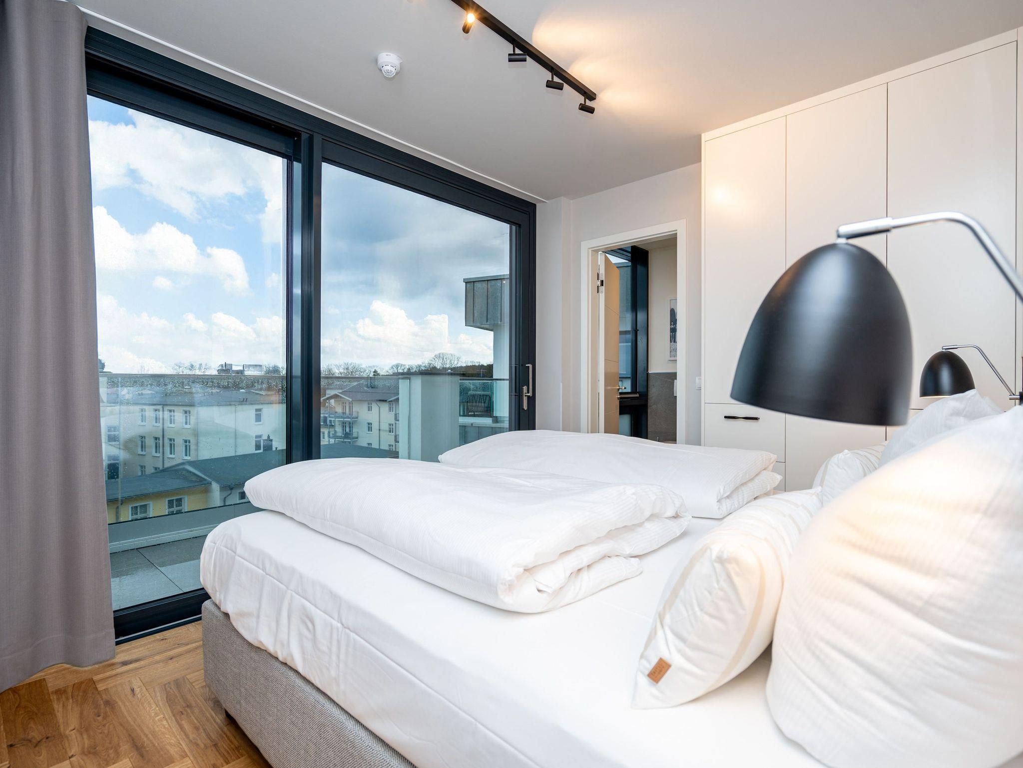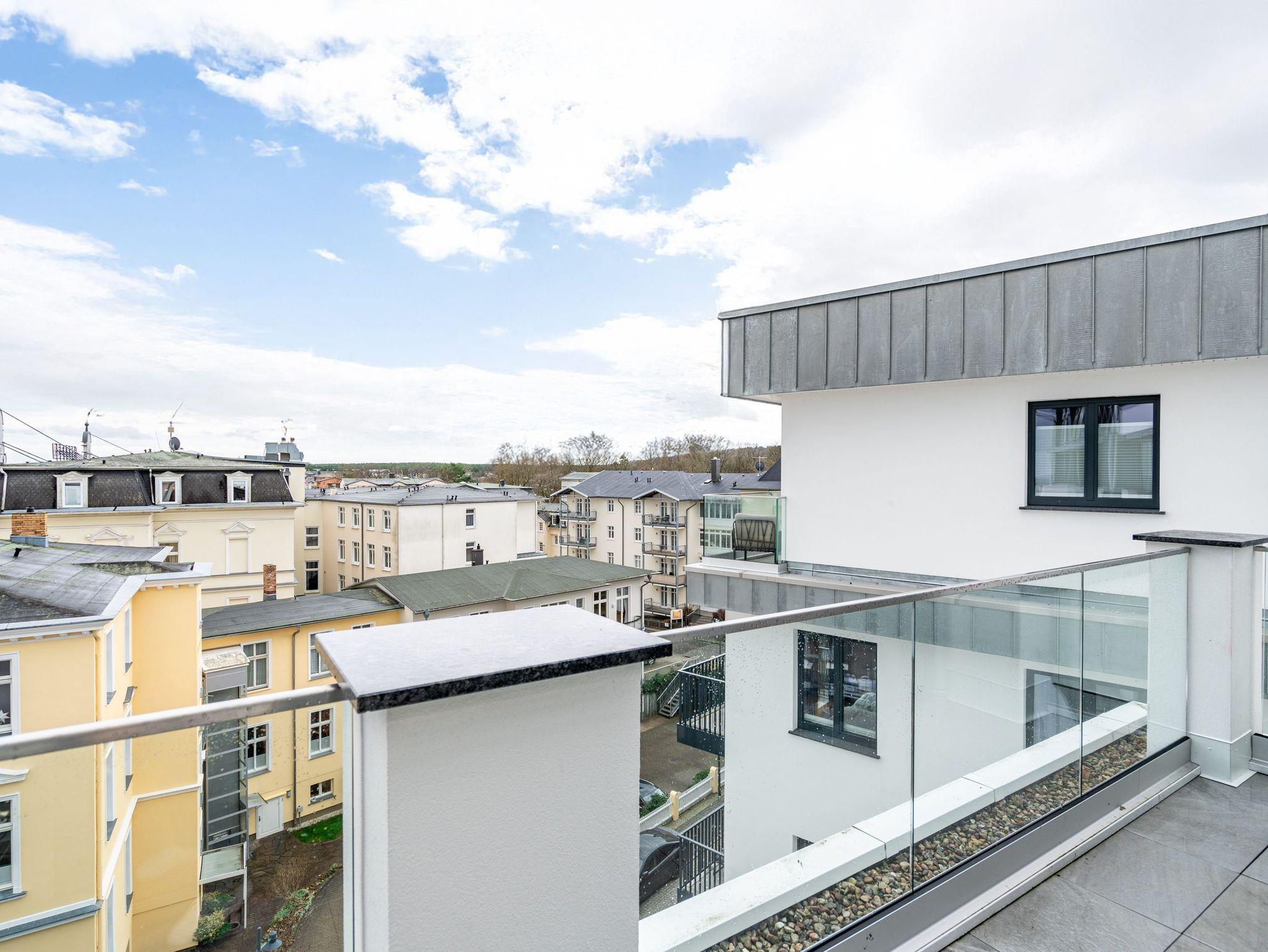 Herzlich willkommen im exklusiven Penthouse-Appartement 4.3 ? Ihrem stilvollen Rückzugsort im Penthouse von Haus A in der 4. Etage mit unvergleichlichem Meerblick. Auf großzügigen 61 m² erwartet zwei Personen ein harmonischer Mix aus modernem Komfort, eleganter Ausstattung und maritimer Wohlfühlatmosphäre. Der lichtdurchflutete Wohnbereich begeistert mit edlem Echtholzparkett, einer gemütlichen Couch, einem stimmungsvollen Elektrokamin und einem beeindruckenden 55-Zoll-Flat-TV. Direkt daneben lädt der Essplatz für zwei Personen dazu ein, köstliche Mahlzeiten in entspannter Atmosphäre zu genießen ? ob beim romantischen Abendessen oder beim gemütlichen Frühstück. Die angrenzende, voll ausgestattete Küchenzeile erfüllt mit einem Kombibackofen mit Mikrowellenfunktion, einem 3-Platten-Induktionskochfeld, einer Spülmaschine und einem Kühlschrank mit Gefrierfach höchste Ansprüche. Das separate Schlafzimmer lässt mit einem komfortablen Boxspringbett (1,80 m x 2,00 m), einem geräumigen Kleiderschrank und einem 43-Zoll-Flat-TV keine Wünsche offen. Ein besonderes Highlight ist die großzügige Dachterrasse, die Sie sowohl vom Wohn- als auch vom Schlafbereich betreten können ? perfekt für entspannte Stunden an der frischen Luft. Das Badezimmer ist Ihre ganz persönliche Wellnessoase: eine großzügige Dusche und eine finnische Sauna mit atemberaubendem Meerblick laden zum Entspannen ein. Ein eleganter Waschtisch, eine Toilette sowie ein separates Gäste-WC ergänzen das moderne Raumangebot. Für zusätzlichen Komfort stehen Ihnen kostenfreies WLAN und ein eigener PKW-Stellplatz in der Tiefgarage zur Verfügung. Freuen Sie sich auf unvergessliche Urlaubstage in der Strandterrasse App. 4.3 ? der perfekte Ort, um die Seele baumeln zu lassen und das Beste aus Ihrem Aufenthalt zu machen. Wir heißen Sie herzlich willkommen!