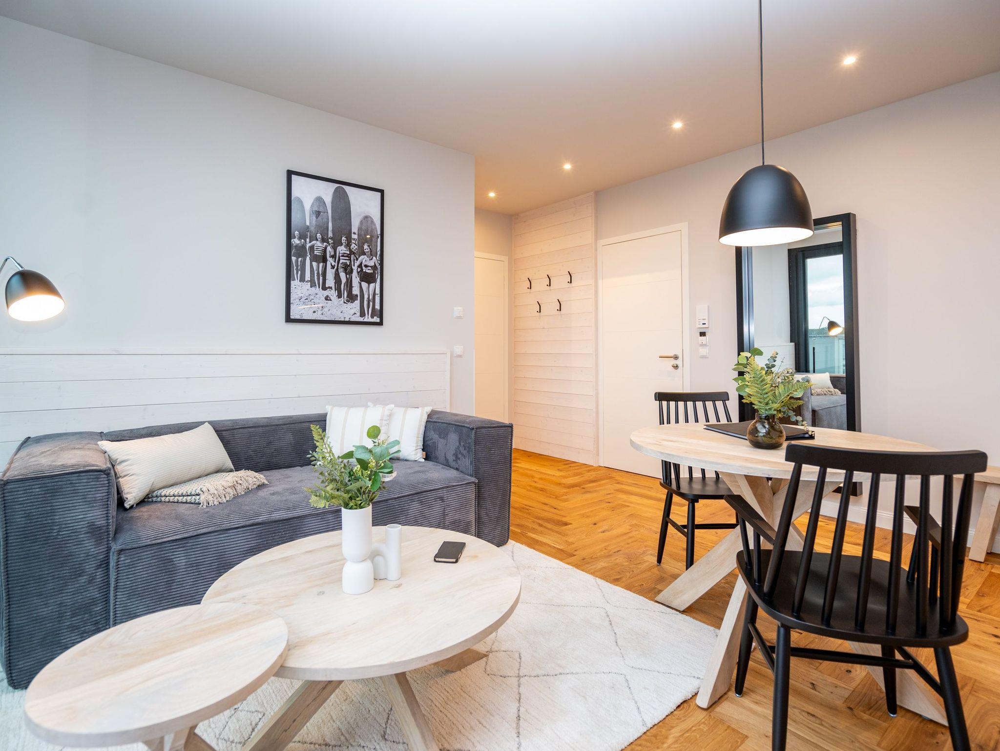Die 2024 fertig gestellte Strandterrasse liegt direkt an der belebten Strandpromenade und bietet einen einzigartigen Ausblick auf die Grand Dame der historischen Seebrücken sowie die historische Konzertmuschel, einem beliebten Treffpunkt für Kunst und Kultur. Dahinter liegt die Ostsee ? ein Panorama, das zu den schönsten in den Kaiserbädern gehört. Es ist wie das Abtauchen in eine andere Zeit. In eine Zeit, in der man mit Stock, Sonnenschirm und Hut fürs „Sehen und gesehen werden“ über die Promenade schlenderte; aber auch in eine Zeit, in der ? damals wie heute ? Zeit einmal für eine kurze Weile keine Rolle spielt. Weil man angekommen ist im Loslassen, Entspannen und Genießen. Es ist dieser besondere Geruch nach Meeresluft und Freiheit, der in Erinnerung bleibt. Dazu die Bilder, die man mitnimmt. Von langen Strandspaziergängen, vom Lachen in fröhlich schäumenden Ostseewellen, von der Zeit in einem wunderschönen Urlaubsdomizil. Denn genau das ist die Strandterrasse mit ihren 56 modernen und exklusiven Ferienappartements direkt gegenüber der Ahlbecker Seebrücke. Die Ein-, Zwei- oder Dreizimmerwohnungen ? zwischen 40 und 70 Quadratmeter groß ? sind von einer Innenarchitektin gemeinsam mit unserem Erfahrungsschatz an Gästewünschen mit viel Liebe zum Detail und ganz individuell konzipiert worden. Entspannung und Wohlfühlen stehen an erster Stelle. Alles ist aufeinander abgestimmt und sorgt für eine gemütliche Atmosphäre. Wählen Sie zwischen einem Domizil in einem hellen, sandfarbenen Designkonzept oder einem Appartement mit anthrazitfarbenen Farbakzenten. Alle Appartements verfügen gleichermaßen über eine stilvolle und komfortable Einrichtung, die passgenau angefertigt worden ist, sowie über moderne Küchen und Bäder. Jedem Schlafzimmer ist ein eigenes Bad mit Dusche zugeordnet (außer App. B4.5). Die Appartements besitzen fast alle einen Balkon ? viele schauen sogar zur Ostsee hinaus. Die meisten Feriendomizile haben einen Elektrokamin und Infrarotsaunen. Im Erdgeschoss befindet sich ein separater Gemeinschaftsraum für Fahrräder. Außerdem besteht die Möglichkeit, im Gemeinschaftswaschraum 2 Waschmaschinen [&] Trockner zu nutzen. Ergänzt wird das Angebot durch eine Gemeinschaftssauna, die täglich von 11:00 bis 22:00 Uhr nutzbar ist. In der Tiefgarage (Einfahrtshöhe 2,03 Meter) steht für jede Wohnung 1 Pkw-Stellplatz zur Verfügung. Ist alles zur Zufriedenheit untergebracht? Dann kann der Urlaub ja beginnen. Und beim Blick vom Balkon über die Ostsee treffen sich zum Sonnenaufgang das Heute und das Damals. Gelassenheit legt sich beim Gang hinunter an den Strand auf die Seele. Jetzt darf die Zeit stehenbleiben.