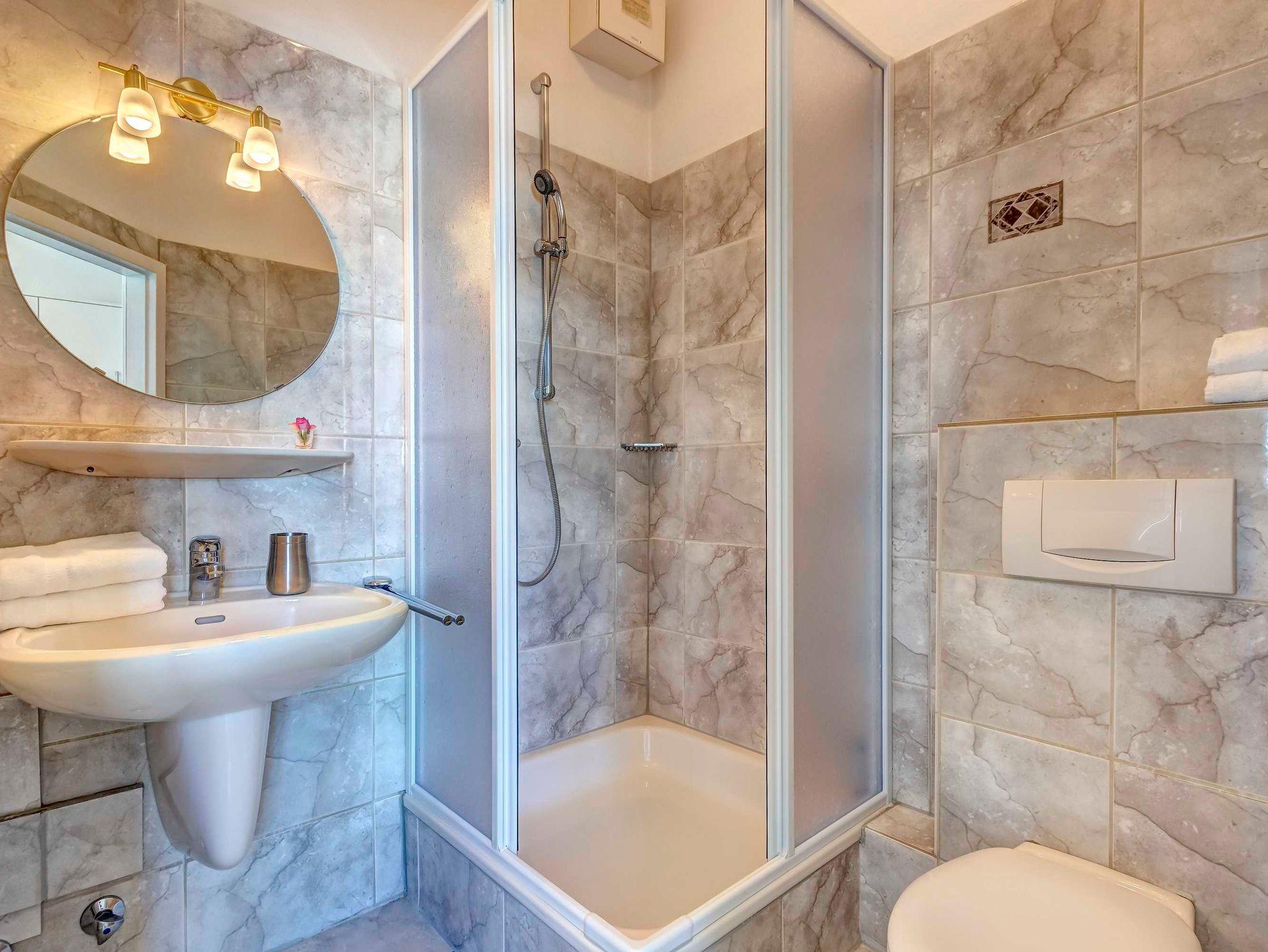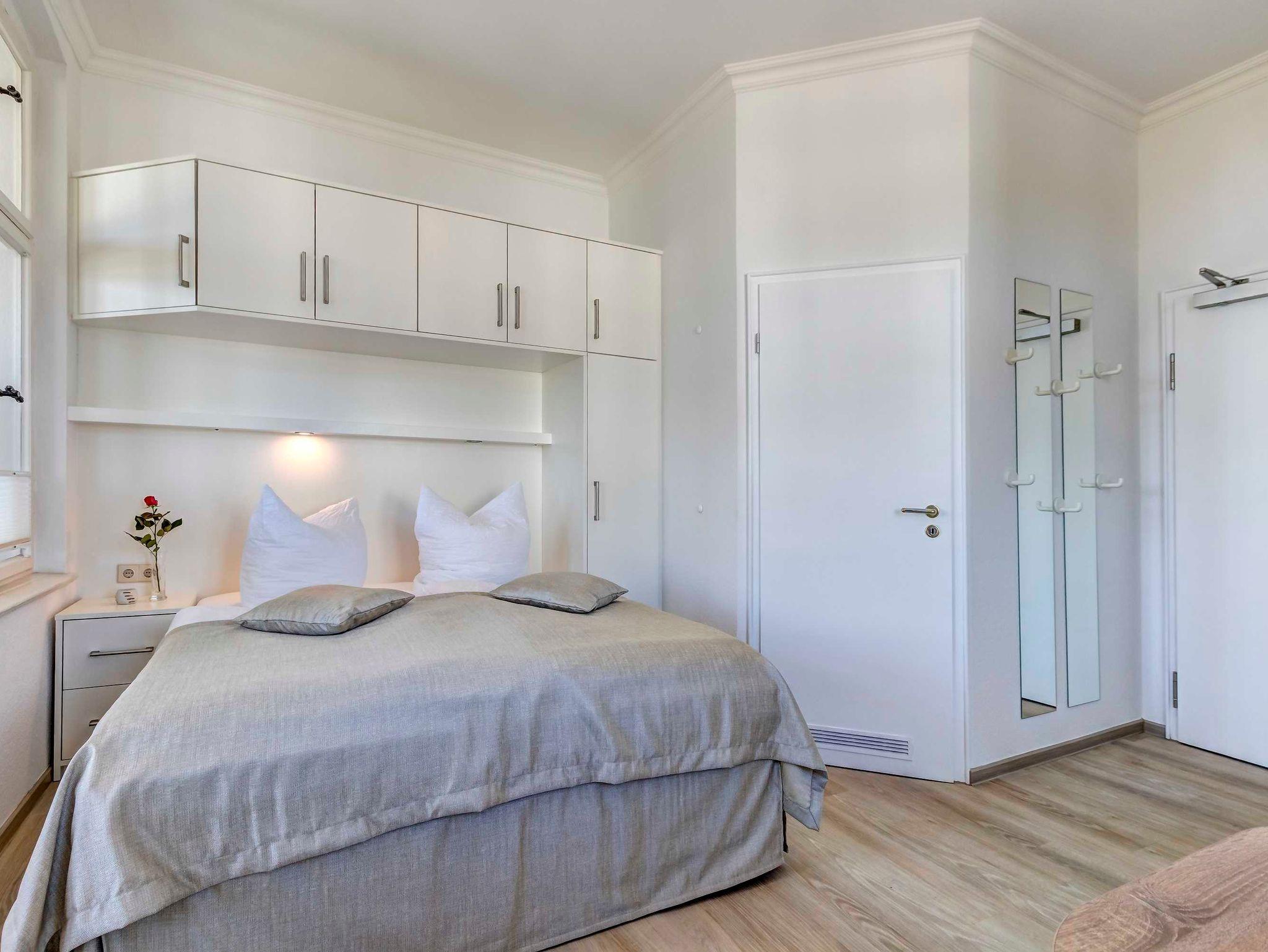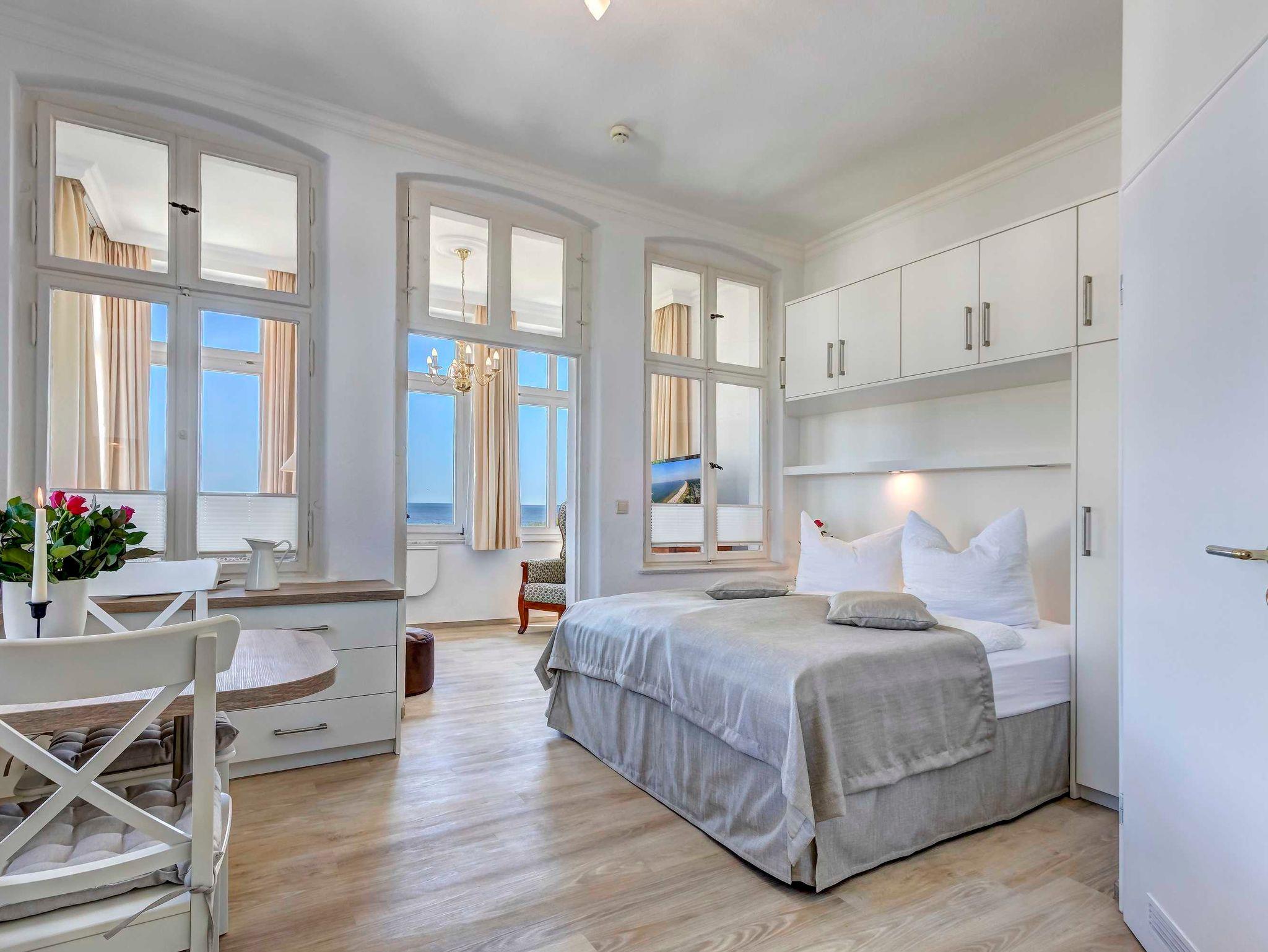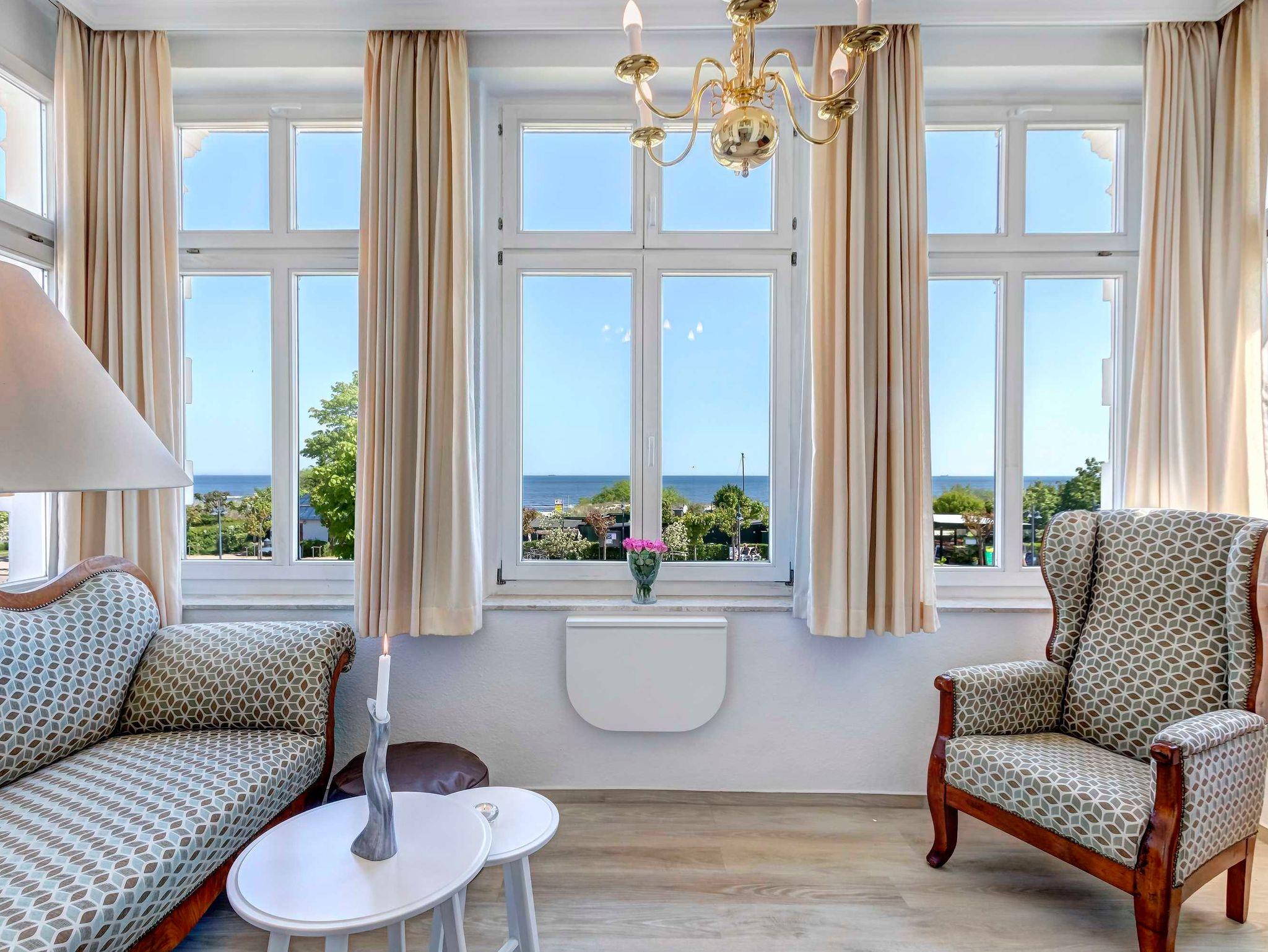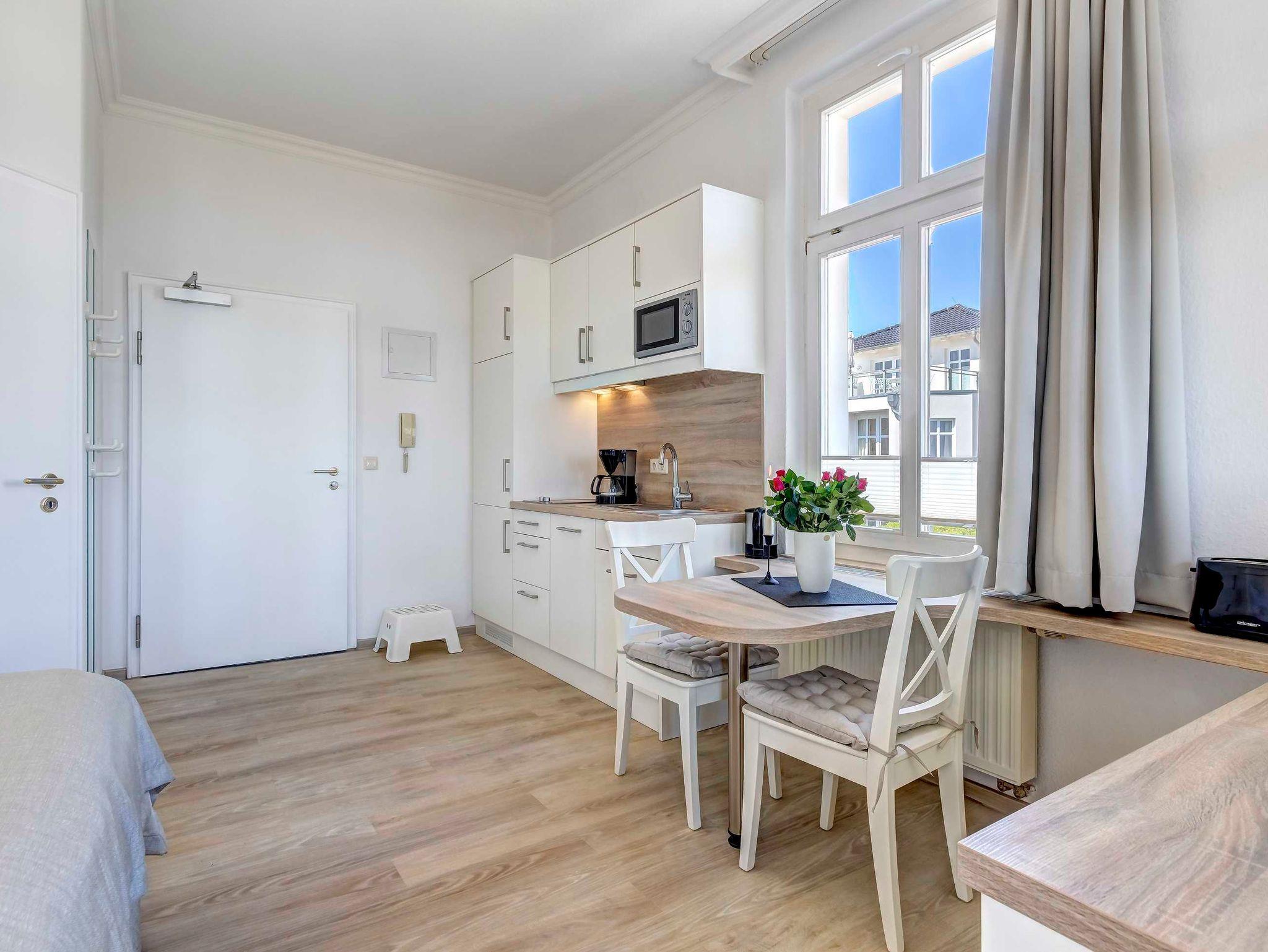 Das komfortable 2-Zimmer-Appartement OG 1 befindet sich im ersten Obergeschoss der Villa Germania nur 40 Meter vom Strand entfernt. Es verfügt über einen Kombiraum mit einem Doppelbett, einem Essbereich und einer integrierten, voll ausgestatteten Küche mit Kaffeemaschine, Wasserkocher, Toaster, Mikrowelle. Das Bad ist mit Dusche und WC ausgestattet. Der Wohnraum mit einer gemütlichen Sitzgruppe befindet sich in der geschlossenen, verglasten Veranda und hier haben Sie einen herrlichen, unverbauten Seeblick. Ein Pkw-Stellplatz steht Ihnen auf dem Grundstück kostenfrei zur Verfügung und Ihre Fahrräder können Sie ebenfalls auf dem Grundstück in einem separaten Abstellraum unterbringen. Alle Wohnungen in der Villa Germania haben passwortgeschütztem DSL-WLAN Internetzugang (gerätegebunden, Euro 1,50 pro Tag und Gerät). Eine Waschmaschine, einen Trockner und den Saunabereich mit Ruheraum können Sie jeweils gern gegen Gebühr nutzen (Münzgeräte).