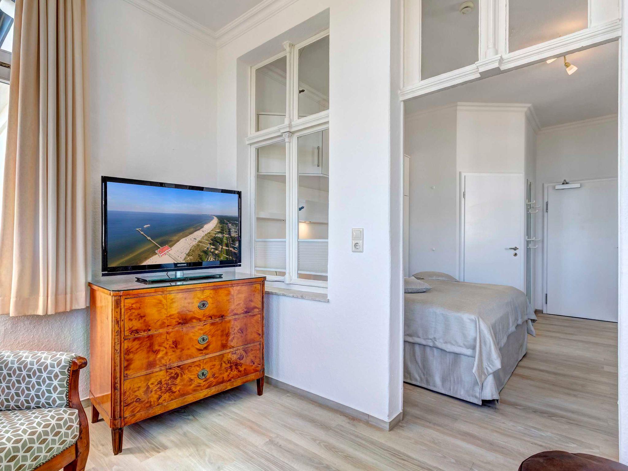 Direkt an der Strandpromenade mit herrlichem SEEBLICK aus der Veranda! Schönes 2 - Zimmer - Apartment mit gemütlicher und guter Ausstattung. Kombiraum mit Doppelbett, Küchenzeile mit Essplatz, Duschbad und Veranda als Wohnraum mit direktem Seeblick. Die Wohnung verfügt über einen Pkw-Stellplatz. In der Garage können Fahrräder und ähnliches untergestellt werden. Im Haus gibt es eine Sauna. Von der Villa Germania aus können Sie das Ortszentrum und die bekannte Ahlbecker Seebrücke in ca. 3 Minuten zu Fuß erreichen. Zum Strand sind es 50 m.