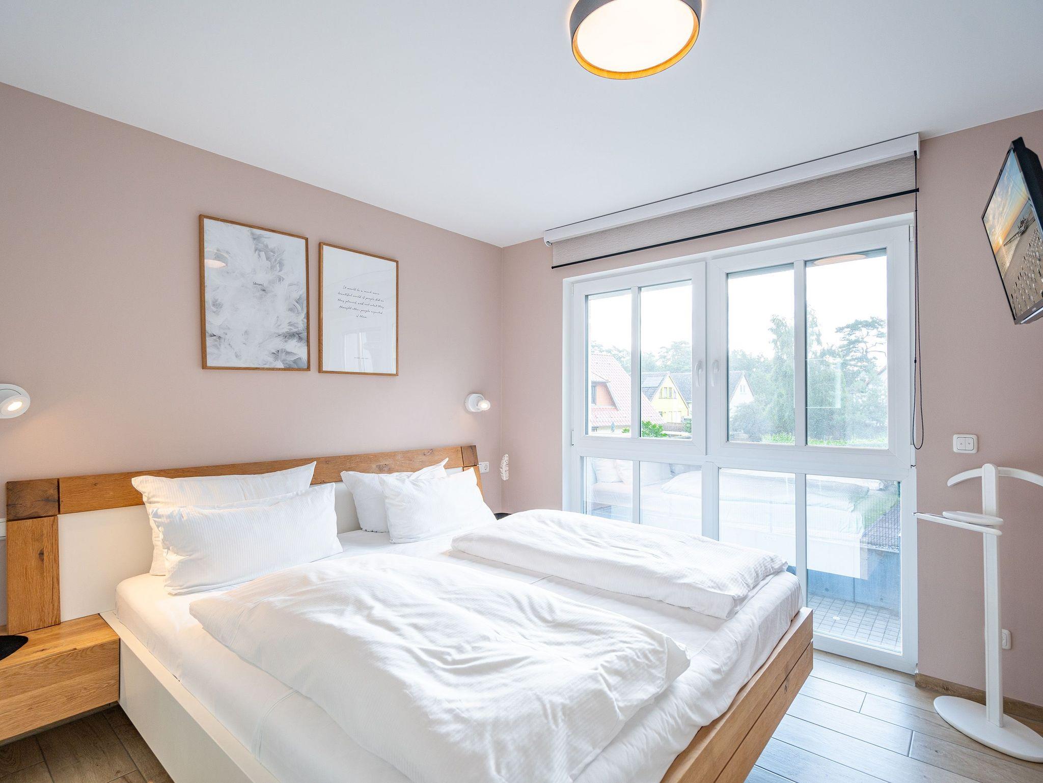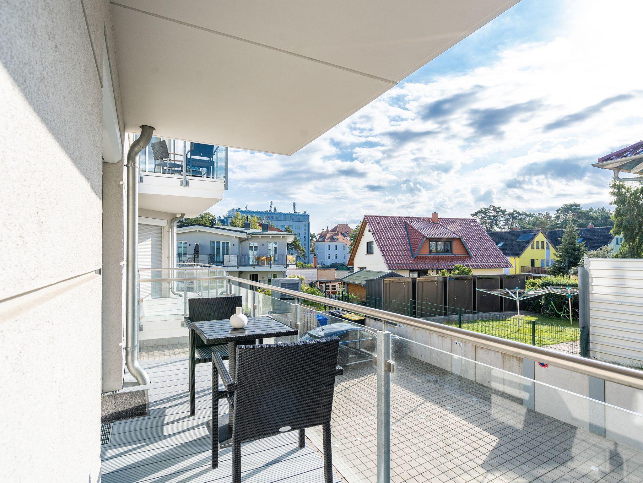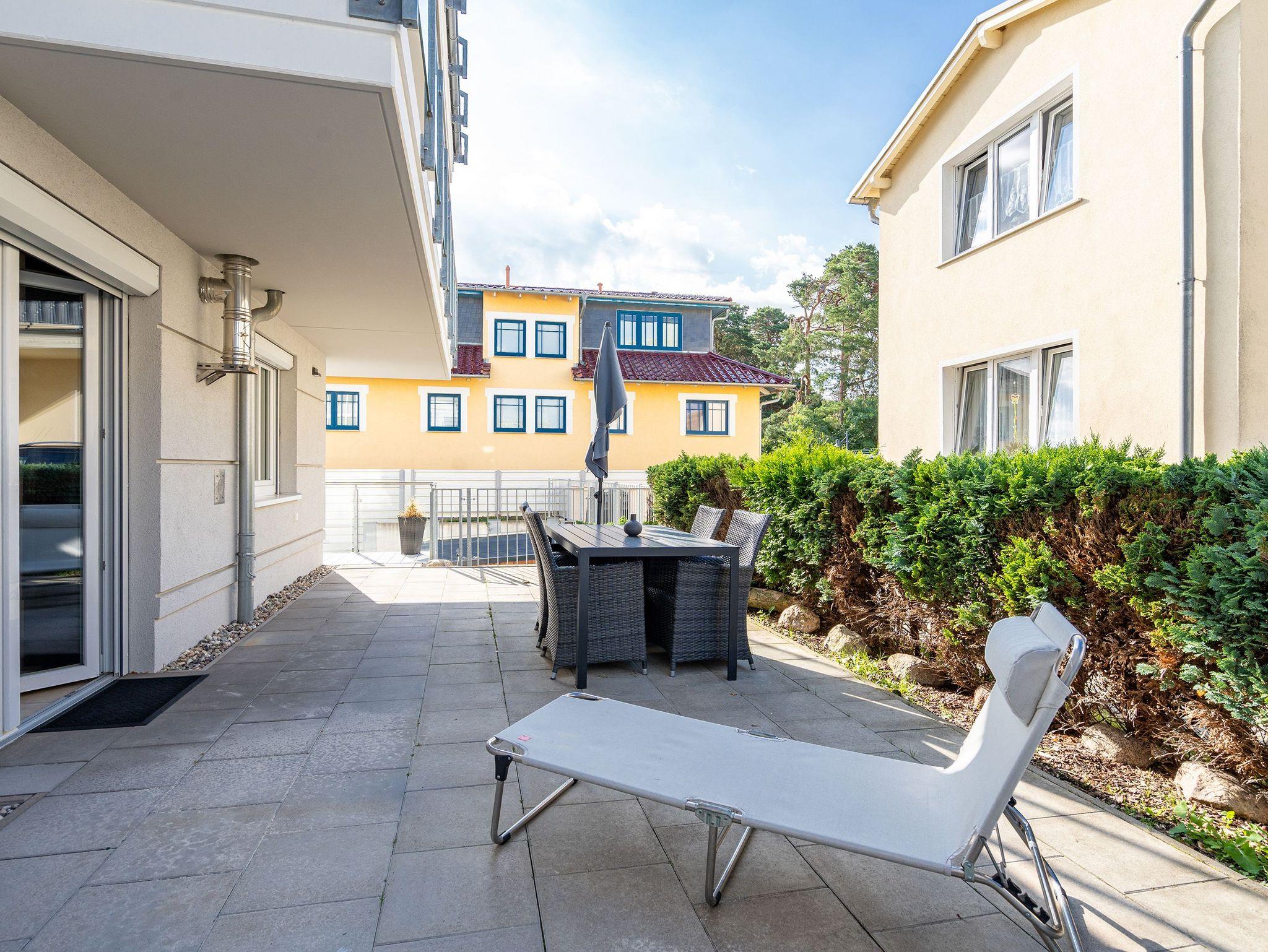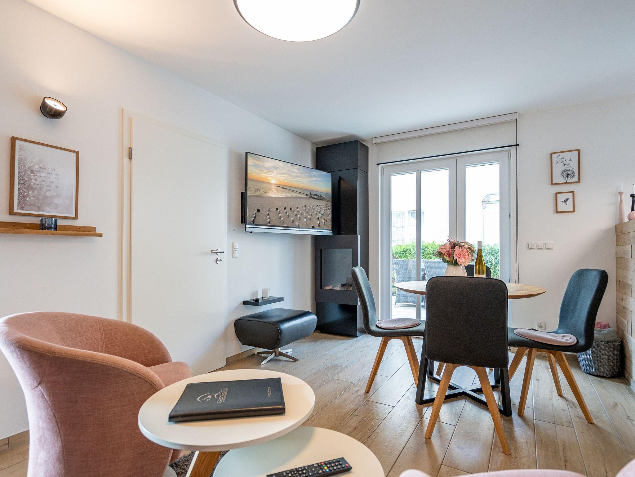 Die große Terrasse (25 Quadratmeter) ist sonnenüberflutet. Leise rauscht die Ostsee im Hintergrund. Der Nordwind trägt das Geräusch der nahen Wellen bis hierher in Ihr Urlaubsparadies. Die bequemen Gartenmöbel laden zum Relaxen und Ausspannen ein. Was will man mehr! Drinnen wartet auf 63 Quadratmeter ein stilvolles Interieur nur darauf, die Auszeit an der Ostsee so angenehm wie möglich zu machen. Vom gemütlichen Ledersofa aus haben Sie einen freien Blick auf den urigen Gas-Kamin, einen großen Flat-TV und auf das viele Grün, das das Domizil Berg 8 umgibt. Modern und trendy ist der schöne Ess-Tresen mit den hohen Schalenhockern. In den Tresen ist auf einer Seite eine freie Kochinsel eingelassen. Dahinter öffnet sich der Raum zu einer vollausgestatteten Küche mit hochwertigen Markengeräten und edlem Geschirr. Auch der Schlaf kommt in diesem wunderschönen Appartement natürlich nicht zu kurz. Zwei eigens dafür konzipierte Räume können bis zu vier Personen nicht nur schnöde beherbergen, sondern ihnen dank der beiden bequemen Doppelbetten (1,80 m x 2,00 m) eine wunderbar angenehme Entspannungszone bieten. Beide Zimmer haben einen Flat-TV. Und eines der beiden Schlafzimmer verfügt sogar über einen eigenen, kleinen Balkon (4 Quadratmeter). Auch das Badezimmer ist ein Ort zum Wohlfühlen und Runterkommen. Eine Panoramasauna sorgt für kuschelige Wärme an kühlen und tristen Tagen. Eine Dusche, ein Waschtisch und ein WC sind hier ebenfalls vorhanden. Außerdem gibt es ein Gäste-WC. Das WLAN ist in der Wohnung kostenfrei. Hier fängt der Urlaub bereits an der Haustür an. Denn alles ist für Sie vorbereitet. So sind die Betten bereits bezogen, wenn Sie anreisen und Handtücher liegen bereit. Ein wohnungseigener Pkw-Stellplatz befindet sich am Haus. Zudem besitzt die Wohnung Nummer 3 einen Abstellraum für Fahrräder. Auch Ihr kleiner Vierbeiner ( bis 7 kg) ist willkommen (gegen eine Haustierendreinigung).