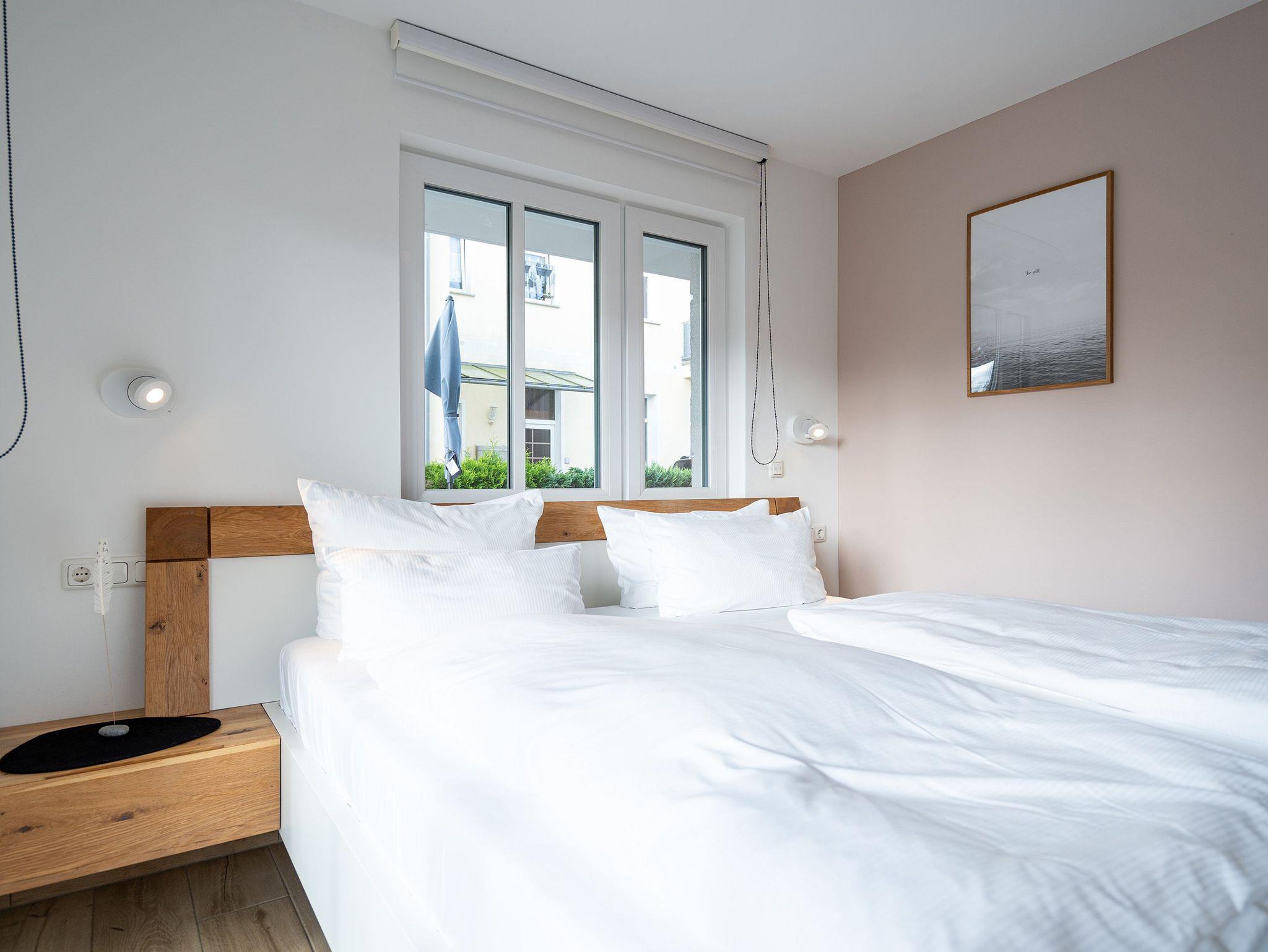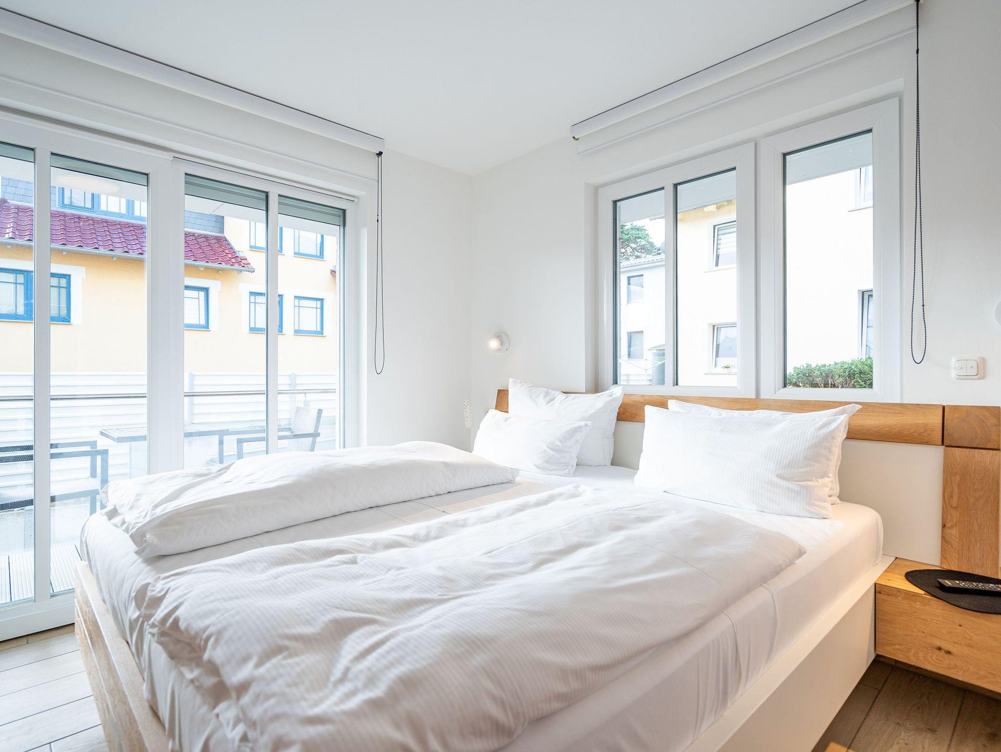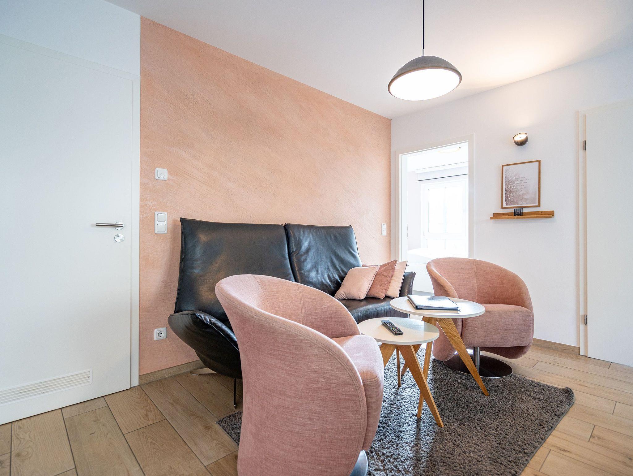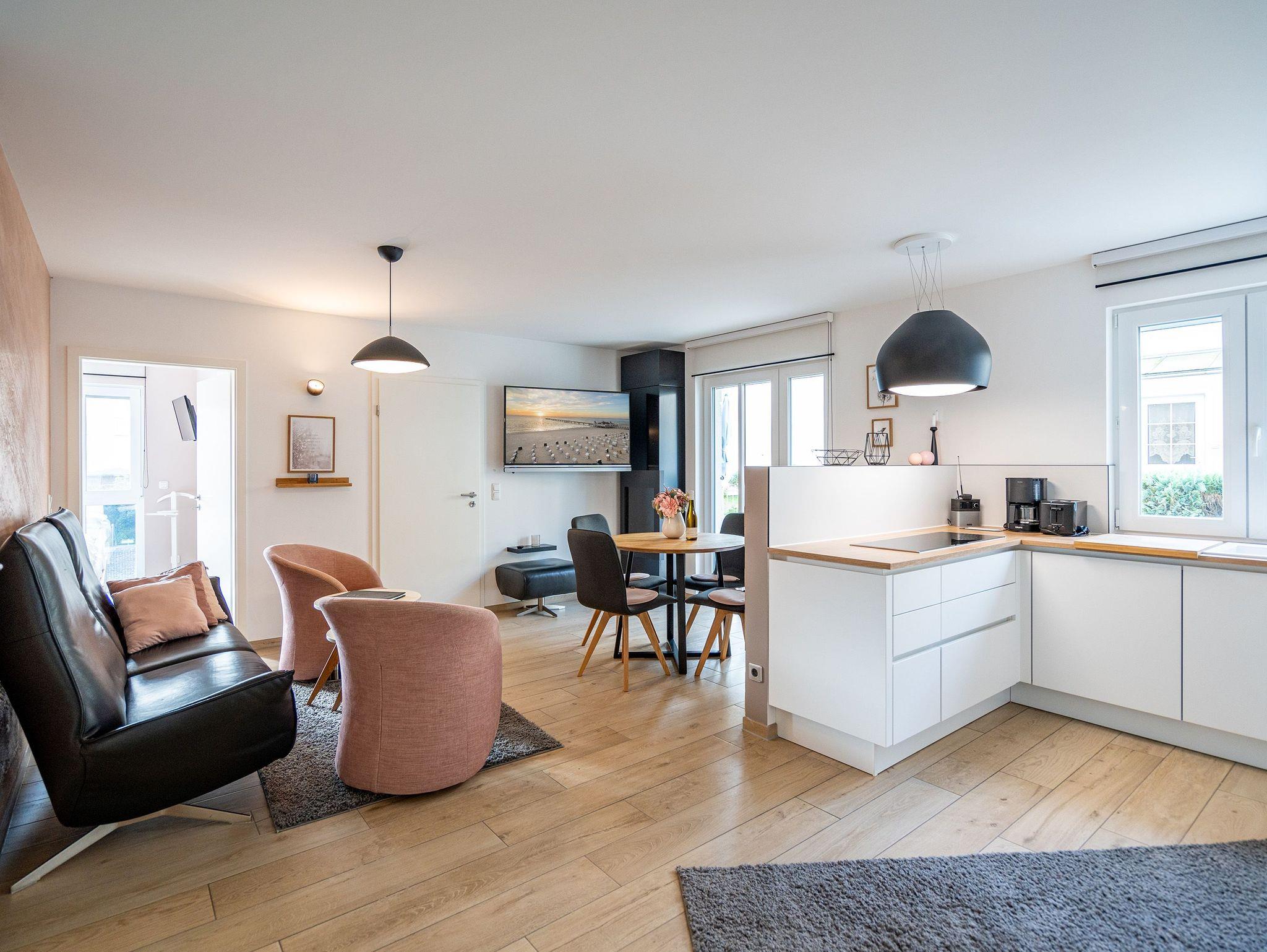 Die große Terrasse (25 Quadratmeter) ist sonnenüberflutet. Leise rauscht die Ostsee im Hintergrund. Der Nordwind trägt das Geräusch der nahen Wellen bis hierher in Ihr Urlaubsparadies. Die bequemen Gartenmöbel laden zum Relaxen und Ausspannen ein. Was will man mehr! Drinnen wartet auf 63 Quadratmeter ein stilvolles Interieur nur darauf, die Auszeit an der Ostsee so angenehm wie möglich zu machen. Vom gemütlichen Ledersofa aus haben Sie einen freien Blick auf den urigen Gas-Kamin, einen großen Flat-TV und auf das viele Grün, das das Domizil Berg 8 umgibt. Modern und trendy ist der schöne Ess-Tresen mit den hohen Schalenhockern. In den Tresen ist auf einer Seite eine freie Kochinsel eingelassen. Dahinter öffnet sich der Raum zu einer vollausgestatteten Küche mit hochwertigen Markengeräten und edlem Geschirr. Auch der Schlaf kommt in diesem wunderschönen Appartement natürlich nicht zu kurz. Zwei eigens dafür konzipierte Räume können bis zu vier Personen nicht nur schnöde beherbergen, sondern ihnen dank der beiden bequemen Doppelbetten (1,80 m x 2,00 m) eine wunderbar angenehme Entspannungszone bieten. Beide Zimmer haben einen Flat-TV. Und eines der beiden Schlafzimmer verfügt sogar über einen eigenen, kleinen Balkon (4 Quadratmeter). Auch das Badezimmer ist ein Ort zum Wohlfühlen und Runterkommen. Eine Panoramasauna sorgt für kuschelige Wärme an kühlen und tristen Tagen. Eine Dusche, ein Waschtisch und ein WC sind hier ebenfalls vorhanden. Außerdem gibt es ein Gäste-WC. Das WLAN ist in der Wohnung kostenfrei. Hier fängt der Urlaub bereits an der Haustür an. Denn alles ist für Sie vorbereitet. So sind die Betten bereits bezogen, wenn Sie anreisen und Handtücher liegen bereit. Ein wohnungseigener Pkw-Stellplatz befindet sich am Haus. Zudem besitzt die Wohnung Nummer 3 einen Abstellraum für Fahrräder. Auch Ihr kleiner Vierbeiner ( bis 7 kg) ist willkommen (gegen eine Haustierendreinigung).