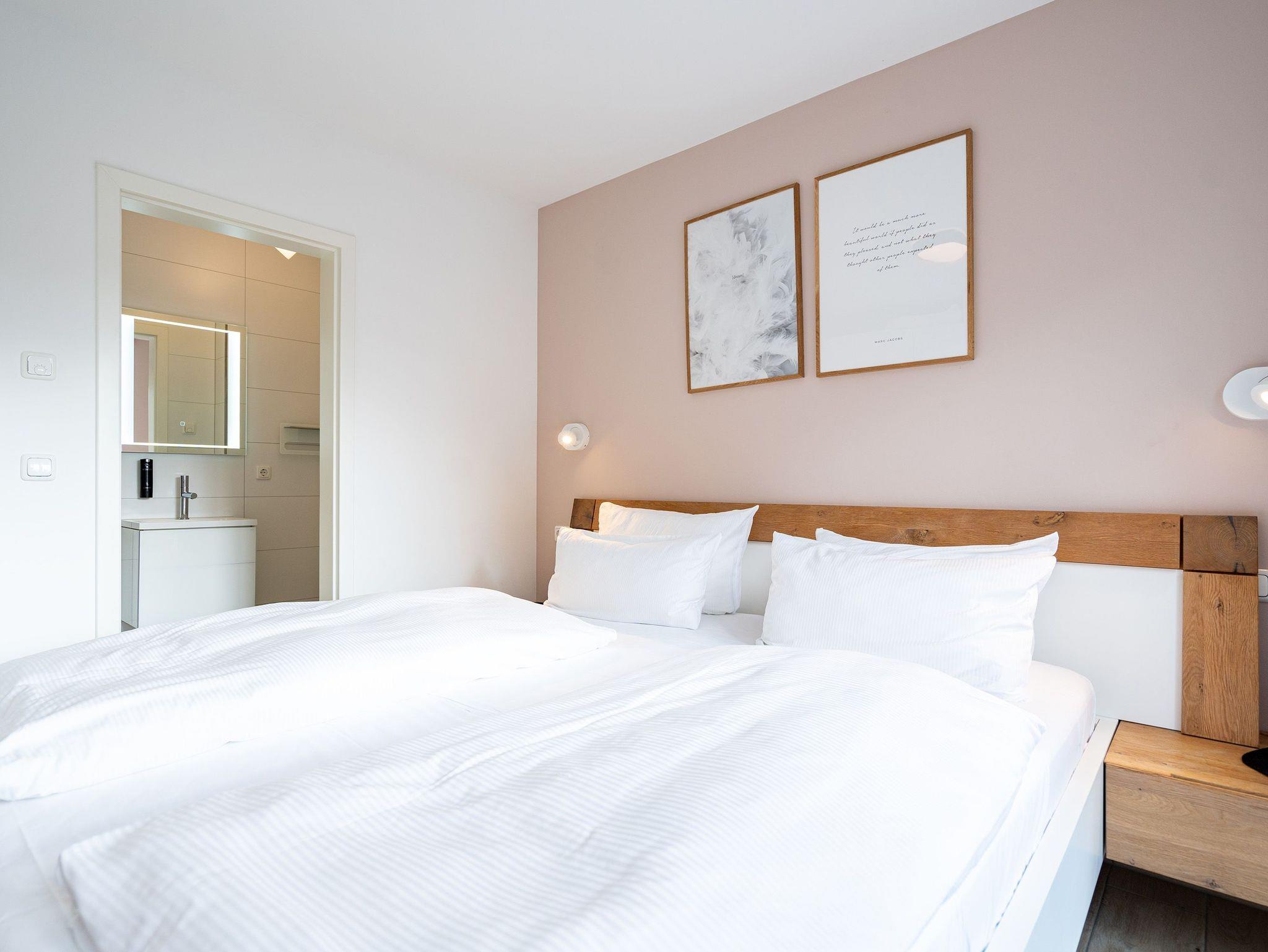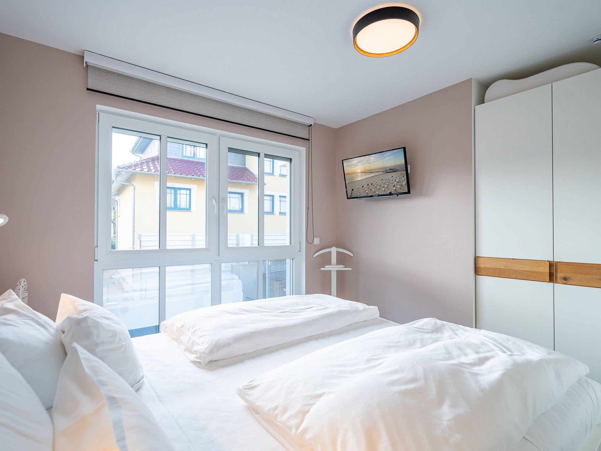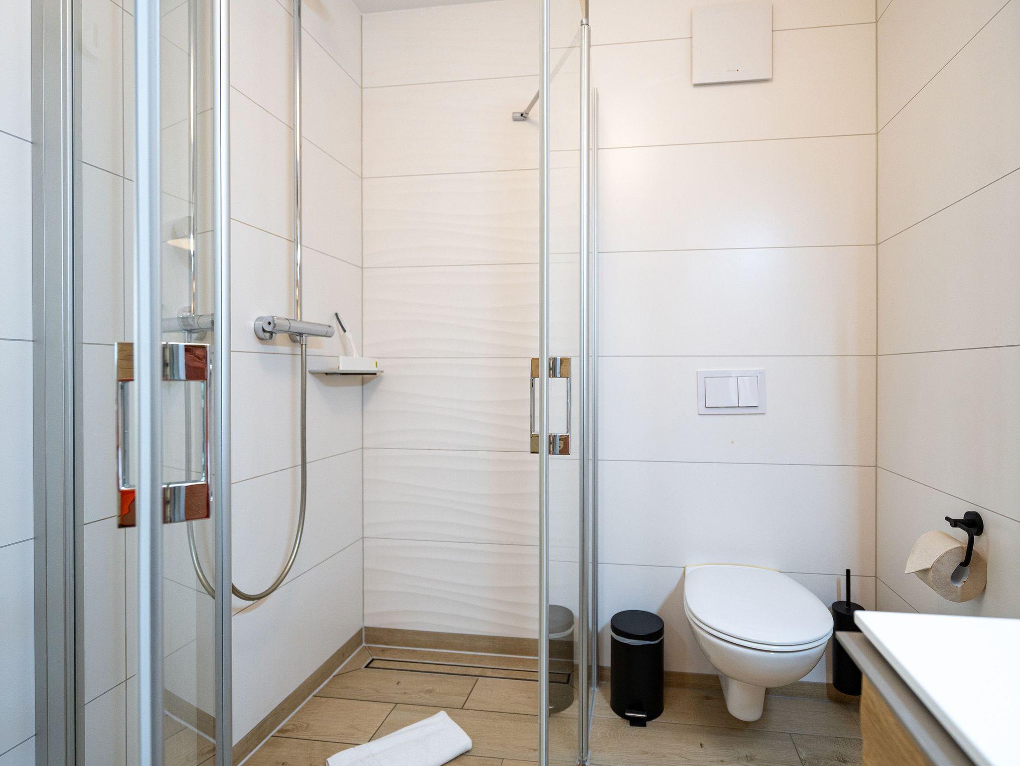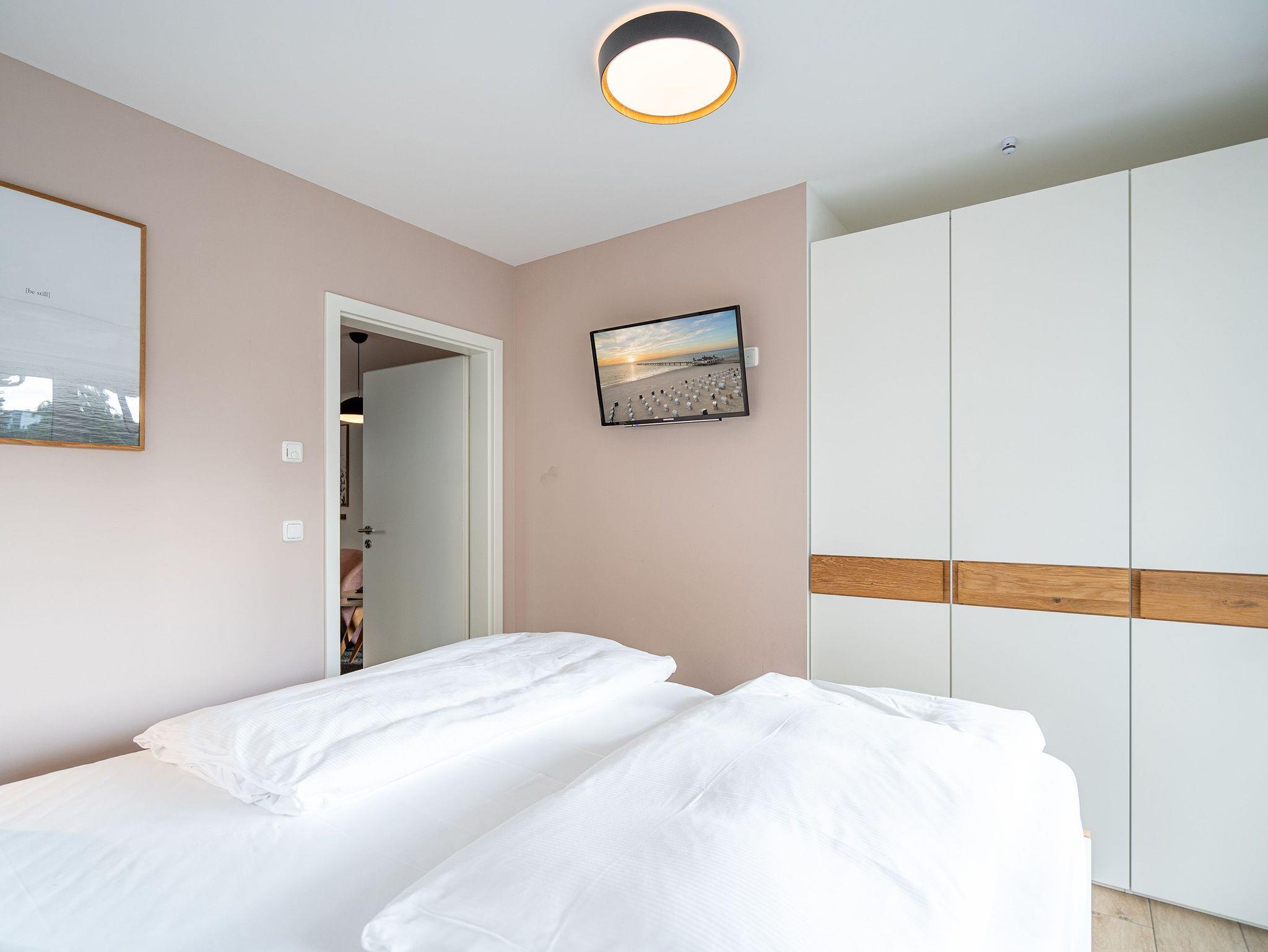 Die große Terrasse (25 Quadratmeter) ist sonnenüberflutet. Leise rauscht die Ostsee im Hintergrund. Der Nordwind trägt das Geräusch der nahen Wellen bis hierher in Ihr Urlaubsparadies. Die bequemen Gartenmöbel laden zum Relaxen und Ausspannen ein. Was will man mehr! Drinnen wartet auf 63 Quadratmeter ein stilvolles Interieur nur darauf, die Auszeit an der Ostsee so angenehm wie möglich zu machen. Vom gemütlichen Ledersofa aus haben Sie einen freien Blick auf den urigen Gas-Kamin, einen großen Flat-TV und auf das viele Grün, das das Domizil Berg 8 umgibt. Modern und trendy ist der schöne Ess-Tresen mit den hohen Schalenhockern. In den Tresen ist auf einer Seite eine freie Kochinsel eingelassen. Dahinter öffnet sich der Raum zu einer vollausgestatteten Küche mit hochwertigen Markengeräten und edlem Geschirr. Auch der Schlaf kommt in diesem wunderschönen Appartement natürlich nicht zu kurz. Zwei eigens dafür konzipierte Räume können bis zu vier Personen nicht nur schnöde beherbergen, sondern ihnen dank der beiden bequemen Doppelbetten (1,80 m x 2,00 m) eine wunderbar angenehme Entspannungszone bieten. Beide Zimmer haben einen Flat-TV. Und eines der beiden Schlafzimmer verfügt sogar über einen eigenen, kleinen Balkon (4 Quadratmeter). Auch das Badezimmer ist ein Ort zum Wohlfühlen und Runterkommen. Eine Panoramasauna sorgt für kuschelige Wärme an kühlen und tristen Tagen. Eine Dusche, ein Waschtisch und ein WC sind hier ebenfalls vorhanden. Außerdem gibt es ein Gäste-WC. Das WLAN ist in der Wohnung kostenfrei. Hier fängt der Urlaub bereits an der Haustür an. Denn alles ist für Sie vorbereitet. So sind die Betten bereits bezogen, wenn Sie anreisen und Handtücher liegen bereit. Ein wohnungseigener Pkw-Stellplatz befindet sich am Haus. Zudem besitzt die Wohnung Nummer 3 einen Abstellraum für Fahrräder. Auch Ihr kleiner Vierbeiner ( bis 7 kg) ist willkommen (gegen eine Haustierendreinigung).