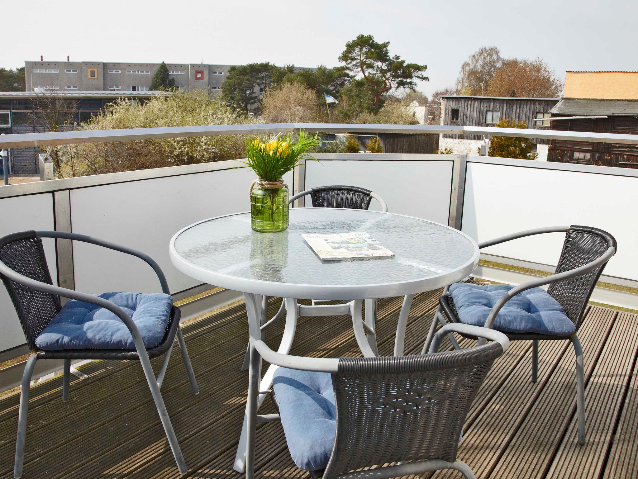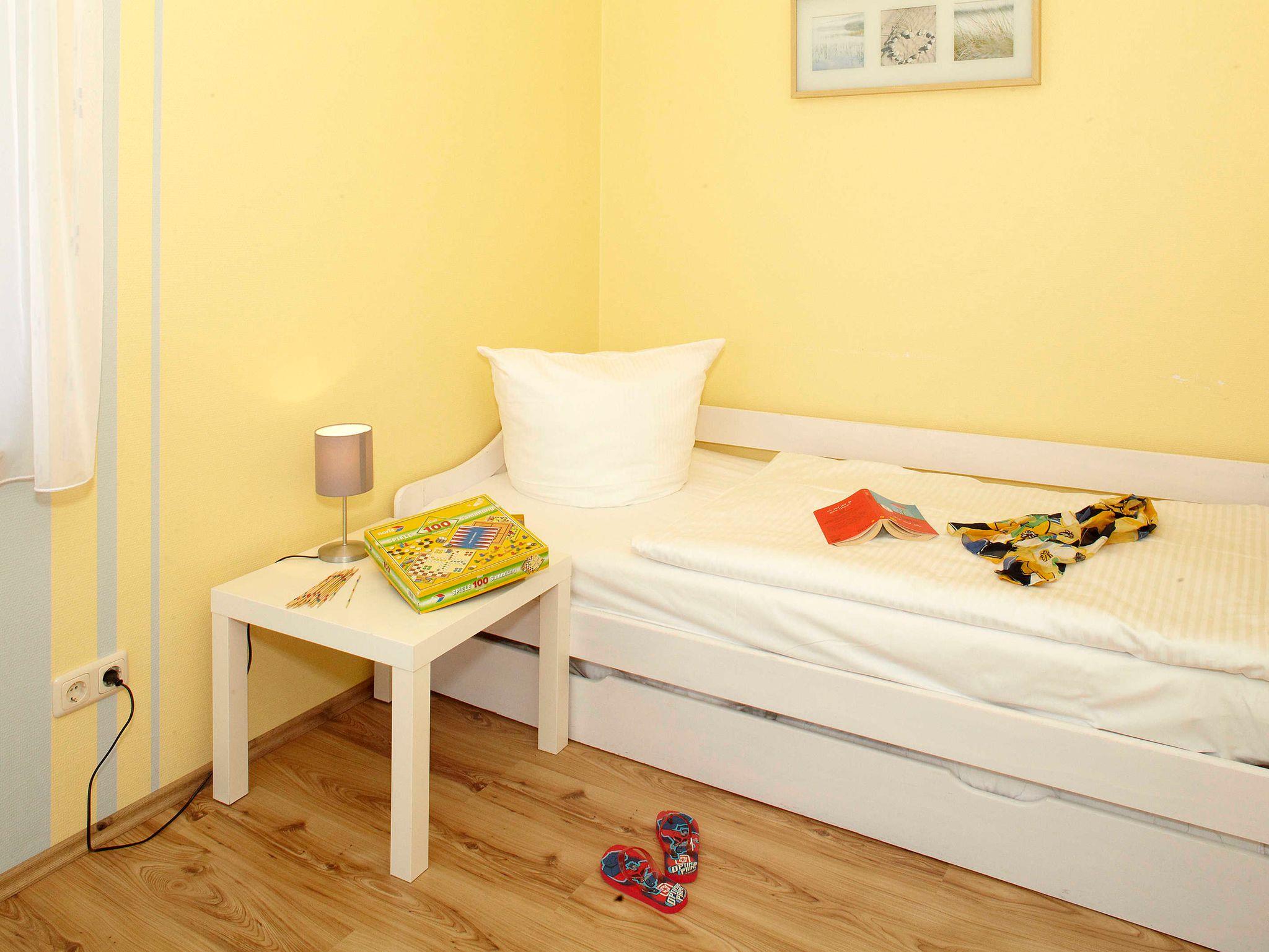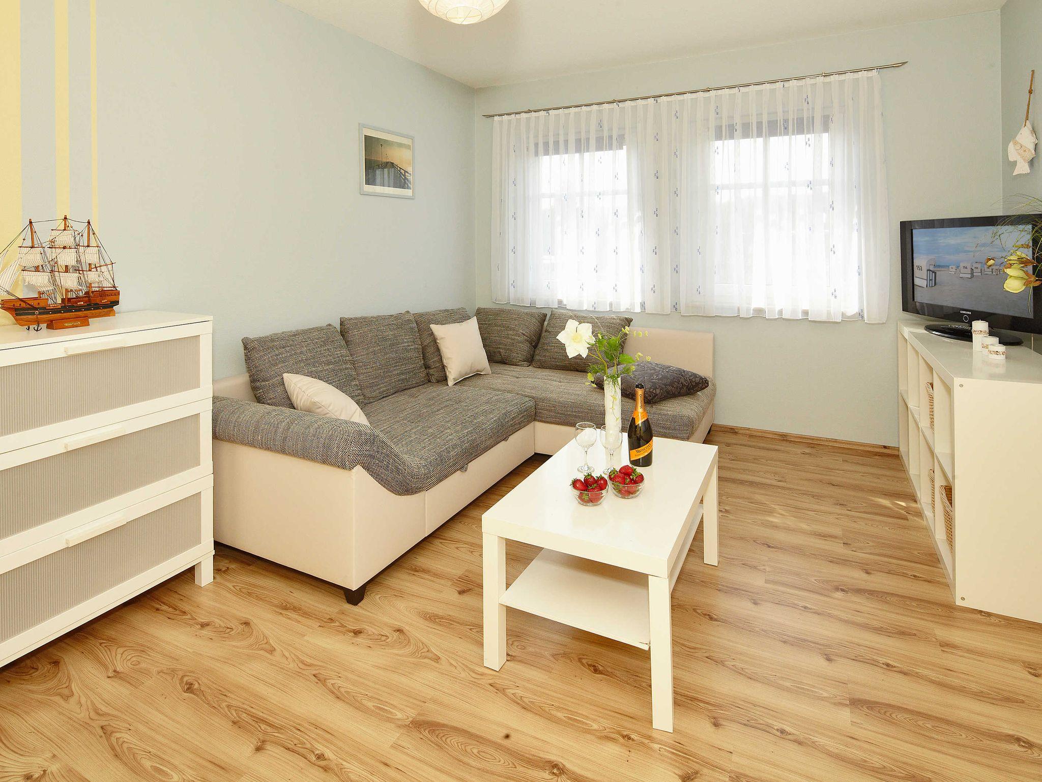 Gemütliche, moderne Fewo mit Wohnzimmer (Schlafcouch und Einzelbett mit Ausziehfunktion für zweite Matratze) ein Schlafzimmer mit Doppelbett, einer großen Wohnküche mit Balkon (Südseite, Mobilar vorhanden) und Duschbad. Die Küche ist ausgestattet mit Kühlschrank, Geschirrspüler, Kaffeemaschine, Wasserkocher, Toaster, ausreichend Geschirr und großzügiger Sitzecke. 1 SZ hat ein Doppelbett und genügend Stauraum. Kabel- TV und Radio/ CD stehen zur Verfügung.