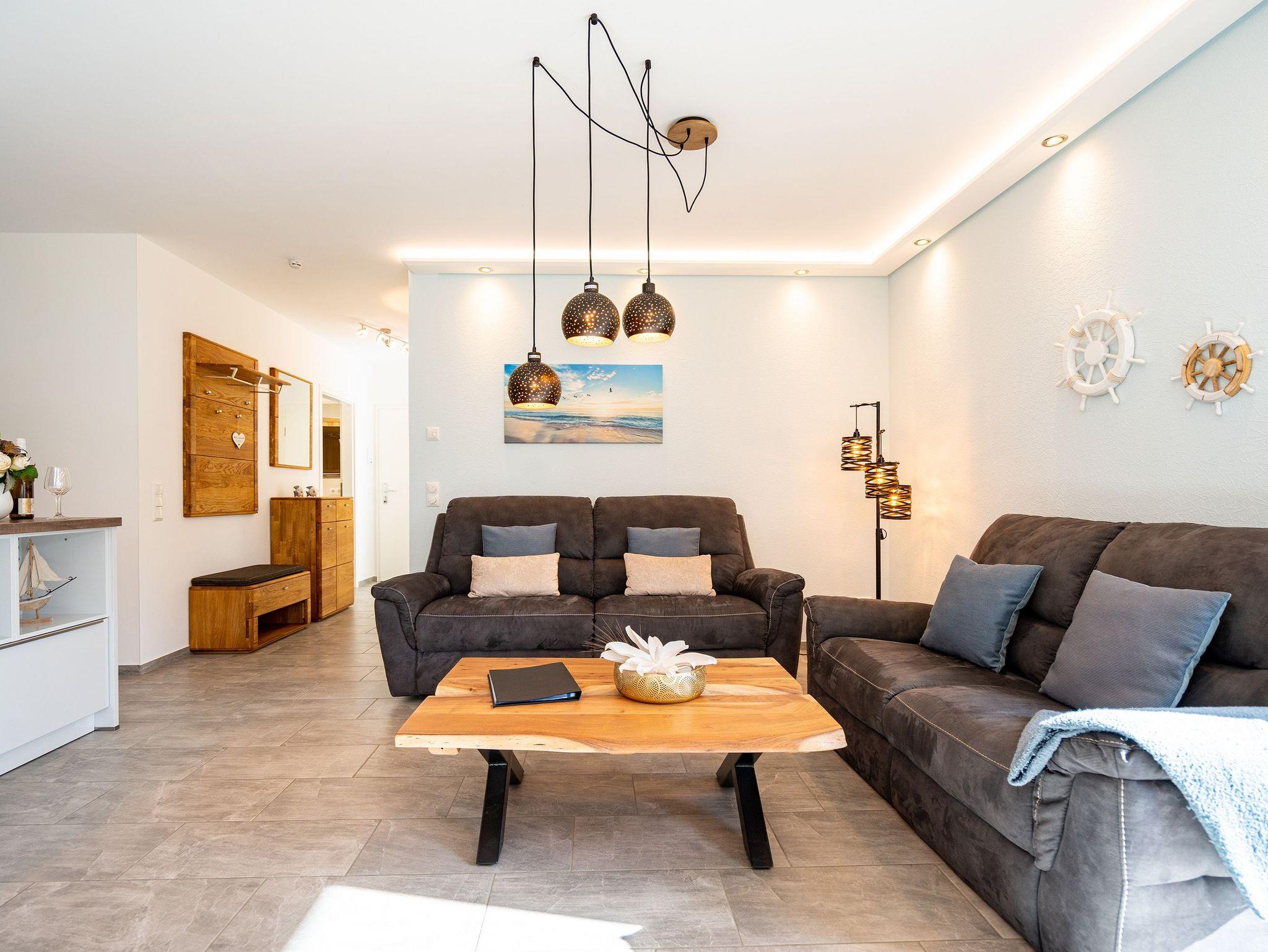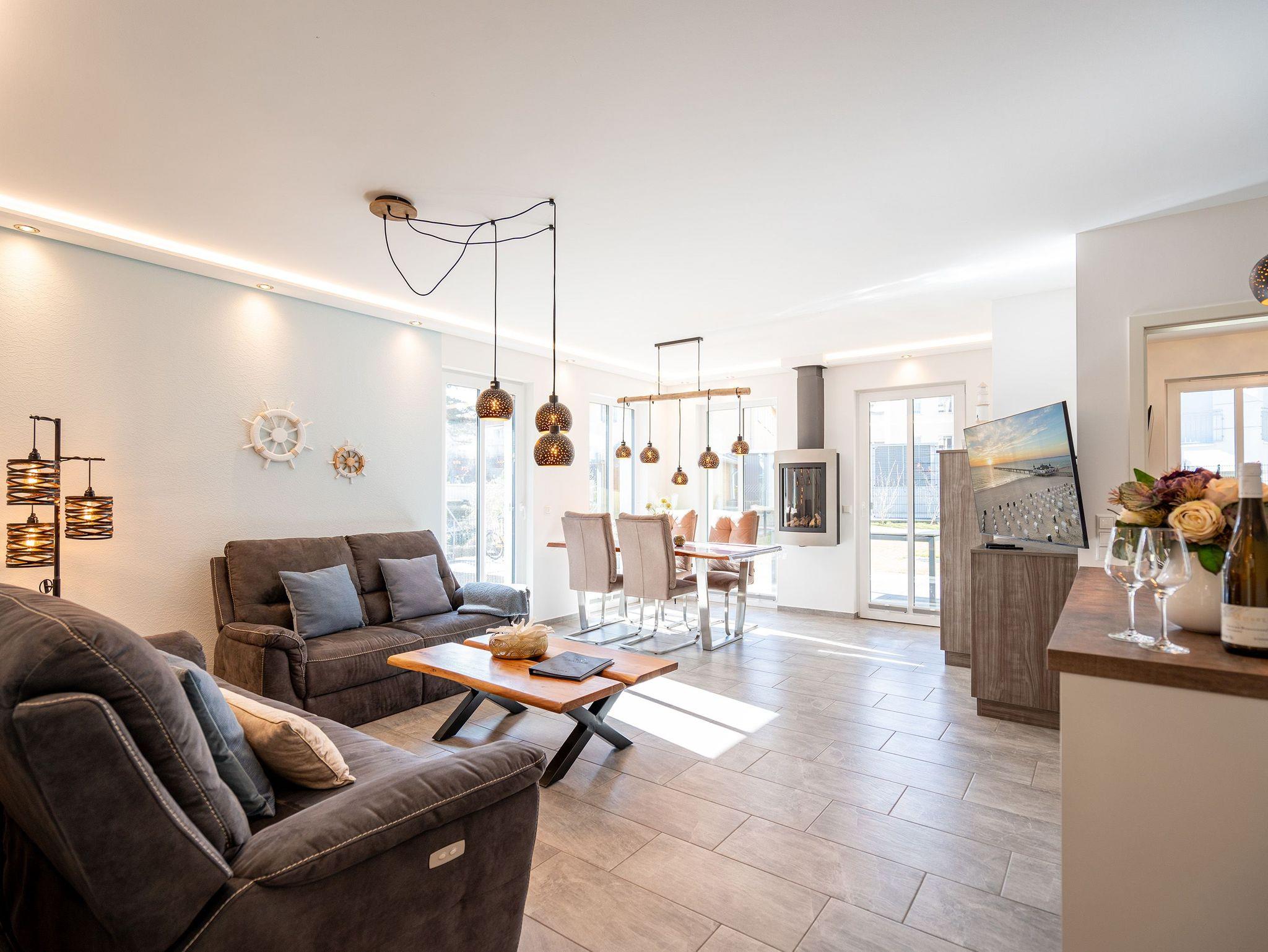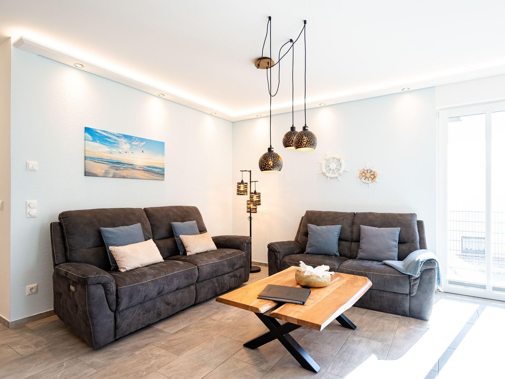 Ein gemütliches Raumkonzept und liebevoll eingerichtete Zimmer erwarten Sie im Appartement 06 im Domizil Meerzeit. Die 76qm, aufgeteilt in 3-Zimmer, eignen sich hervorragend für Familien oder befreundete Paare, die neben Ruhe und Entspannung den Charme der Kaiserbäder erleben wollen. Der offene Wohn-Essbereich ist mit zwei elektrisch verstellbaren Sofas ausgestattet. Der großzügige Flat-TV sorgt für entsprechende Unterhaltung in den Abendstunden. Ein besonderes Highlight des Appartements ist der hängende Gaskamin, den Sie bequem mit der Fernbedienung steuern können. Genießen Sie seine wohlige Wärme, ob auf dem Sofa oder beim Beisammensein am Essplatz . Die schlichte Küche ist mit neuesten Elektrogeräten (Induktionskochfeld, Backofen, Mikrowelle, Spülmaschine, Kühlschrank) ausgestattet und lässt keine Wünsche beim Zubereiten Ihrer Speisen offen. Touchbedienung und die im Herd integrierte Dunstabzugshaube runden die Exklusivität des Kochbereiches ab. Dank der Boxspringbetten (1,80m x 2,00m) in beiden Schlafzimmern müssen Sie auch in Ihrem Urlaub nicht auf Schlafkomfort verzichten. Geräumige Kleiderschränke und Flat-TVs runden die Ausstattung in den Schlafzimmern ab. Eine finnische Sauna im Masterbad lädt Sie besonders an kühlen Tagen ein Ihrem Körper etwas Gutes zu tun. Die Regendusche sorgt für die entsprechende Abkühlung im Anschluss. Einen LED-beleuchteten Waschtisch sowie einen beheizten Spiegel und ein WC finden Sie ebenso im Hauptbad. Das vollwertige zweite Badezimmer verfügt ebenfalls über eine Regendusche, einen Waschtisch und ein WC. Bei richtiger Windrichtung und entsprechendem Wellengang können Sie von Ihrer schönen Süd-Terrasse, die sowohl vom Wohnzimmer als auch vom Schlafzimmer begehbar ist, dem Rauschen der Ostsee zuhören. Kostenfreies W-Lan und ein Stellplatz in der hauseigenen Tiefgarage runden Ihren perfekten Urlaub auf der Insel Usedom ab.