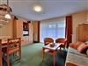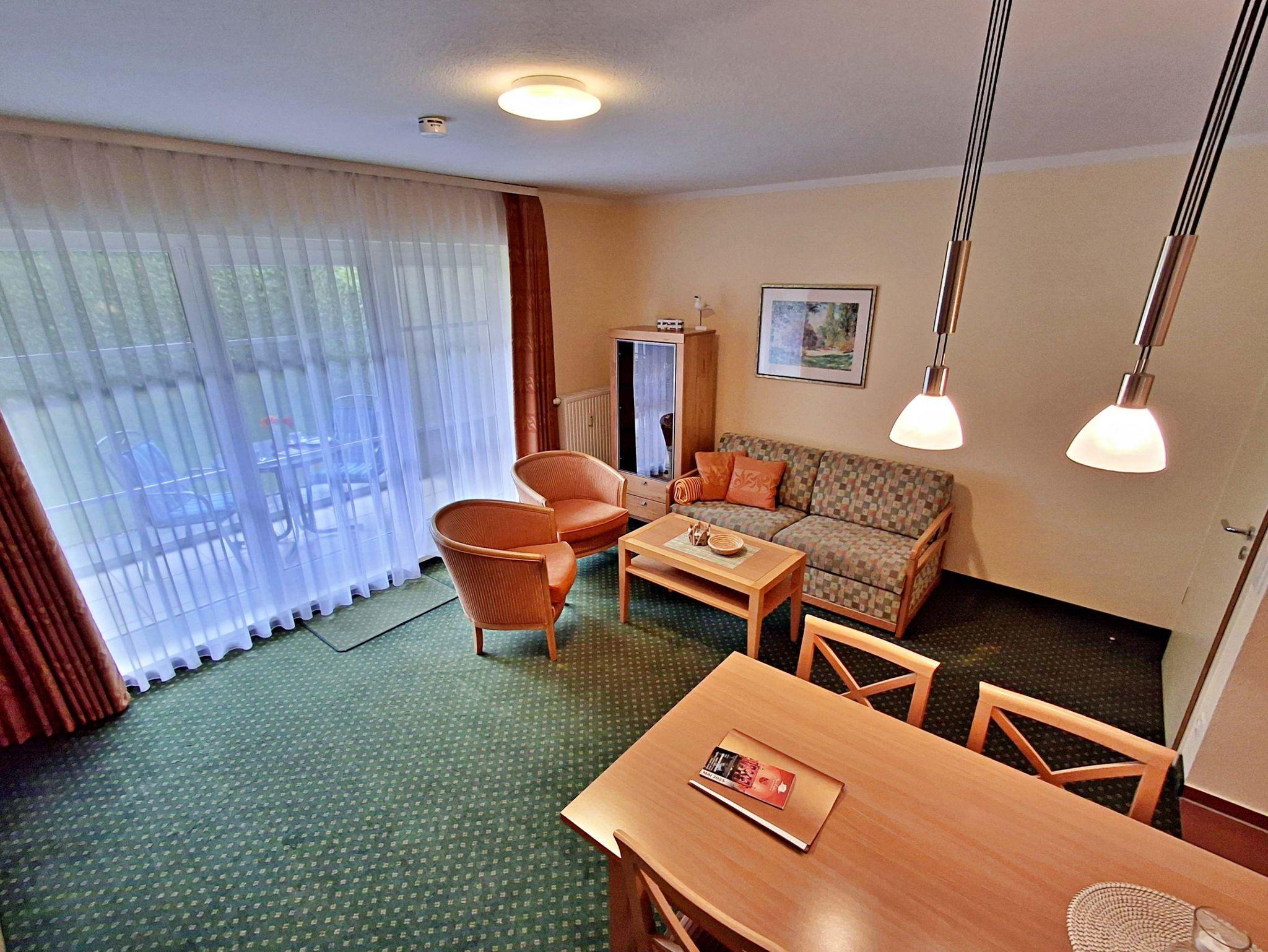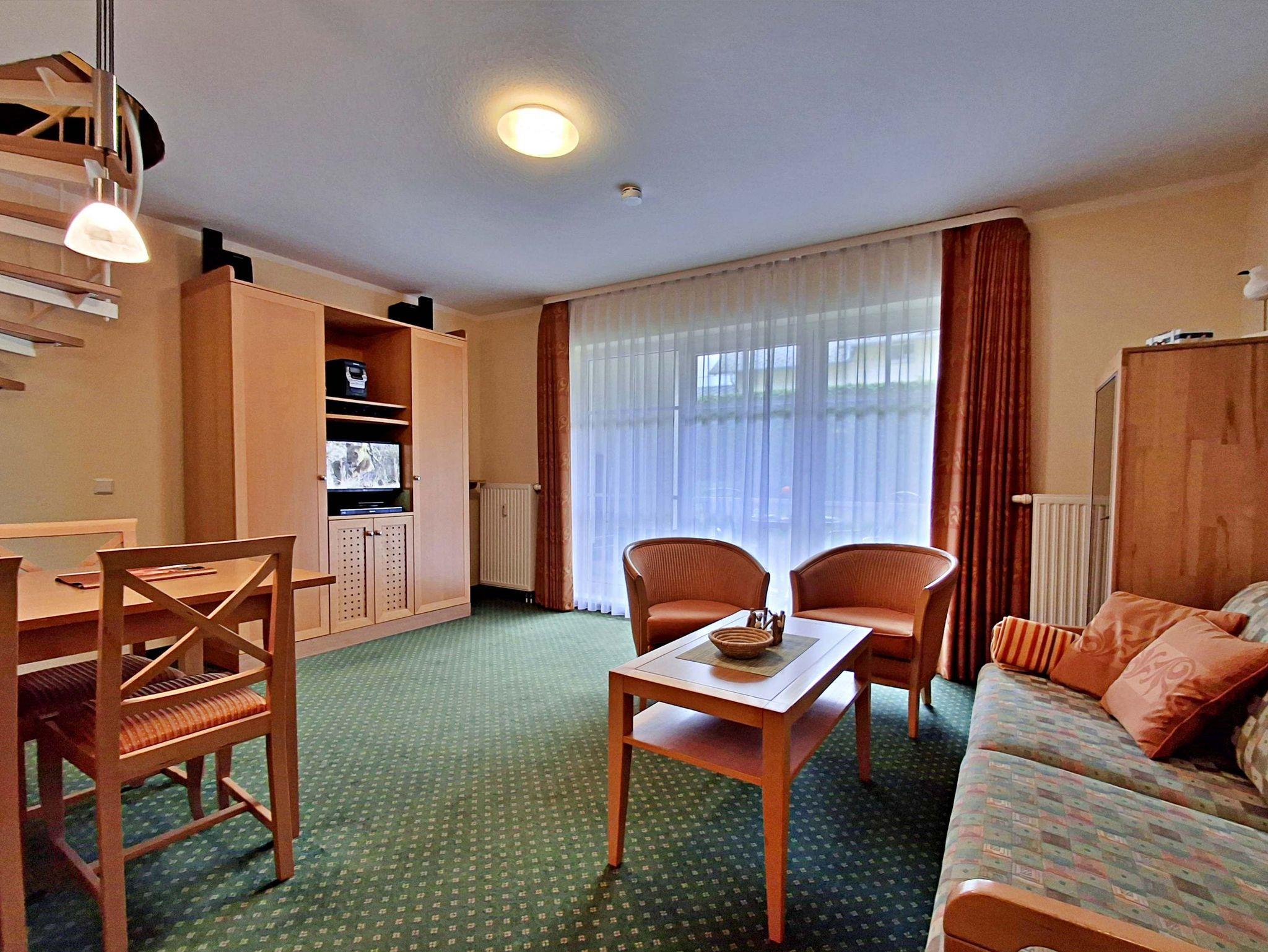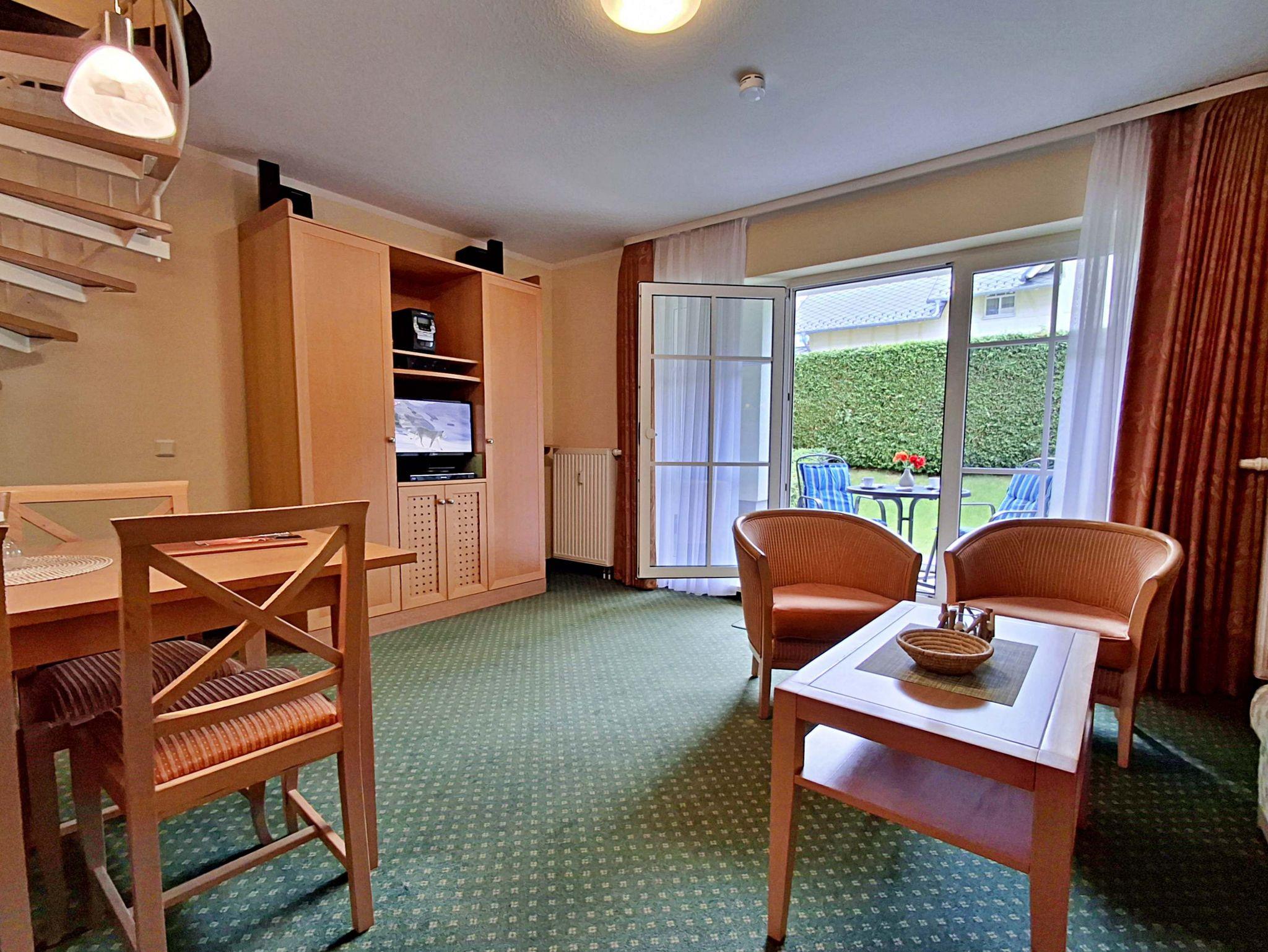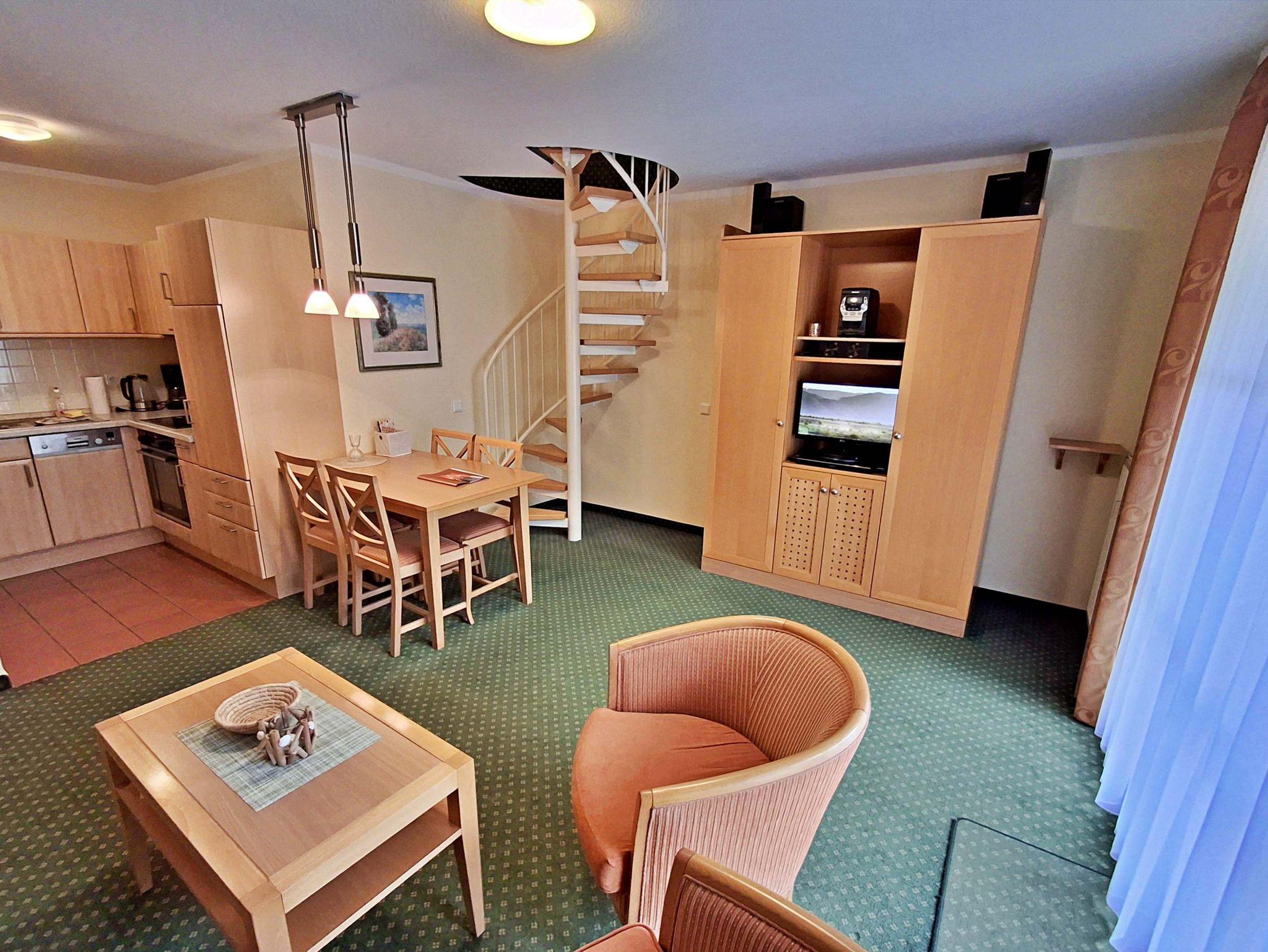 Die komfortabel ausgestattete Wohnung für bis zu 4 Personen (61 qm) erstreckt sich über zwei Etagen (EG und 1.OG). Dies trennt in angenehmer Weise Wohn- und Schlafbereich. Die Wohnung mit Südausrichtung verfügt im Erdgeschoss über ein Wohnzimmer mit Couch, welche auch zum Schlafen geeignet ist, eine Essecke mit 4 Stühlen sowie bequeme Sessel. Für die Unterhaltung sorgt ein Flachbild-TV und HiFi-Anlage. Die Die vollständig ausgestattete Küche mit Ceranherd mit Backofen, Geschirrspülmaschine, Mikrowelle, Kühlschrank mit Gefrierfach, Kaffeemaschine, Wasserkocher und Toaster lässt keine Wünsche offen. Vom Wohnzimmer besteht Zugang zur überdachten Terrasse (Loggia zum Innenhof). Über eine Wendeltreppe gelangen Sie in das 1. OG, wo sich auch das Schlafzimmer mit Doppelbett (2,20 m lang mit offenem Fußende) und zusätzlichem 55 LCD-TV, ein Abstellraum sowie das 2024 vollständig erneuerte Bad mit DU/WC und Kosmetikspiegel. Eine gemütliche Sitzmöglichkeit mit zwei Sesseln und kleinem Tisch komplettiert die Ausstattung der Wohnung. Zusätzlich ist im 1. OG ein zweiter Eingang eingebaut worden, um leichter aus dem großen Glastreppenhaus ins Obergeschoss zu gelangen. Das Internet (W-LAN) ist kostenfrei nutzbar. Ein Kinderbett mit Wäsche (im Elternschlafzimmer) sowie ein Hochstuhl können auf Anfrage gegen eine Gebühr von einmalig 50 € vom Verwalter zur Verfügung gestellt werden.