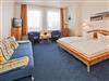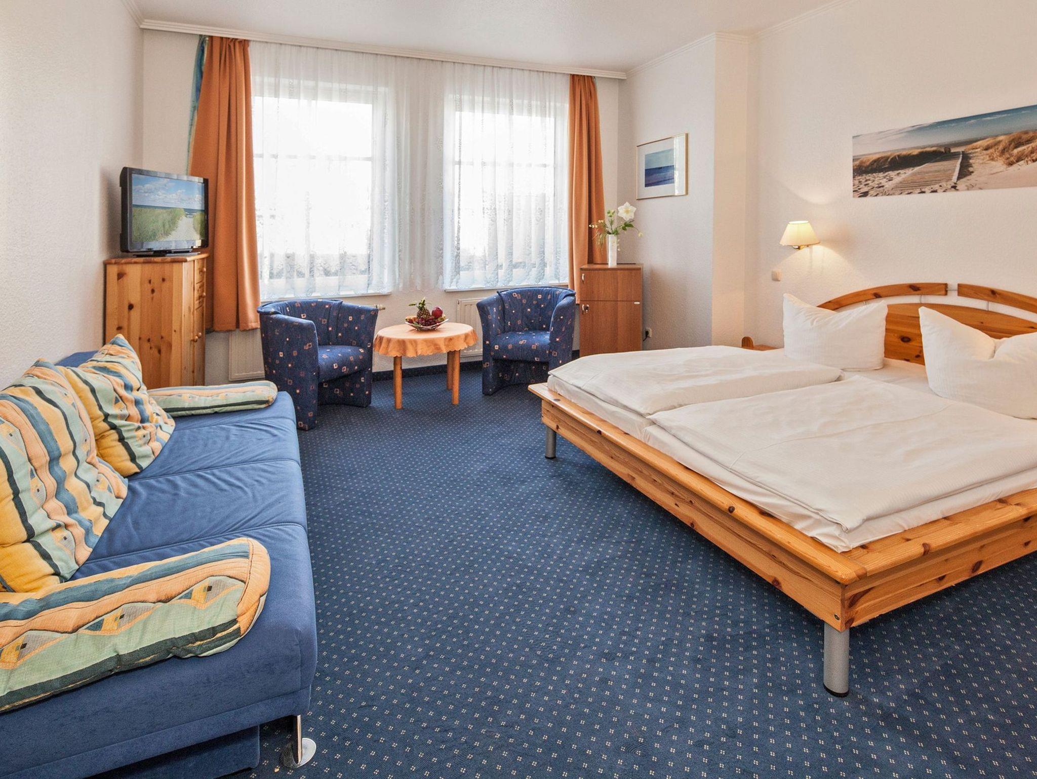 Das modern und komfortabel eingerichtete Ferienzimmer befindet sich im Erdgeschoss im Haus Antje. Ausgestattet ist es mit einem Doppelbett, einer Schlafcouch und einer Sitzmöglichkeit mit Flachbildfernseher sowie einem kleinen Kühlschrank. Bad mit Dusche, Waschtisch und WC.