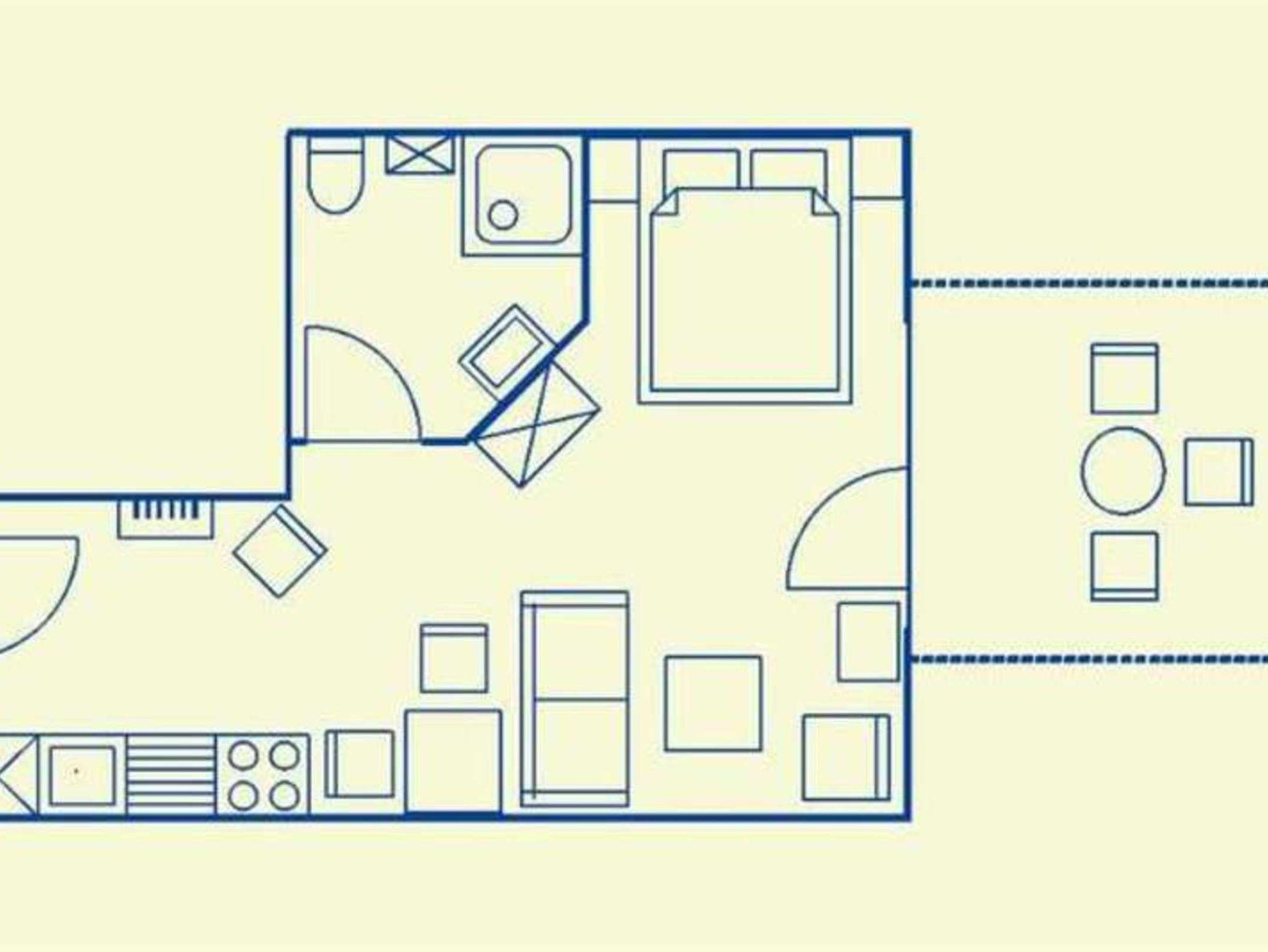 1 komb. Wohn-/Schlafraum, 1 Küchenzeile, 1 Badezimmer mit Dusche