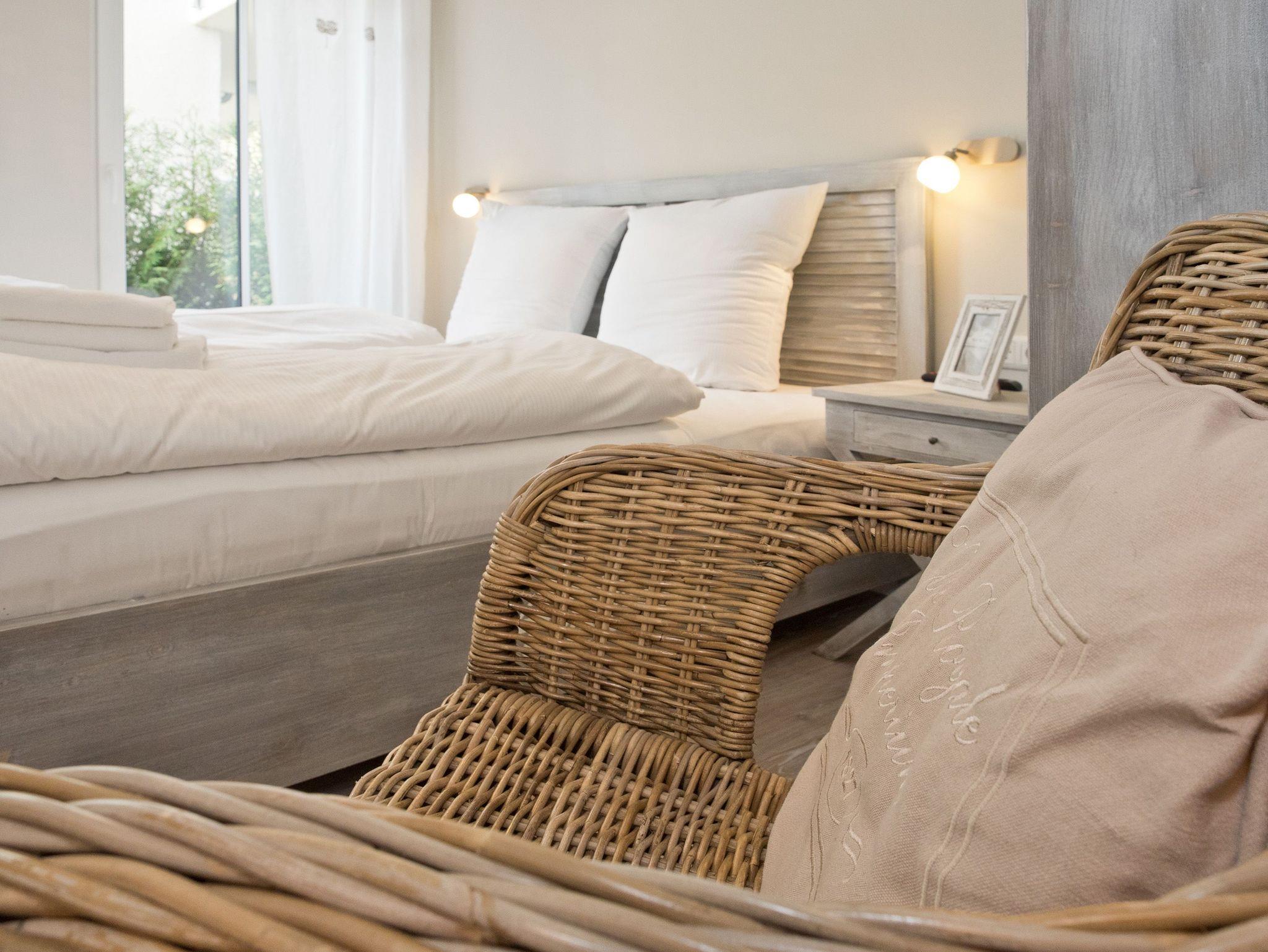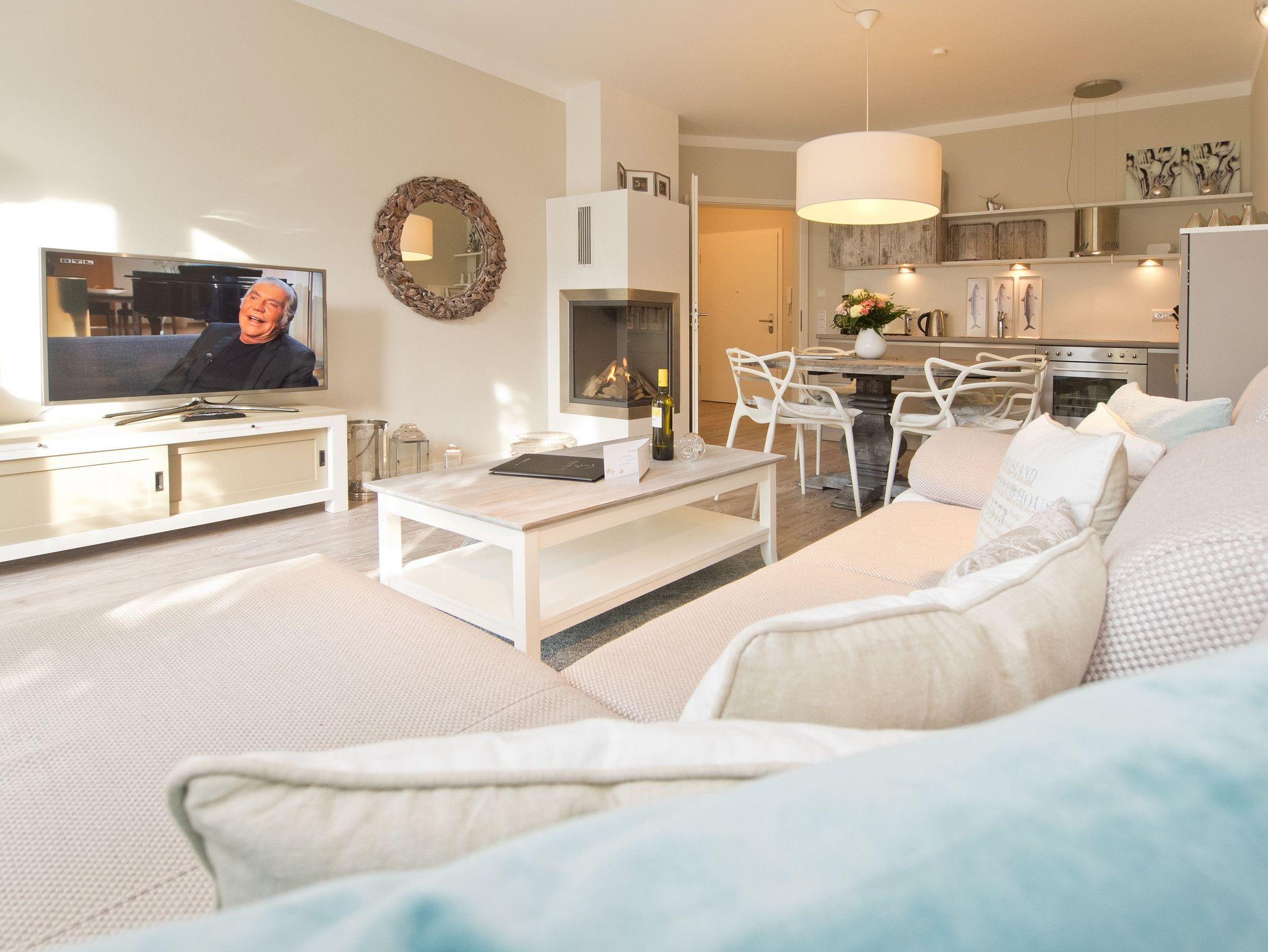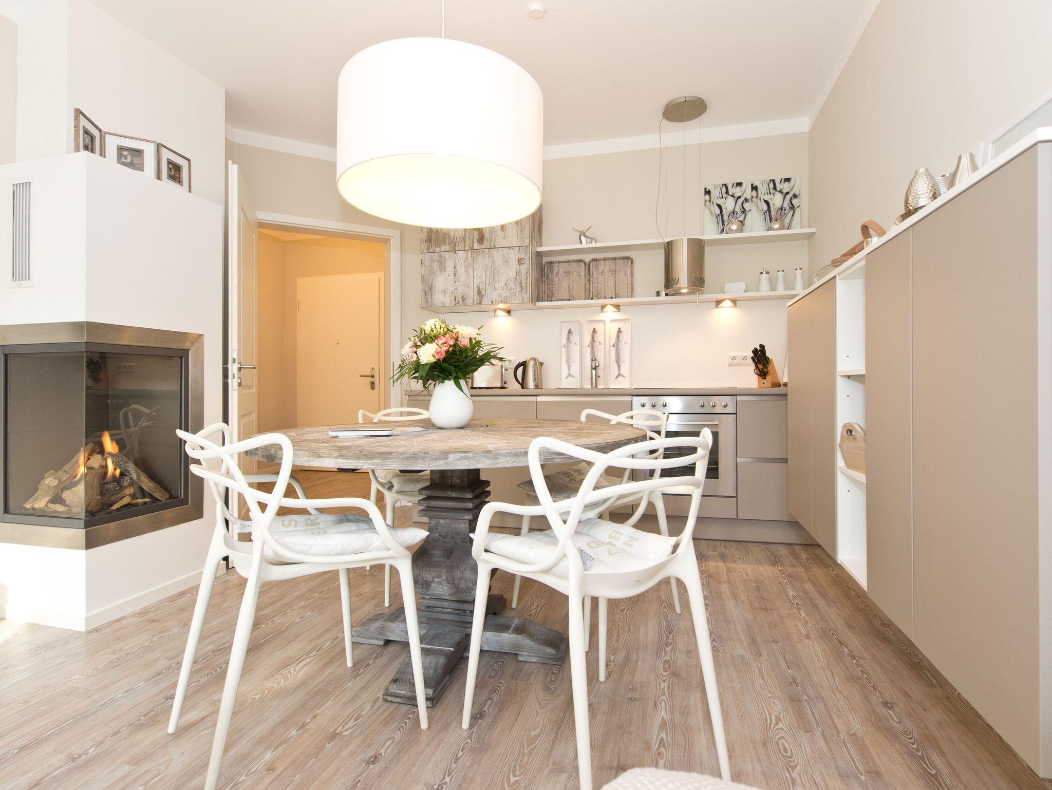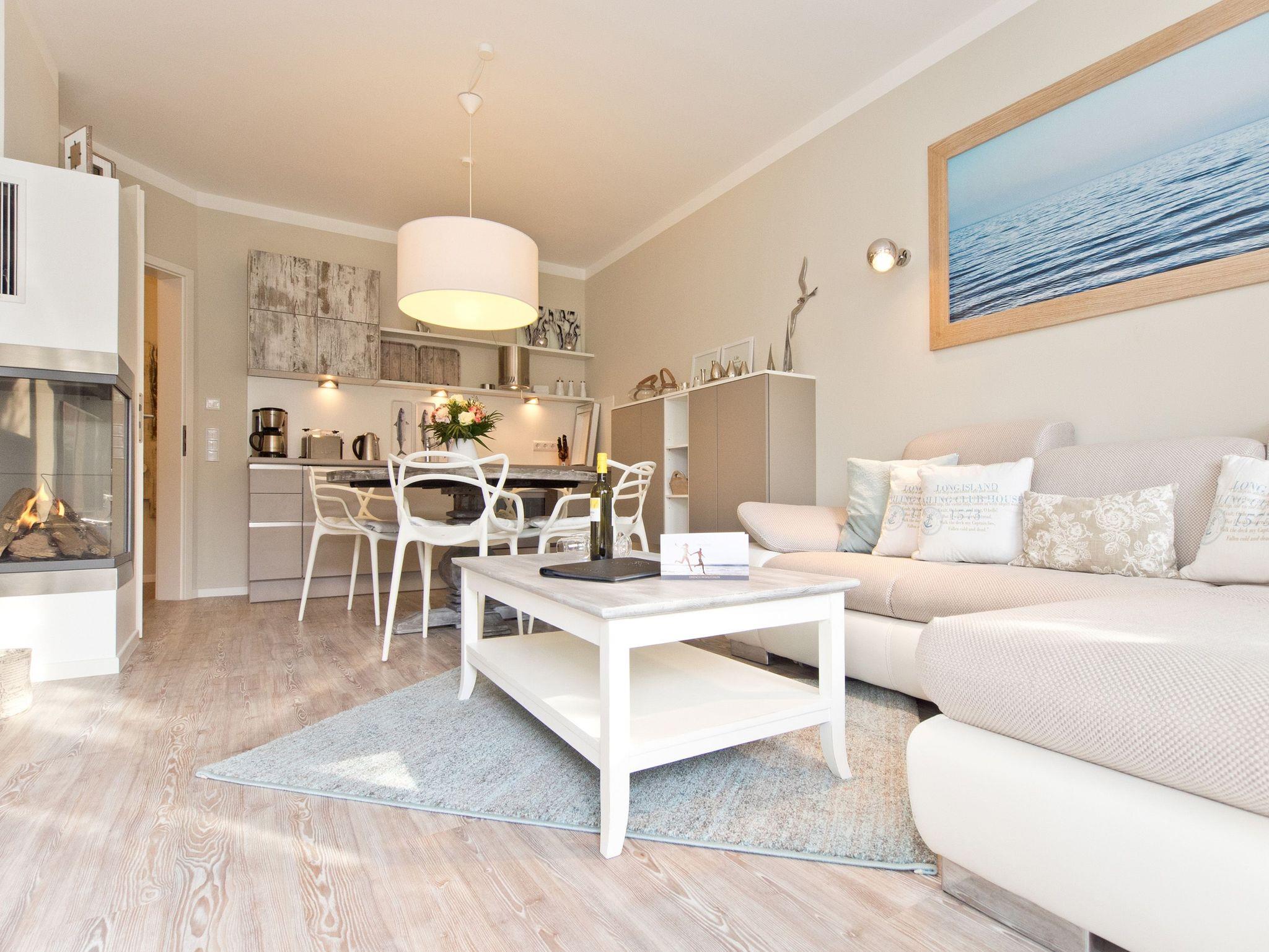 Ankommen und wohlfühlen! Im Erdgeschoss des Hauses erwartet Sie eine wunderschöne 3-Raum-Ferienwohnung (70 qm) im Beachstyle! Helle Farben und Stoffe wurden mit schönen Holzmöbeln kombiniert und durch geschmackvolle Dekorationen liebevoll ergänzt. Ein perfektes Domizil für 4 Personen und ein Kleinkind (bis 3 Jahre im Kinderreisebett). An den Wohnbereich mit bequemer Sitzgruppe, Flat-TV und schönem Gaskamin (per Fernbedienung zu benutzen) schließt sich die offene, komplett ausgestattete Küche mit Essplatz an. Zwei Schlafzimmer mit Doppelbetten und ein Bad mit Echtglasdusche und WC ergänzen die Wohnung. Für Ihren Komfort steht die Erstausstattung Wäsche (Bettwäsche [&] Handtücher) für Sie bereit. Die schöne Westterrasse ist mit Gartenmöbel ausgestattet. Ein PKW-Stellplatz steht Ihnen am Haus zur Verfügung. Das WLAN-Netz ist kostenfrei nutzbar.