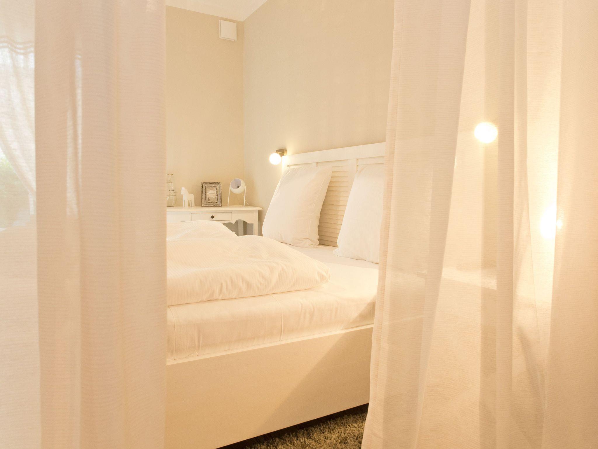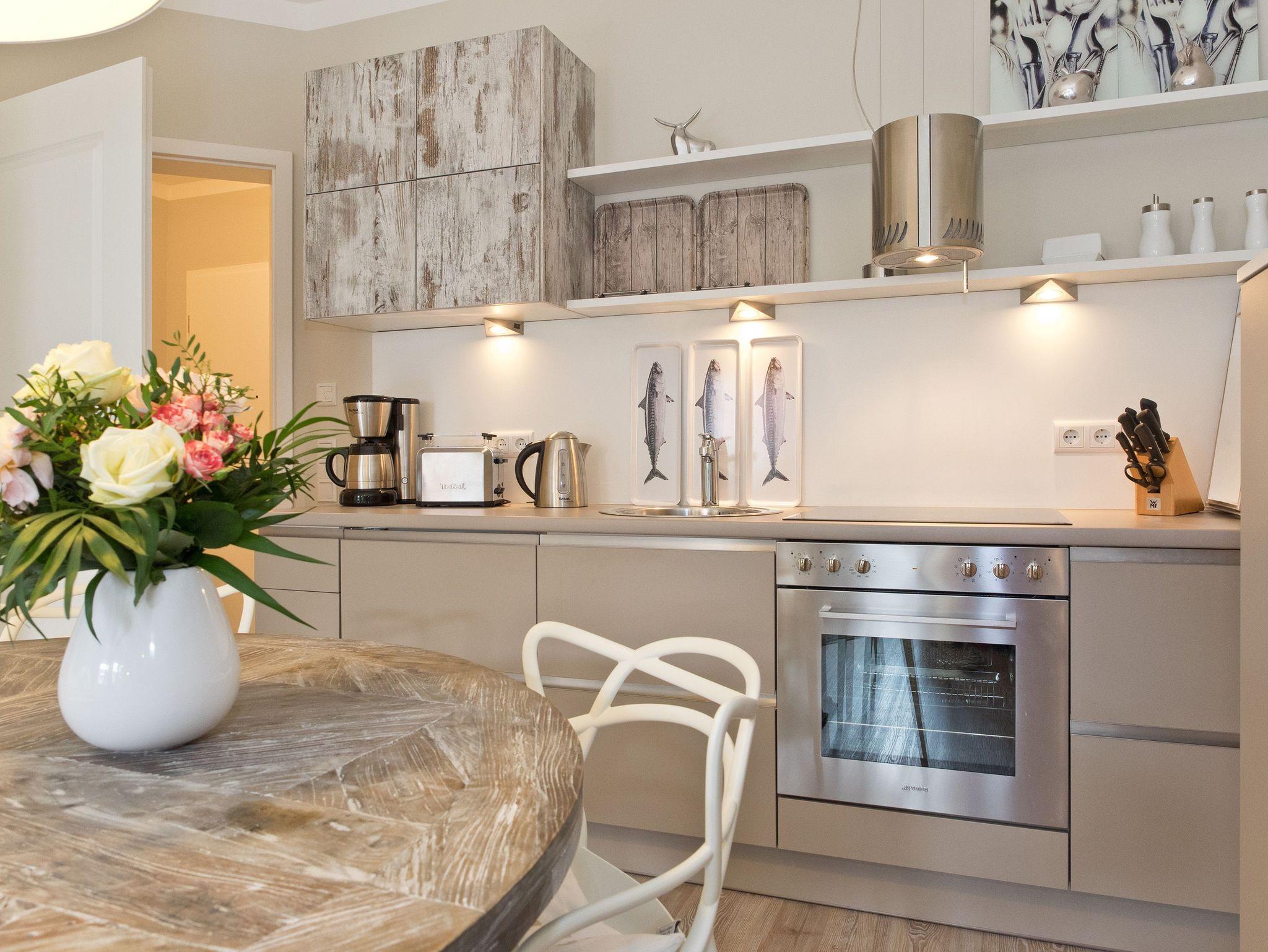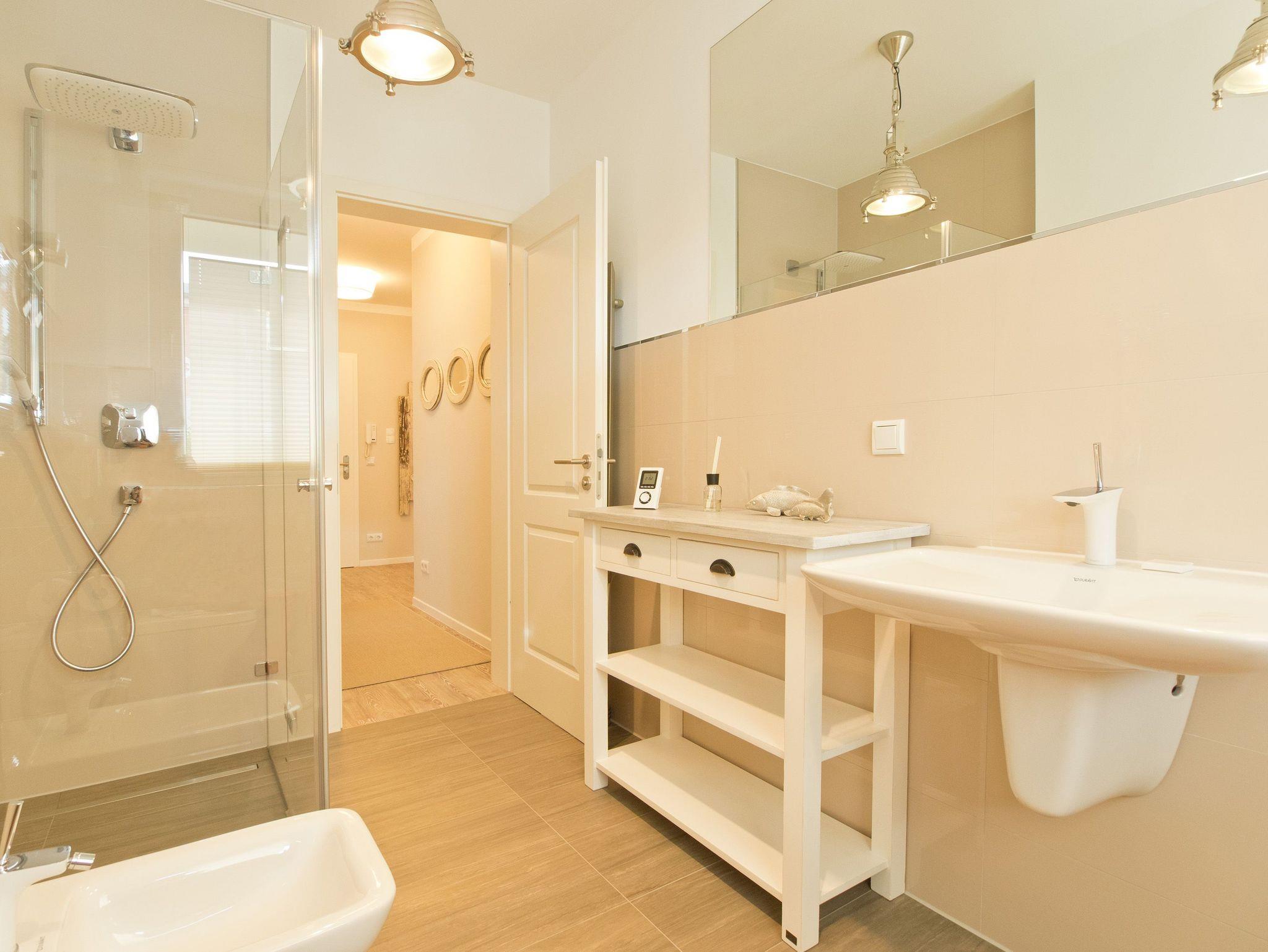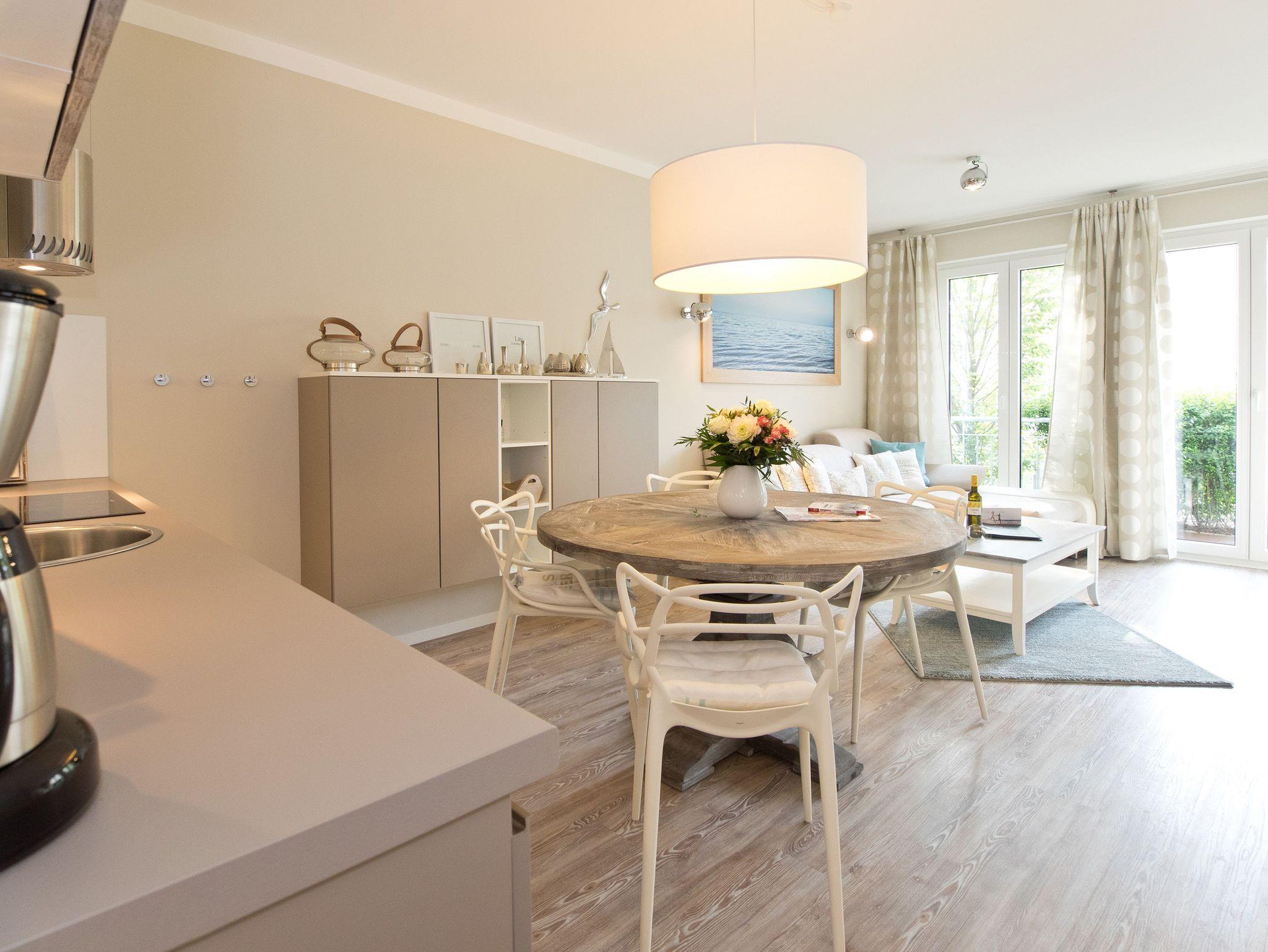 Ankommen und wohlfühlen! Im Erdgeschoss des Hauses erwartet Sie eine wunderschöne 3-Raum-Ferienwohnung (70 qm) im Beachstyle! Helle Farben und Stoffe wurden mit schönen Holzmöbeln kombiniert und durch geschmackvolle Dekorationen liebevoll ergänzt. Ein perfektes Domizil für 4 Personen und ein Kleinkind (bis 3 Jahre im Kinderreisebett). An den Wohnbereich mit bequemer Sitzgruppe, Flat-TV und schönem Gaskamin (per Fernbedienung zu benutzen) schließt sich die offene, komplett ausgestattete Küche mit Essplatz an. Zwei Schlafzimmer mit Doppelbetten und ein Bad mit Echtglasdusche und WC ergänzen die Wohnung. Für Ihren Komfort steht die Erstausstattung Wäsche (Bettwäsche [&] Handtücher) für Sie bereit. Die schöne Westterrasse ist mit Gartenmöbel ausgestattet. Ein PKW-Stellplatz steht Ihnen am Haus zur Verfügung. Das WLAN-Netz ist kostenfrei nutzbar.