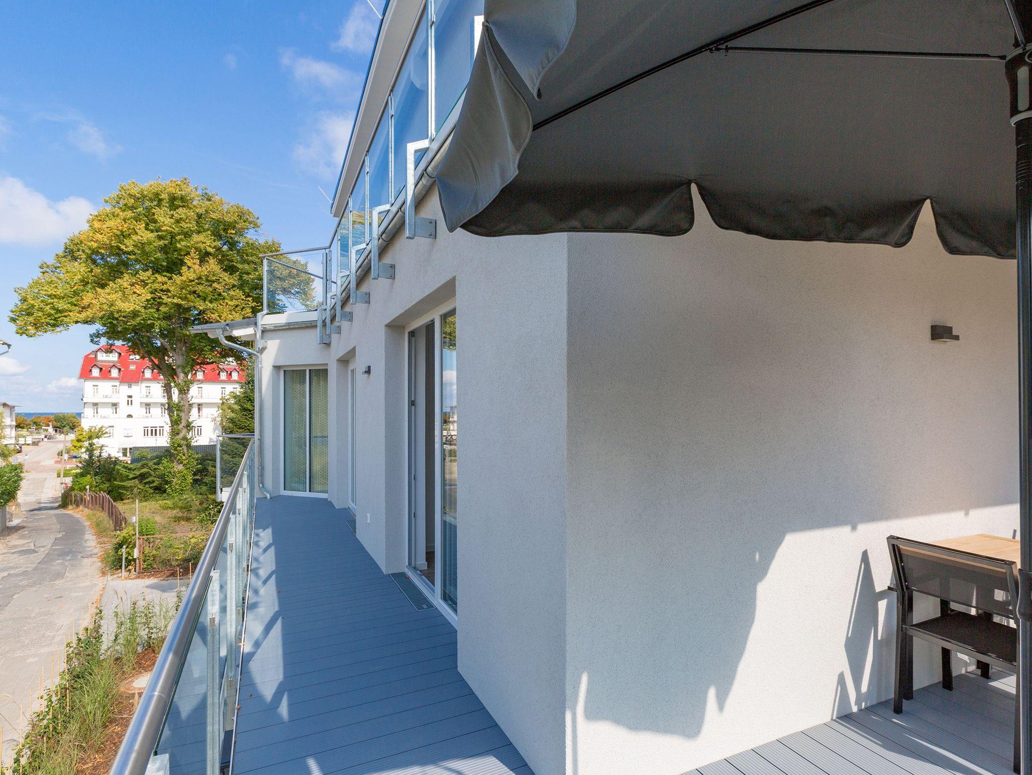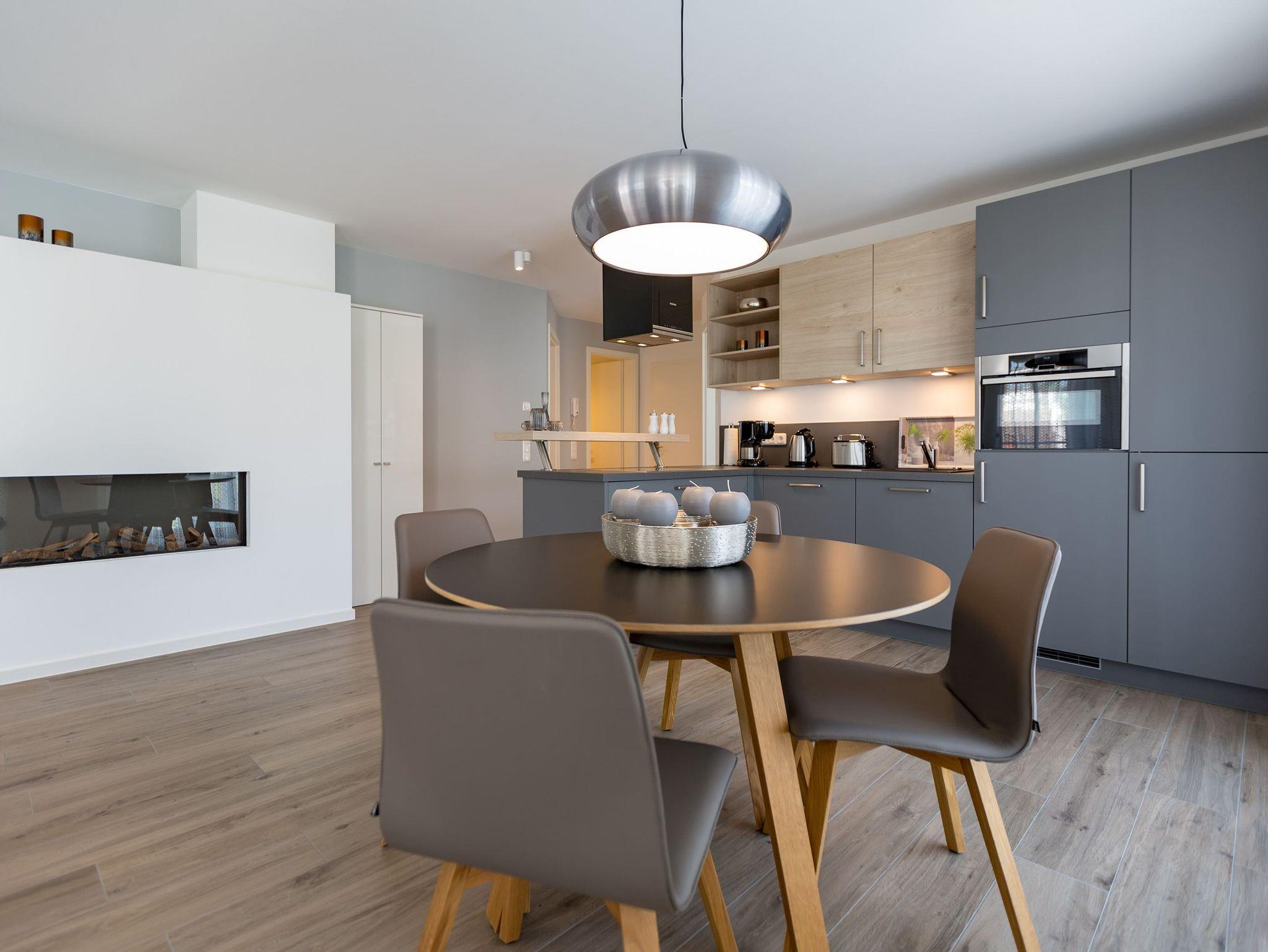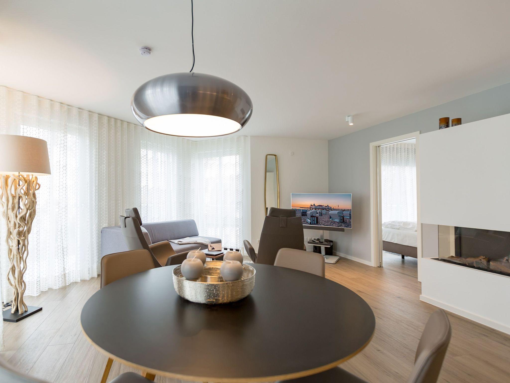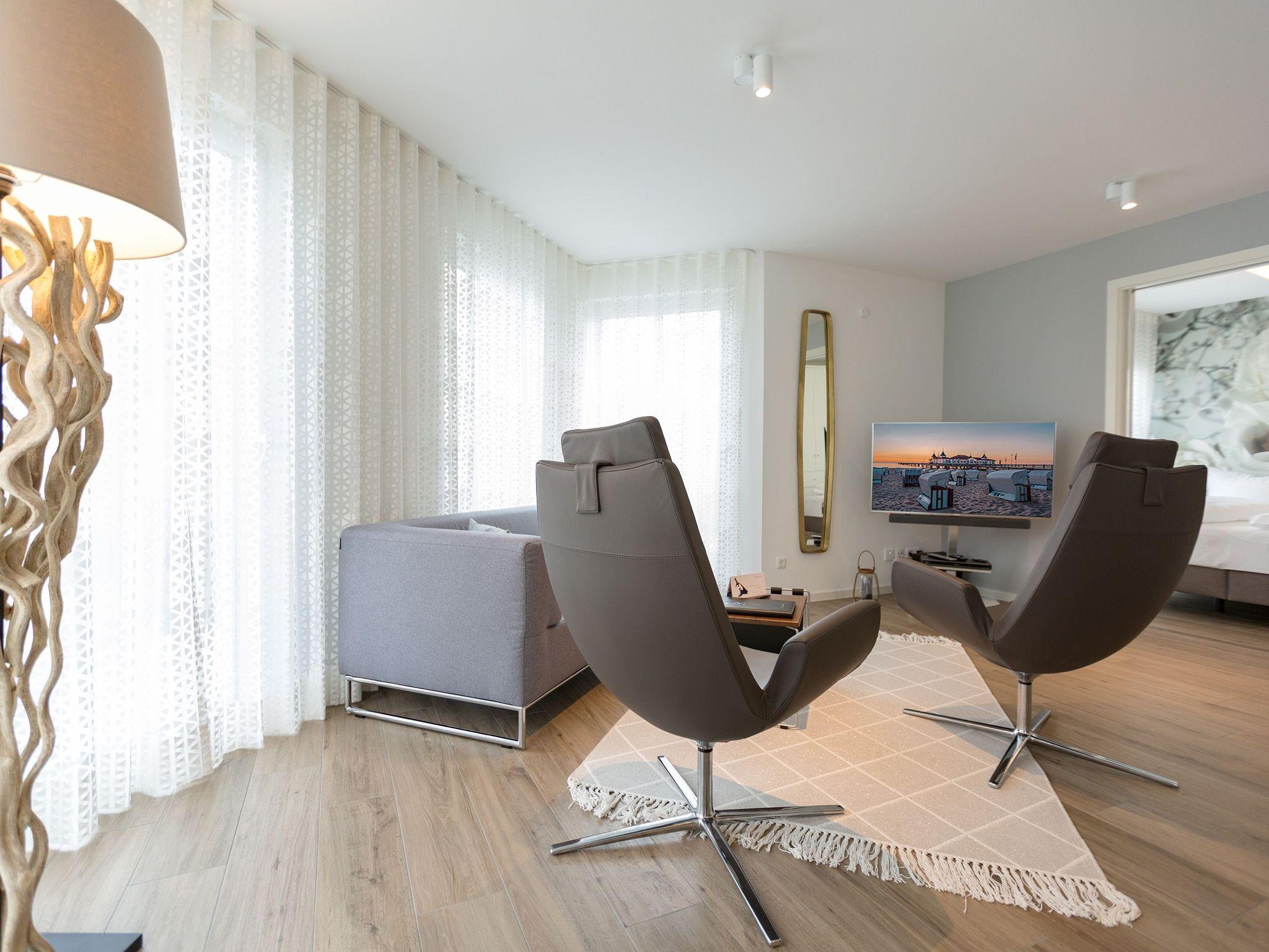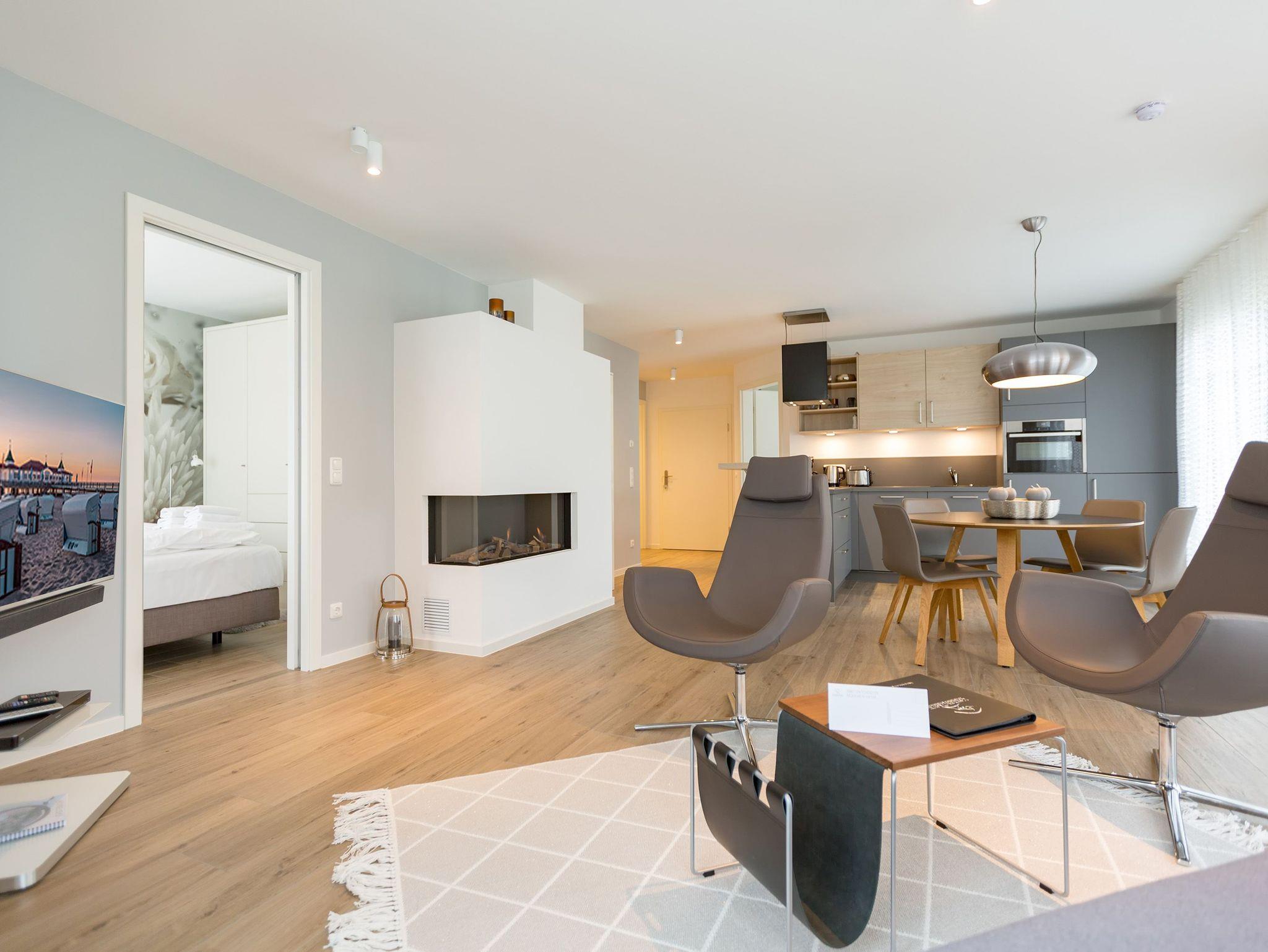 Drei Balkone ? mehr geht nicht an frischer Ostseeluft. Die liegt unmittelbar in Sichtweite. Dieses moderne und stylische Urlaubsparadies verwöhnt seine Gäste mit allem Komfort und macht den Urlaub zu einer exklusiven Ostsee-Auszeit. Meeresrauschen inklusive. Genießen Sie die Sonne und die frische Brise auf einem der Balkone (1 x 2,5 Quadratmeter Richtung Südost [&] 1 x 5,2 Quadratmeter Richtung Nord [&] 1 x 20,7 Quadratmeter Richtung Nordwest), die umlaufend miteinander verbunden sind. Relaxen Sie auf der bequemen Couch im großen, offenen und lichtdurchfluteten Wohnzimmer mit Essplatz und Highend-Küche. Hier bleiben keine Wünsche offen. Ein wunderschöner Gas-Kamin sorgt an kühlen Abenden für eine kuschelige Atmosphäre auf Knopfdruck. Der große Flat-TV ist ein echter Entertainer. In den Beetle-Ledersesseln fühlen Sie sich wie der Captain Ihres eigenen Raumschiffes. Sie bieten höchsten Sitzkomfort in Kombination mit anspruchsvollem Design. Die große Stehlampe aus Treibholz verleiht dem Appartement, in dem vier Personen und ein Kleinkind (im Kinderreisebett) wunderbar entspannen können, einen echt maritimen Charakter. Nordish by nature und ganz besonders elegant ist der schöne Essplatz mit Tisch und vier Stühlen. Die offene Küche hat viel Platz und ist mit allen nötigen Geräten und edlem Asa-Geschirr ausgestattet. Auf den 68 Quadratmetern befinden sich zwei gemütliche Schlafzimmer mit Boxspringdoppelbetten (1,80 m x 2,00 m) für höchsten Schlafkomfort, großen und geräumigen Schränken und jeweils einem Flat-TV. Lieben Sie das wunderbar entspannende Gefühl nach einer Sauna? Dann können Sie sich in dieser Wohnung auf Ihre eigene kleine Wellness-Oase freuen. Denn das Badezimmer wartet mit einer Finnischen Sauna auf. Erfrischen Sie sich anschließend unter der tropischen Regendusche. Im Bad gibt es außerdem einen Waschtisch und ein WC. Ein separates Gäste-WC geht vom Wohnungsflur ab. Alles, was stresst können Sie hier getrost draußen lassen. Darum haben wir für Sie die Betten bereits bei Anreise bezogen und Handtücher liegen bereit. Das WLAN ist kostenfrei. Am Haus gibt es einen überdachten (max. Höhe 2,10 m) Pkw-Stellplatz. Zur Wohnung gehört zudem ein eigener Fahrradabstellraum.