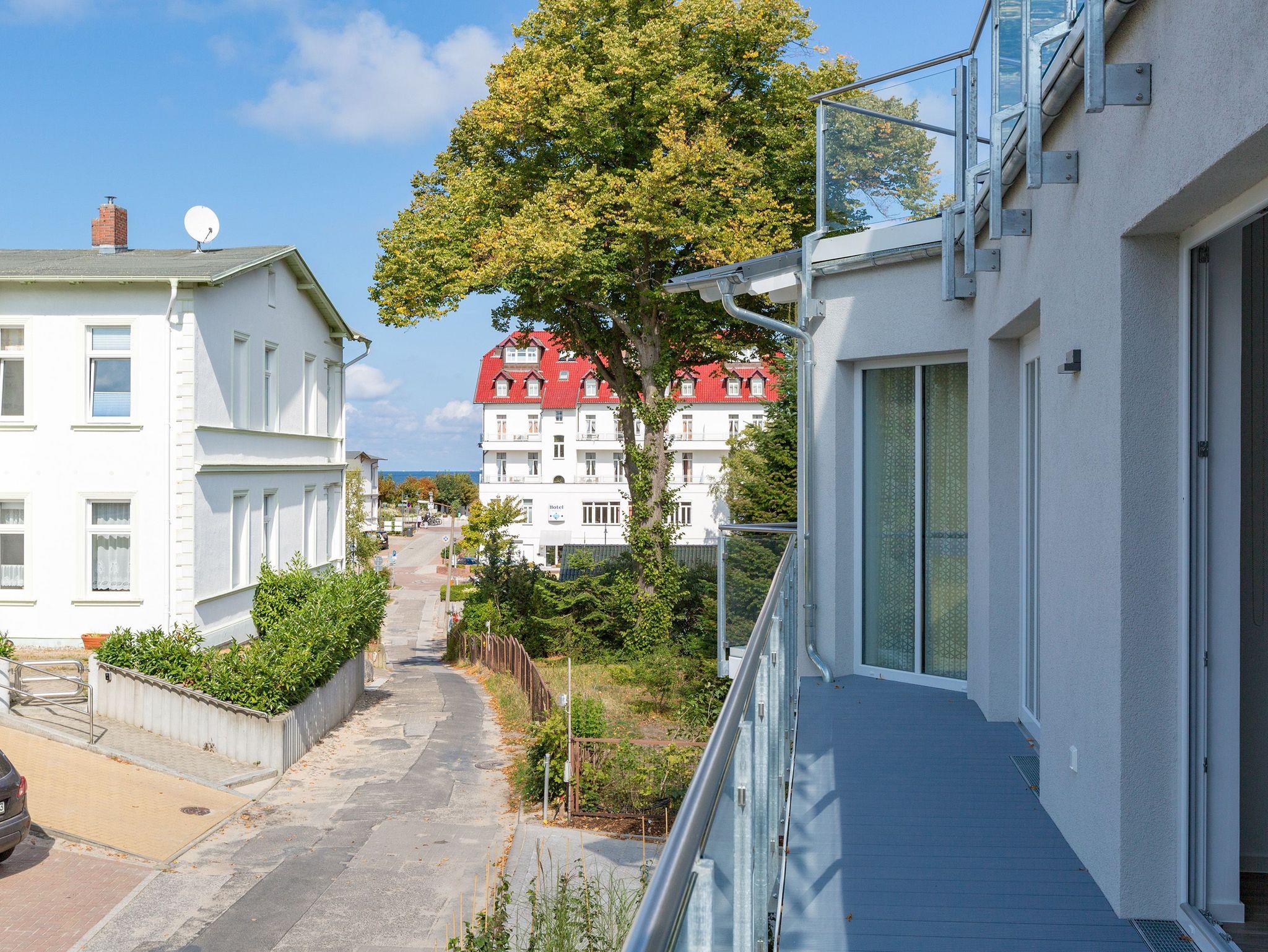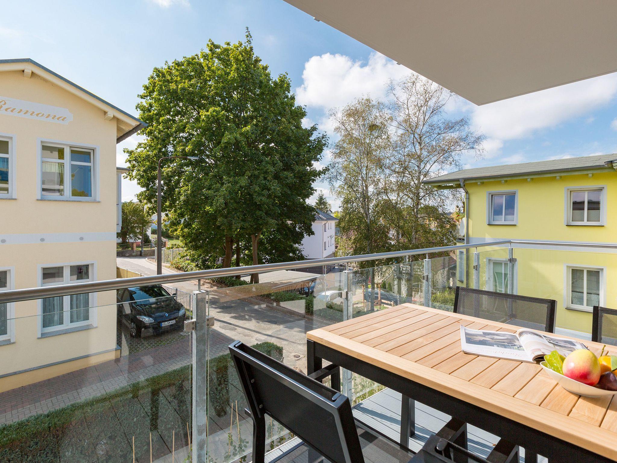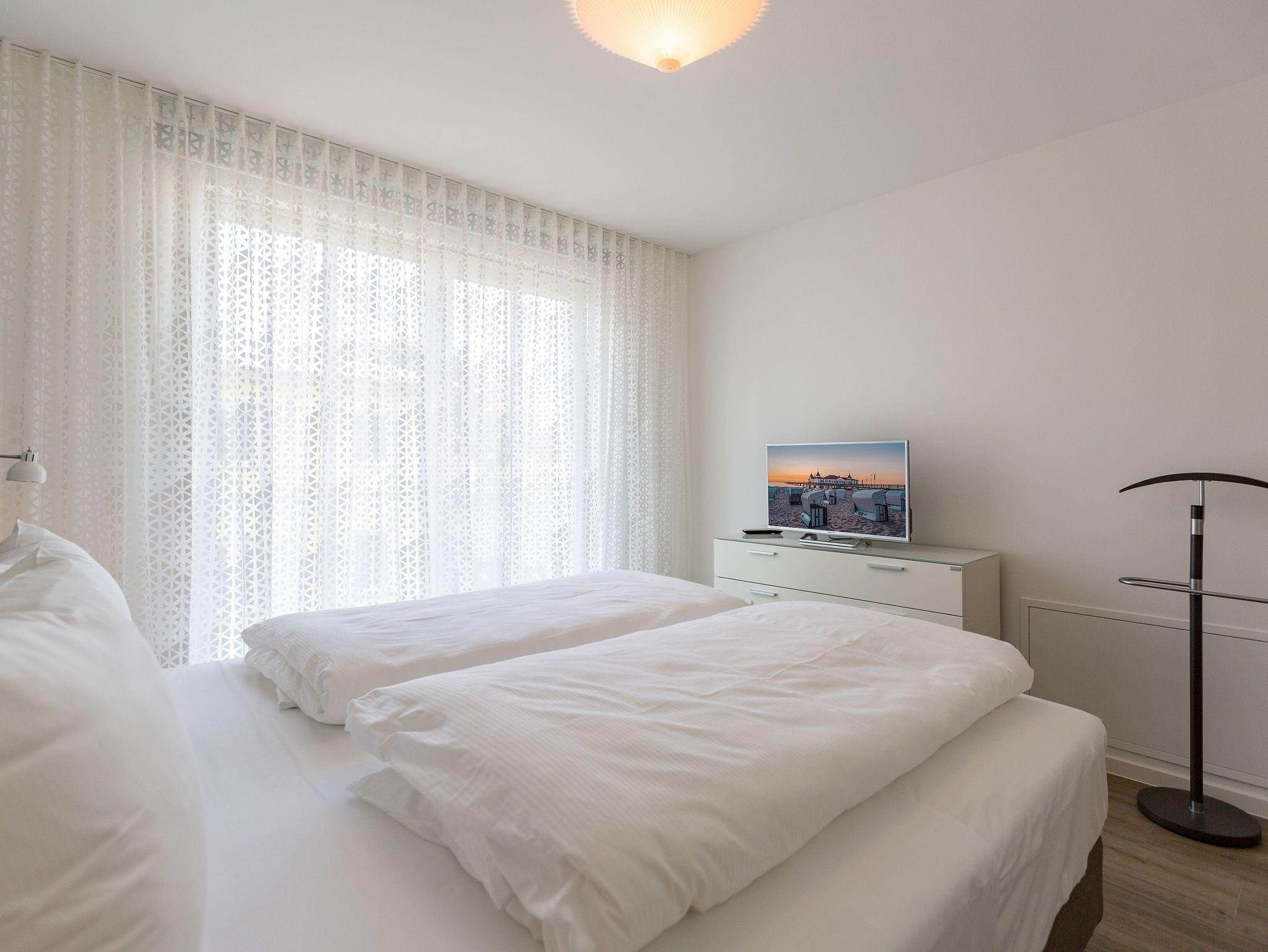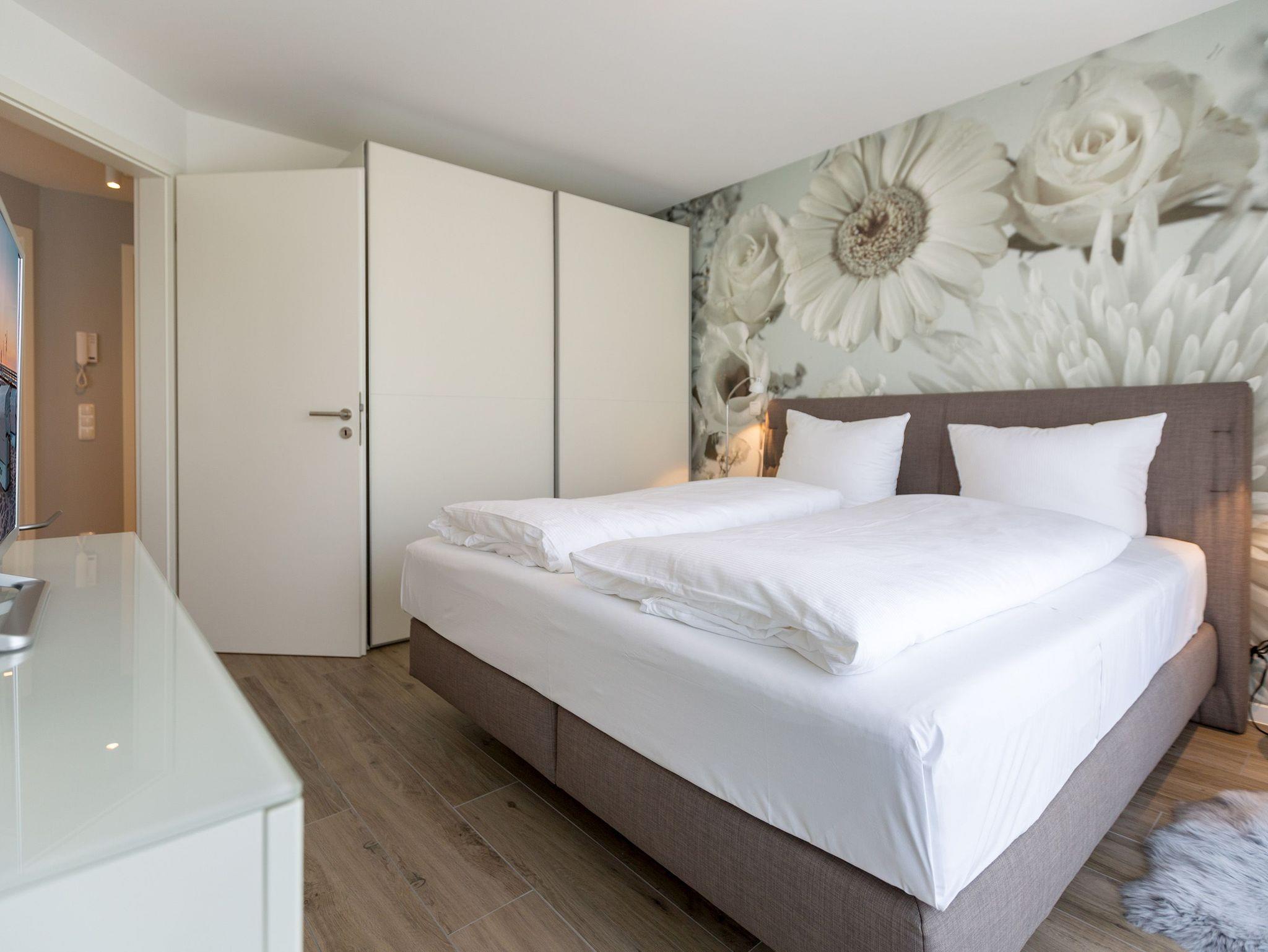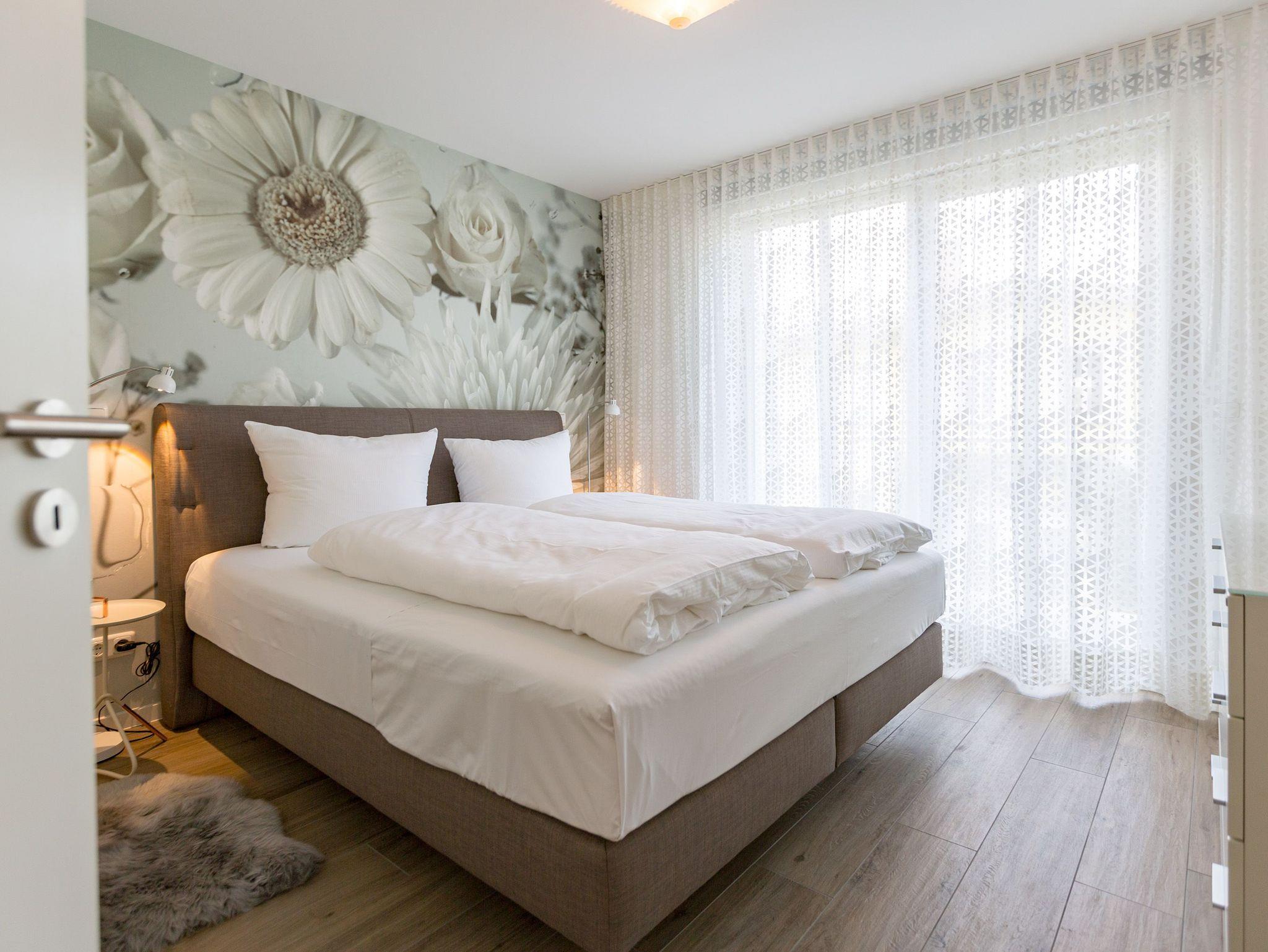 Drei Balkone ? mehr geht nicht an frischer Ostseeluft. Die liegt unmittelbar in Sichtweite. Dieses moderne und stylische Urlaubsparadies verwöhnt seine Gäste mit allem Komfort und macht den Urlaub zu einer exklusiven Ostsee-Auszeit. Meeresrauschen inklusive. Genießen Sie die Sonne und die frische Brise auf einem der Balkone (1 x 2,5 Quadratmeter Richtung Südost [&] 1 x 5,2 Quadratmeter Richtung Nord [&] 1 x 20,7 Quadratmeter Richtung Nordwest), die umlaufend miteinander verbunden sind. Relaxen Sie auf der bequemen Couch im großen, offenen und lichtdurchfluteten Wohnzimmer mit Essplatz und Highend-Küche. Hier bleiben keine Wünsche offen. Ein wunderschöner Gas-Kamin sorgt an kühlen Abenden für eine kuschelige Atmosphäre auf Knopfdruck. Der große Flat-TV ist ein echter Entertainer. In den Beetle-Ledersesseln fühlen Sie sich wie der Captain Ihres eigenen Raumschiffes. Sie bieten höchsten Sitzkomfort in Kombination mit anspruchsvollem Design. Die große Stehlampe aus Treibholz verleiht dem Appartement, in dem vier Personen und ein Kleinkind (im Kinderreisebett) wunderbar entspannen können, einen echt maritimen Charakter. Nordish by nature und ganz besonders elegant ist der schöne Essplatz mit Tisch und vier Stühlen. Die offene Küche hat viel Platz und ist mit allen nötigen Geräten und edlem Asa-Geschirr ausgestattet. Auf den 68 Quadratmetern befinden sich zwei gemütliche Schlafzimmer mit Boxspringdoppelbetten (1,80 m x 2,00 m) für höchsten Schlafkomfort, großen und geräumigen Schränken und jeweils einem Flat-TV. Lieben Sie das wunderbar entspannende Gefühl nach einer Sauna? Dann können Sie sich in dieser Wohnung auf Ihre eigene kleine Wellness-Oase freuen. Denn das Badezimmer wartet mit einer Finnischen Sauna auf. Erfrischen Sie sich anschließend unter der tropischen Regendusche. Im Bad gibt es außerdem einen Waschtisch und ein WC. Ein separates Gäste-WC geht vom Wohnungsflur ab. Alles, was stresst können Sie hier getrost draußen lassen. Darum haben wir für Sie die Betten bereits bei Anreise bezogen und Handtücher liegen bereit. Das WLAN ist kostenfrei. Am Haus gibt es einen überdachten (max. Höhe 2,10 m) Pkw-Stellplatz. Zur Wohnung gehört zudem ein eigener Fahrradabstellraum.