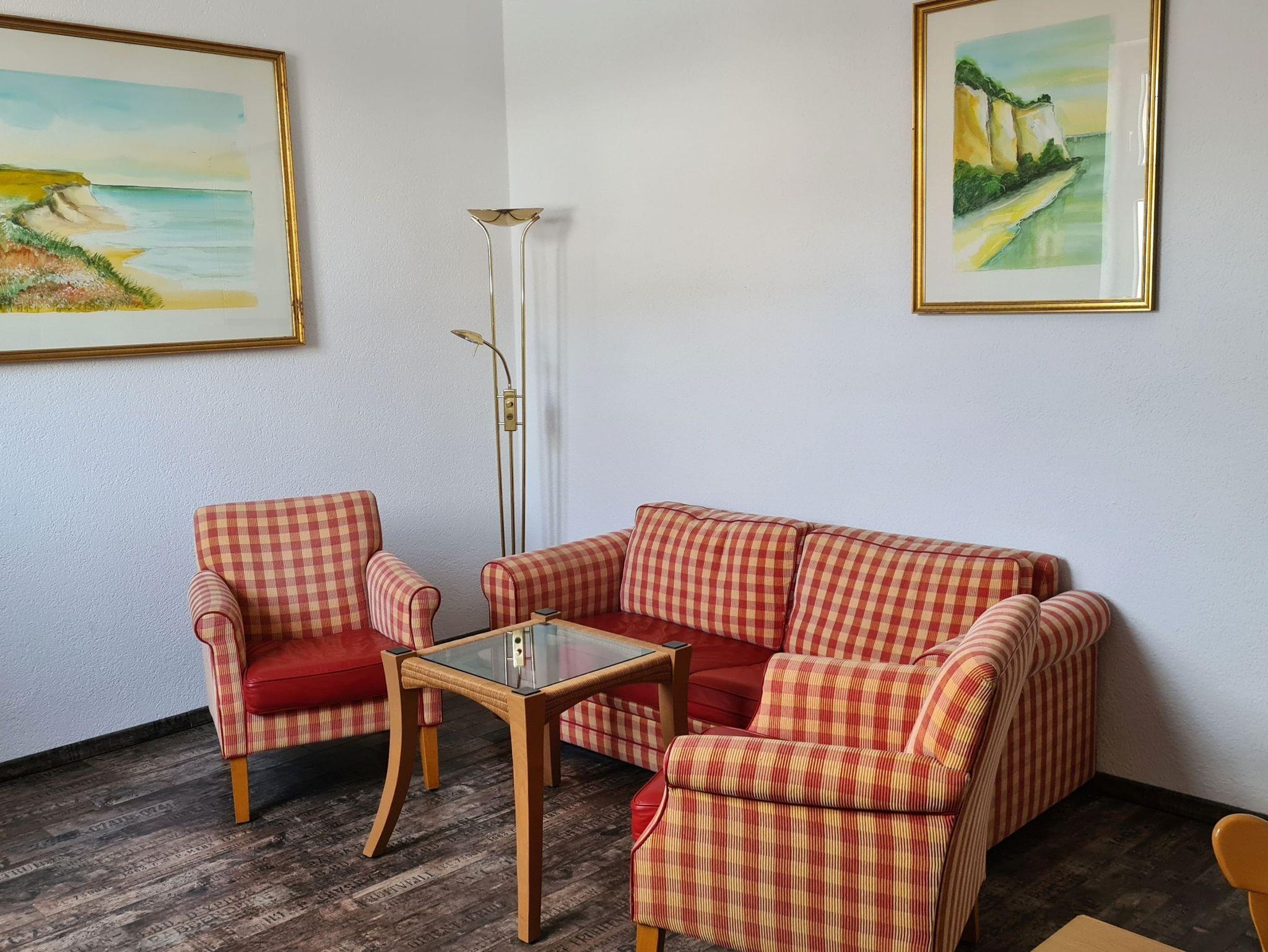 Die 61 qm große Ferienwohnung befindet sich im Obergeschoss und ist mit einem Wohnzimmer mit Sitzeck und TV und einer kleinen Küchenzeile mit Kühlschrank und Gefriermöglichkeit, 2-Platten-Ceranherd, Spülmaschine etc ausgestattet. Das Schlafzimmer verfügt über ein Doppelbett und einem Etagenbett. Bad mit Dusche und WC.