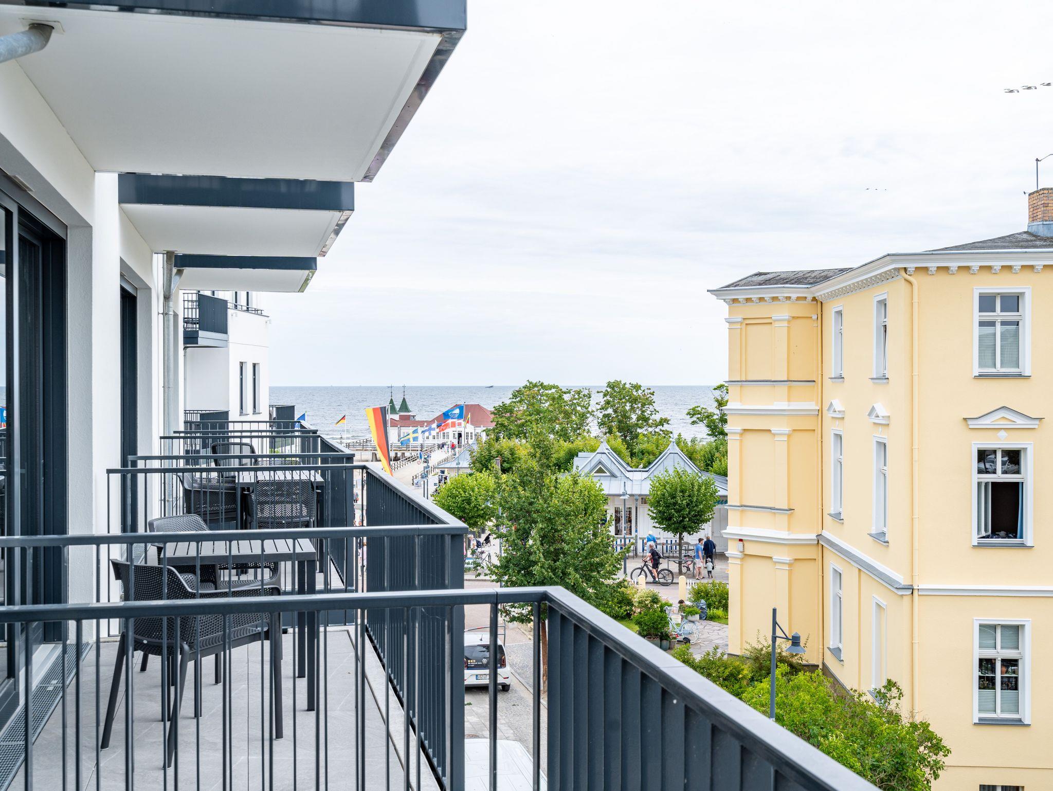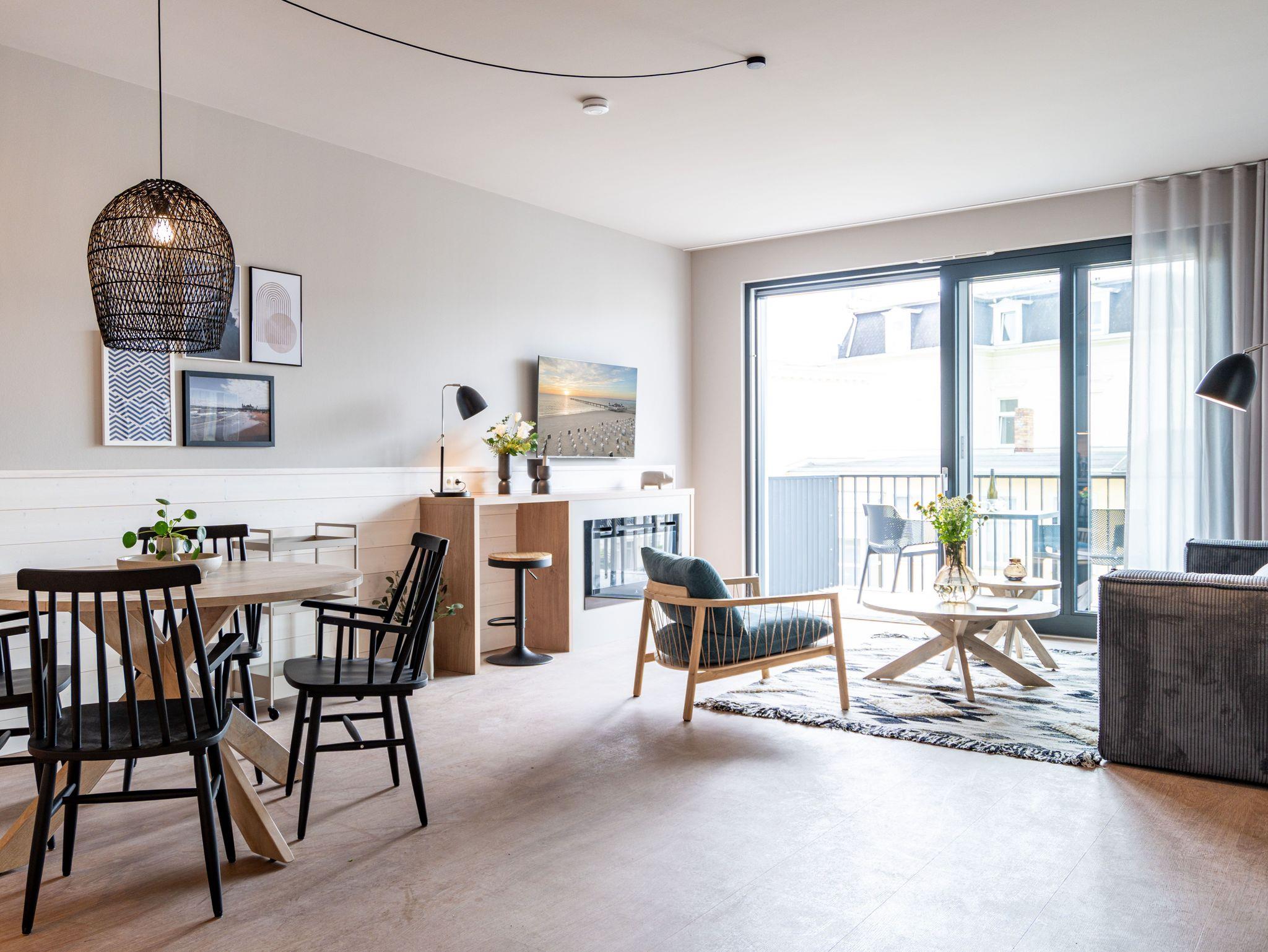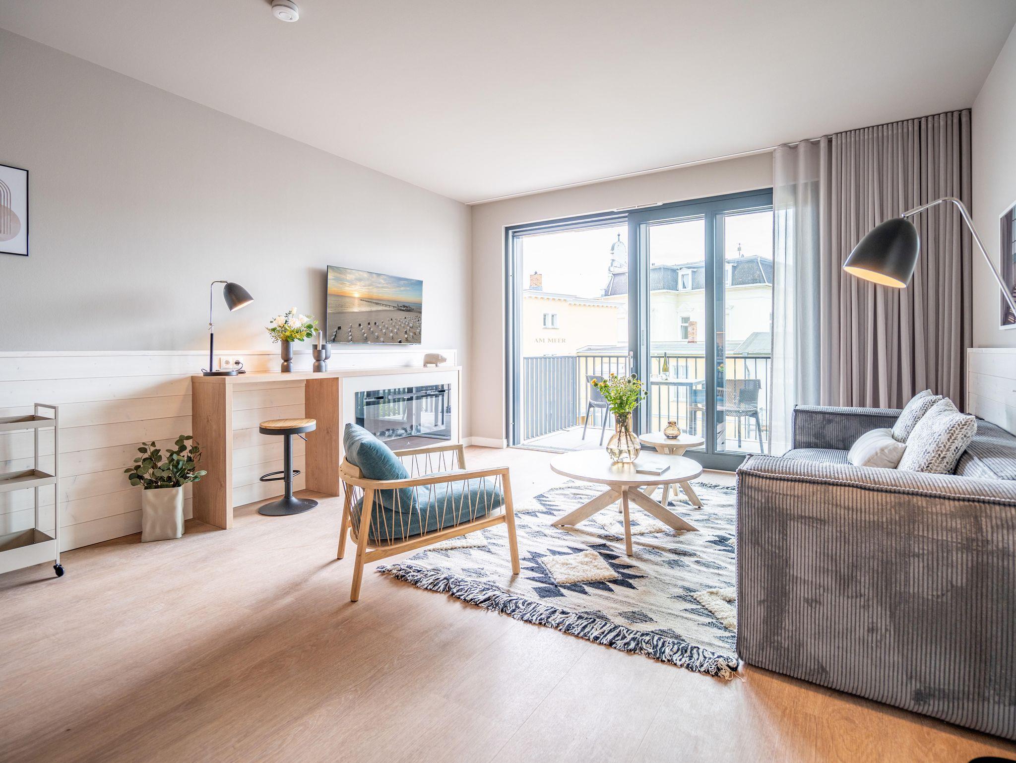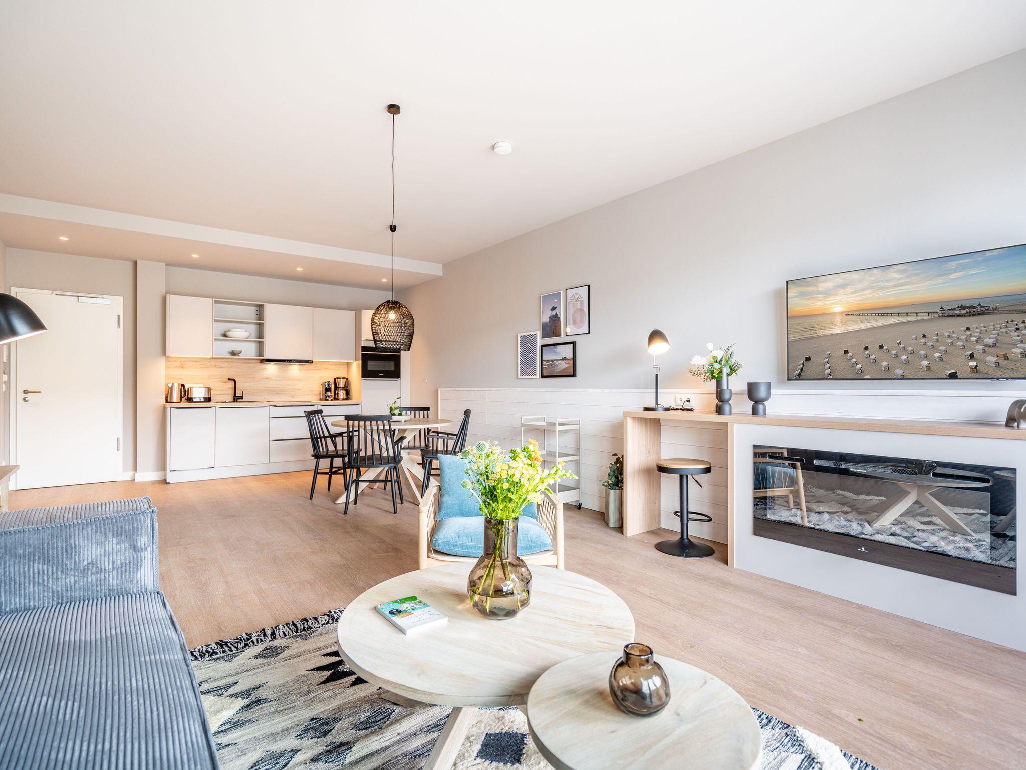 Direkt an der Ostsee mit Blick aufs Wasser ? mehr Meer geht nicht. Diese stilvolle 2-Raum-Wohnung B 2.3 im zweiten Obergeschoss der Strandterrasse ist mit ihren 77 Quadratmeter ein ideales Urlaubsparadies für bis zu 2 Personen und 1 Kleinkind im Babybett. Hier können Sie gleich von zwei Balkonen die Ahlbecker Seebrücke und die dahinter liegende Ostsee genießen. Dazu bietet das Appartement alle Annehmlichkeiten, die Sie sich wünschen. Das großzügige Wohn-Esszimmer mit der integrierten, offenen Küche ist ein kleines Wohlfühlreich der Extraklasse. Komfortable und stylische Möbel im skandinavischen Design sorgen dafür, dass Sie sich hier rundum geborgen fühlen. Zum ausgiebigen Entspannen vor dem Elektrokamin (ohne Wärmeabgabe) eignet sich das tolle Sofa oder der Sessel bestens. Filmabende werden dank des großen Flat-TV (50 Zoll) zu Heimkinoerlebnissen. Ein gemütlicher Essplatz für 4 Personen lädt zum Verweilen ein, während eine Arbeitsstation den Raum funktional ergänzt. Die Küchenzeile ist mit allem ausgestattet, was man zum Kochen und Zubereiten der Mahlzeiten brauchen kann. Dazu gehören moderne Elektrogeräte wie ein Backofen, ein 3-Platten-Induktionsherd oder eine Nespresso-Kapselmaschine. Der Zugang zum ersten Süd-Ost-Balkon bietet einen herrlichen Ausblick und ist mit einem Gartentisch und 2 Stühlen ausgestattet. Auf den zweiten Süd-Ost-Balkon können Sie vom Schlafzimmer aus hinaustreten. Auf der dortigen Gartenliege können Sie sich wunderbar an der frischen Brise erfreuen, die vom Meer herüberweht. Das Schlafzimmer verfügt über ein großes Boxspringdoppelbett (2,00m x 2,00m), ein festes Babybett, einen großen Kleiderschrank und einen Flat-TV (50 Zoll). Ihr Badezimmer wird an ungemütlichen Tagen zu einer kleinen Wellnessoase. Denn es verfügt neben der Dusche, dem Waschtisch und dem WC über eine Infrarotsaunakabine, die Auszeitabende in kuschelige Mußestunden verwandelt. In der Tiefgarage gehört zu Ihrer Wohnung ein PKW-Stellplatz. Herzlich Willkommen in dieser charmanten Ferienwohnung. Wir wünschen Ihnen hier eine wunderbar erholsame Zeit.