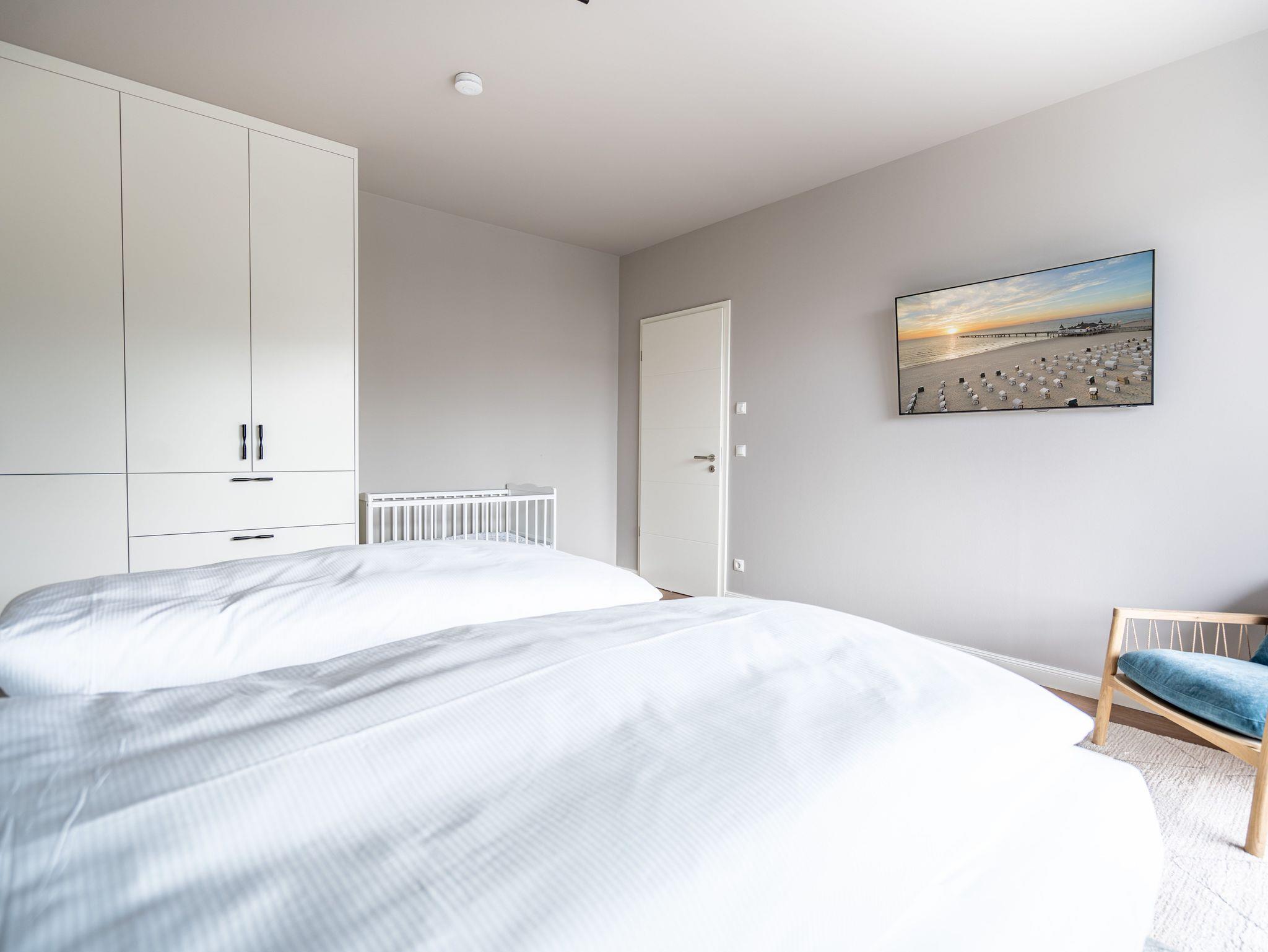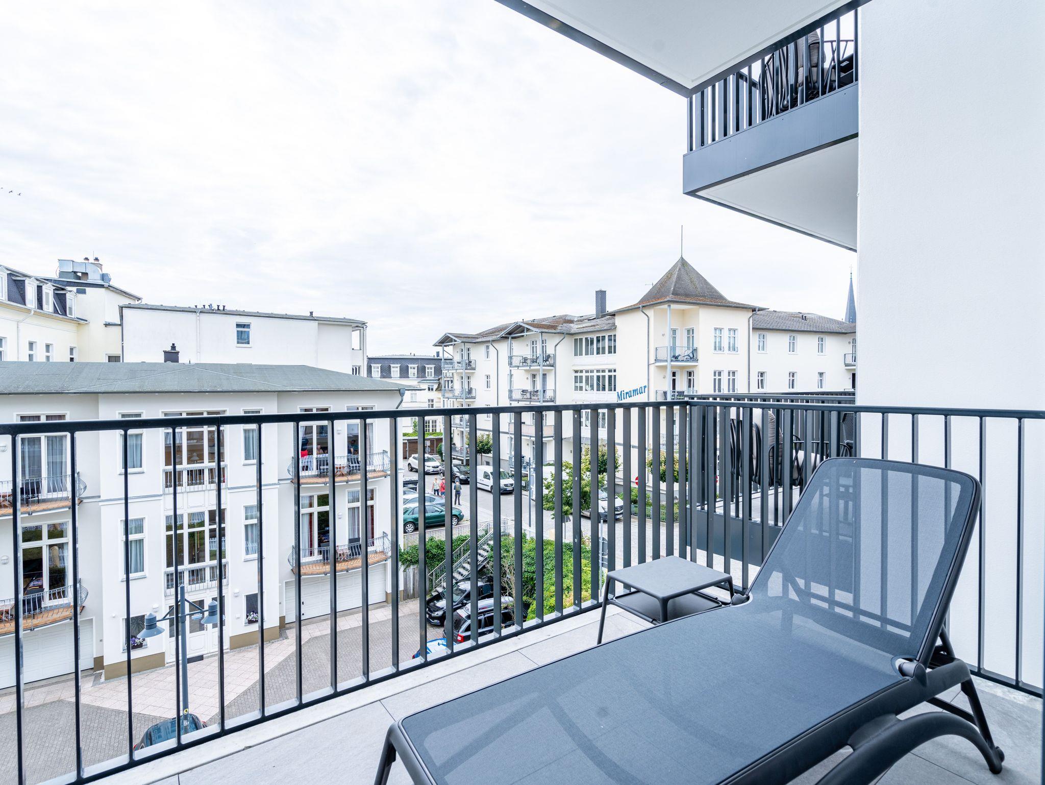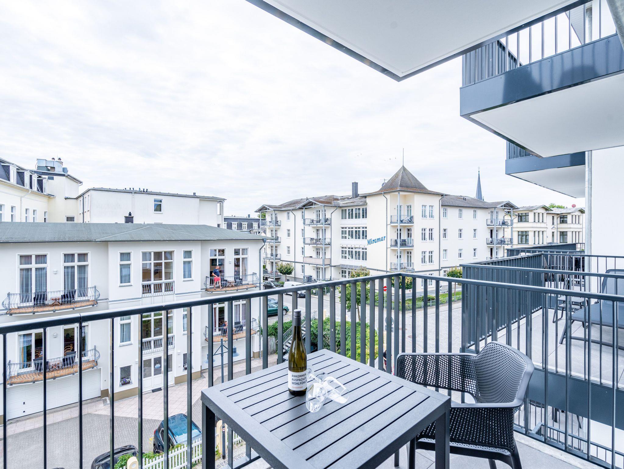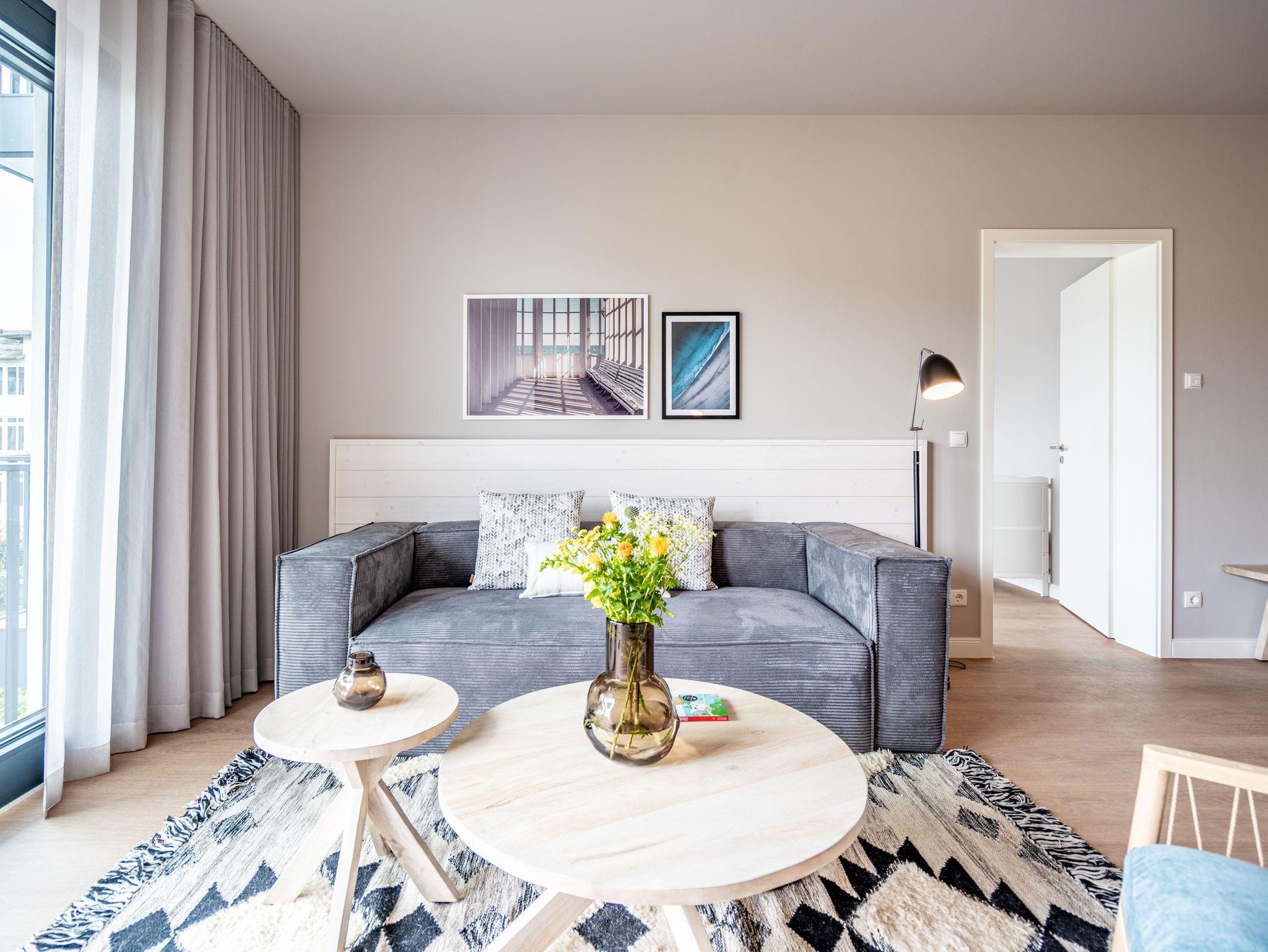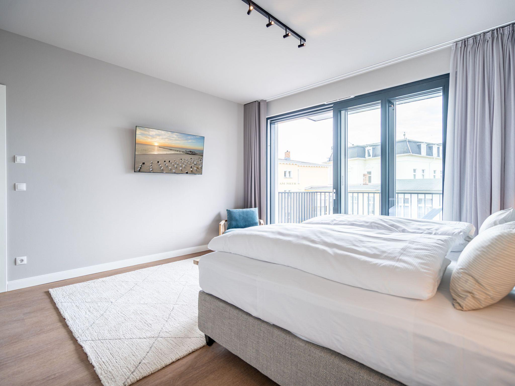 Direkt an der Ostsee mit Blick aufs Wasser ? mehr Meer geht nicht. Diese stilvolle 2-Raum-Wohnung B 2.3 im zweiten Obergeschoss der Strandterrasse ist mit ihren 77 Quadratmeter ein ideales Urlaubsparadies für bis zu 2 Personen und 1 Kleinkind im Babybett. Hier können Sie gleich von zwei Balkonen die Ahlbecker Seebrücke und die dahinter liegende Ostsee genießen. Dazu bietet das Appartement alle Annehmlichkeiten, die Sie sich wünschen. Das großzügige Wohn-Esszimmer mit der integrierten, offenen Küche ist ein kleines Wohlfühlreich der Extraklasse. Komfortable und stylische Möbel im skandinavischen Design sorgen dafür, dass Sie sich hier rundum geborgen fühlen. Zum ausgiebigen Entspannen vor dem Elektrokamin (ohne Wärmeabgabe) eignet sich das tolle Sofa oder der Sessel bestens. Filmabende werden dank des großen Flat-TV (50 Zoll) zu Heimkinoerlebnissen. Ein gemütlicher Essplatz für 4 Personen lädt zum Verweilen ein, während eine Arbeitsstation den Raum funktional ergänzt. Die Küchenzeile ist mit allem ausgestattet, was man zum Kochen und Zubereiten der Mahlzeiten brauchen kann. Dazu gehören moderne Elektrogeräte wie ein Backofen, ein 3-Platten-Induktionsherd oder eine Nespresso-Kapselmaschine. Der Zugang zum ersten Süd-Ost-Balkon bietet einen herrlichen Ausblick und ist mit einem Gartentisch und 2 Stühlen ausgestattet. Auf den zweiten Süd-Ost-Balkon können Sie vom Schlafzimmer aus hinaustreten. Auf der dortigen Gartenliege können Sie sich wunderbar an der frischen Brise erfreuen, die vom Meer herüberweht. Das Schlafzimmer verfügt über ein großes Boxspringdoppelbett (2,00m x 2,00m), ein festes Babybett, einen großen Kleiderschrank und einen Flat-TV (50 Zoll). Ihr Badezimmer wird an ungemütlichen Tagen zu einer kleinen Wellnessoase. Denn es verfügt neben der Dusche, dem Waschtisch und dem WC über eine Infrarotsaunakabine, die Auszeitabende in kuschelige Mußestunden verwandelt. In der Tiefgarage gehört zu Ihrer Wohnung ein PKW-Stellplatz. Herzlich Willkommen in dieser charmanten Ferienwohnung. Wir wünschen Ihnen hier eine wunderbar erholsame Zeit.