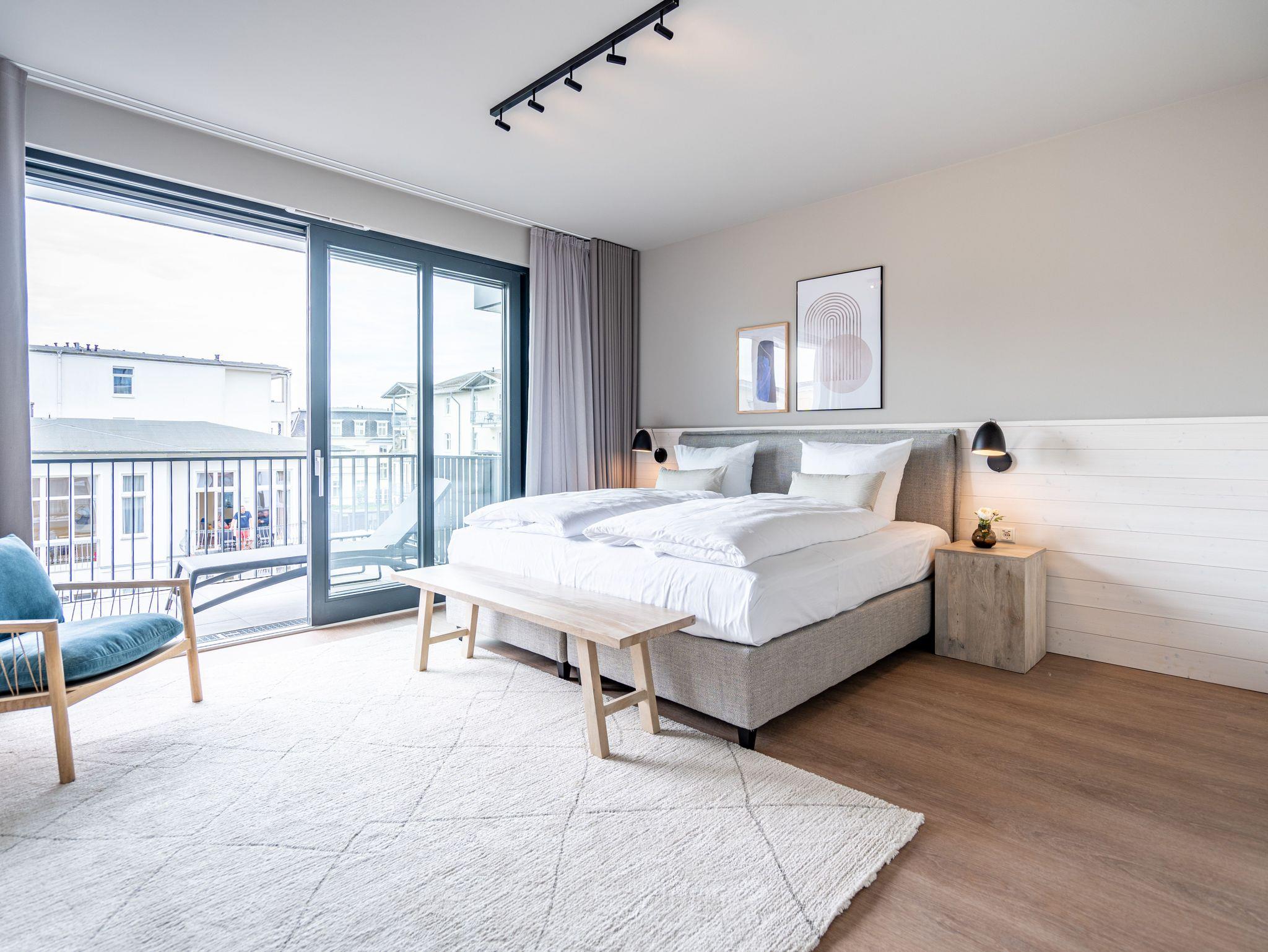 Die 2024 fertig gestellte Strandterrasse liegt direkt an der belebten Strandpromenade und bietet einen einzigartigen Ausblick auf die Grand Dame der historischen Seebrücken sowie die historische Konzertmuschel, einem beliebten Treffpunkt für Kunst und Kultur. Dahinter liegt die Ostsee ? ein Panorama, das zu den schönsten in den Kaiserbädern gehört. Es ist wie das Abtauchen in eine andere Zeit. In eine Zeit, in der man mit Stock, Sonnenschirm und Hut fürs ?Sehen und gesehen werden? über die Promenade schlenderte; aber auch in eine Zeit, in der ? damals wie heute ? Zeit einmal für eine kurze Weile keine Rolle spielt. Weil man angekommen ist im Loslassen, Entspannen und Genießen. Es ist dieser besondere Geruch nach Meeresluft und Freiheit, der in Erinnerung bleibt. Dazu die Bilder, die man mitnimmt. Von langen Strandspaziergängen, vom Lachen in fröhlich schäumenden Ostseewellen, von der Zeit in einem wunderschönen Urlaubsdomizil. Denn genau das ist die Strandterrasse mit ihren 56 modernen und exklusiven Ferienappartements direkt gegenüber der Ahlbecker Seebrücke. Die Ein-, Zwei- oder Dreizimmerwohnungen ? zwischen 40 und 70 Quadratmeter groß ? sind von einer Innenarchitektin gemeinsam mit unserem Erfahrungsschatz an Gästewünschen mit viel Liebe zum Detail und ganz individuell konzipiert worden. Entspannung und Wohlfühlen stehen an erster Stelle. Alles ist aufeinander abgestimmt und sorgt für eine gemütliche Atmosphäre. Wählen Sie zwischen einem Domizil in einem hellen, sandfarbenen Designkonzept oder einem Appartement mit anthrazitfarbenen Farbakzenten. Alle Appartements verfügen gleichermaßen über eine stilvolle und komfortable Einrichtung, die passgenau angefertigt worden ist, sowie über moderne Küchen und Bäder. Jedem Schlafzimmer ist ein eigenes Bad mit Dusche zugeordnet (außer App. B4.5). Die Appartements besitzen fast alle einen Balkon ? viele schauen sogar zur Ostsee hinaus. Die meisten Feriendomizile haben einen Elektrokamin und Infrarotsaunen. Im Erdgeschoss befindet sich ein separater Gemeinschaftsraum für Fahrräder. Außerdem besteht die Möglichkeit, im Gemeinschaftswaschraum 2 Waschmaschinen [&] Trockner zu nutzen. Ergänzt wird das Angebot durch eine Gemeinschaftssauna, die täglich von 11:00 bis 22:00 Uhr nutzbar ist. In der Tiefgarage (Einfahrtshöhe 2,03 Meter) steht für jede Wohnung 1 Pkw-Stellplatz zur Verfügung. Ist alles zur Zufriedenheit untergebracht? Dann kann der Urlaub ja beginnen. Und beim Blick vom Balkon über die Ostsee treffen sich zum Sonnenaufgang das Heute und das Damals. Gelassenheit legt sich beim Gang hinunter an den Strand auf die Seele. Jetzt darf die Zeit stehenbleiben.