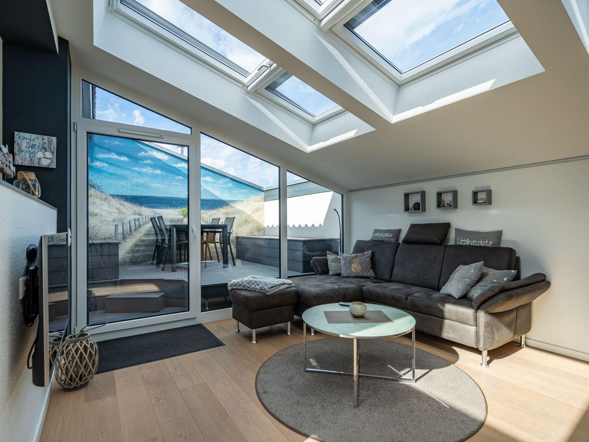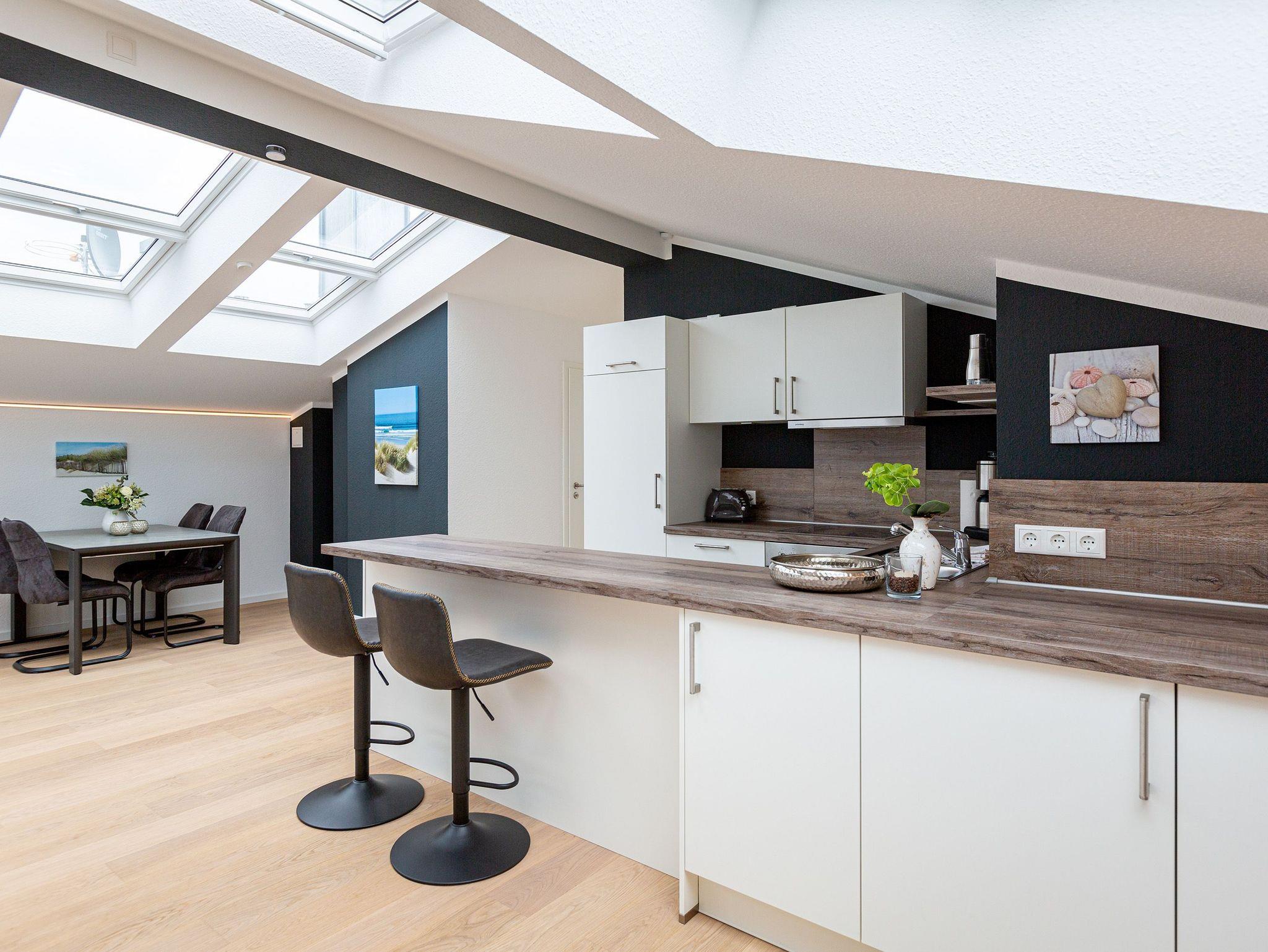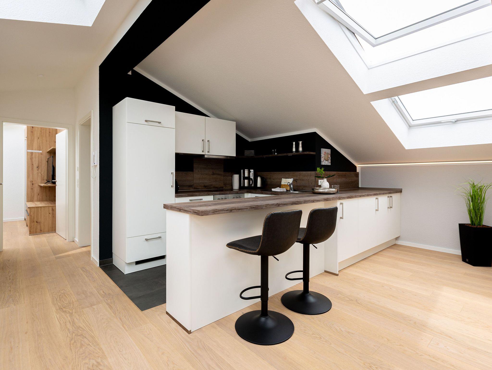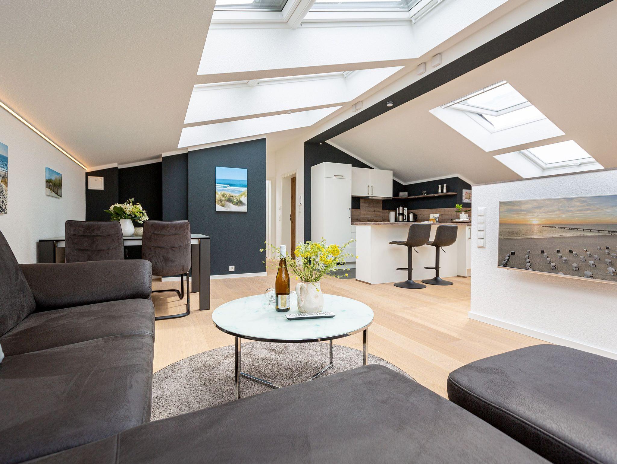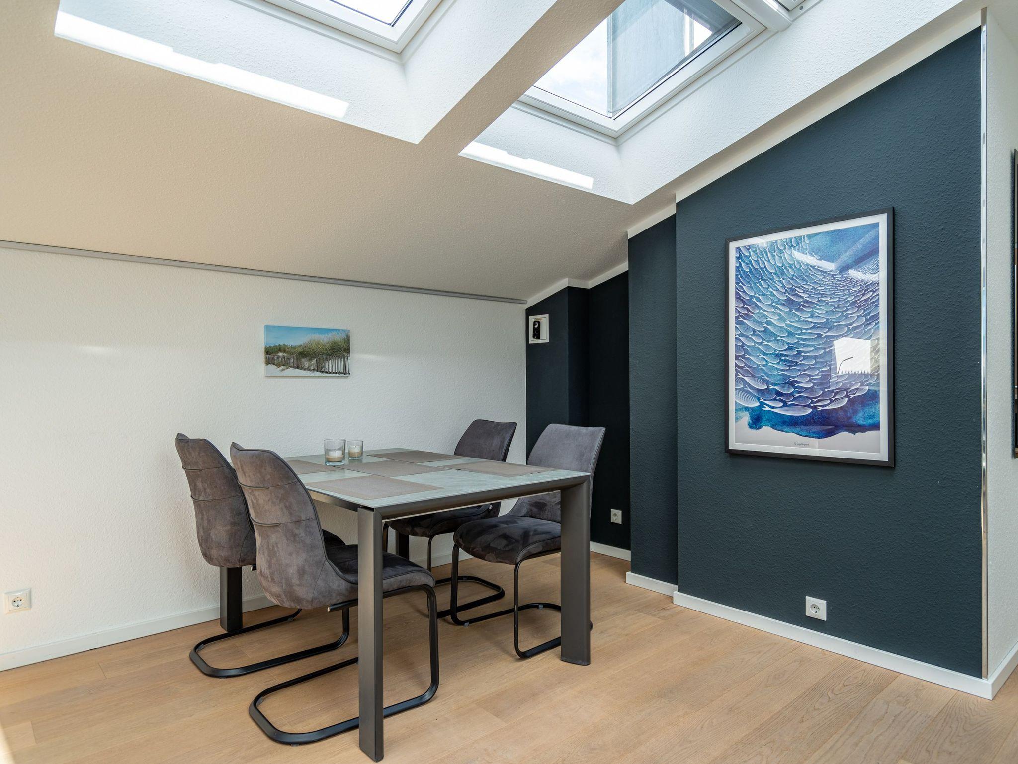 Das Appartement 9b unter dem Dach des Quartiers Frohsinn ist eine wunderschöne Galeriewohnung für bis zu vier Personen und ein Kleinkind (im Kinderreisebett). Große Dachfenster sorgen dafür, dass Ihr Wohlfühlreich mit Licht durchflutet ist. Vor allem das großzügige Wohn-Esszimmer mit Zugang zur sonnigen Dachterrasse ist ein absolutes Highlight. 70 Quadratmeter groß lässt es Urlaubs- und Wohnträume wahr werden. Die Wohnung erstreckt sich über zwei Ebenen. In der unteren Ebene befindet sich der Eingangsbereich mit einer Garderobe und eines von zwei Bädern mit Dusche und WC. Freuen Sie sich hier auch auf eine kleine Wellnessoase. Eine Finnische Sauna sorgt an kühlen Tagen oder Abenden für wohlige Wärme und Erholung. Eine Treppe höher gelangen Sie in das elegante Wohnloft mit Wohlfühlzone und offener Küche mit Tresen und Esstisch. Die Atelierfenster im Dach sorgen für ein außergewöhnliches Wohnflair. Kuschelcouch, Flat-TV, Essbereich und eine voll ausgestattete Küche warten hier auf Sie. Vom Herd, über die Kaffeemaschine, den Geschirrspüler oder das Porzellan ? alles ist hochwertig und modern. Doch das erste, was jeder, der hier hochkommt, im Sinn hat, ist der Blick auf die wunderschöne Dachterrasse (11 Quadratmeter groß). Geschützt vor Wind und fremden Blicken können Sie hier oben die Zeit wunderbar genießen. Denn hier kann Ihnen niemand beim Sonnenbaden und Entspannen zuschauen. Im Obergeschoss befinden sich auch die beiden Schlafzimmer und ein zweites Bad mit Dusche und WC. Beide Schlafzimmer verfügen über ein bequemes Doppelbett (1,80 m x 2,00 m), einen Einbauschrank und einen Flat TV. Die Betten sind bei Anreise bereits bezogen. Das WLAN können Sie kostenfrei nutzen. In der Tiefgarage gehören zu der Wohnung ein Stellplatz und ein separater Fahrradraum.