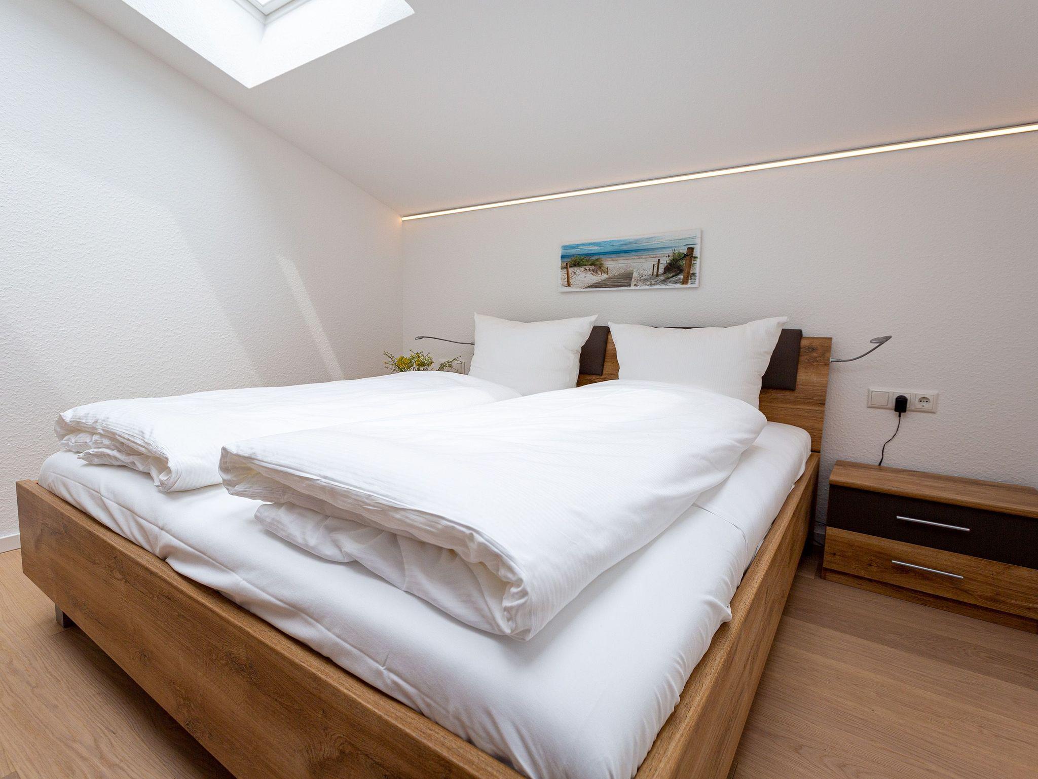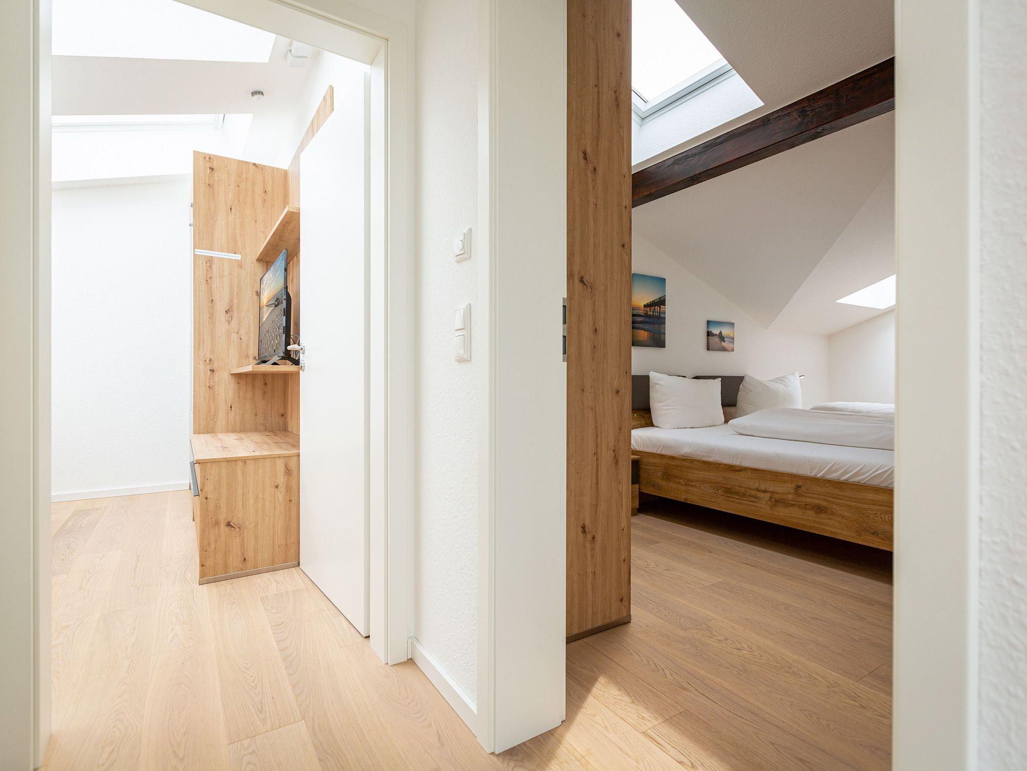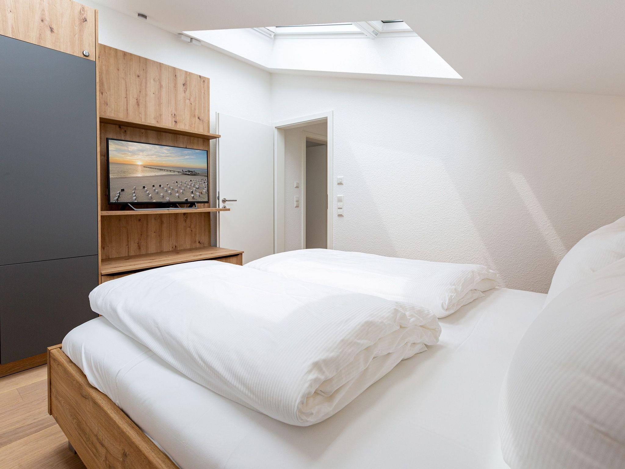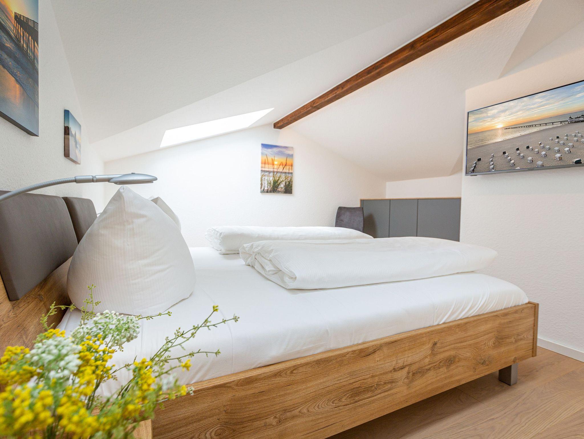 Das Appartement 9b unter dem Dach des Quartiers Frohsinn ist eine wunderschöne Galeriewohnung für bis zu vier Personen und ein Kleinkind (im Kinderreisebett). Große Dachfenster sorgen dafür, dass Ihr Wohlfühlreich mit Licht durchflutet ist. Vor allem das großzügige Wohn-Esszimmer mit Zugang zur sonnigen Dachterrasse ist ein absolutes Highlight. 70 Quadratmeter groß lässt es Urlaubs- und Wohnträume wahr werden. Die Wohnung erstreckt sich über zwei Ebenen. In der unteren Ebene befindet sich der Eingangsbereich mit einer Garderobe und eines von zwei Bädern mit Dusche und WC. Freuen Sie sich hier auch auf eine kleine Wellnessoase. Eine Finnische Sauna sorgt an kühlen Tagen oder Abenden für wohlige Wärme und Erholung. Eine Treppe höher gelangen Sie in das elegante Wohnloft mit Wohlfühlzone und offener Küche mit Tresen und Esstisch. Die Atelierfenster im Dach sorgen für ein außergewöhnliches Wohnflair. Kuschelcouch, Flat-TV, Essbereich und eine voll ausgestattete Küche warten hier auf Sie. Vom Herd, über die Kaffeemaschine, den Geschirrspüler oder das Porzellan ? alles ist hochwertig und modern. Doch das erste, was jeder, der hier hochkommt, im Sinn hat, ist der Blick auf die wunderschöne Dachterrasse (11 Quadratmeter groß). Geschützt vor Wind und fremden Blicken können Sie hier oben die Zeit wunderbar genießen. Denn hier kann Ihnen niemand beim Sonnenbaden und Entspannen zuschauen. Im Obergeschoss befinden sich auch die beiden Schlafzimmer und ein zweites Bad mit Dusche und WC. Beide Schlafzimmer verfügen über ein bequemes Doppelbett (1,80 m x 2,00 m), einen Einbauschrank und einen Flat TV. Die Betten sind bei Anreise bereits bezogen. Das WLAN können Sie kostenfrei nutzen. In der Tiefgarage gehören zu der Wohnung ein Stellplatz und ein separater Fahrradraum.