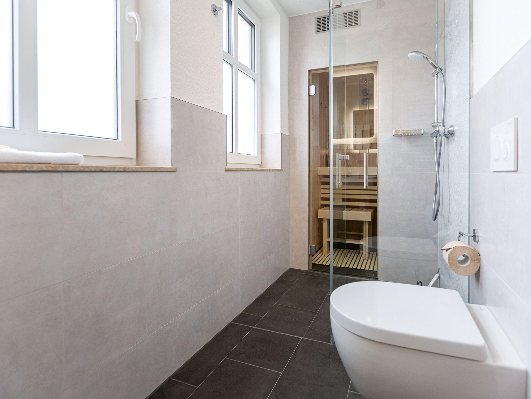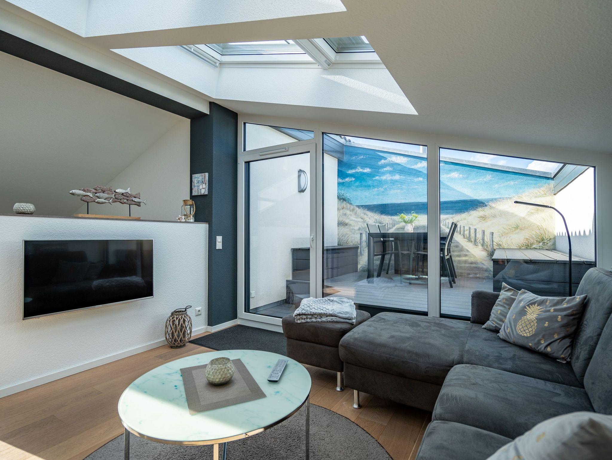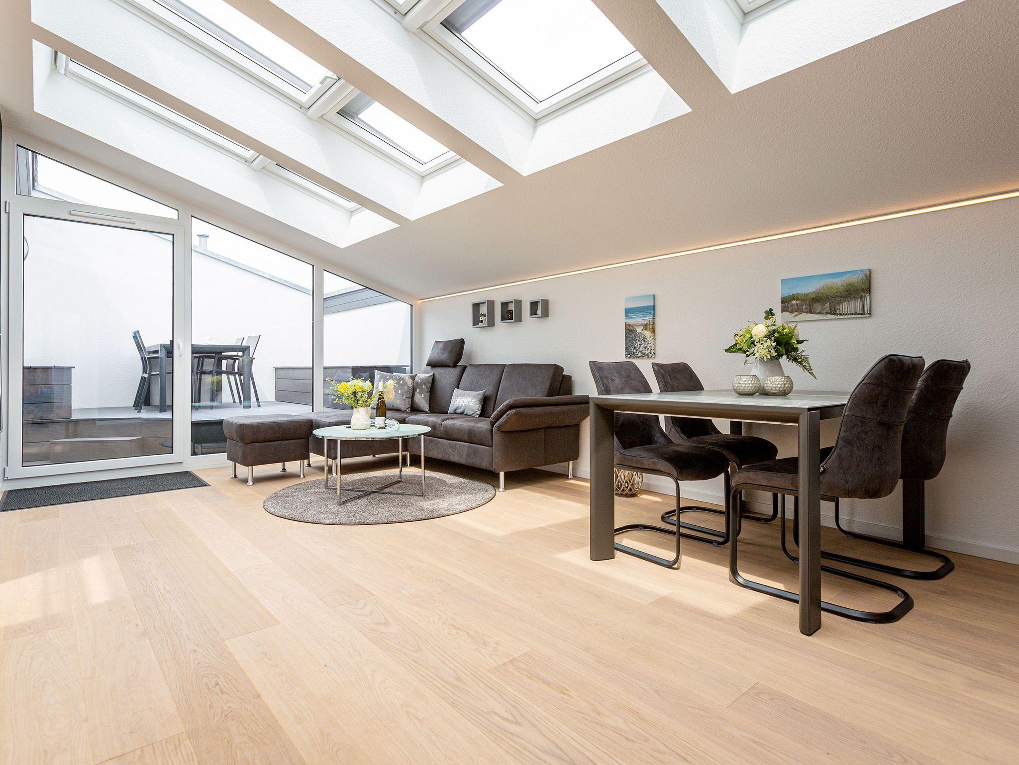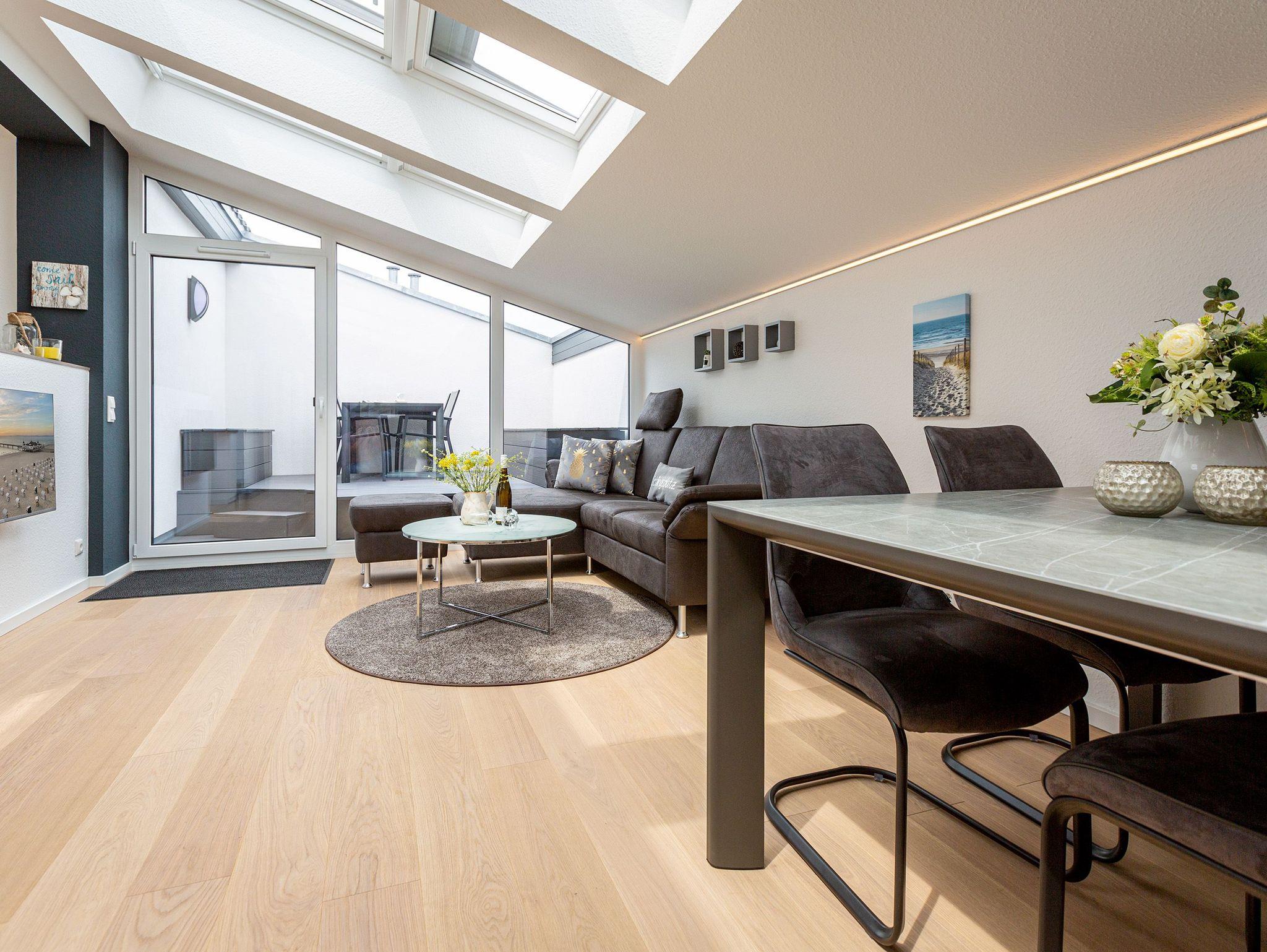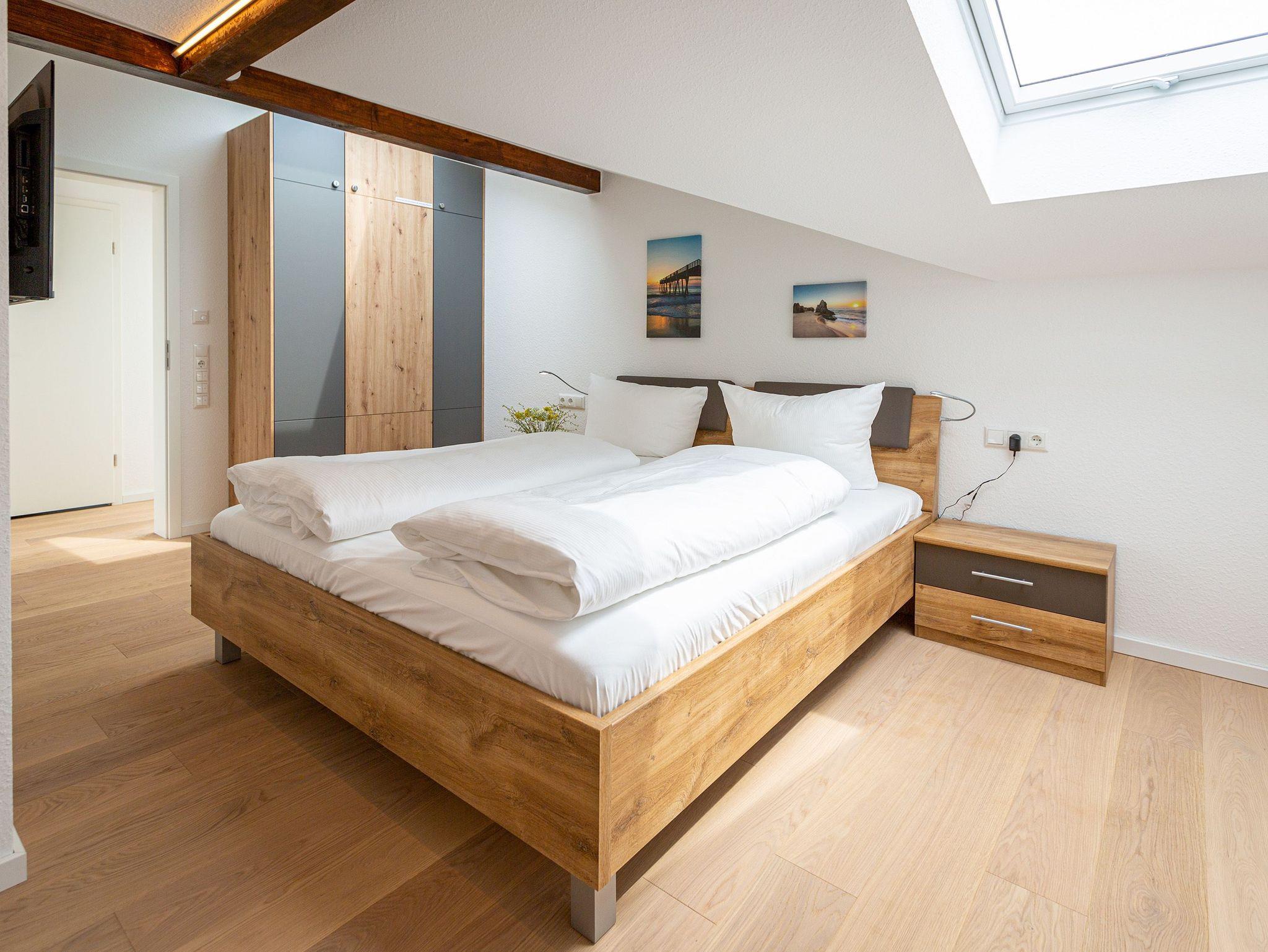 Das Appartement 9b unter dem Dach des Quartiers Frohsinn ist eine wunderschöne Galeriewohnung für bis zu vier Personen und ein Kleinkind (im Kinderreisebett). Große Dachfenster sorgen dafür, dass Ihr Wohlfühlreich mit Licht durchflutet ist. Vor allem das großzügige Wohn-Esszimmer mit Zugang zur sonnigen Dachterrasse ist ein absolutes Highlight. 70 Quadratmeter groß lässt es Urlaubs- und Wohnträume wahr werden. Die Wohnung erstreckt sich über zwei Ebenen. In der unteren Ebene befindet sich der Eingangsbereich mit einer Garderobe und eines von zwei Bädern mit Dusche und WC. Freuen Sie sich hier auch auf eine kleine Wellnessoase. Eine Finnische Sauna sorgt an kühlen Tagen oder Abenden für wohlige Wärme und Erholung. Eine Treppe höher gelangen Sie in das elegante Wohnloft mit Wohlfühlzone und offener Küche mit Tresen und Esstisch. Die Atelierfenster im Dach sorgen für ein außergewöhnliches Wohnflair. Kuschelcouch, Flat-TV, Essbereich und eine voll ausgestattete Küche warten hier auf Sie. Vom Herd, über die Kaffeemaschine, den Geschirrspüler oder das Porzellan ? alles ist hochwertig und modern. Doch das erste, was jeder, der hier hochkommt, im Sinn hat, ist der Blick auf die wunderschöne Dachterrasse (11 Quadratmeter groß). Geschützt vor Wind und fremden Blicken können Sie hier oben die Zeit wunderbar genießen. Denn hier kann Ihnen niemand beim Sonnenbaden und Entspannen zuschauen. Im Obergeschoss befinden sich auch die beiden Schlafzimmer und ein zweites Bad mit Dusche und WC. Beide Schlafzimmer verfügen über ein bequemes Doppelbett (1,80 m x 2,00 m), einen Einbauschrank und einen Flat TV. Die Betten sind bei Anreise bereits bezogen. Das WLAN können Sie kostenfrei nutzen. In der Tiefgarage gehören zu der Wohnung ein Stellplatz und ein separater Fahrradraum.