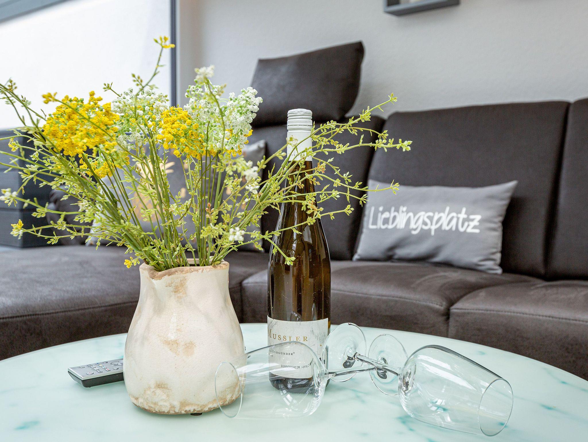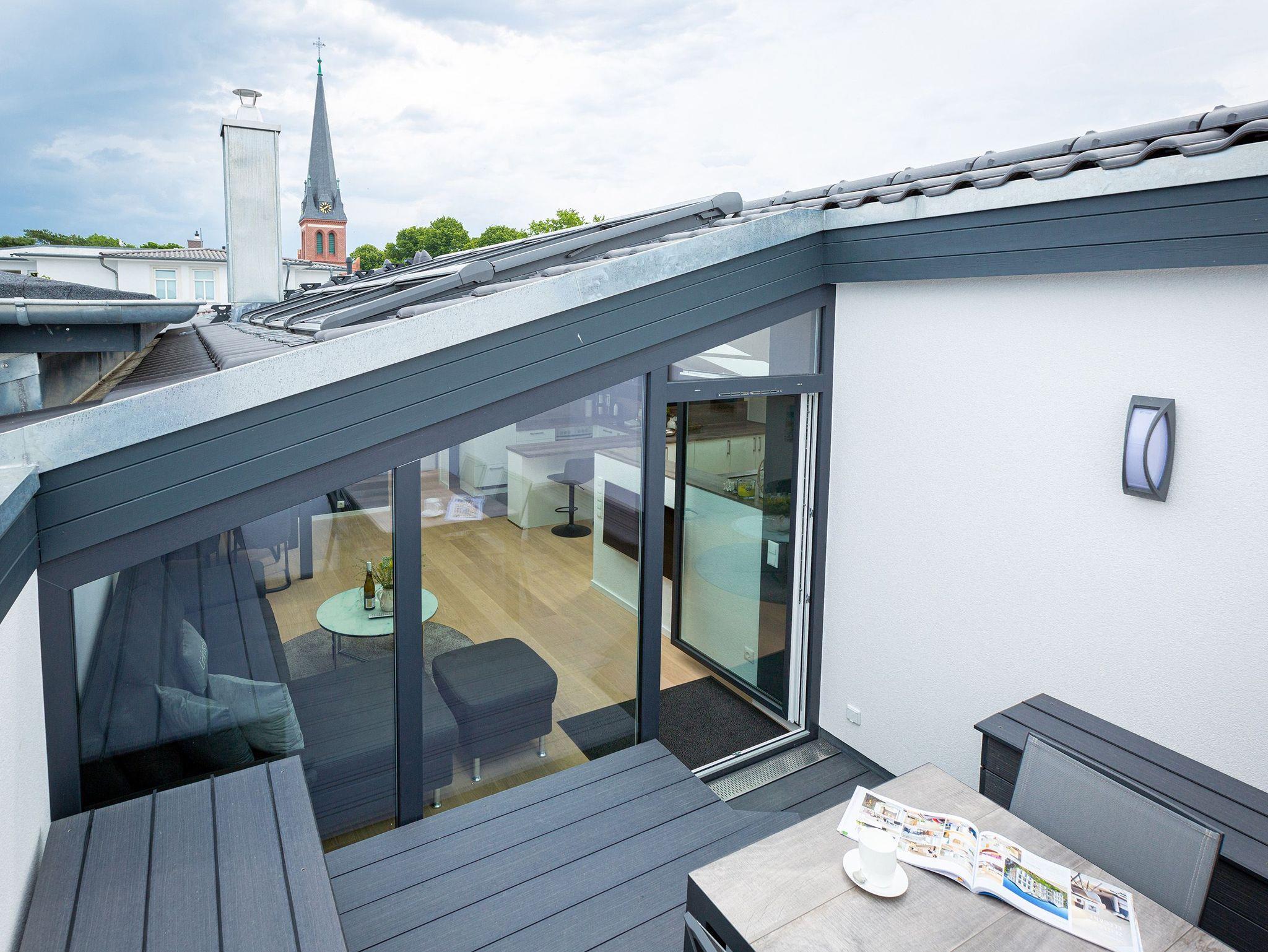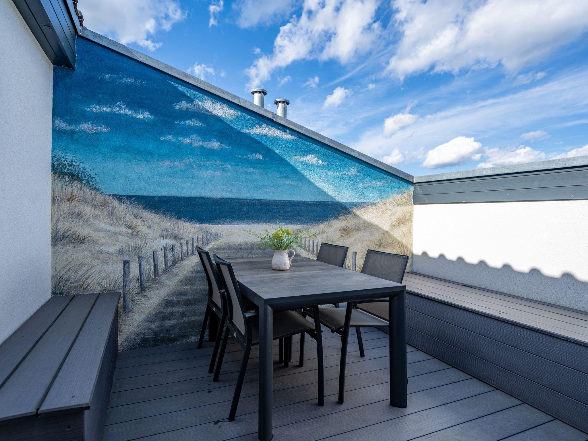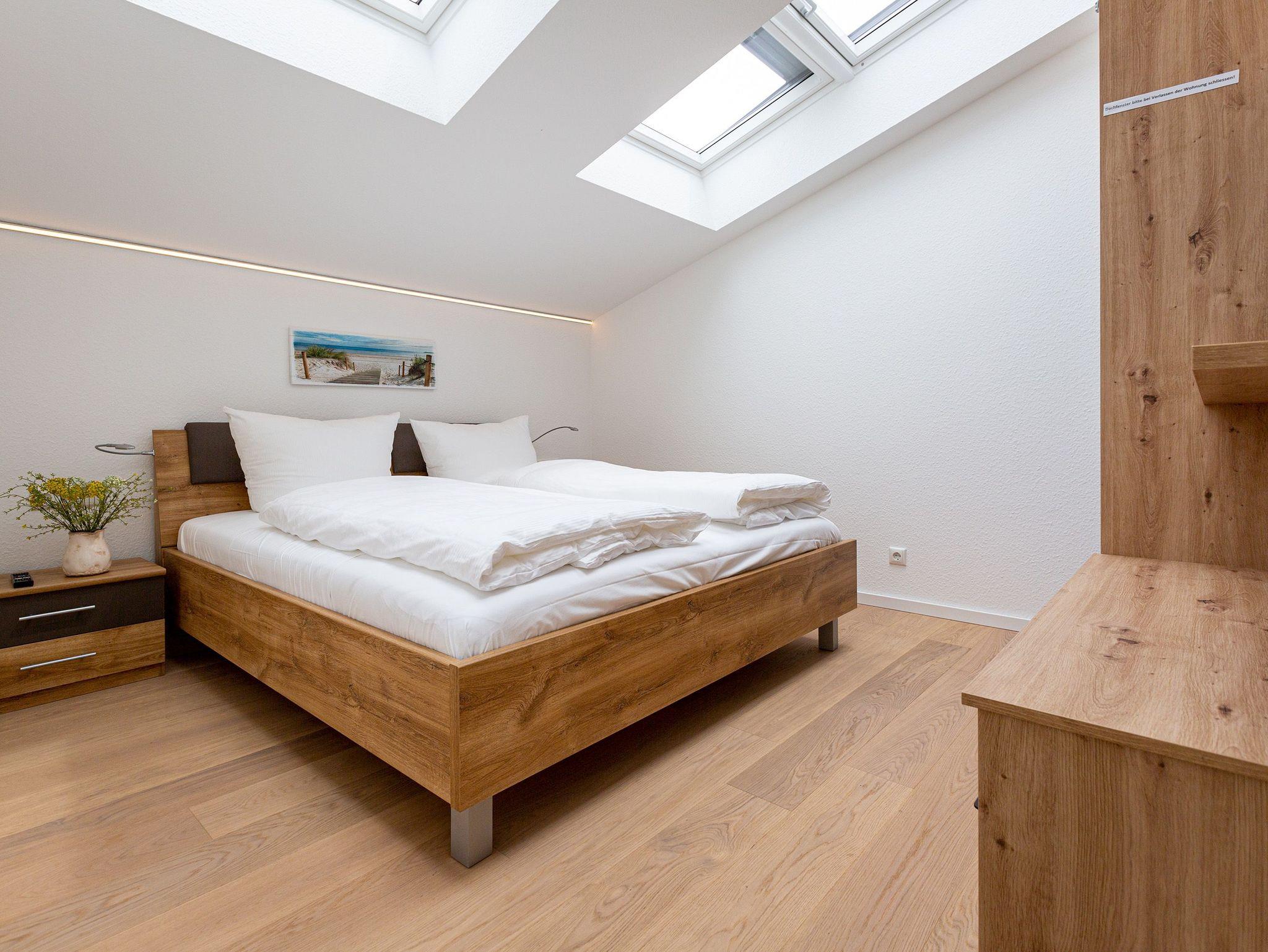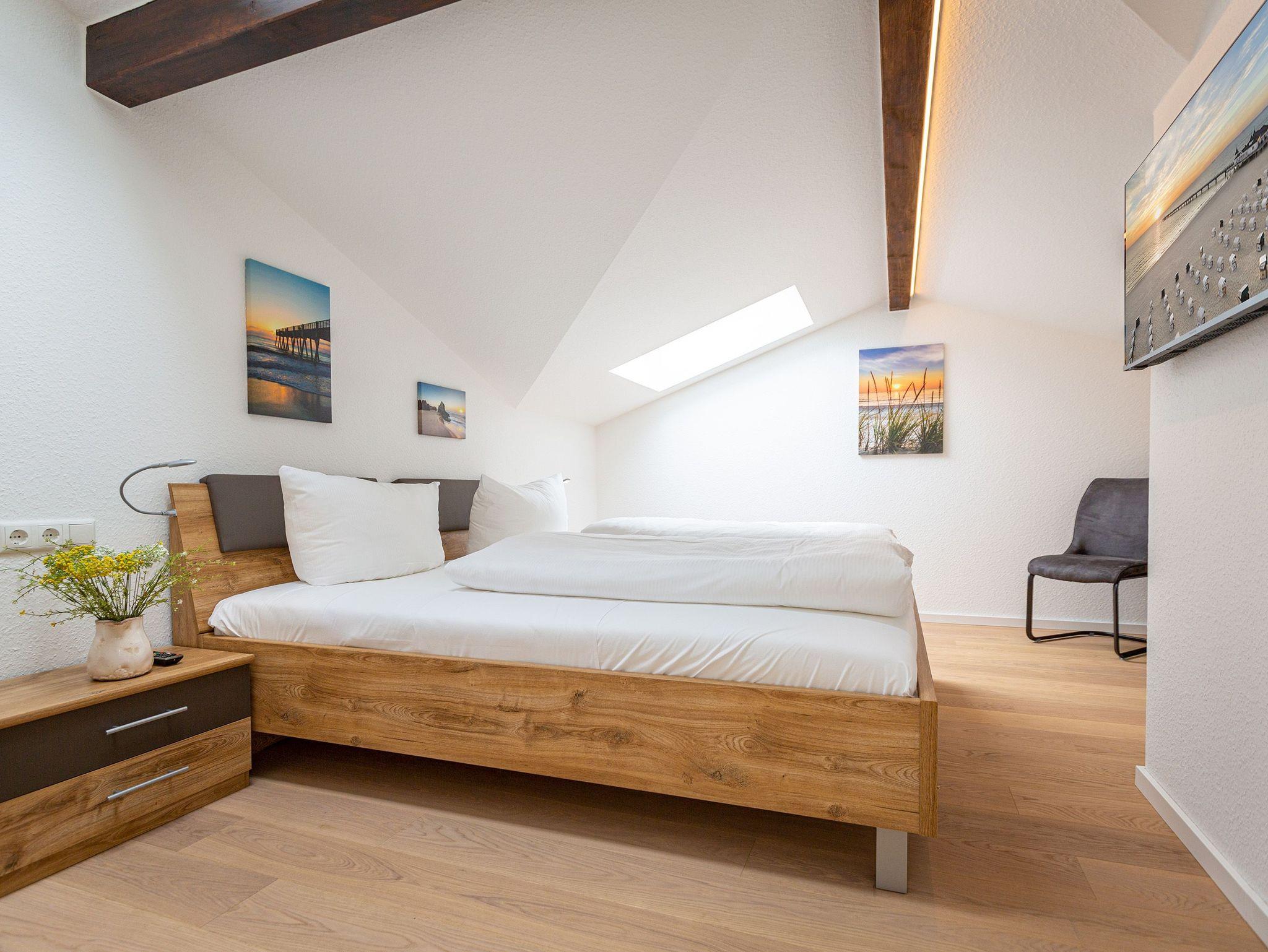 Das Appartement 9b unter dem Dach des Quartiers Frohsinn ist eine wunderschöne Galeriewohnung für bis zu vier Personen und ein Kleinkind (im Kinderreisebett). Große Dachfenster sorgen dafür, dass Ihr Wohlfühlreich mit Licht durchflutet ist. Vor allem das großzügige Wohn-Esszimmer mit Zugang zur sonnigen Dachterrasse ist ein absolutes Highlight. 70 Quadratmeter groß lässt es Urlaubs- und Wohnträume wahr werden. Die Wohnung erstreckt sich über zwei Ebenen. In der unteren Ebene befindet sich der Eingangsbereich mit einer Garderobe und eines von zwei Bädern mit Dusche und WC. Freuen Sie sich hier auch auf eine kleine Wellnessoase. Eine Finnische Sauna sorgt an kühlen Tagen oder Abenden für wohlige Wärme und Erholung. Eine Treppe höher gelangen Sie in das elegante Wohnloft mit Wohlfühlzone und offener Küche mit Tresen und Esstisch. Die Atelierfenster im Dach sorgen für ein außergewöhnliches Wohnflair. Kuschelcouch, Flat-TV, Essbereich und eine voll ausgestattete Küche warten hier auf Sie. Vom Herd, über die Kaffeemaschine, den Geschirrspüler oder das Porzellan ? alles ist hochwertig und modern. Doch das erste, was jeder, der hier hochkommt, im Sinn hat, ist der Blick auf die wunderschöne Dachterrasse (11 Quadratmeter groß). Geschützt vor Wind und fremden Blicken können Sie hier oben die Zeit wunderbar genießen. Denn hier kann Ihnen niemand beim Sonnenbaden und Entspannen zuschauen. Im Obergeschoss befinden sich auch die beiden Schlafzimmer und ein zweites Bad mit Dusche und WC. Beide Schlafzimmer verfügen über ein bequemes Doppelbett (1,80 m x 2,00 m), einen Einbauschrank und einen Flat TV. Die Betten sind bei Anreise bereits bezogen. Das WLAN können Sie kostenfrei nutzen. In der Tiefgarage gehören zu der Wohnung ein Stellplatz und ein separater Fahrradraum.