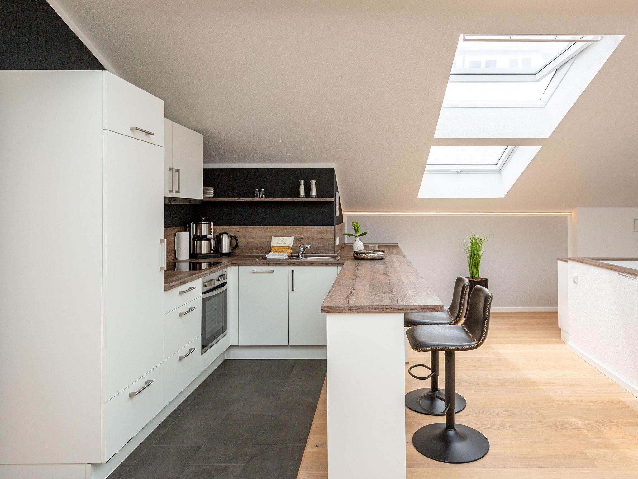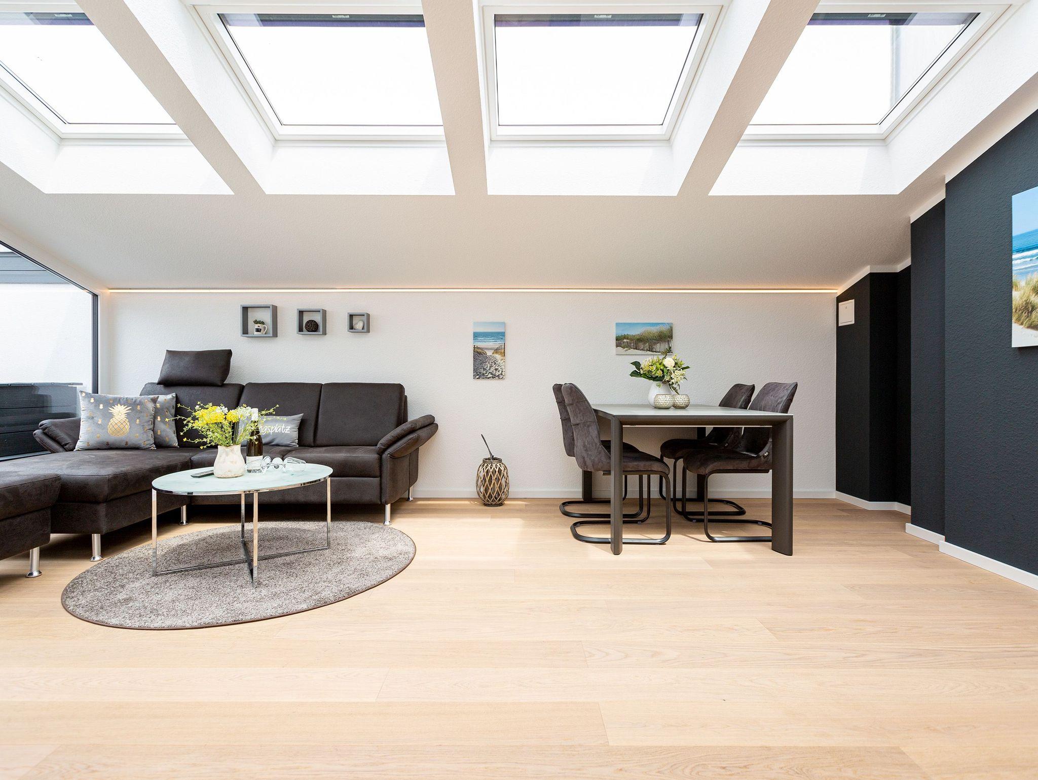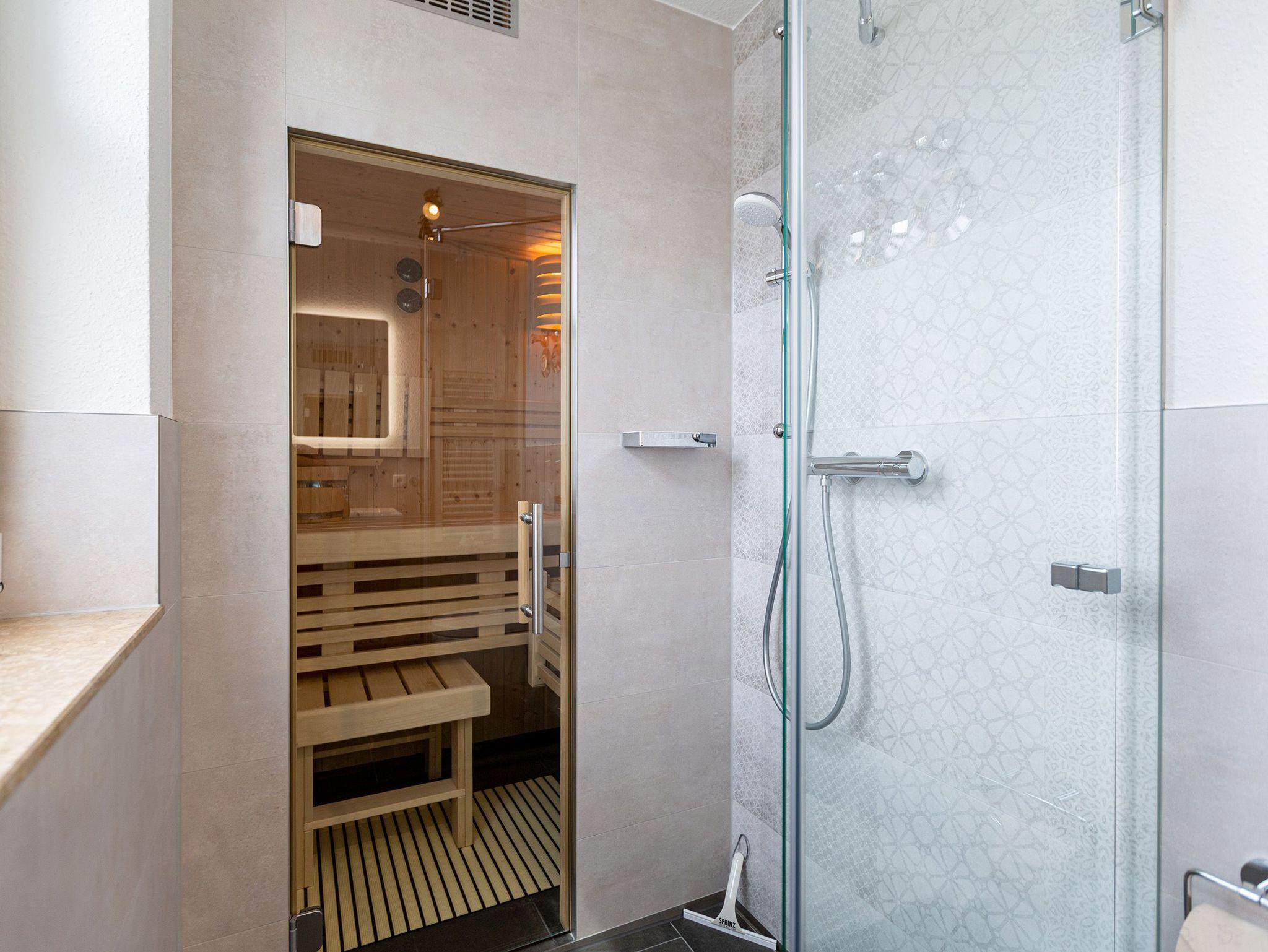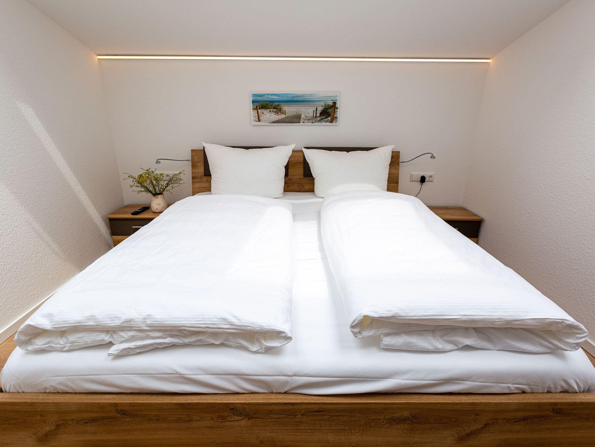 Das Appartement 9b unter dem Dach des Quartiers Frohsinn ist eine wunderschöne Galeriewohnung für bis zu vier Personen und ein Kleinkind (im Kinderreisebett). Große Dachfenster sorgen dafür, dass Ihr Wohlfühlreich mit Licht durchflutet ist. Vor allem das großzügige Wohn-Esszimmer mit Zugang zur sonnigen Dachterrasse ist ein absolutes Highlight. 70 Quadratmeter groß lässt es Urlaubs- und Wohnträume wahr werden. Die Wohnung erstreckt sich über zwei Ebenen. In der unteren Ebene befindet sich der Eingangsbereich mit einer Garderobe und eines von zwei Bädern mit Dusche und WC. Freuen Sie sich hier auch auf eine kleine Wellnessoase. Eine Finnische Sauna sorgt an kühlen Tagen oder Abenden für wohlige Wärme und Erholung. Eine Treppe höher gelangen Sie in das elegante Wohnloft mit Wohlfühlzone und offener Küche mit Tresen und Esstisch. Die Atelierfenster im Dach sorgen für ein außergewöhnliches Wohnflair. Kuschelcouch, Flat-TV, Essbereich und eine voll ausgestattete Küche warten hier auf Sie. Vom Herd, über die Kaffeemaschine, den Geschirrspüler oder das Porzellan ? alles ist hochwertig und modern. Doch das erste, was jeder, der hier hochkommt, im Sinn hat, ist der Blick auf die wunderschöne Dachterrasse (11 Quadratmeter groß). Geschützt vor Wind und fremden Blicken können Sie hier oben die Zeit wunderbar genießen. Denn hier kann Ihnen niemand beim Sonnenbaden und Entspannen zuschauen. Im Obergeschoss befinden sich auch die beiden Schlafzimmer und ein zweites Bad mit Dusche und WC. Beide Schlafzimmer verfügen über ein bequemes Doppelbett (1,80 m x 2,00 m), einen Einbauschrank und einen Flat TV. Die Betten sind bei Anreise bereits bezogen. Das WLAN können Sie kostenfrei nutzen. In der Tiefgarage gehören zu der Wohnung ein Stellplatz und ein separater Fahrradraum.