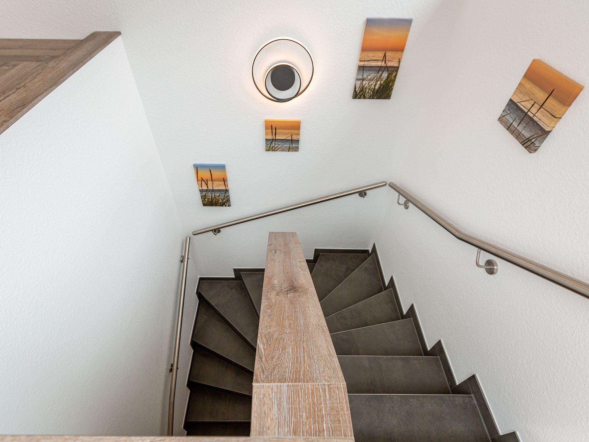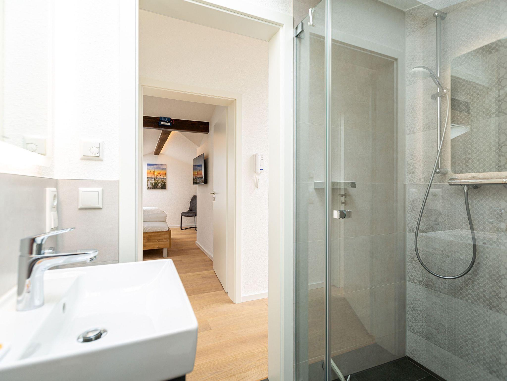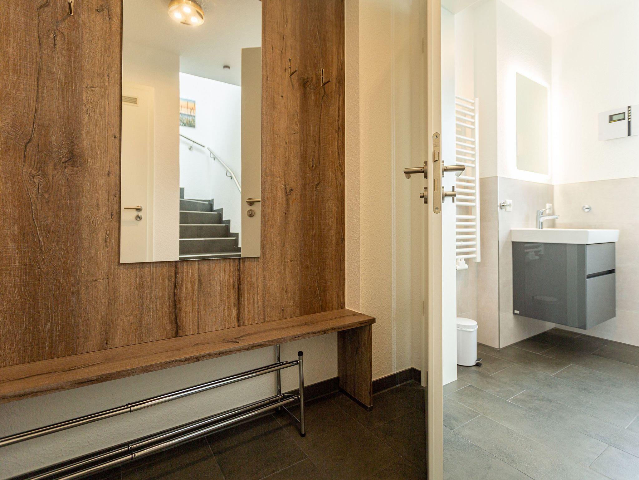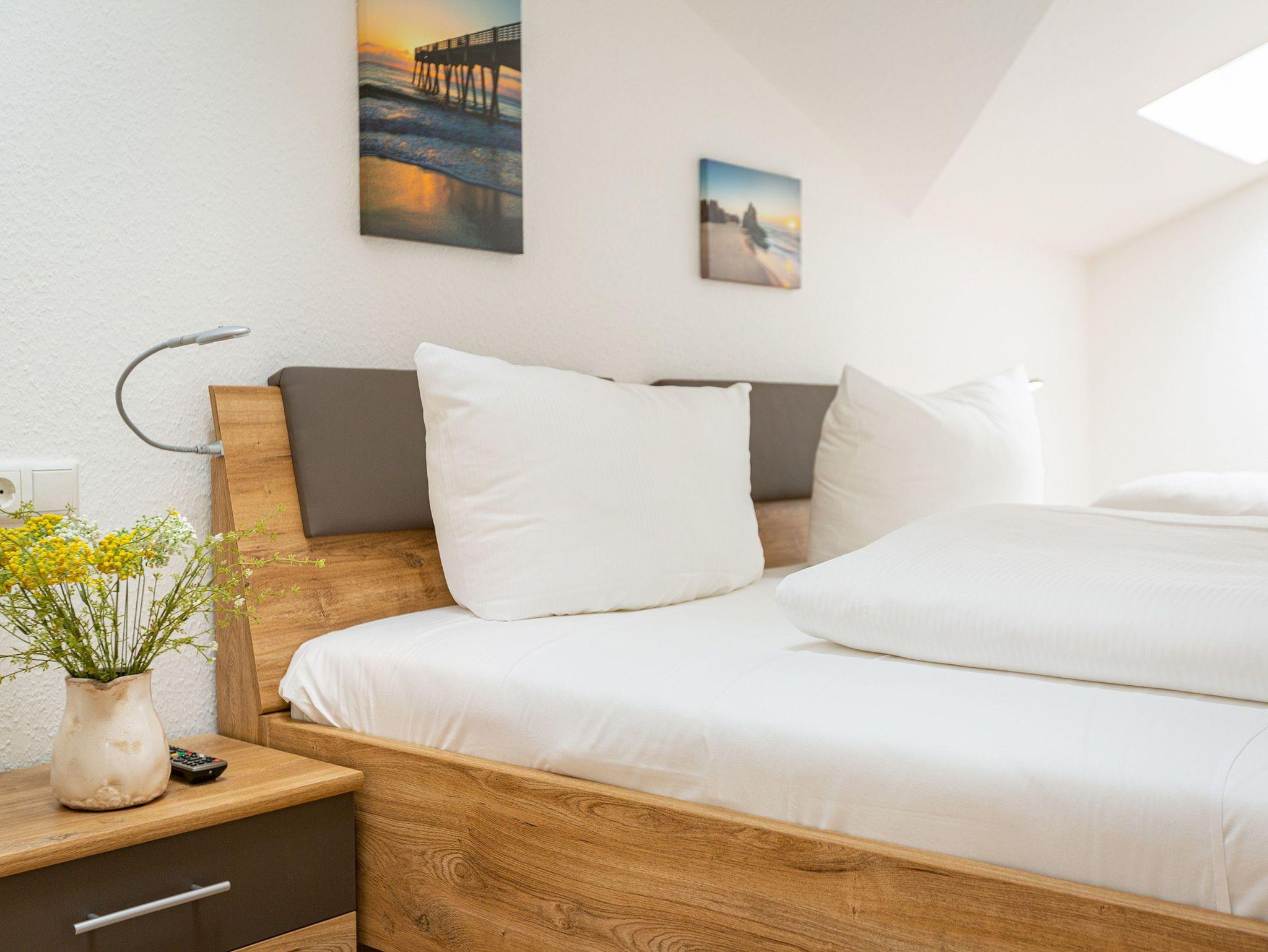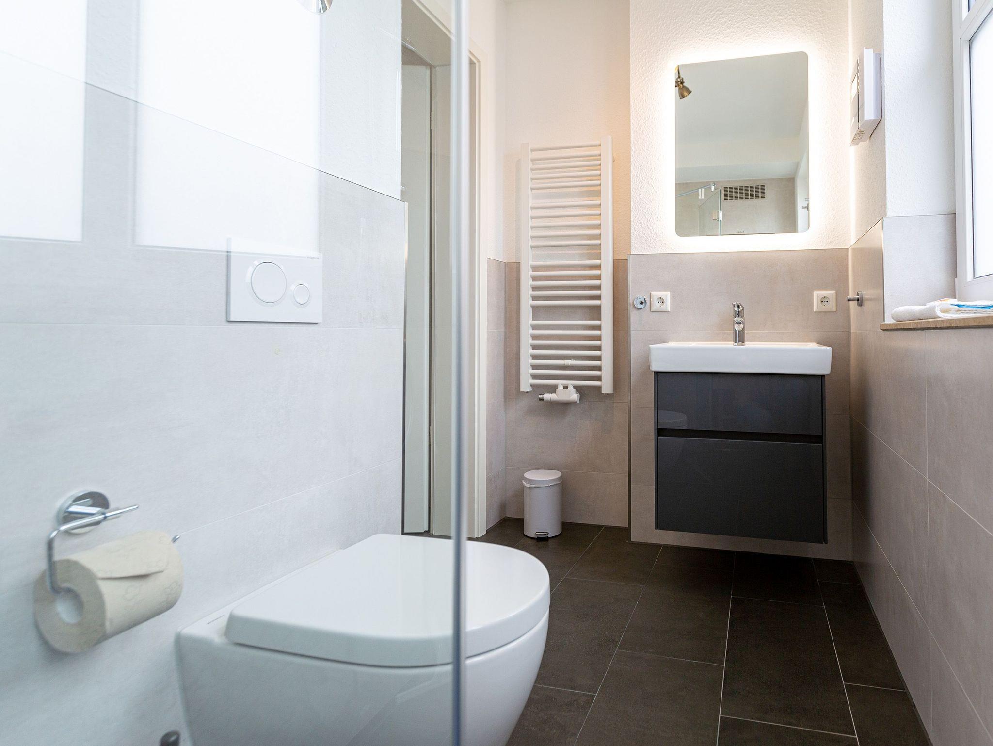Das Appartement 9b unter dem Dach des Quartiers Frohsinn ist eine wunderschöne Galeriewohnung für bis zu vier Personen und ein Kleinkind (im Kinderreisebett). Große Dachfenster sorgen dafür, dass Ihr Wohlfühlreich mit Licht durchflutet ist. Vor allem das großzügige Wohn-Esszimmer mit Zugang zur sonnigen Dachterrasse ist ein absolutes Highlight. 70 Quadratmeter groß lässt es Urlaubs- und Wohnträume wahr werden. Die Wohnung erstreckt sich über zwei Ebenen. In der unteren Ebene befindet sich der Eingangsbereich mit einer Garderobe und eines von zwei Bädern mit Dusche und WC. Freuen Sie sich hier auch auf eine kleine Wellnessoase. Eine Finnische Sauna sorgt an kühlen Tagen oder Abenden für wohlige Wärme und Erholung. Eine Treppe höher gelangen Sie in das elegante Wohnloft mit Wohlfühlzone und offener Küche mit Tresen und Esstisch. Die Atelierfenster im Dach sorgen für ein außergewöhnliches Wohnflair. Kuschelcouch, Flat-TV, Essbereich und eine voll ausgestattete Küche warten hier auf Sie. Vom Herd, über die Kaffeemaschine, den Geschirrspüler oder das Porzellan ? alles ist hochwertig und modern. Doch das erste, was jeder, der hier hochkommt, im Sinn hat, ist der Blick auf die wunderschöne Dachterrasse (11 Quadratmeter groß). Geschützt vor Wind und fremden Blicken können Sie hier oben die Zeit wunderbar genießen. Denn hier kann Ihnen niemand beim Sonnenbaden und Entspannen zuschauen. Im Obergeschoss befinden sich auch die beiden Schlafzimmer und ein zweites Bad mit Dusche und WC. Beide Schlafzimmer verfügen über ein bequemes Doppelbett (1,80 m x 2,00 m), einen Einbauschrank und einen Flat TV. Die Betten sind bei Anreise bereits bezogen. Das WLAN können Sie kostenfrei nutzen. In der Tiefgarage gehören zu der Wohnung ein Stellplatz und ein separater Fahrradraum.