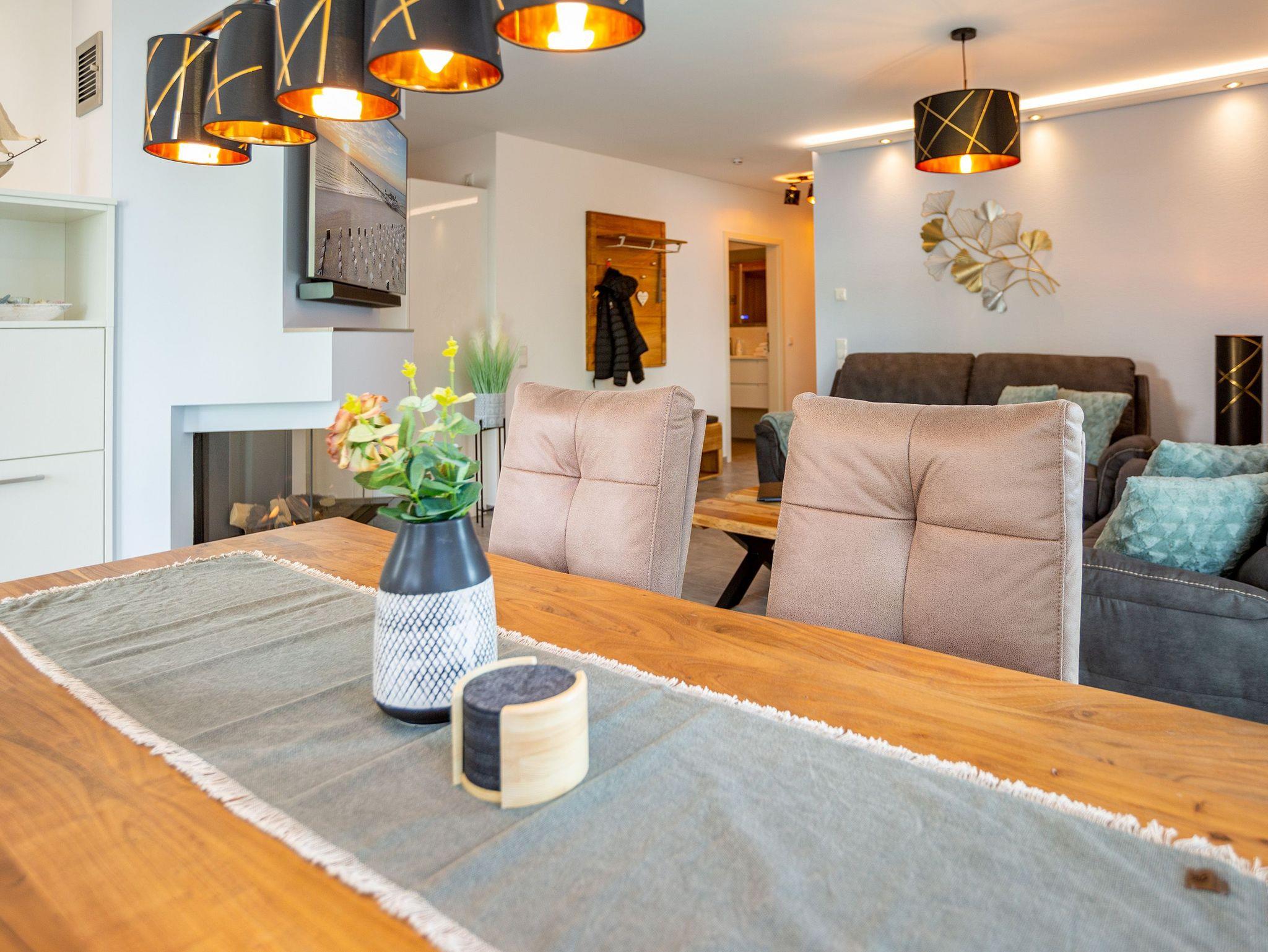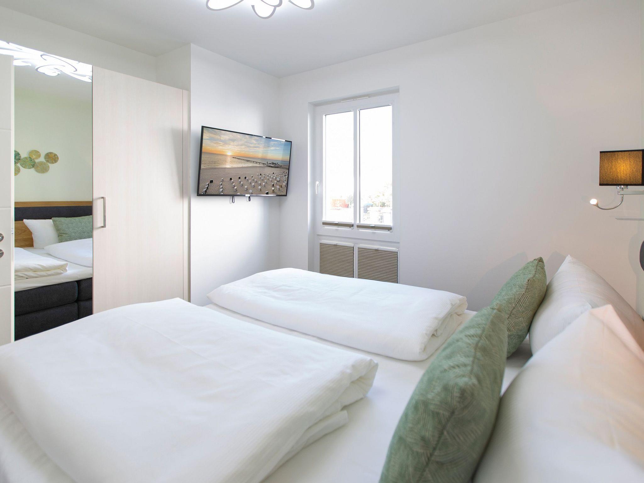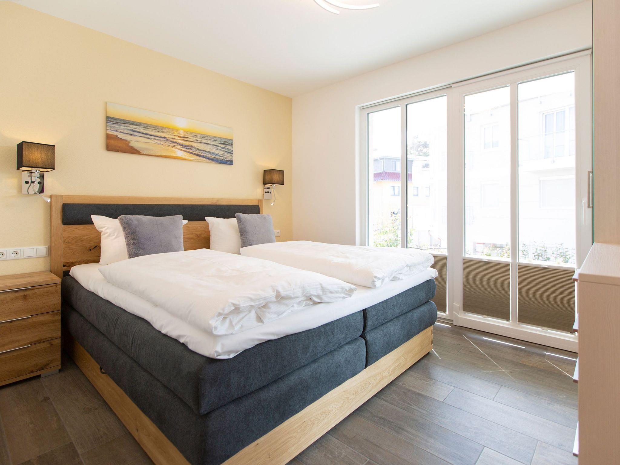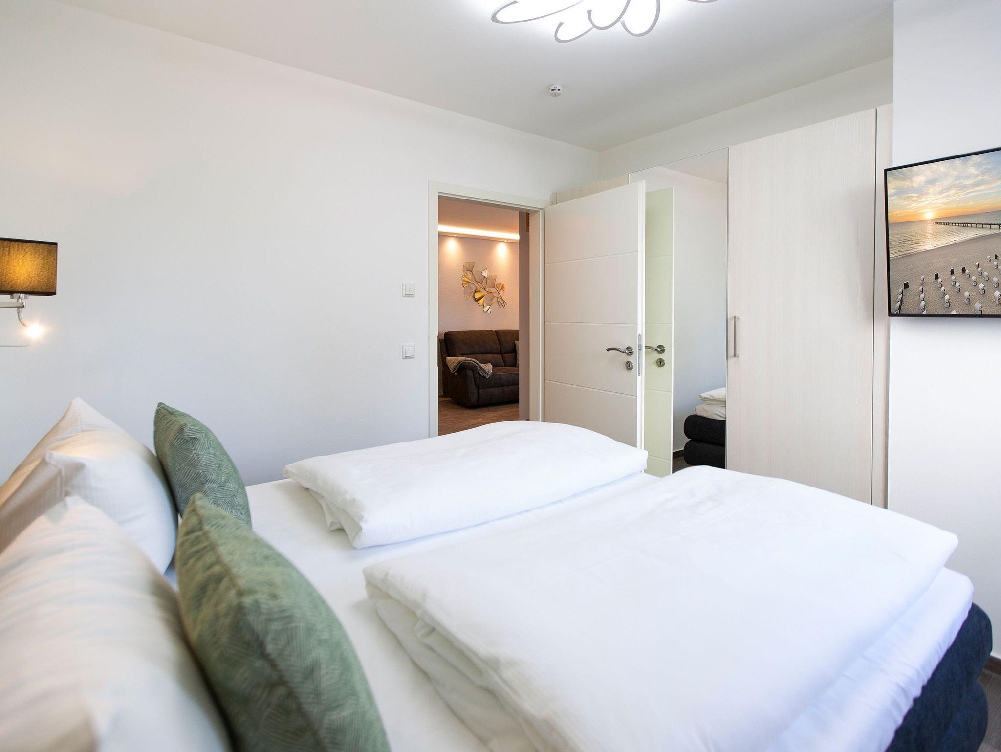 Zum Ausspannen und Wohlfühlen lädt dieses 66qm große Ferienappartement im Erdgeschoss bis zu vier Personen ein. Helle, lichtdurchflutete Räume und ein modernes Interieur sorgen für angenehmen Urlaubsflair während Ihres Ostseeaufenthaltes. Mit dem Fahrstuhl gelangen Sie von der Tiefgarage bequem bis vor das 3-Zimmer-Appartement. Über den großzügigen Flur mit Garderobe und Sitzmöglichkeit erreichen Sie den offen gestalteten Wohn-Essbereich. Für maximalen Komfort sorgen zwei elektrisch einstellbare Sofalandschaften. Verbringen Sie gemütliche Fernsehabende vor dem Flat-TV mit Soundsystem. Ein Highlight dieses Appartements ist der Gaskamin. Dieser sorgt für wohlige Wärme, die besonders nach einem langen Strandspaziergang in den Herbst- und Wintermonaten guttut. Nehmen Sie Platz auf der angrenzenden und großzügigen Süd-Terrasse und hören Sie bei richtiger Windrichtung dem Wellengang der Ostsee zu. Für luxuriösen Schlafkomfort sorgen die bequemen Boxspringbetten (1,80m x 2,00m) in beiden Schlafzimmern. Flat-TVs, geräumige Einbauschränke und ein Safe gehören ebenso zur edlen Ausstattung der Appartement-Schlafzimmer. Die hochwertige Küche mit Marken-Elektrogeräten (Induktionskochfeld, Backofen, Mikrowelle, Spülmaschine) sorgt für alle Annehmlichkeiten, die Sie beim Zubereiten Ihrer Speisen im Urlaub benötigen. Das Masterbad hält als eines von zwei Bädern ein weiteres Highlight für Sie bereit: Neben einem LED-beleuchtetem Waschtisch, beheiztem Badezimmerspiegel und Toilette lädt die Finnische Sauna Sie ein ihrem Körper etwas Gutes zu tun. Bringen Sie anschließend Ihren Kreislauf unter der Regendusche wieder in Schwung. Ein zweites Bad mit Regendusche, Waschtisch und Toilette bietet besonders Familien oder befreundeten Paaren die Möglichkeit einer separaten Nutzung. Kostenfreies W-Lan und ein Stellplatz in der hauseigenen Tiefgarage runden Ihren perfekten Urlaub auf der Insel Usedom ab.
